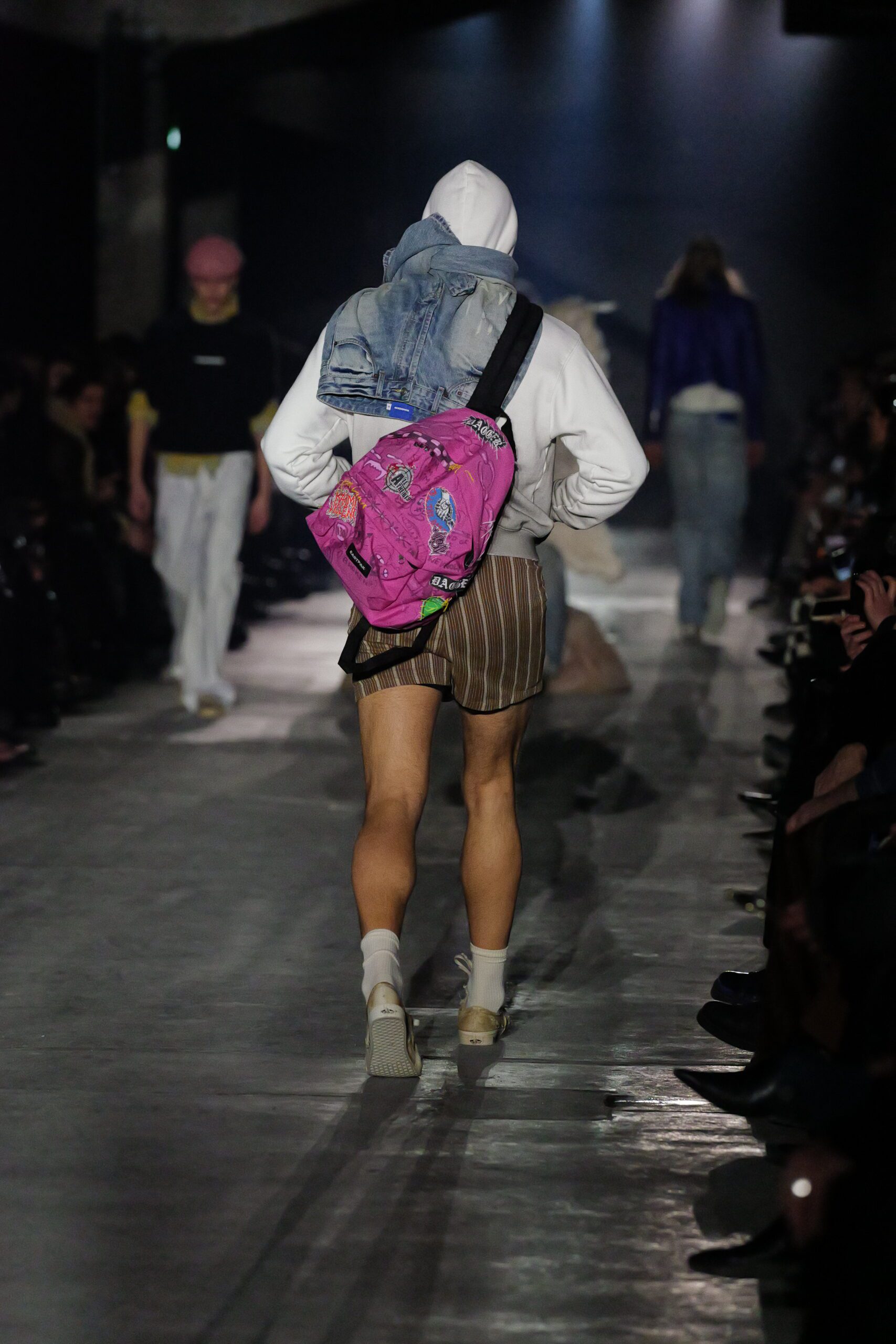 La collection intègre des collaborations avec Vans et Eastpak. Chaque mannequin porte les modèles Vans Authentic et Slip-On, les deux paires préférées du créateur. Le sac à dos Eastpak Pak’r, autrefois orné de dessins et d’écussons cousus par sa grand-mère, est réinterprété comme symbole de jeunesse et d’appartenance.