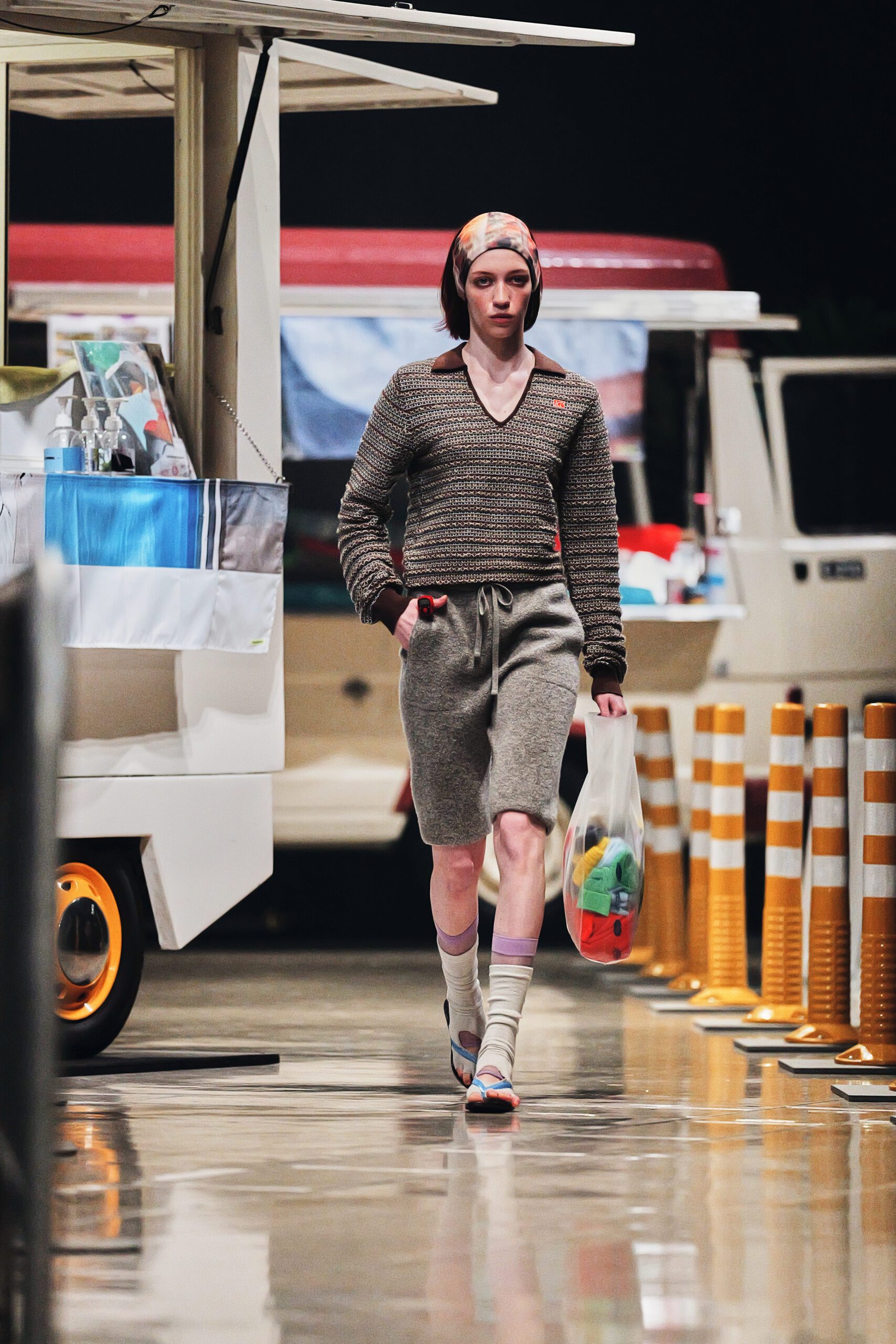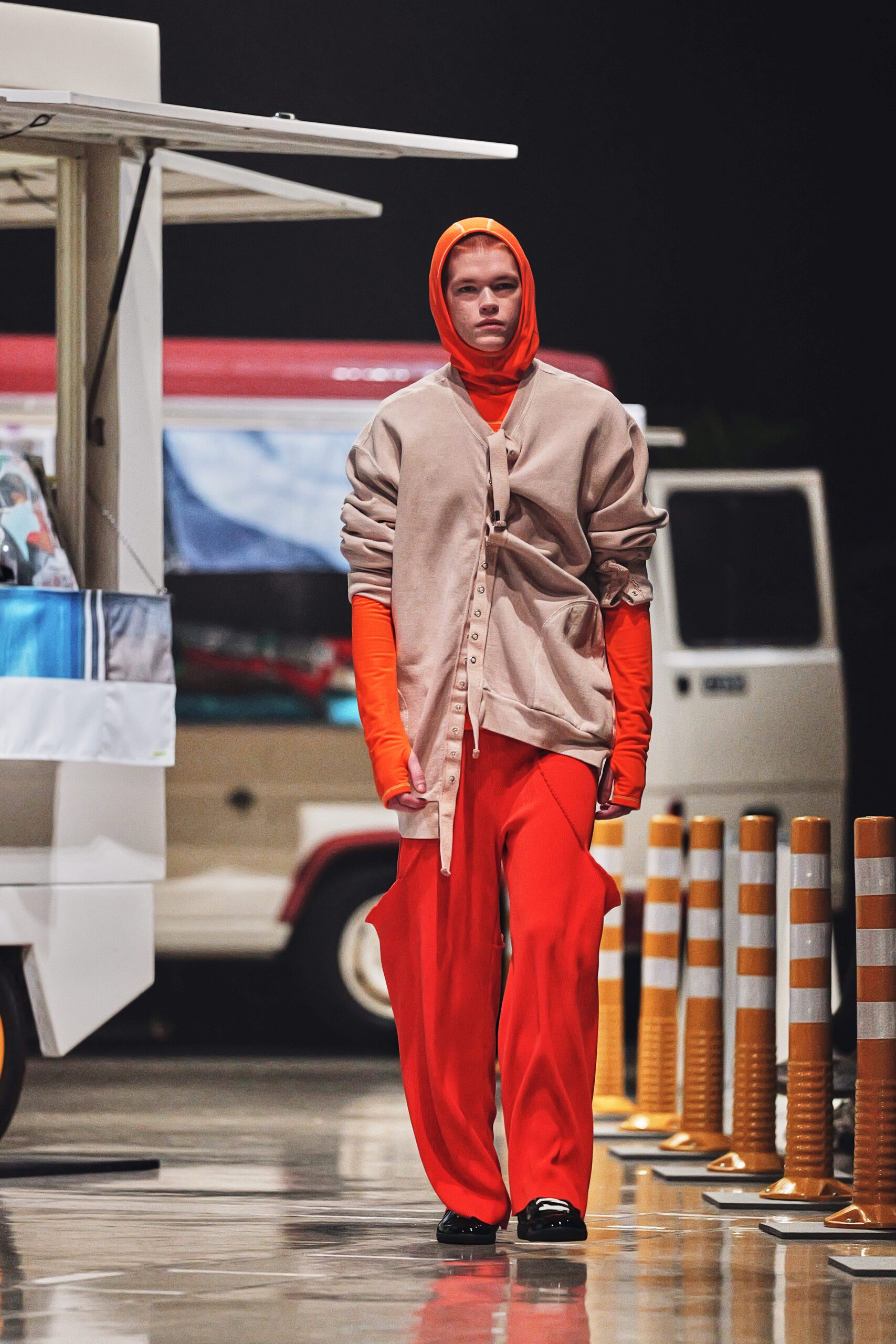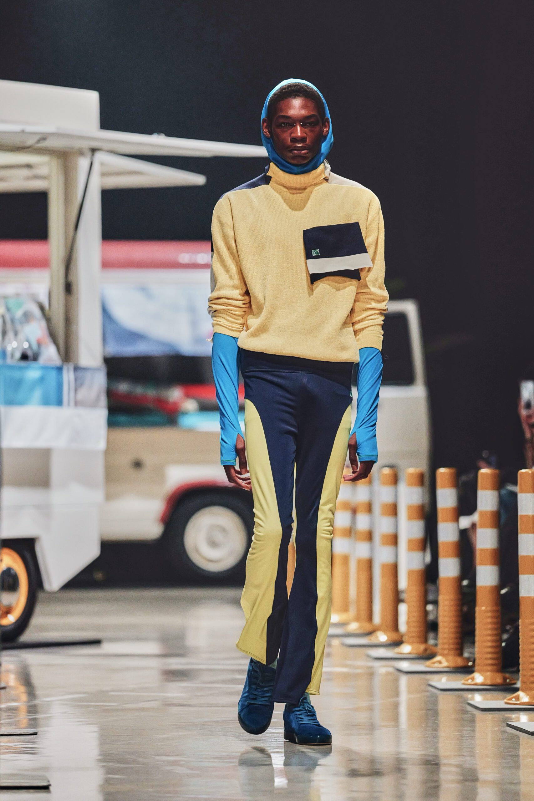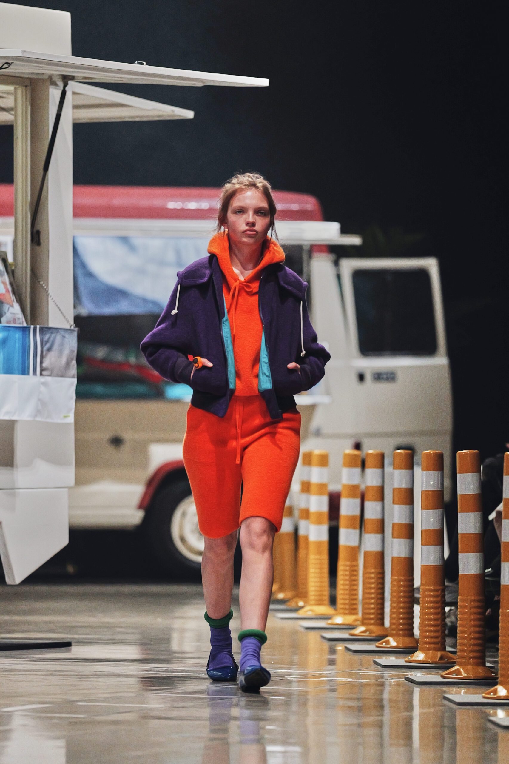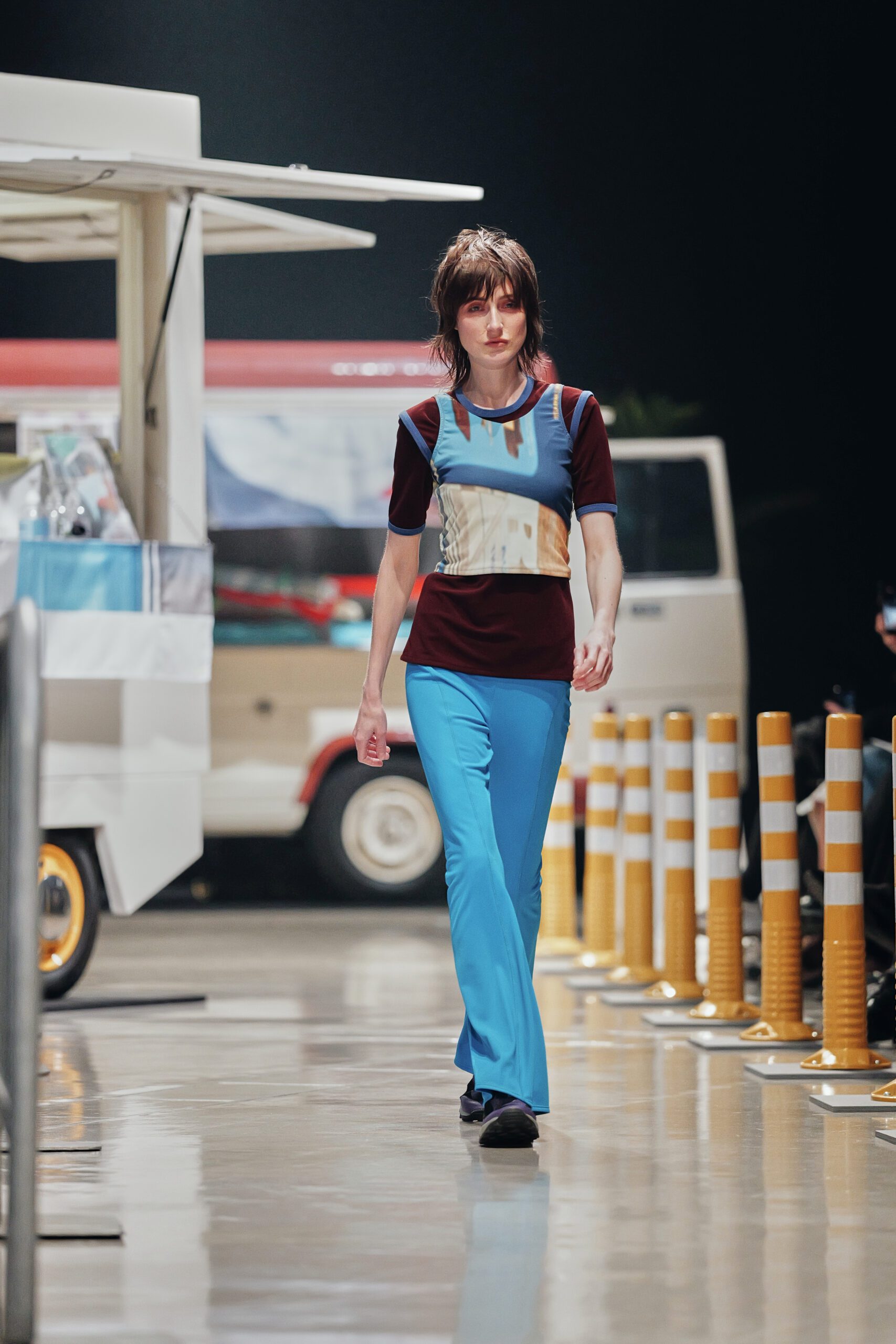 Tout commence dans la rue. Pas dans une galerie aseptisée, ni dans l’abstraction d’un moodboard. Kotoha Yokozawa vit à Nishi-Shinjuku, et c’est depuis les fenêtres de ce quartier en perpétuel mouvement qu’est née la collection Automne/Hiver 2026-27. Touristes aux valises débordantes, coureurs du marathon de Tokyo en tenue technicolor s’élançant chaque printemps depuis ce même carrefour, scooters électriques LUUP alignés comme une installation contemporaine, food trucks aux tissus empilés sans logique apparente tout ce chaos vivant, Yokozawa l’absorbe, le filtre, et le sublime.