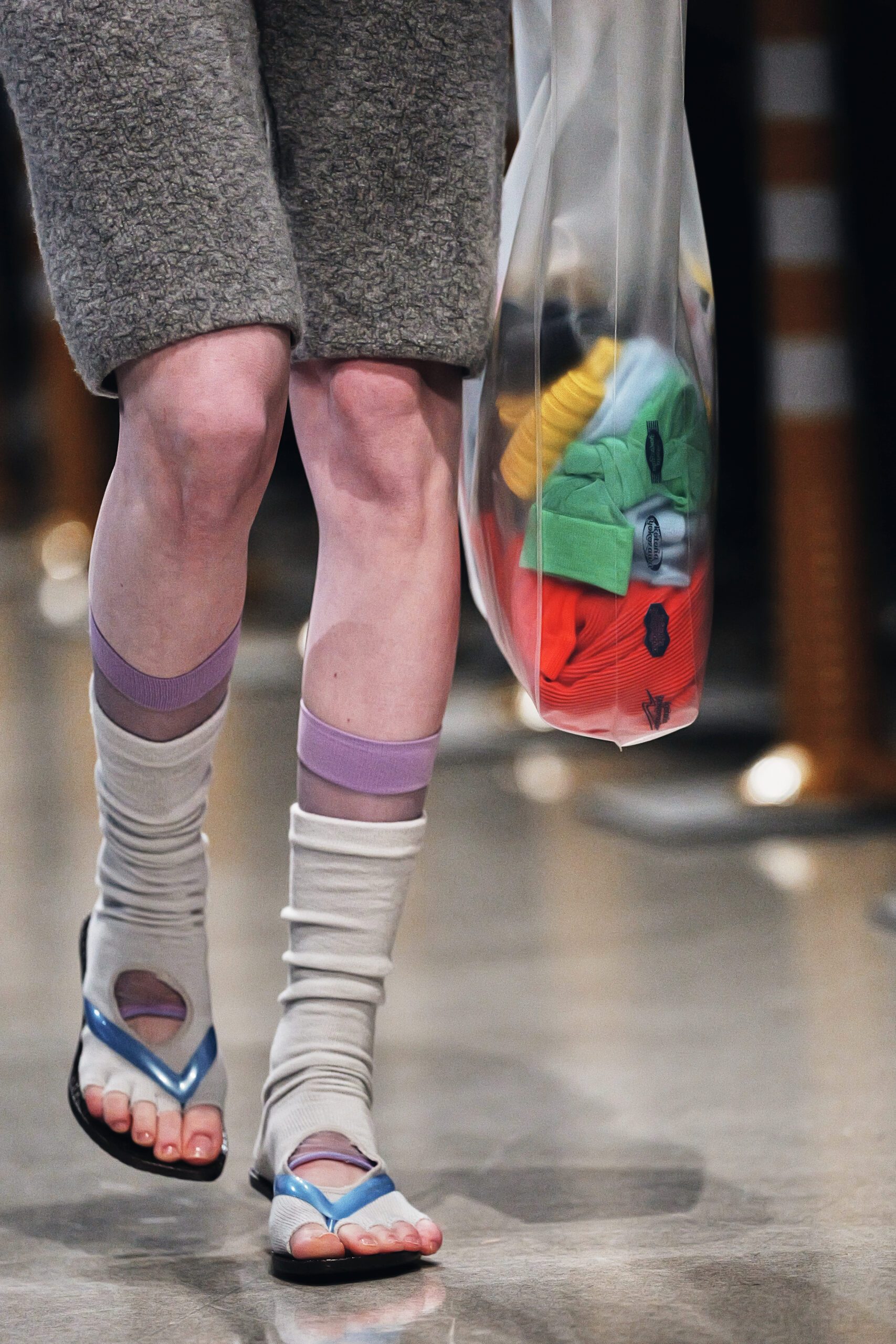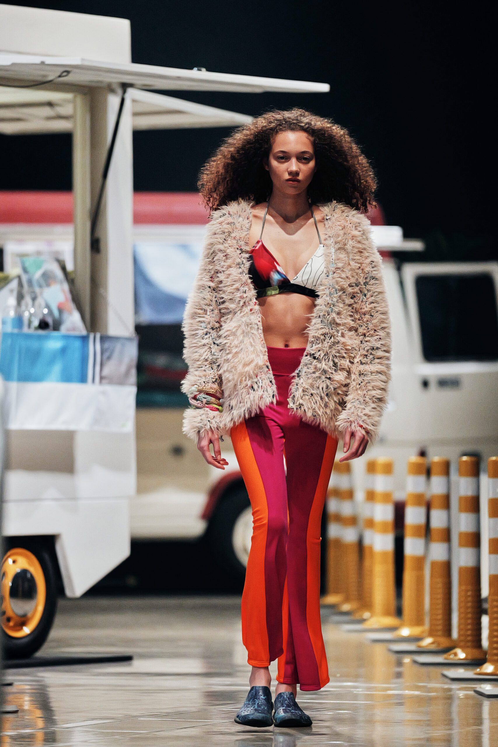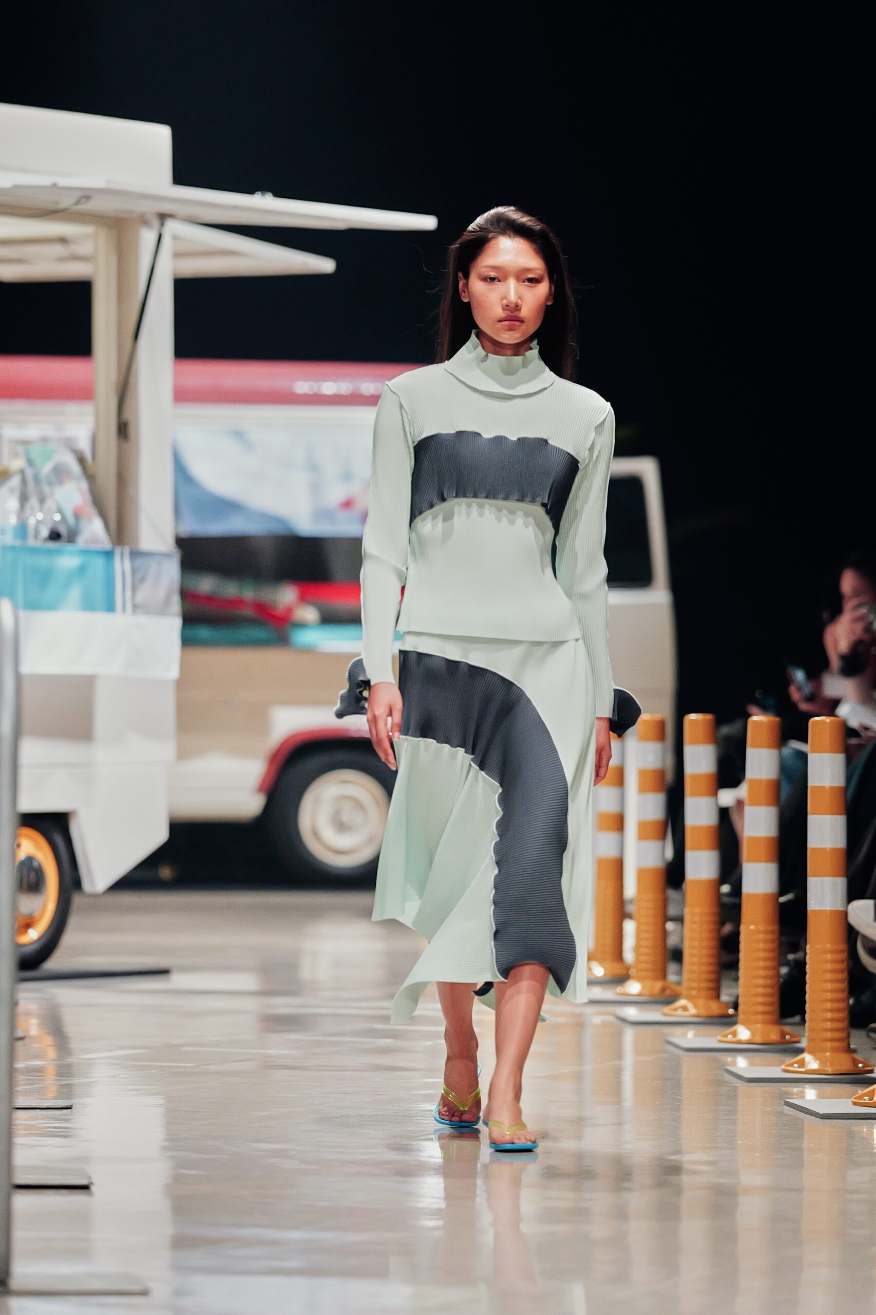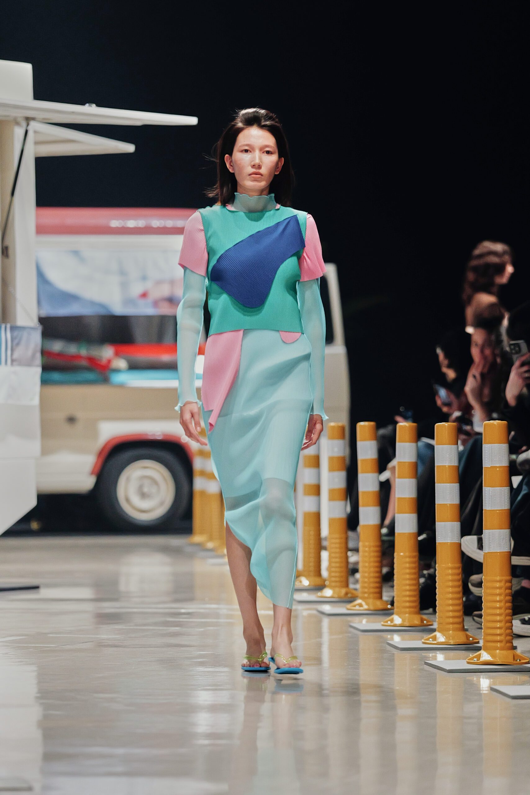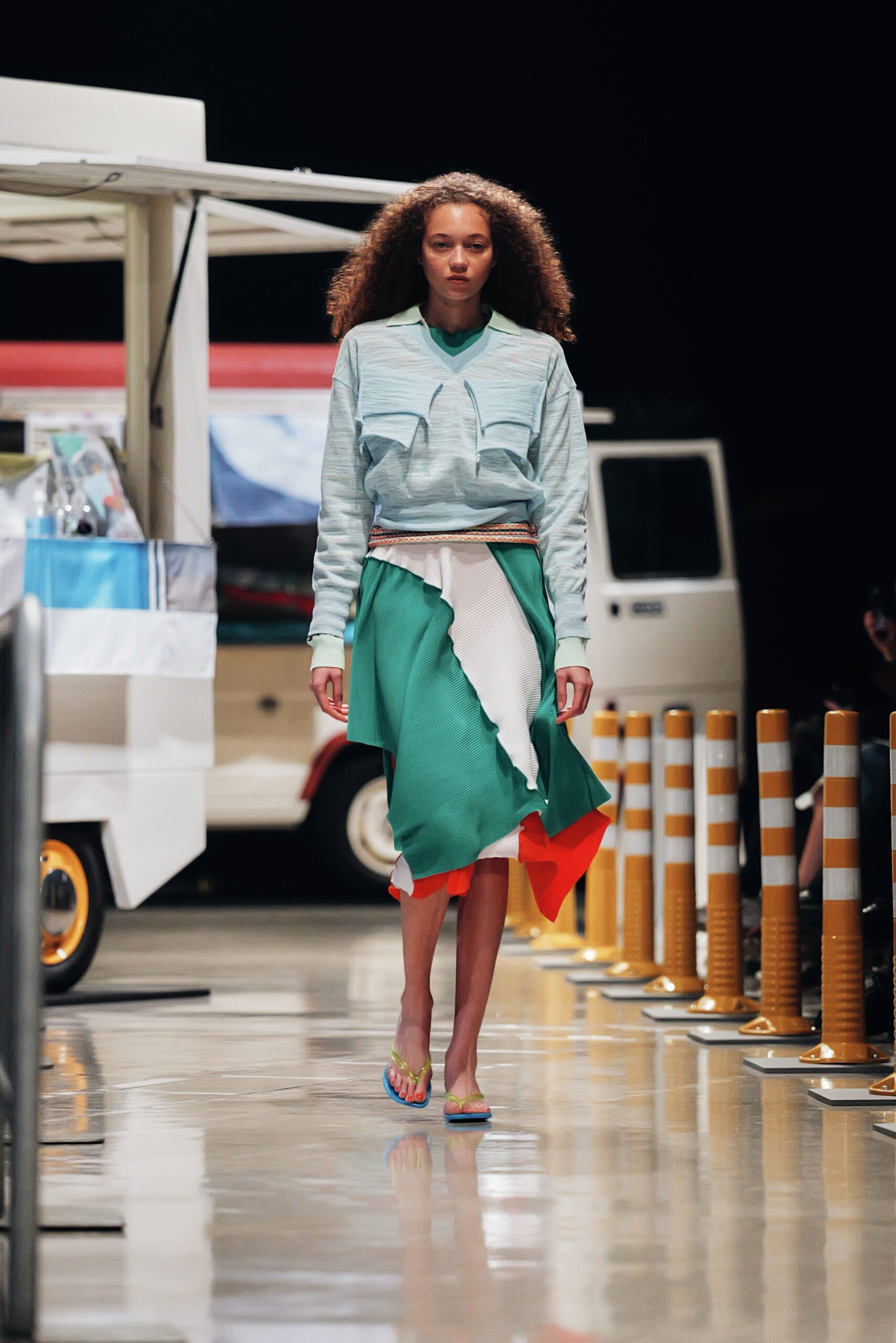 Ses sandales à talons, même elles, participent à cet audacieux récit chromatique : semelle bleu clair contre brides jaune pâle, ou ce vertigineux mariage de vert et d’orange qui transforme chaque pas en déclaration.