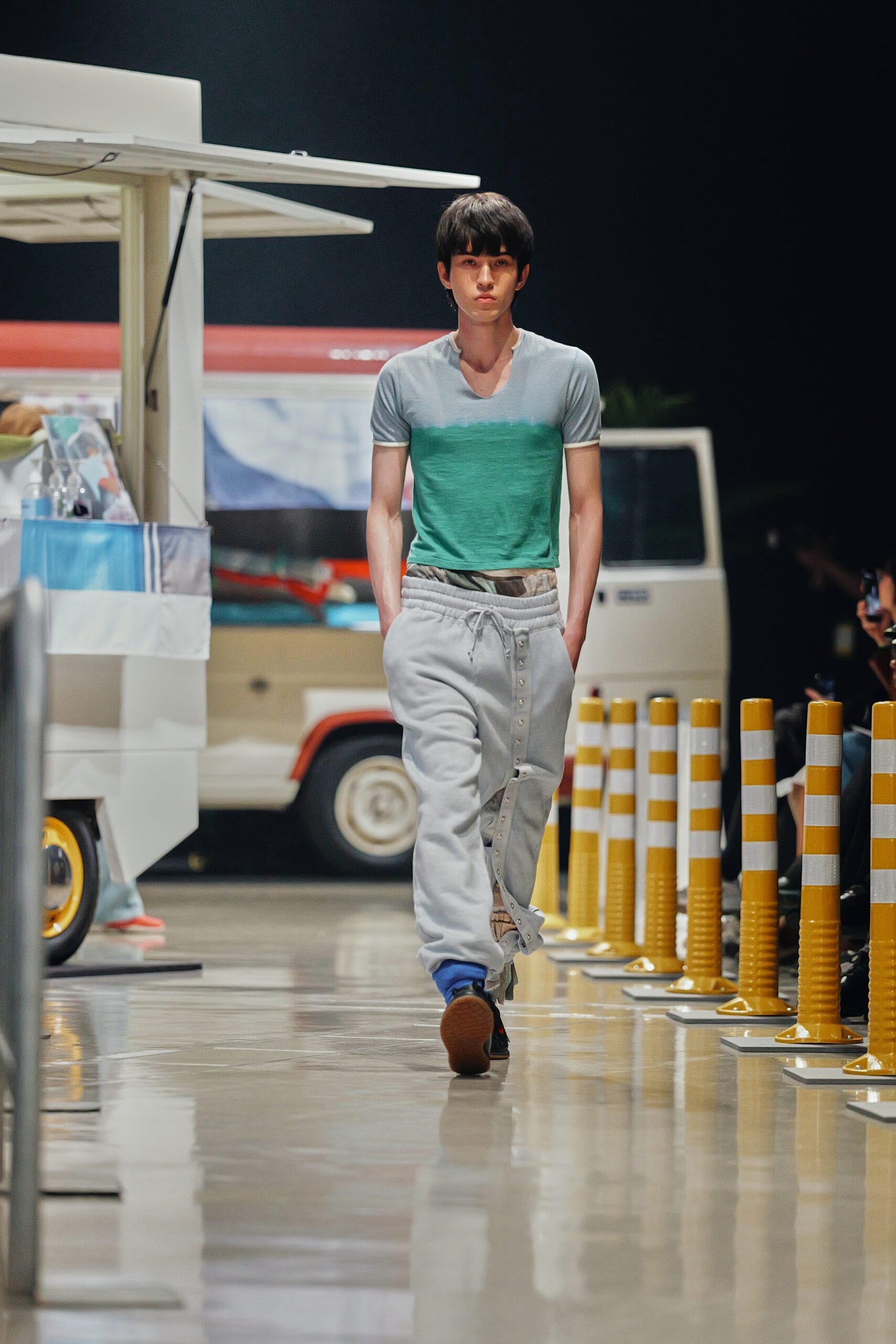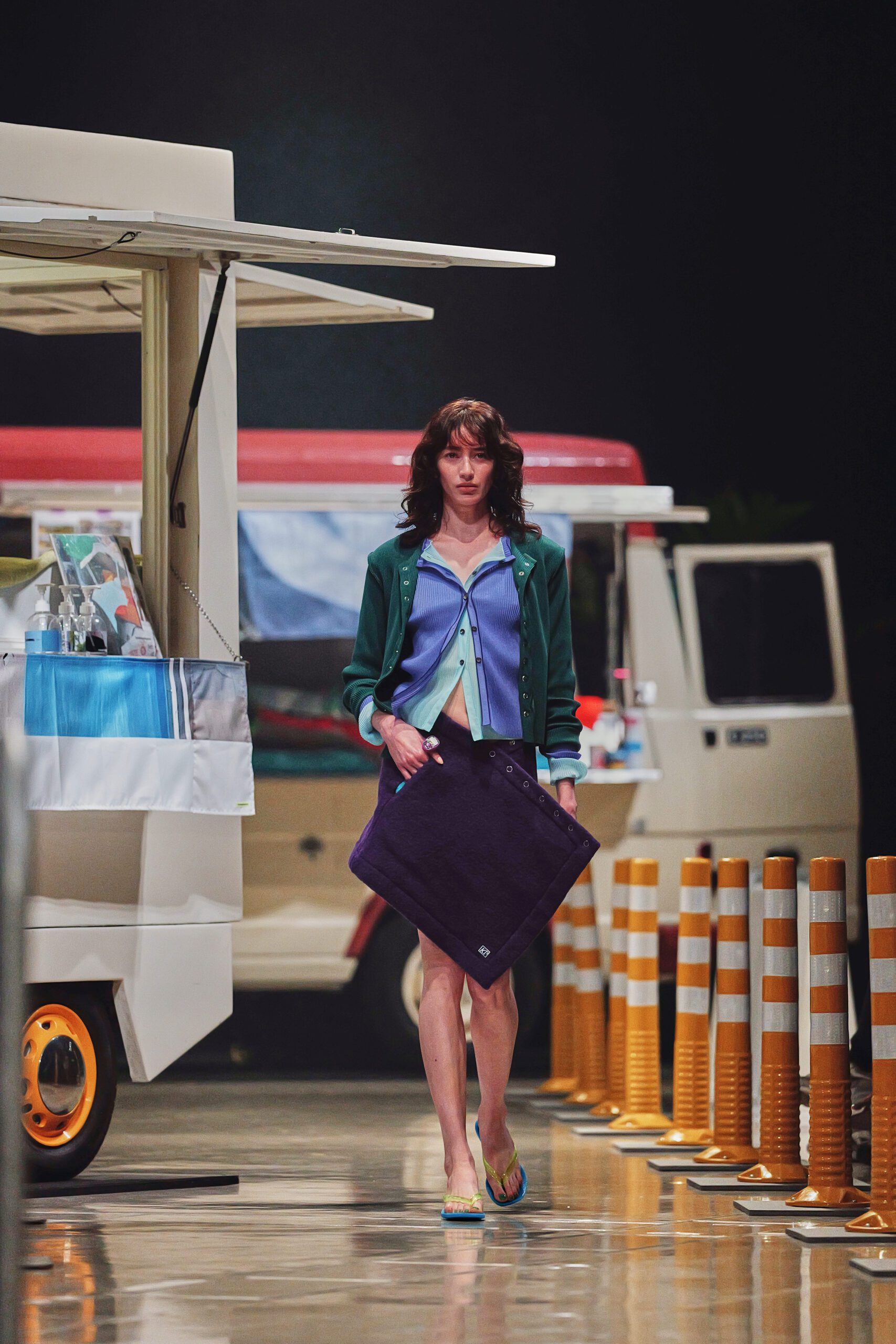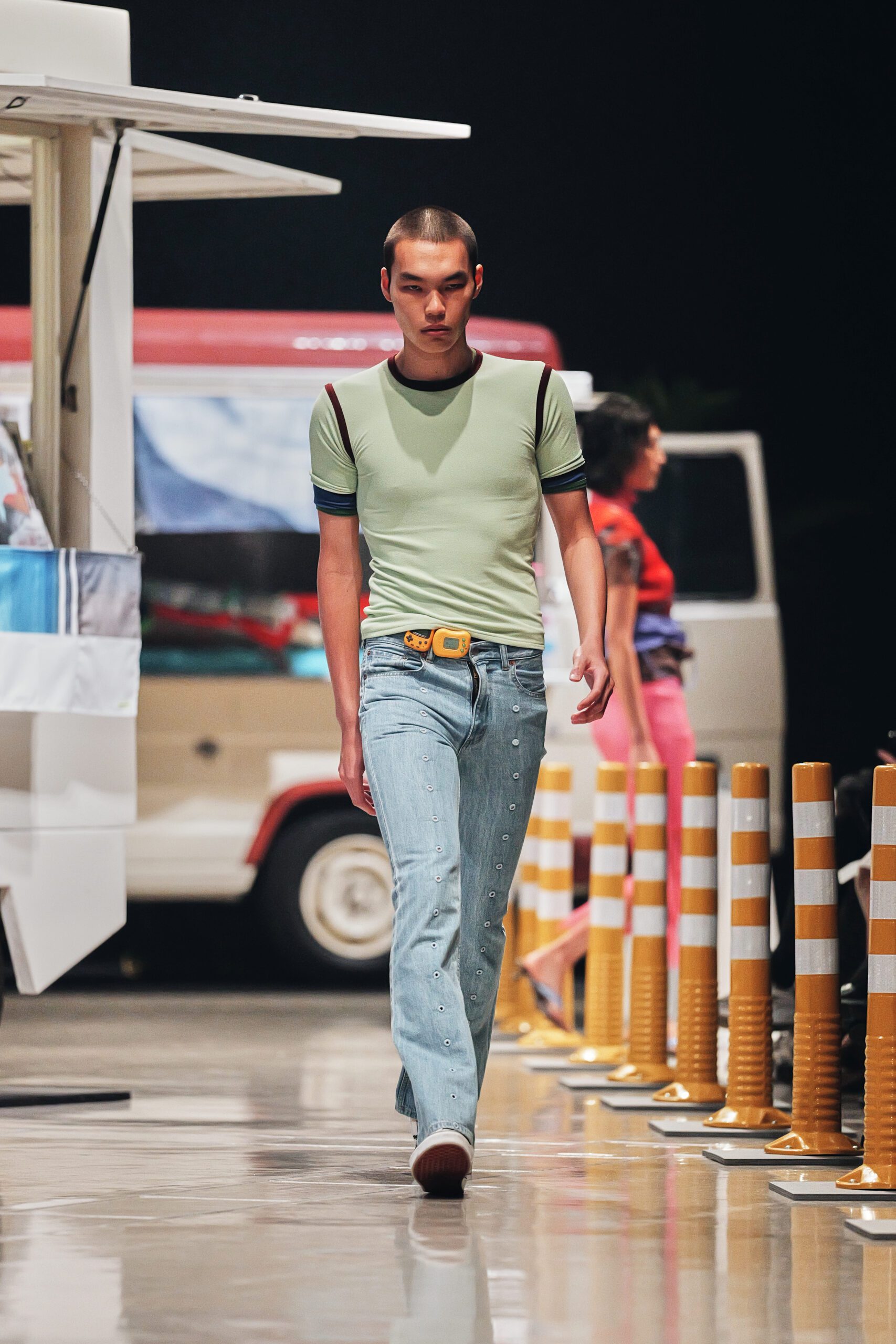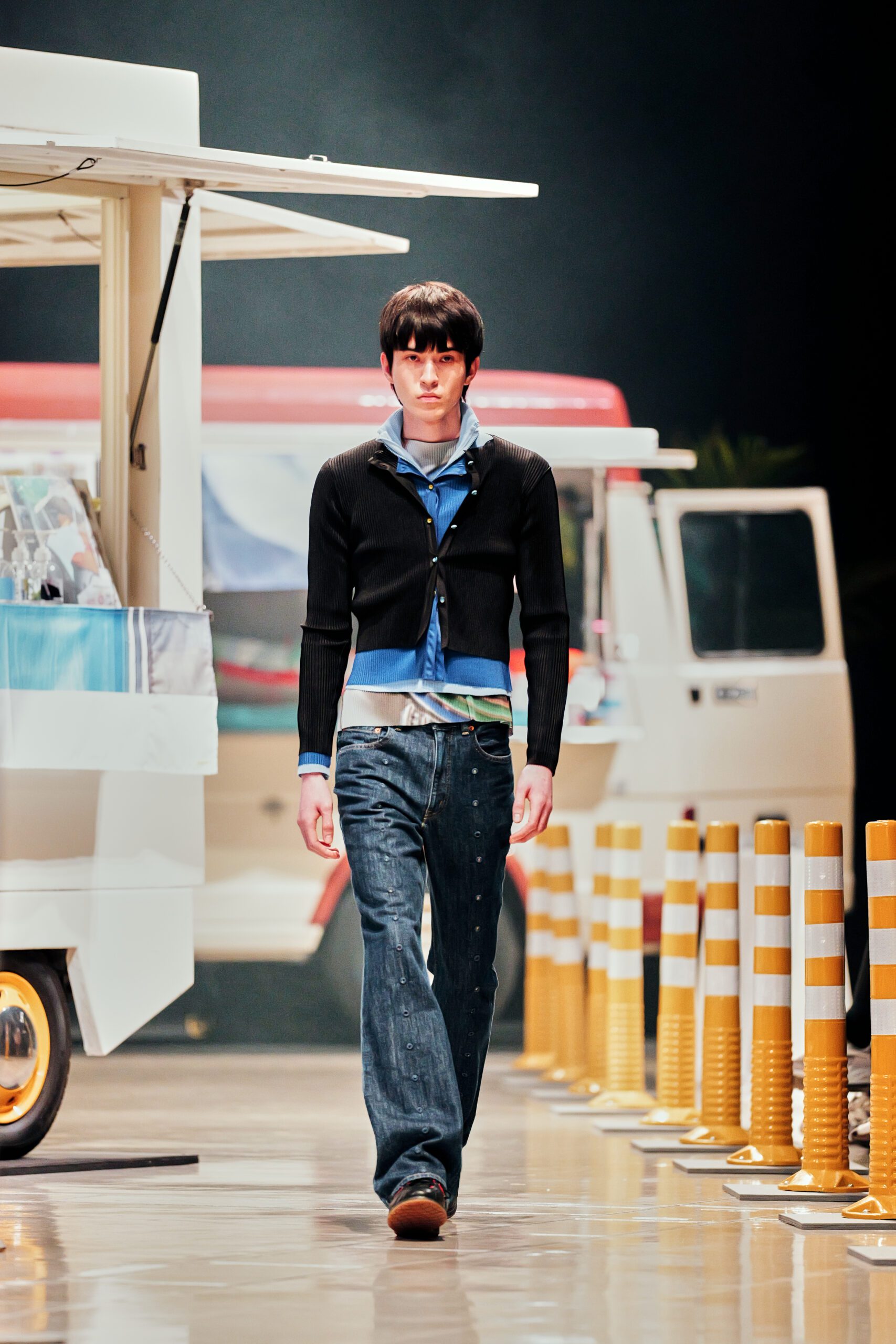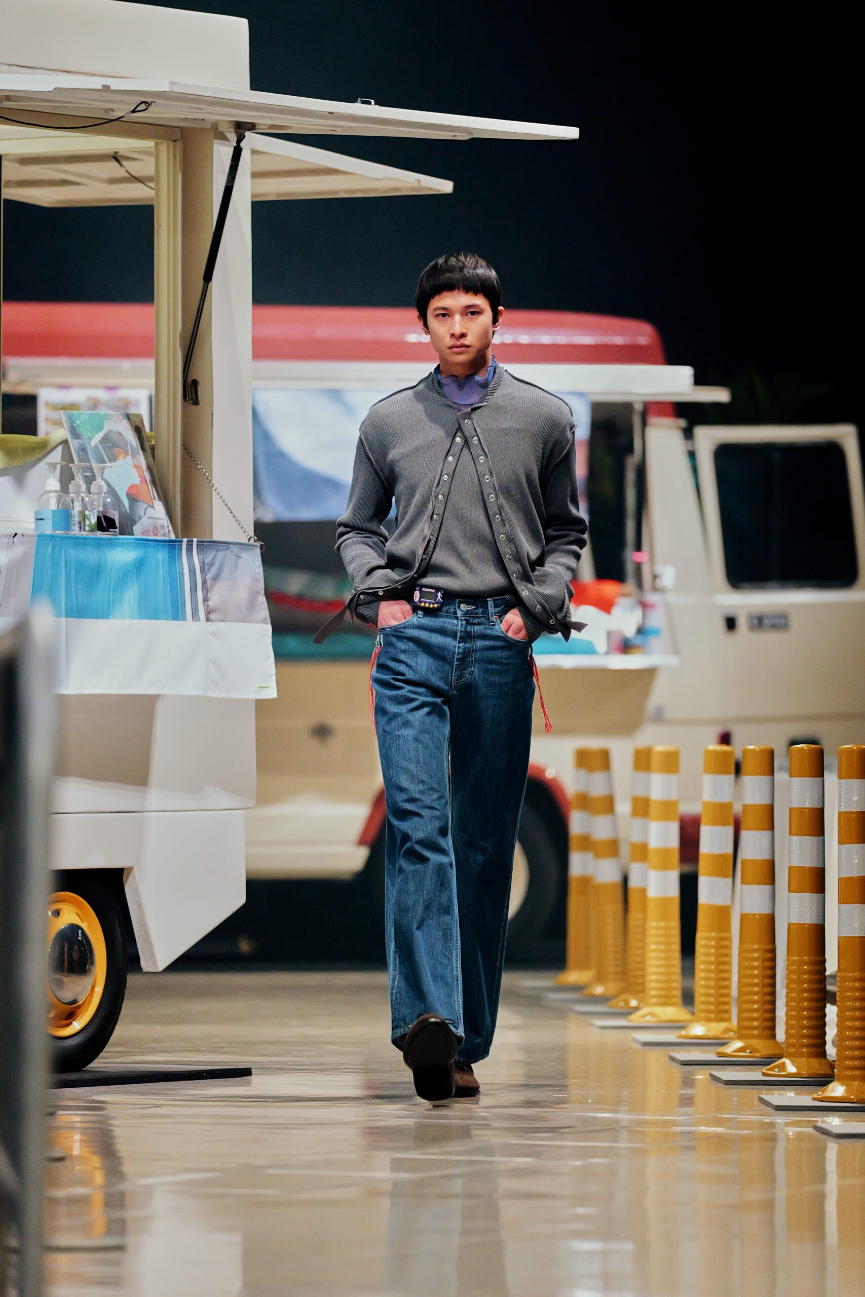 Le décor du défilé ne cherchait pas à embellir cette réalité : il la reconstituait fidèlement, avec ses tuk-tuks illuminés, ses vélos électriques et son effervescence multiculturelle assumée. Un choix radical qui ancre la collection dans le concret, loin de toute fantasmagorie.