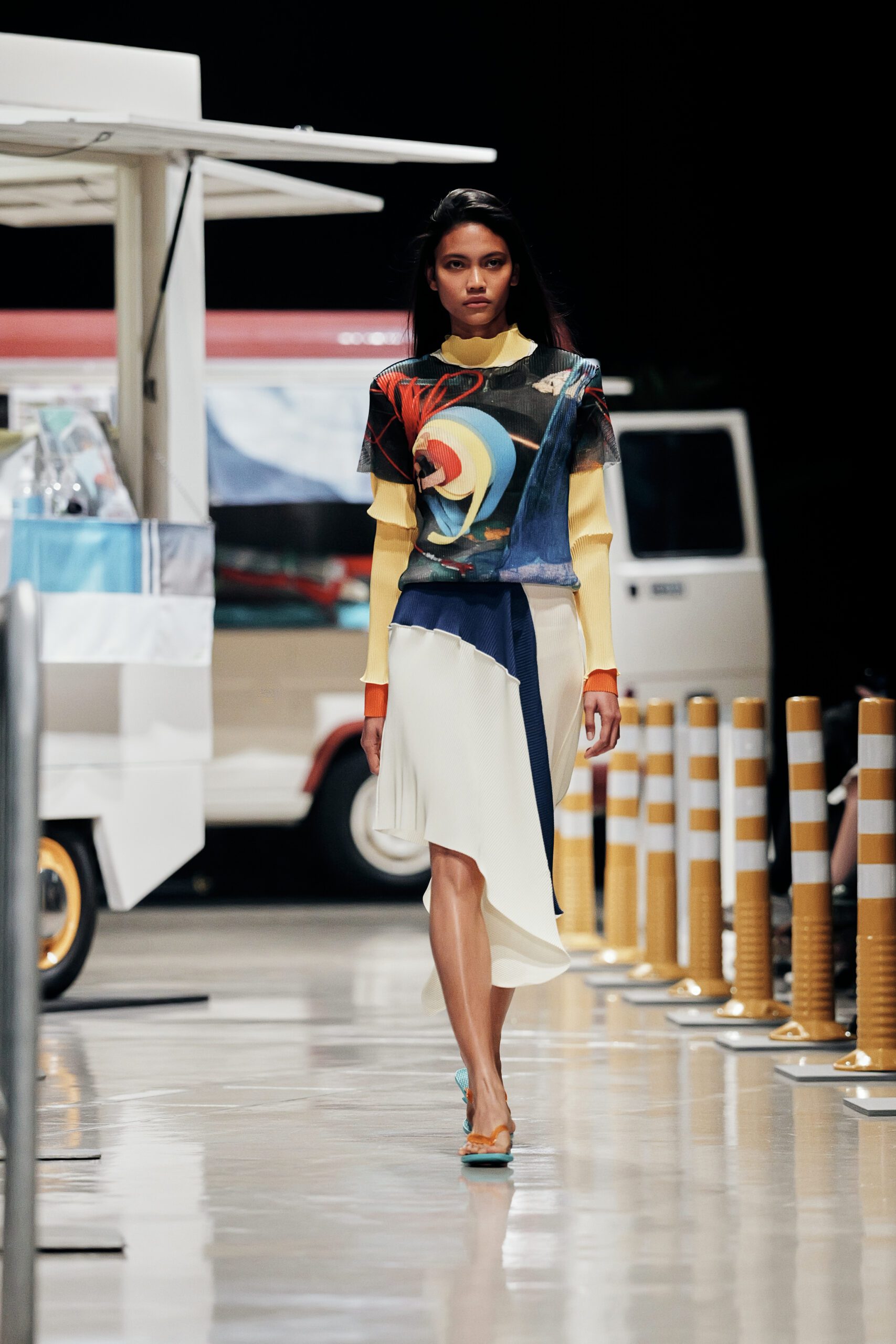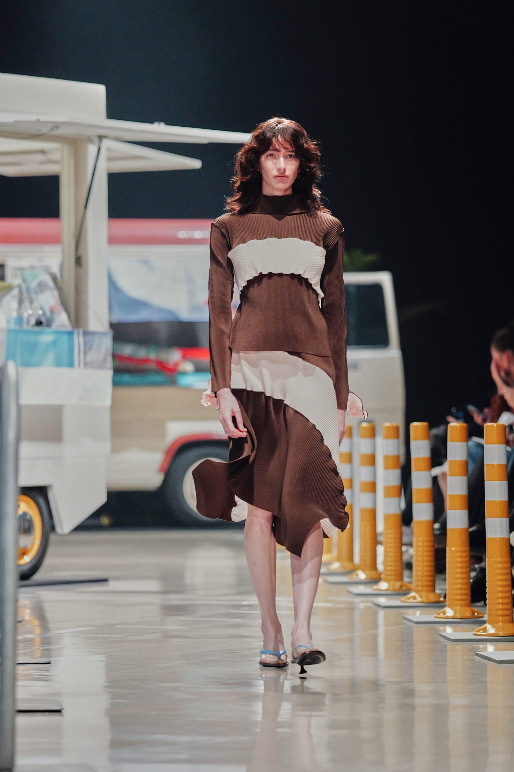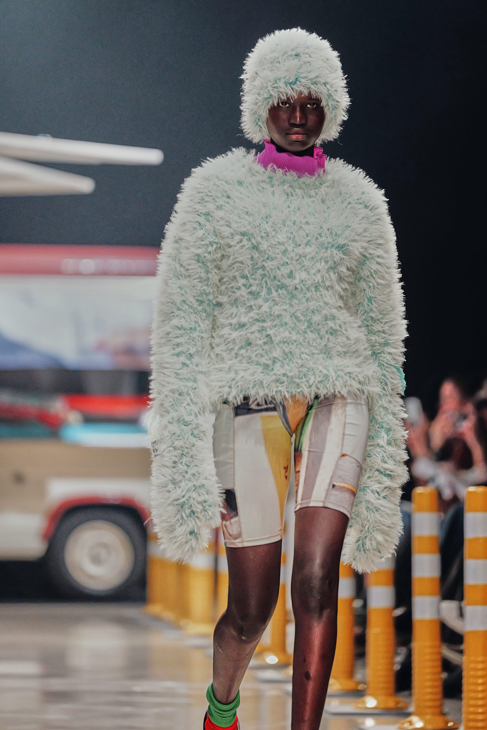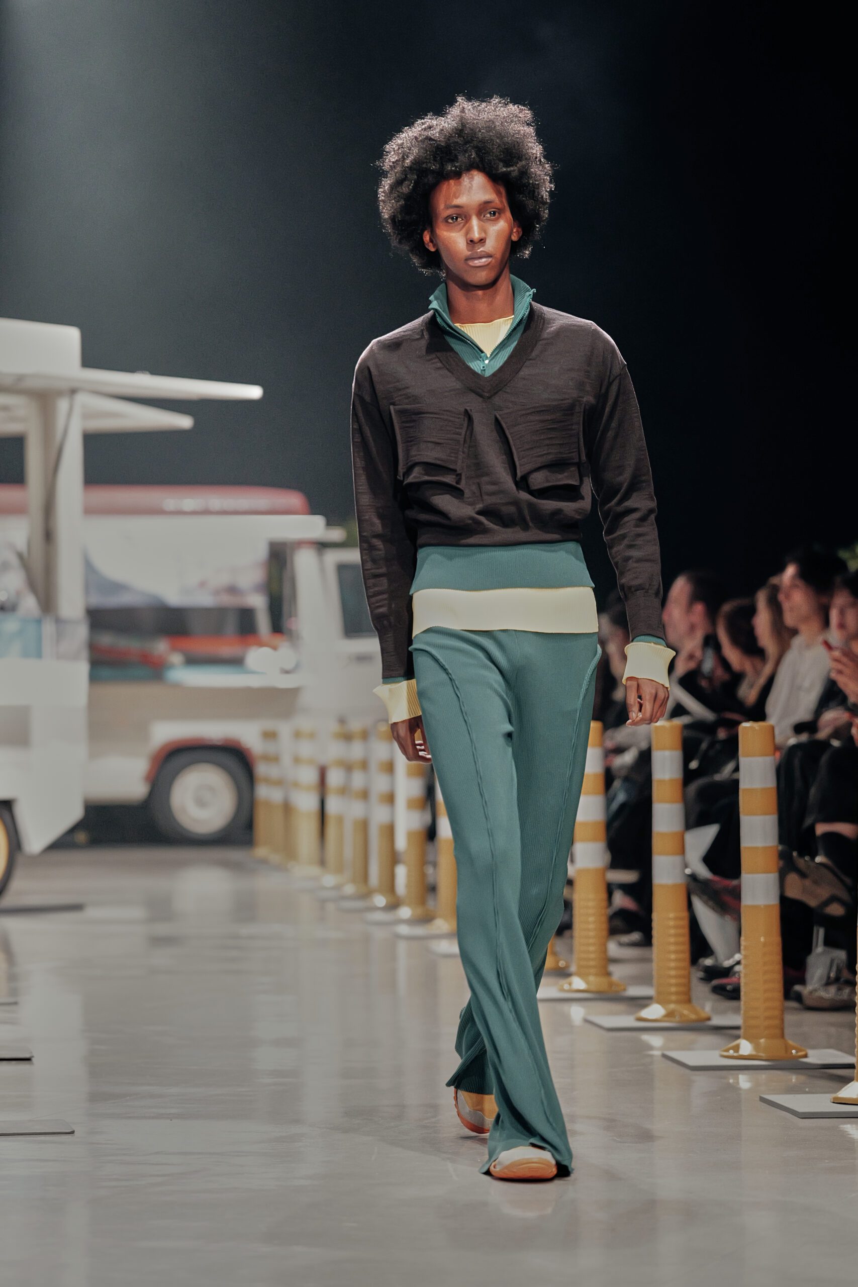 Le décor du défilé ne cherchait pas à embellir cette réalité : il la reconstituait fidèlement, avec ses tuk-tuks illuminés, ses vélos électriques et son effervescence multiculturelle assumée. Un choix radical qui ancre la collection dans le concret, loin de toute fantasmagorie.