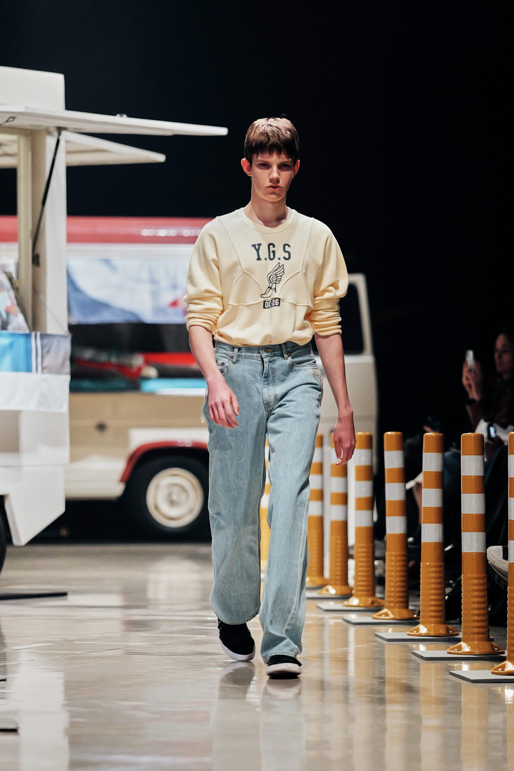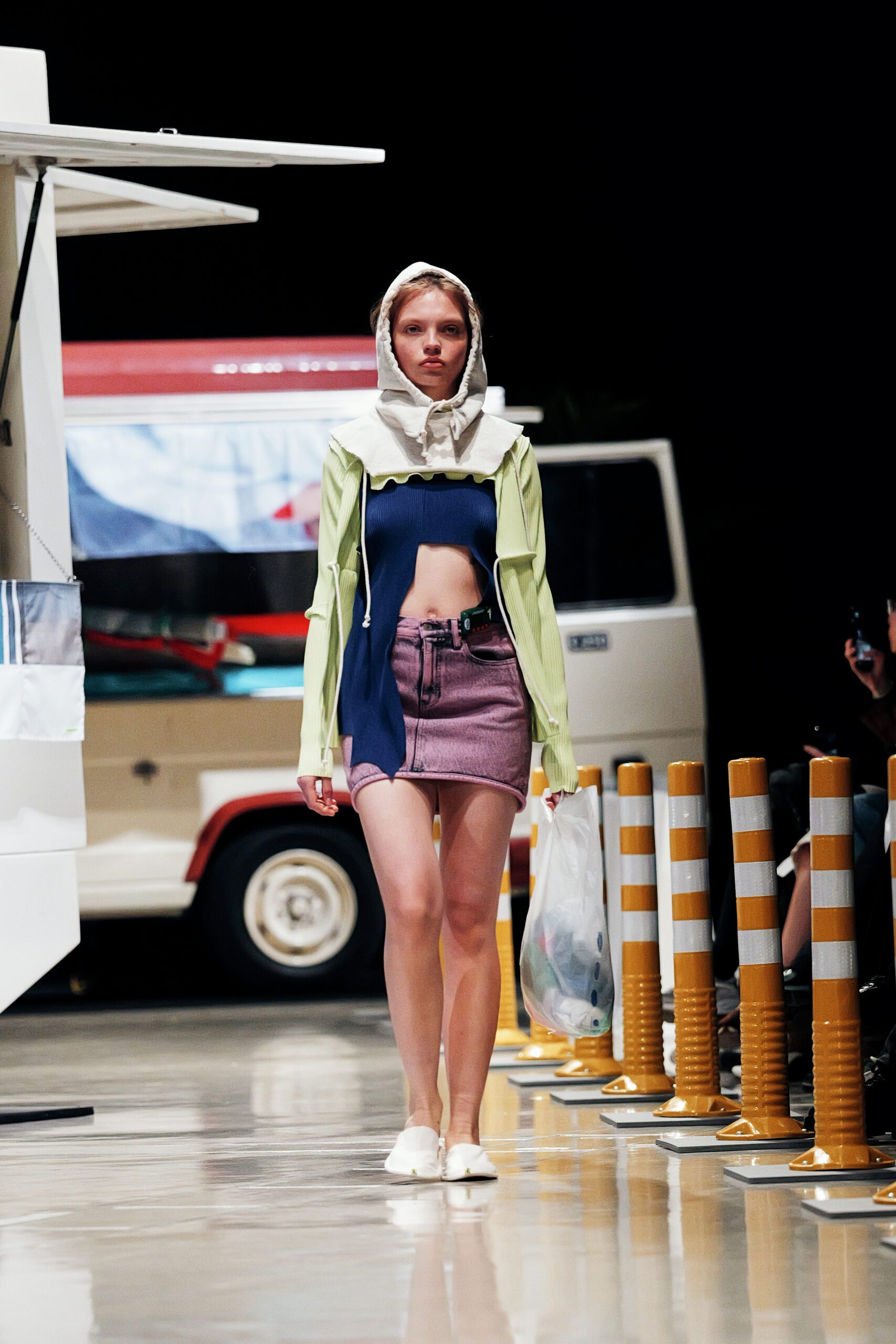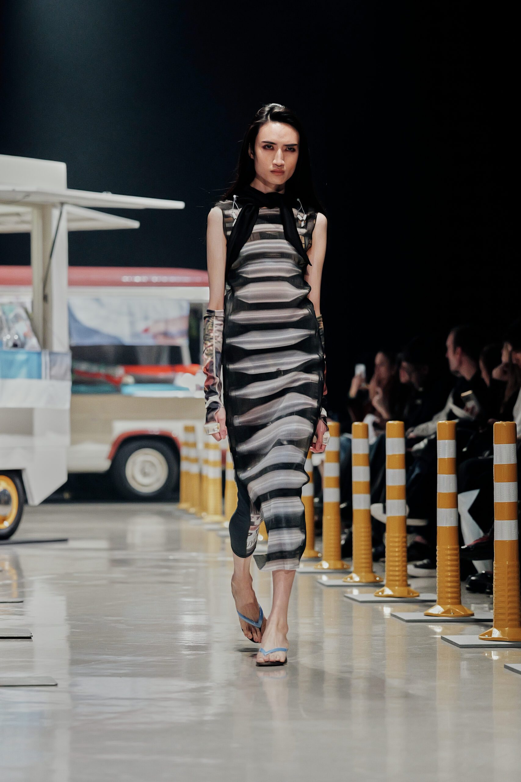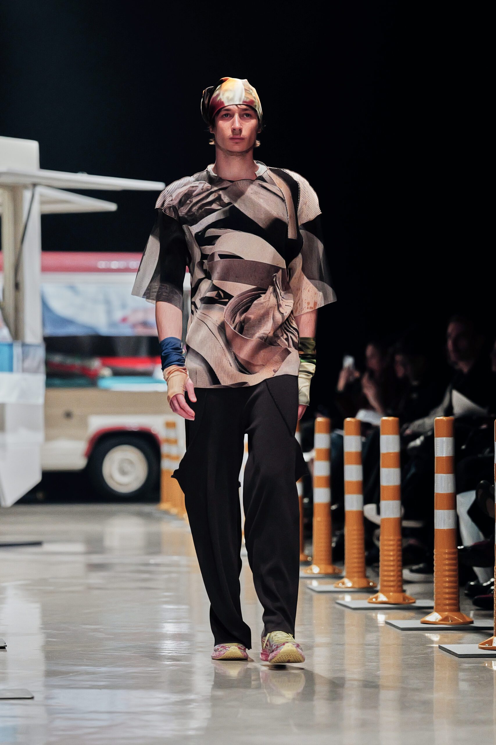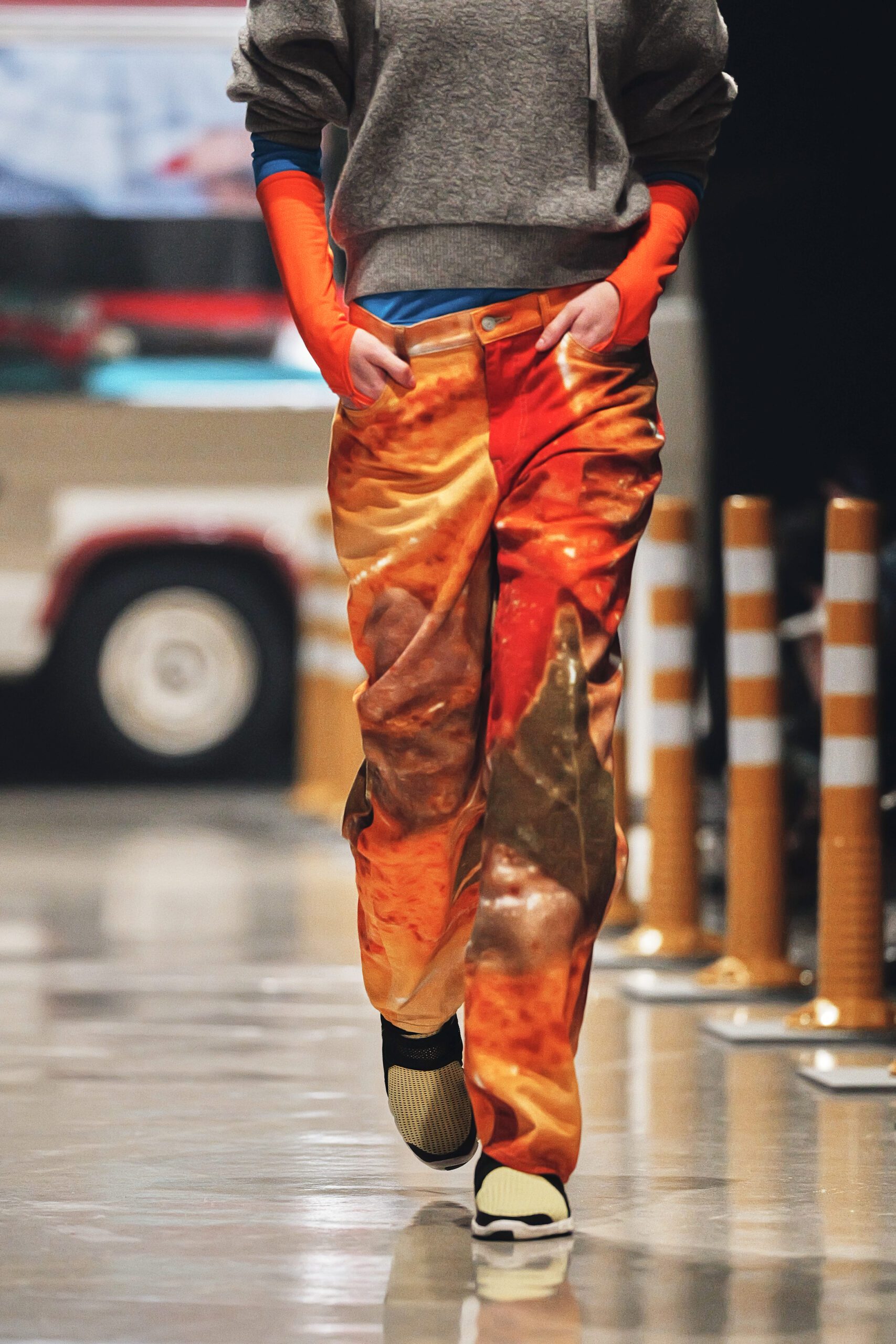 Le décor du défilé ne cherchait pas à embellir cette réalité : il la reconstituait fidèlement, avec ses tuk-tuks illuminés, ses vélos électriques et son effervescence multiculturelle assumée. Un choix radical qui ancre la collection dans le concret, loin de toute fantasmagorie.