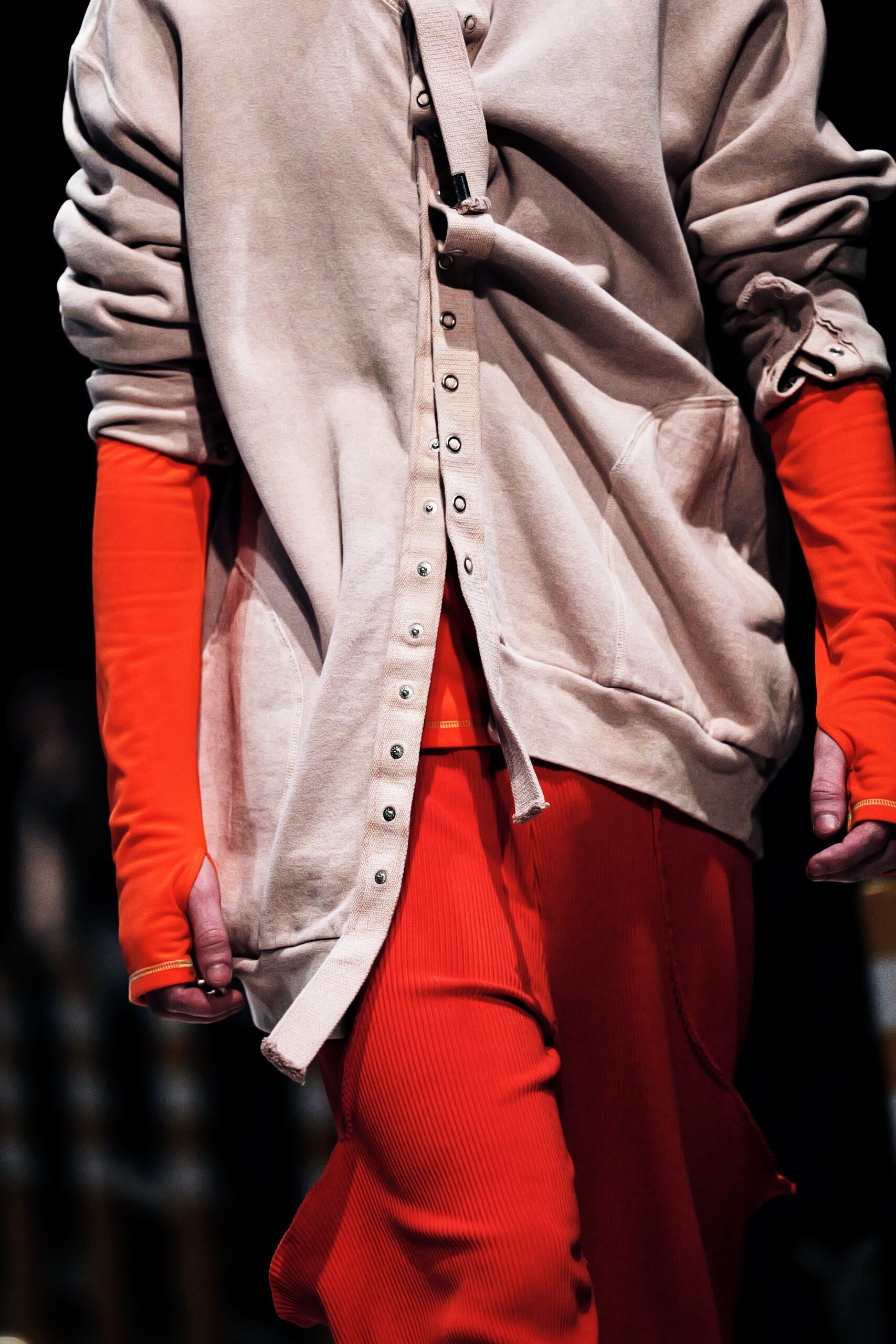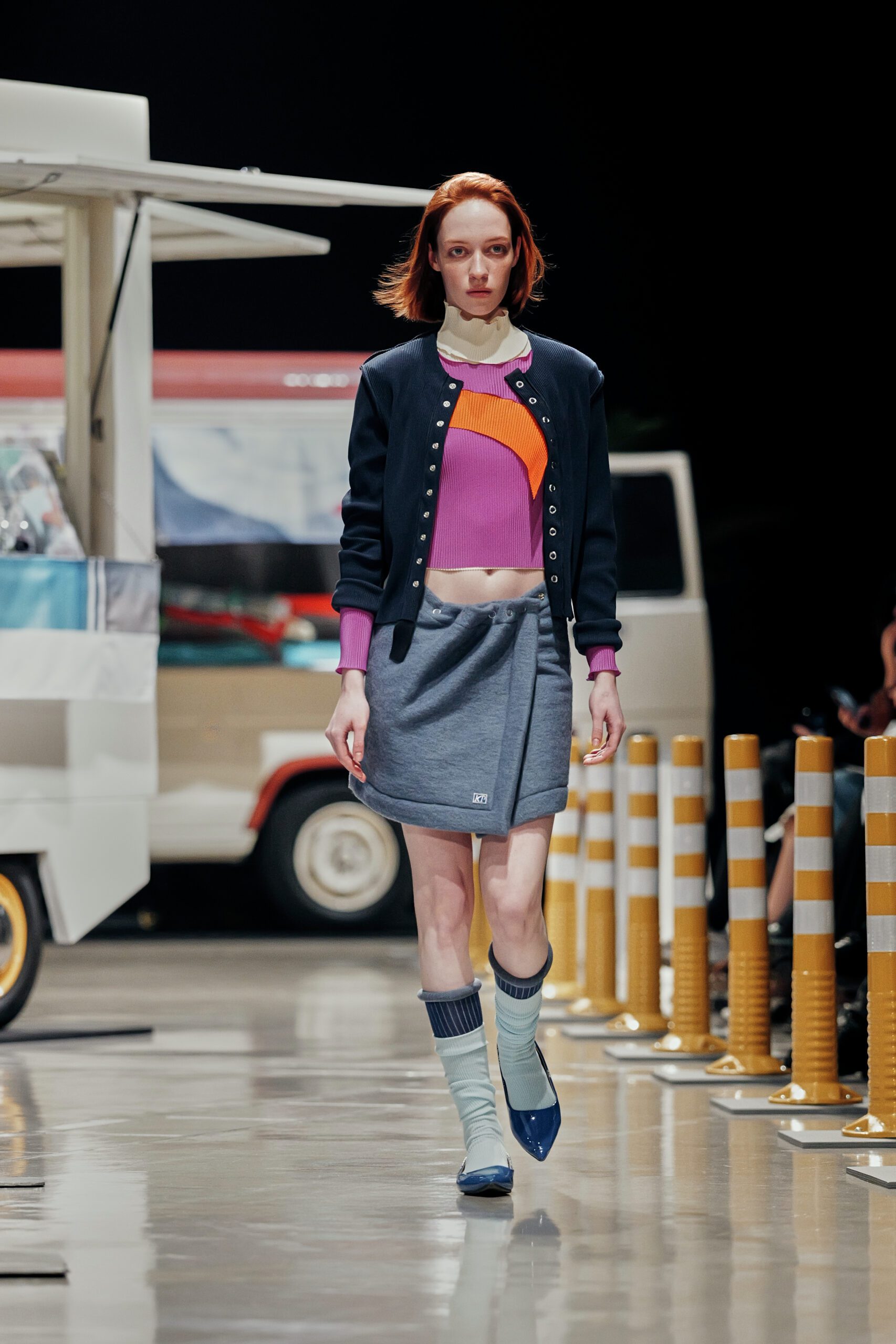Ce que Kotoha Yokozawa propose cette saison relève presque du manifeste. Face à la grisaille hivernale, elle oppose des couleurs qui ne demandent pas la permission : vert menthe sur rose cousu sur émeraude, orange brûlé contre violet profond, fuchsia qui défie l’orange dans un même pantalon de sport. La jupe portefeuille vert prairie, doublée d’un matelassage bleu vif, résume à elle seule la philosophie de la maison a couleur comme énergie, comme protection, comme joie nécessaire.