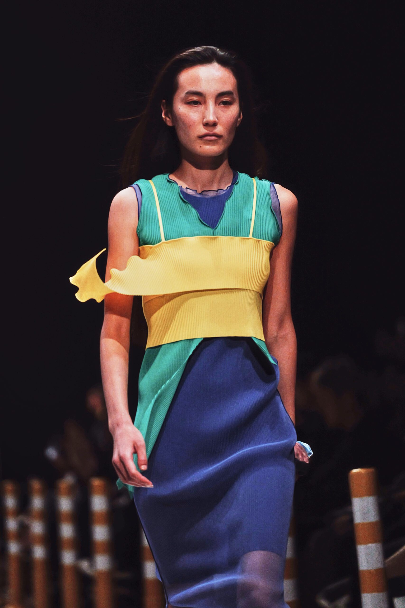 Les hauts et jupes à finition ondulée et surjetée, emblèmes du langage formel de Yokozawa, retrouvent ici une dimension nouvelle. Disposés en diagonale, les tissus ondulent et créent des silhouettes asymétriques d’une élégance presque cinétique comme si les vêtements eux-mêmes étaient en mouvement, emportés par le courant de la ville. L’alliance de cette technique maîtrisée avec des jeux de couleurs aussi audacieux est ce qui rend cette collection particulièrement aboutie : la forme et la teinte ne font qu’un.
