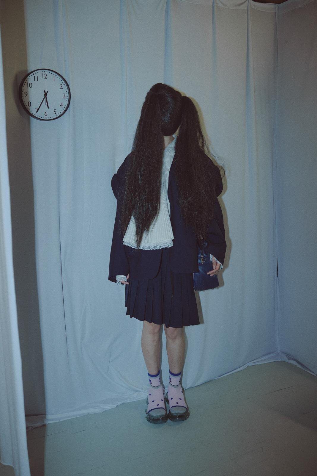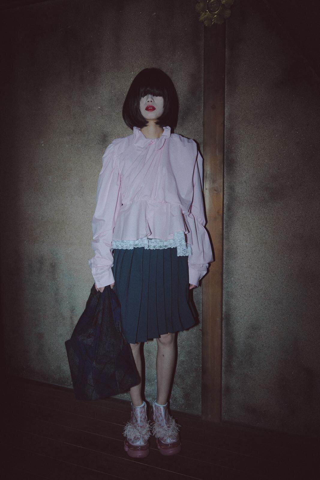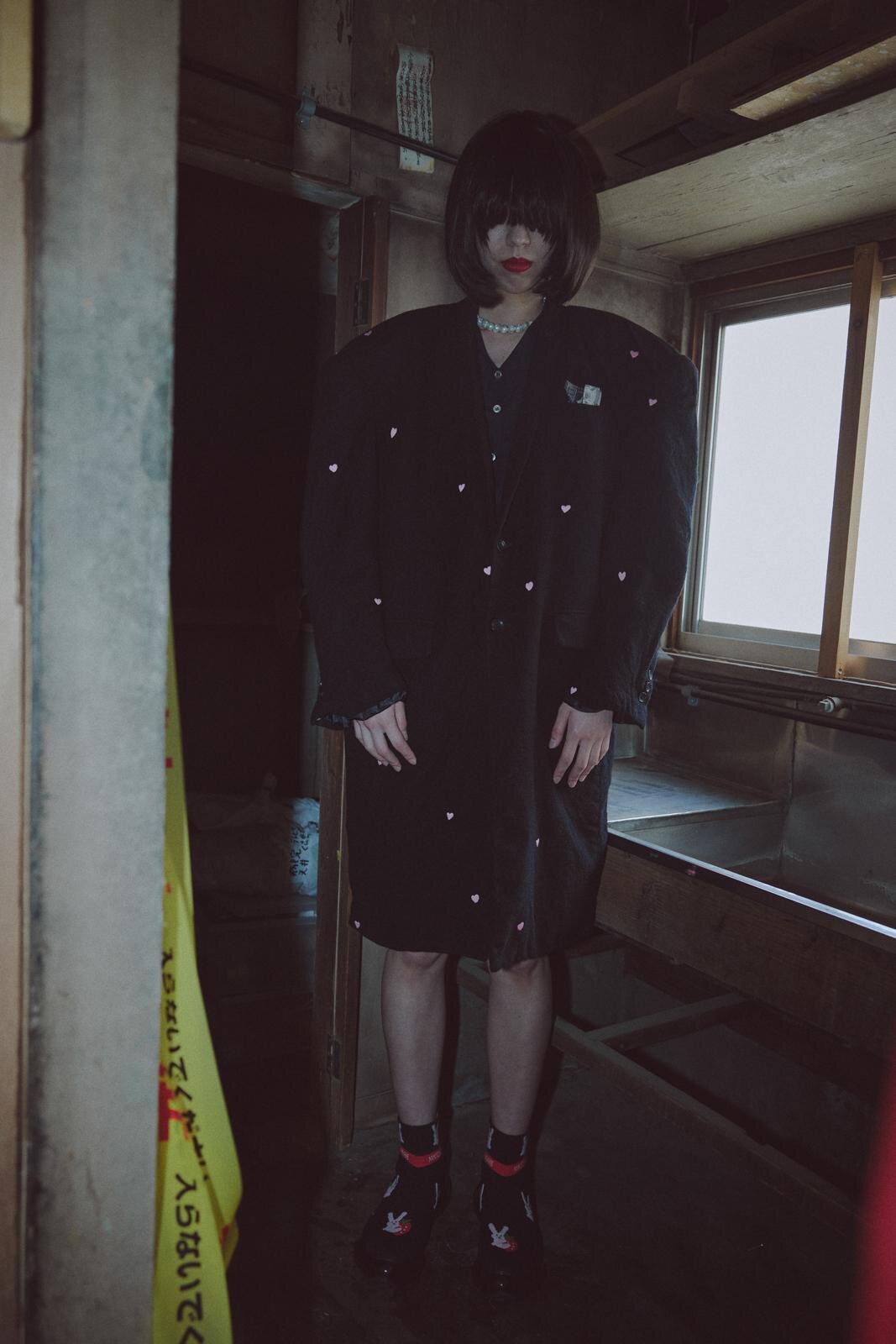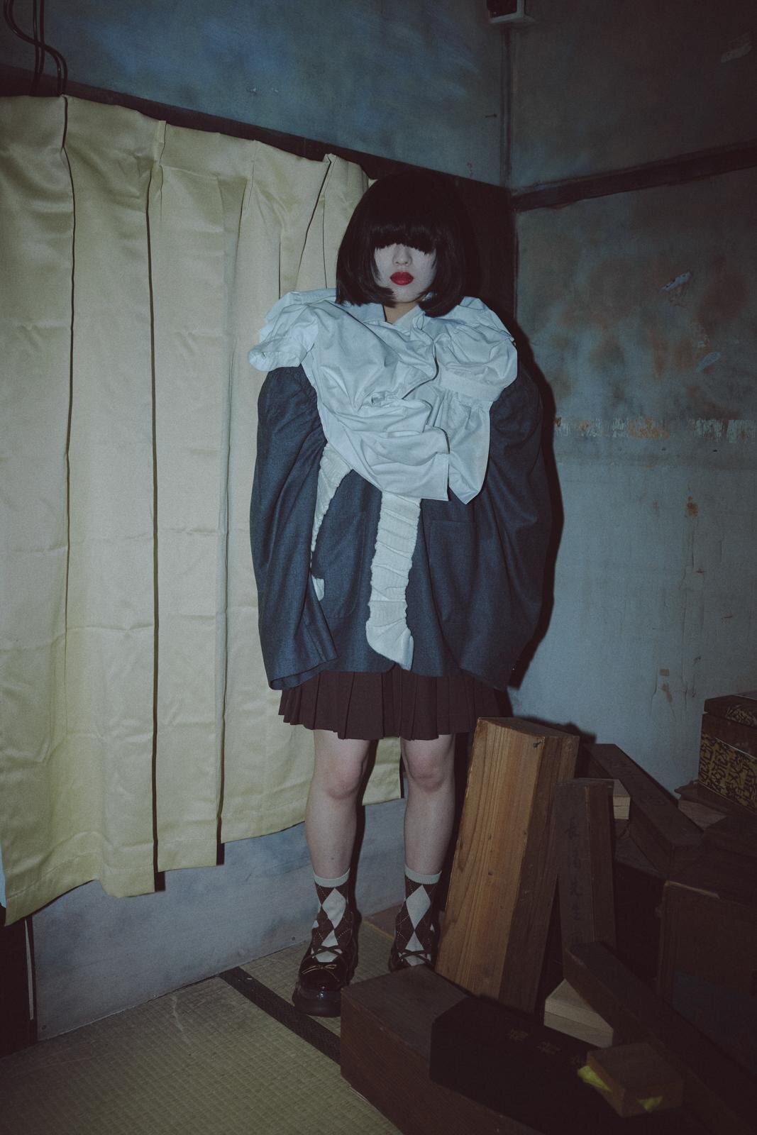 Ses vêtements sont exactement cela : une entrée dans un monde fantastique à travers la vie réelle. Ils brouillent la frontière entre l’innocence et l’inquiétude, entre le jeu et la menace.