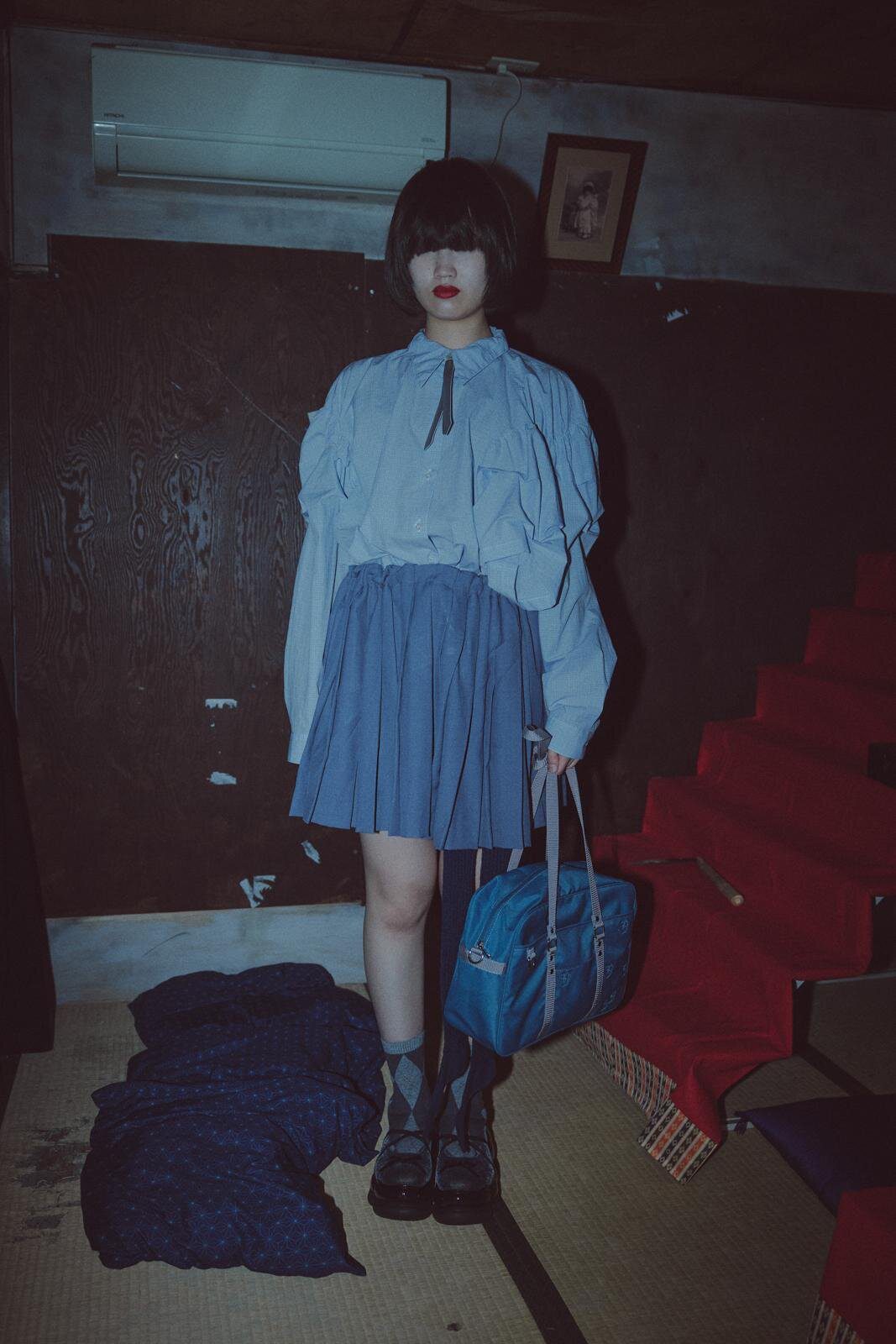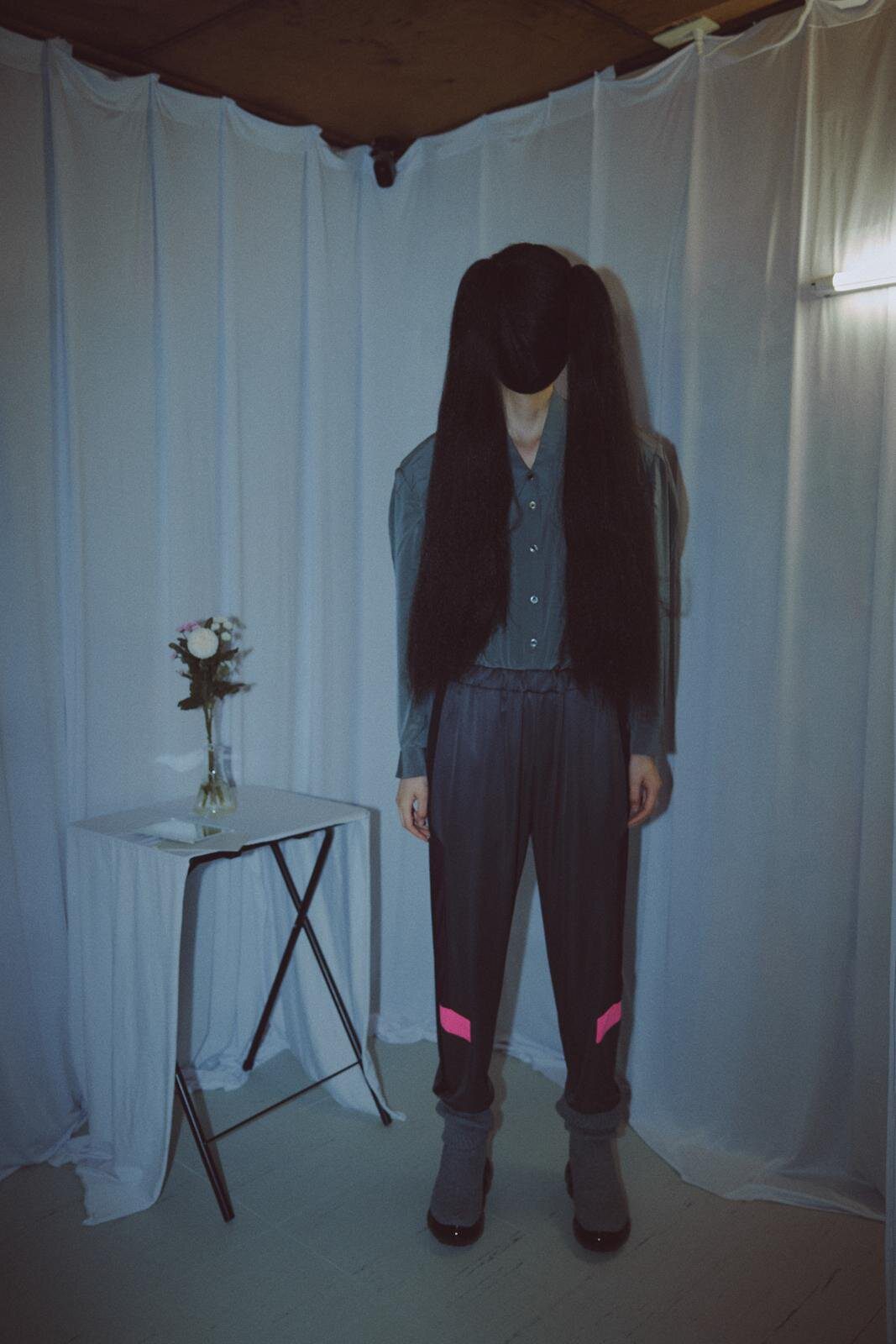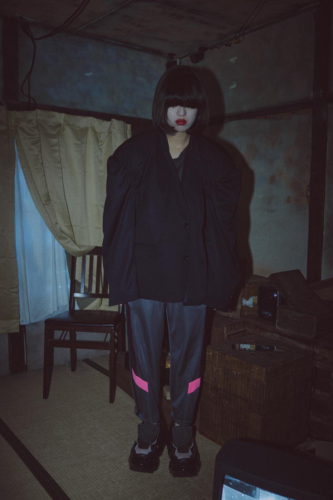 Les chaussures GROUNDS complètent l’ensemble avec une cohérence redoutable. Leurs semelles distinctives évoquant des nuages ou des bulles d’ectoplasme donnent l’impression que le porteur flotte entre deux mondes. Pour cette collection : bottes-chaussettes, mocassins à semelles épaisses, et cette paire hybride en velours rouge référence directe à la “fille aux chaussures rouges”, figure emblématique de l’horreur japonaise qui a arrêté tous les regards.