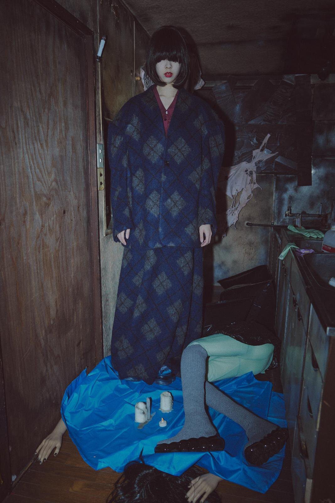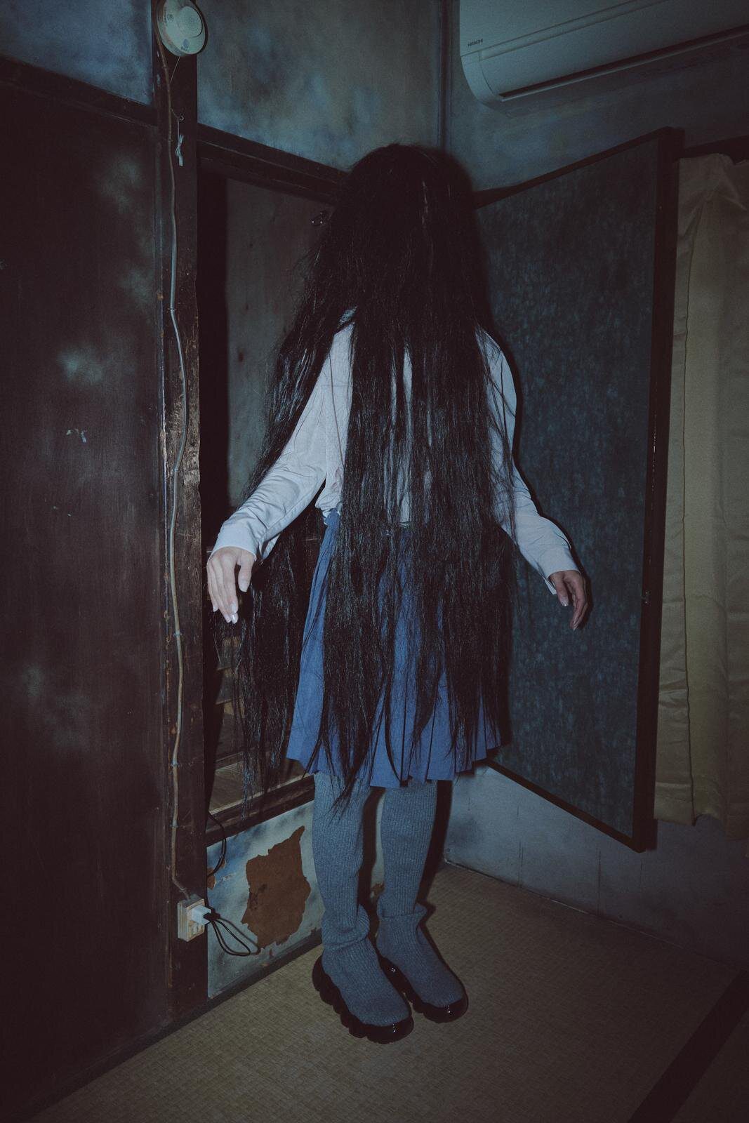 Avec “Forgotten”, Sakabe franchit un nouveau seuil. S’associant à Obaken, spécialiste de la production horrifique expérientielle, il transforme une maison hantée de 90 ans en écrin pour sa collection AH 2026-27. “Je voulais créer un espace où la mode peut s’exprimer la maison hantée est pour moi la façon la plus facile d’entrer dans un monde fantastique”.