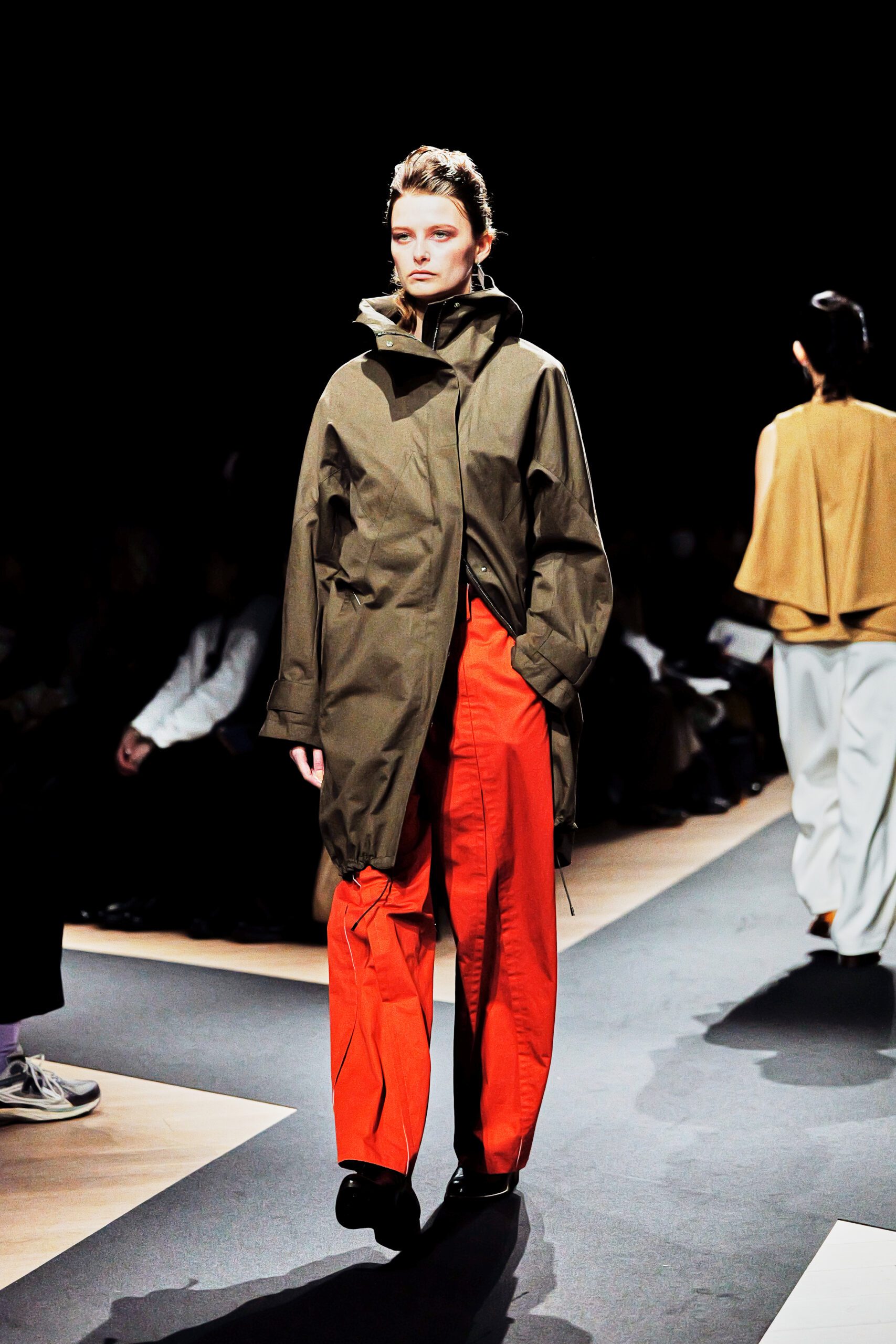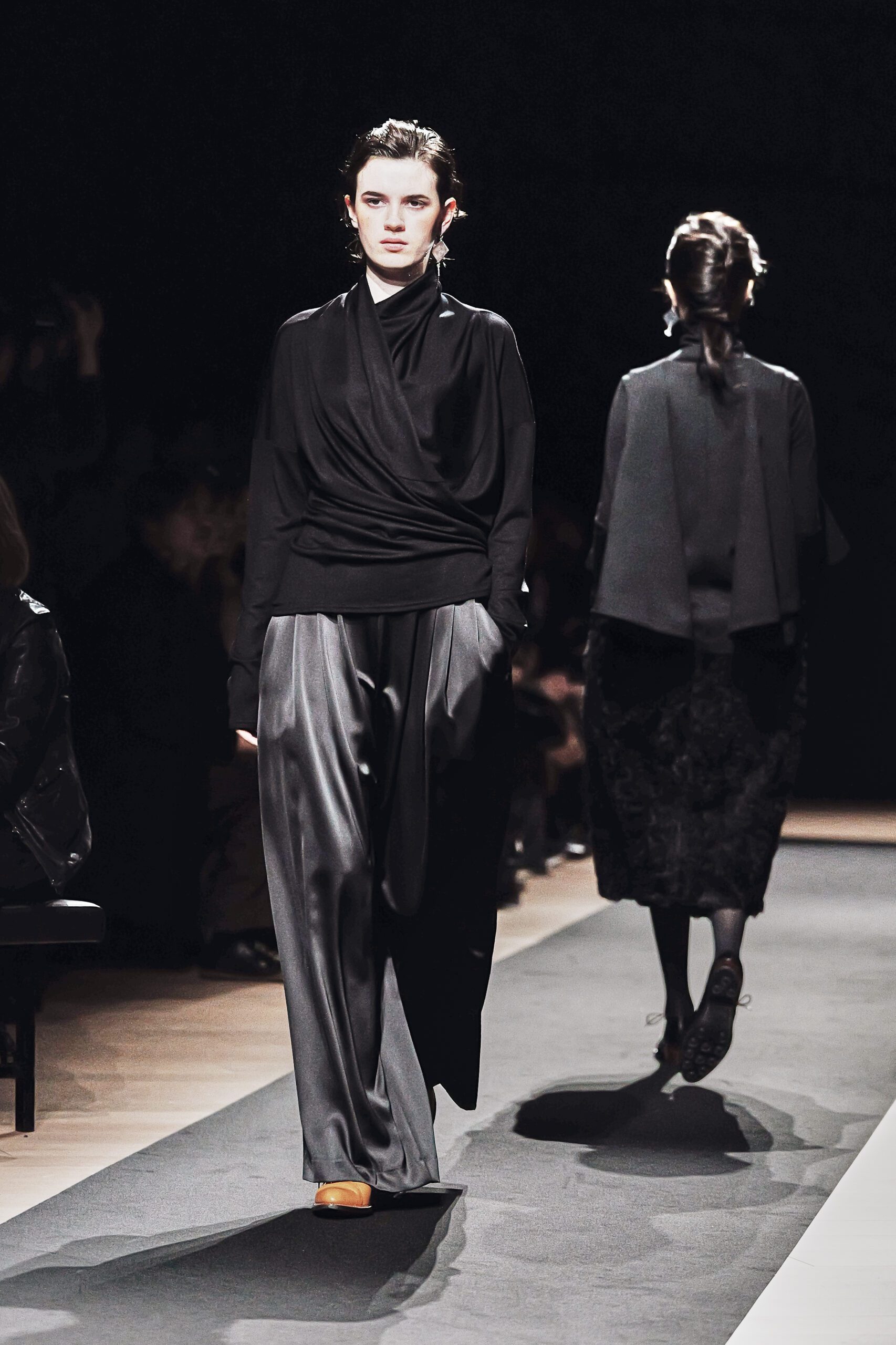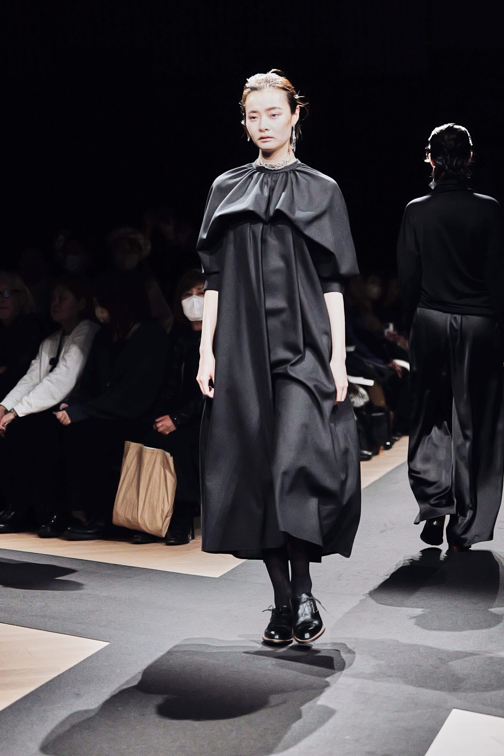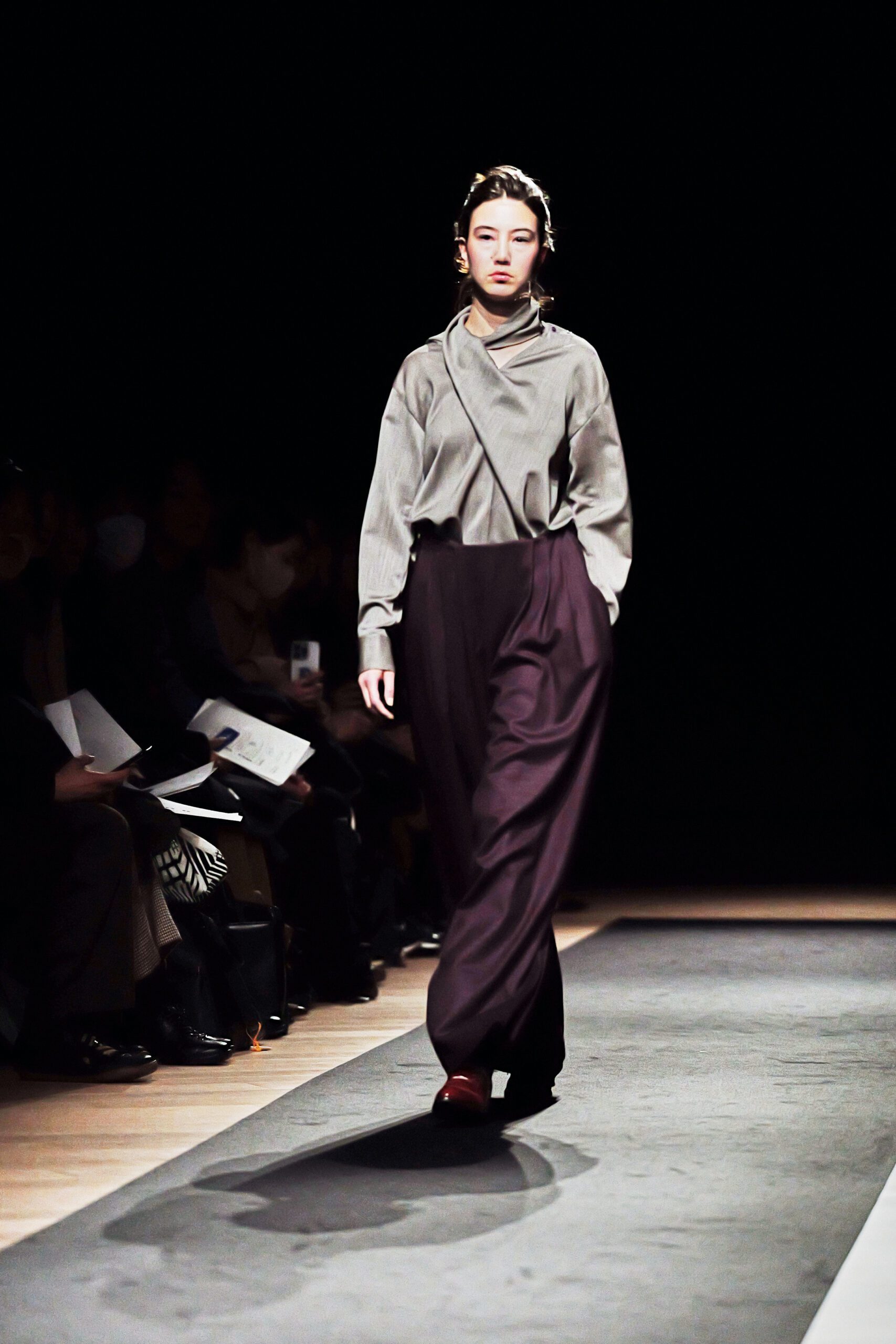 Il y a des défilés que l’on regarde, et d’autres que l’on ressent. Celui de Support Surface, présenté le 18 mars dernier dans l’enceinte austère et magistrale du Toda Building à Kyobashi, appartient résolument à la seconde catégorie. Dans l’obscurité presque totale de la salle, une composition de Makoto Araki interprétée en direct par l’artiste sonore Iu Takahashi s’est d’abord élevée seule, avant que la lumière ne vienne, lentement, ciseler le carrefour central de la scène. Et puis, le silence dans le bruit. La présence.