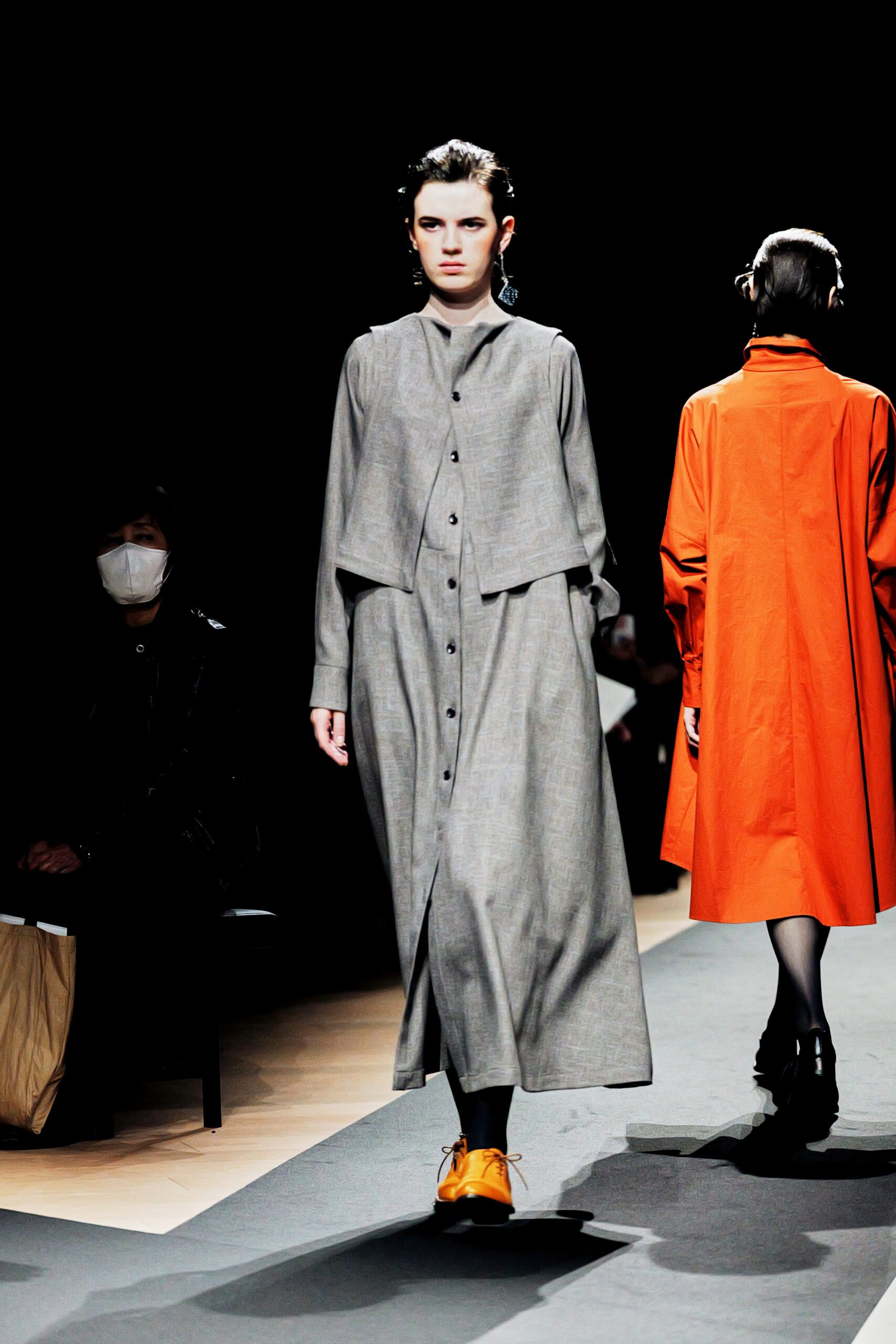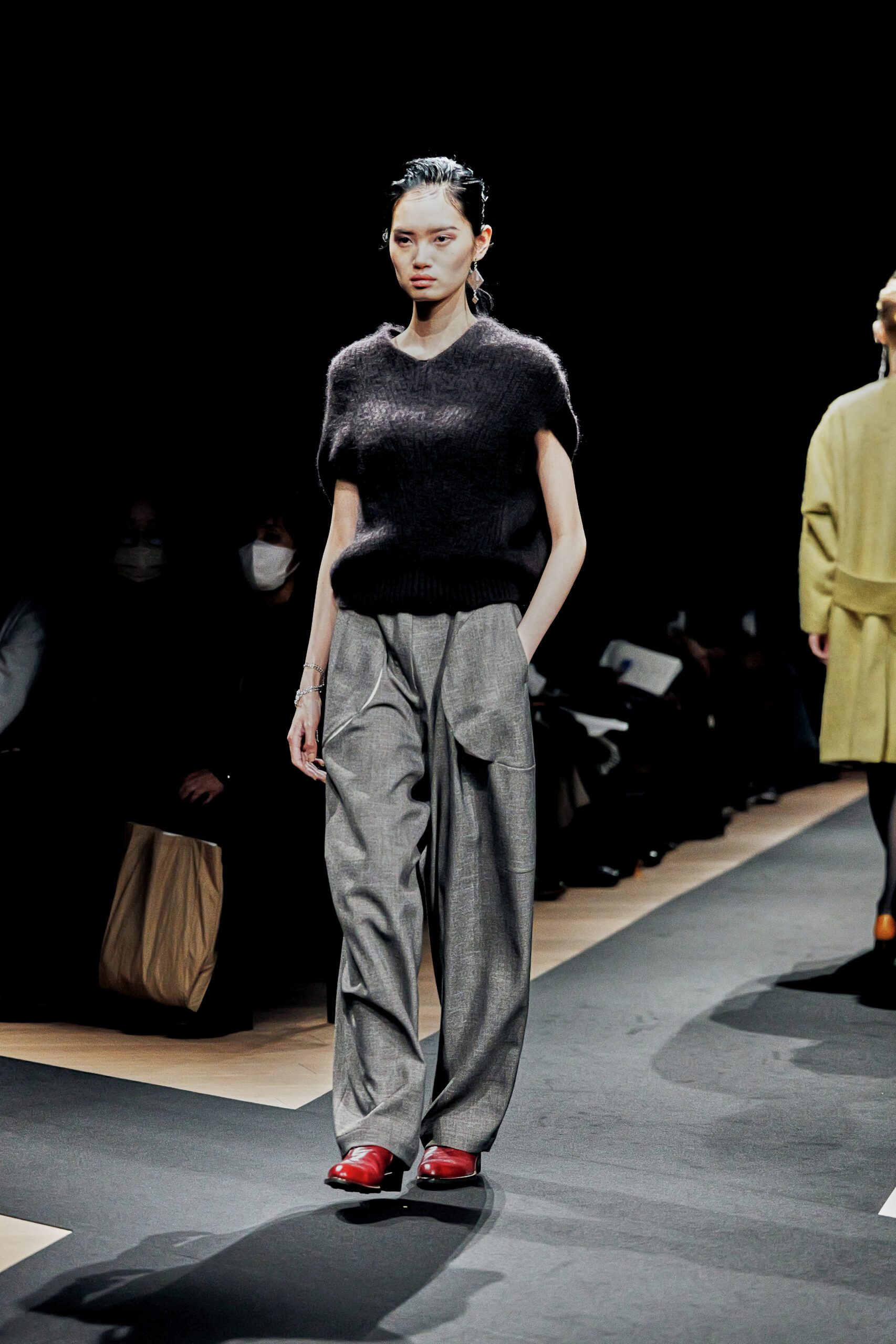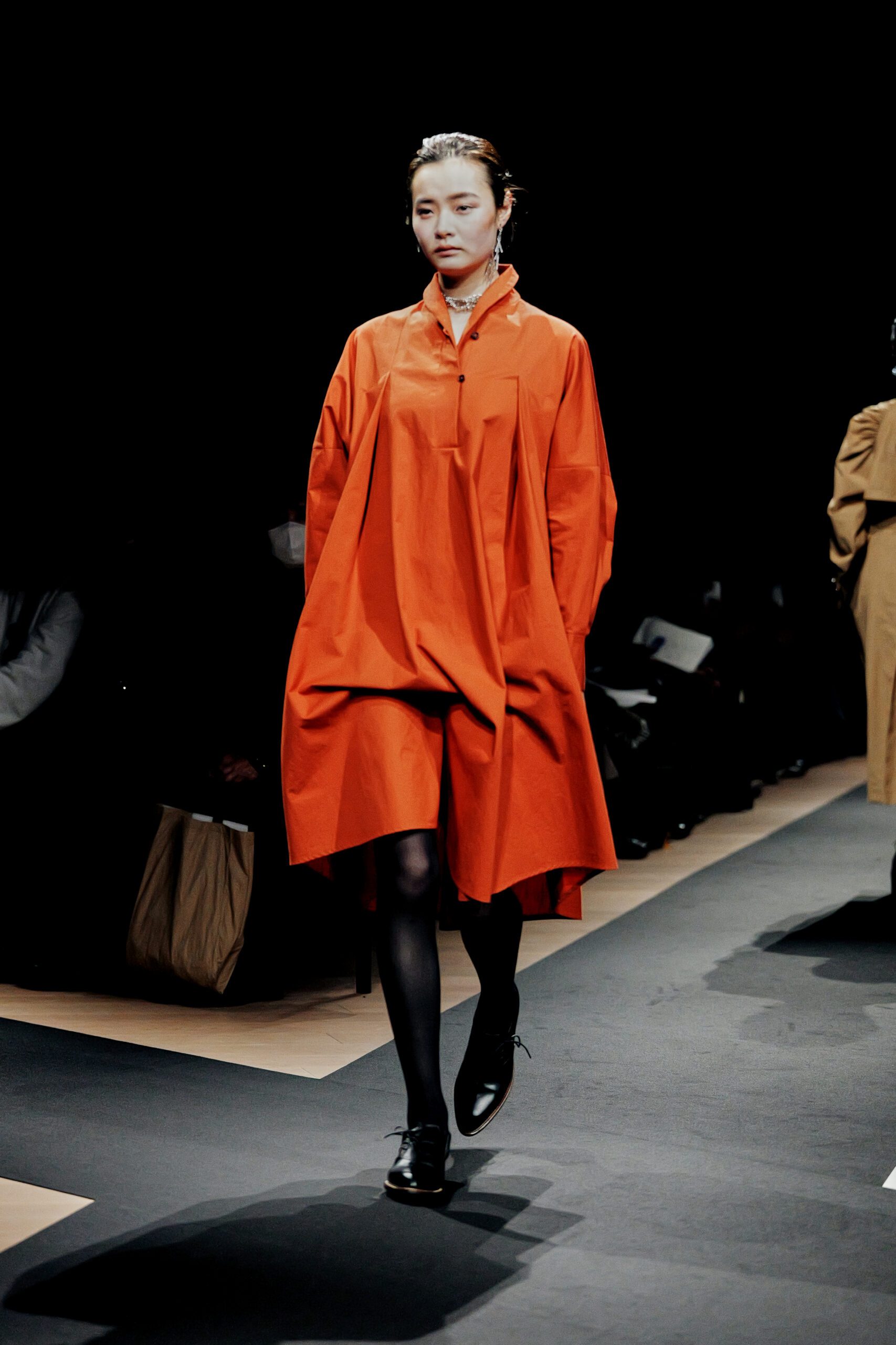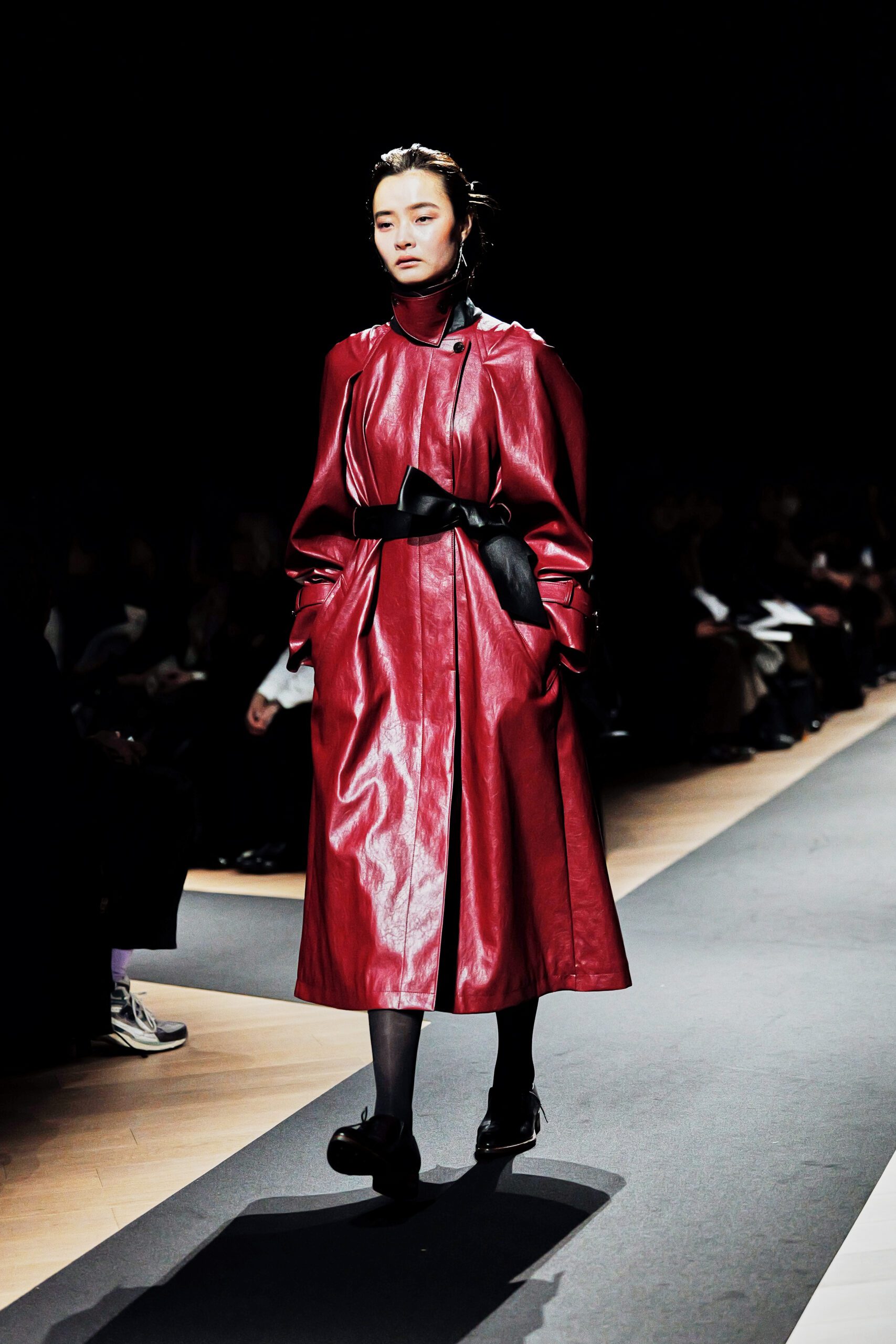 Il y a des défilés que l’on regarde, et d’autres que l’on ressent. Celui de Support Surface, présenté le 18 mars dernier dans l’enceinte austère et magistrale du Toda Building à Kyobashi, appartient résolument à la seconde catégorie. Dans l’obscurité presque totale de la salle, une composition de Makoto Araki interprétée en direct par l’artiste sonore Iu Takahashi s’est d’abord élevée seule, avant que la lumière ne vienne, lentement, ciseler le carrefour central de la scène. Et puis, le silence dans le bruit. La présence.