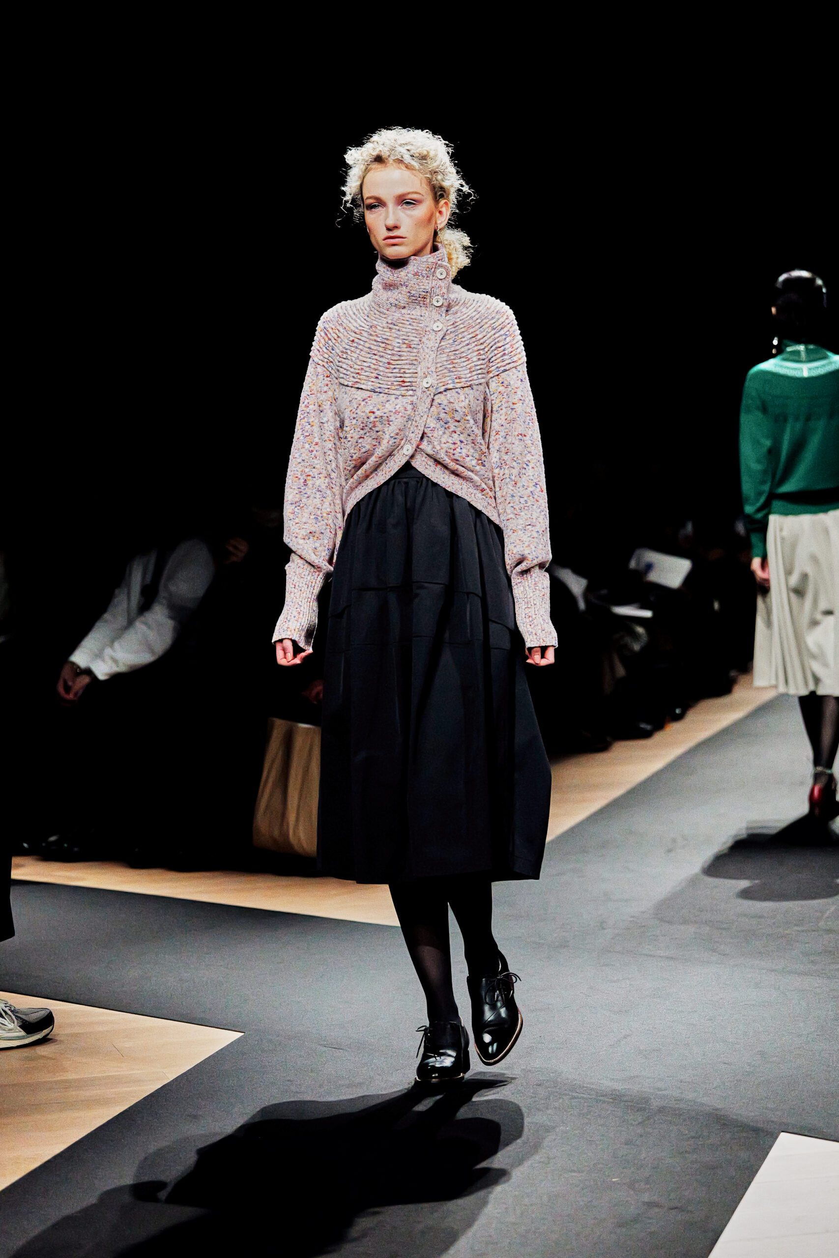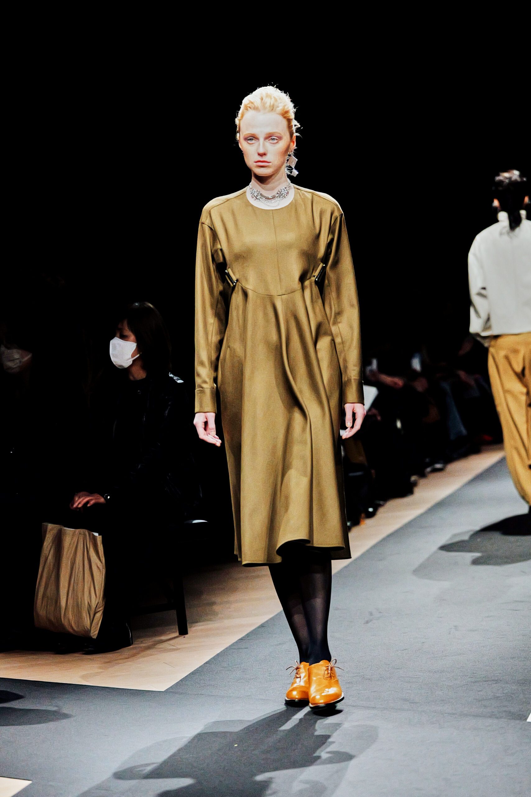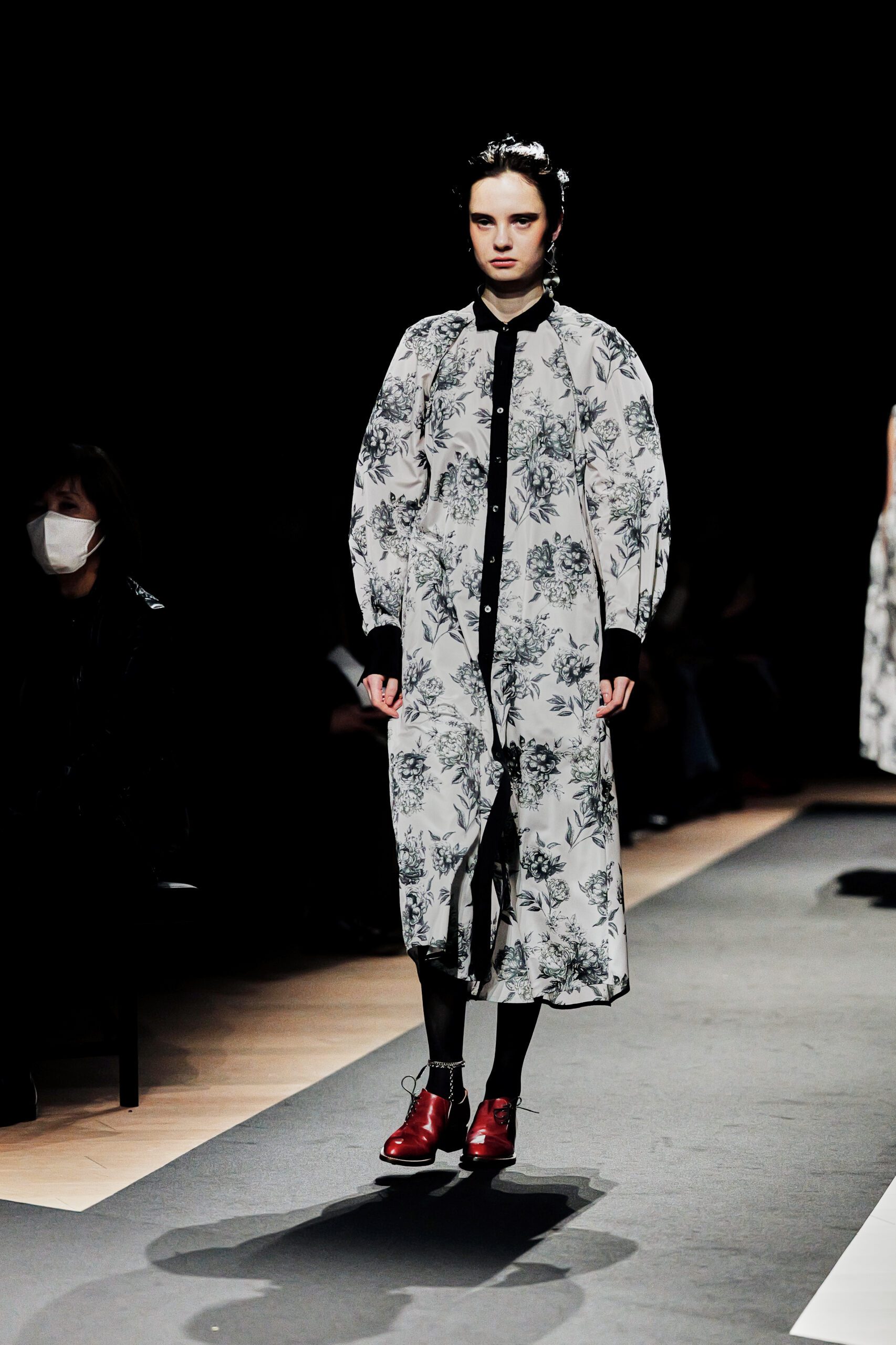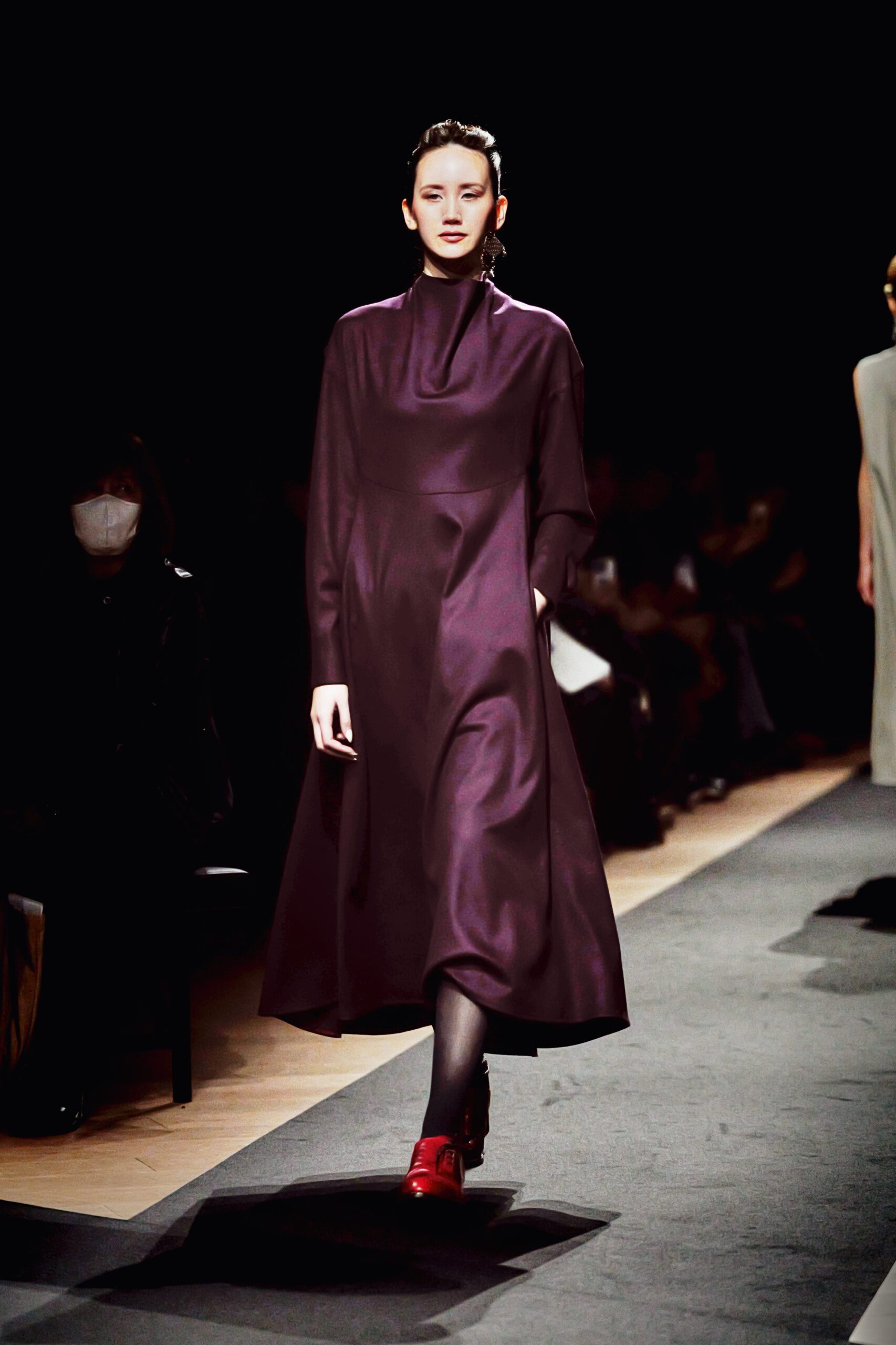 Il y a des défilés que l’on regarde, et d’autres que l’on ressent. Celui de Support Surface, présenté le 18 mars dernier dans l’enceinte austère et magistrale du Toda Building à Kyobashi, appartient résolument à la seconde catégorie. Dans l’obscurité presque totale de la salle, une composition de Makoto Araki interprétée en direct par l’artiste sonore Iu Takahashi s’est d’abord élevée seule, avant que la lumière ne vienne, lentement, ciseler le carrefour central de la scène. Et puis, le silence dans le bruit. La présence.