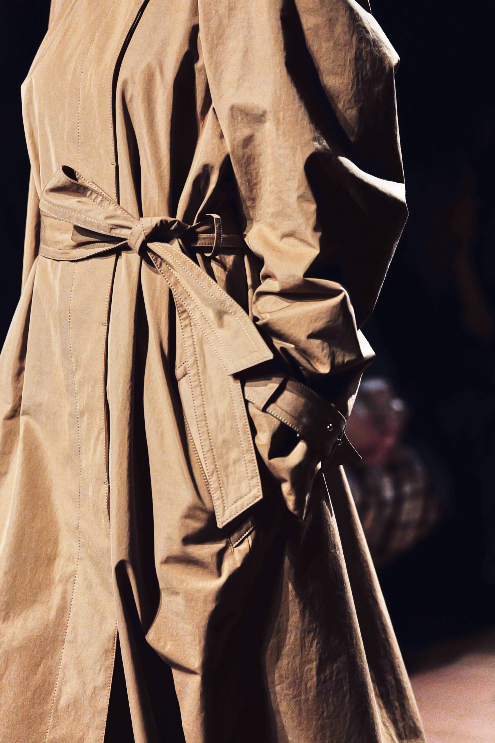Les pièces ne cherchent pas à séduire dans l’immobilité elles se révèlent dans le mouvement. Une blouse terracotta aux volants généreux à l’encolure ondule à chaque pas comme si le tissu respirait. Un trench en coton grège aux épaulements structurés et à la cape dorsale froncée révèle au retourné toute la sophistication de sa construction intérieure. Ce n’est pas de la mode que l’on porte c’est de la mode qui vous accompagne.