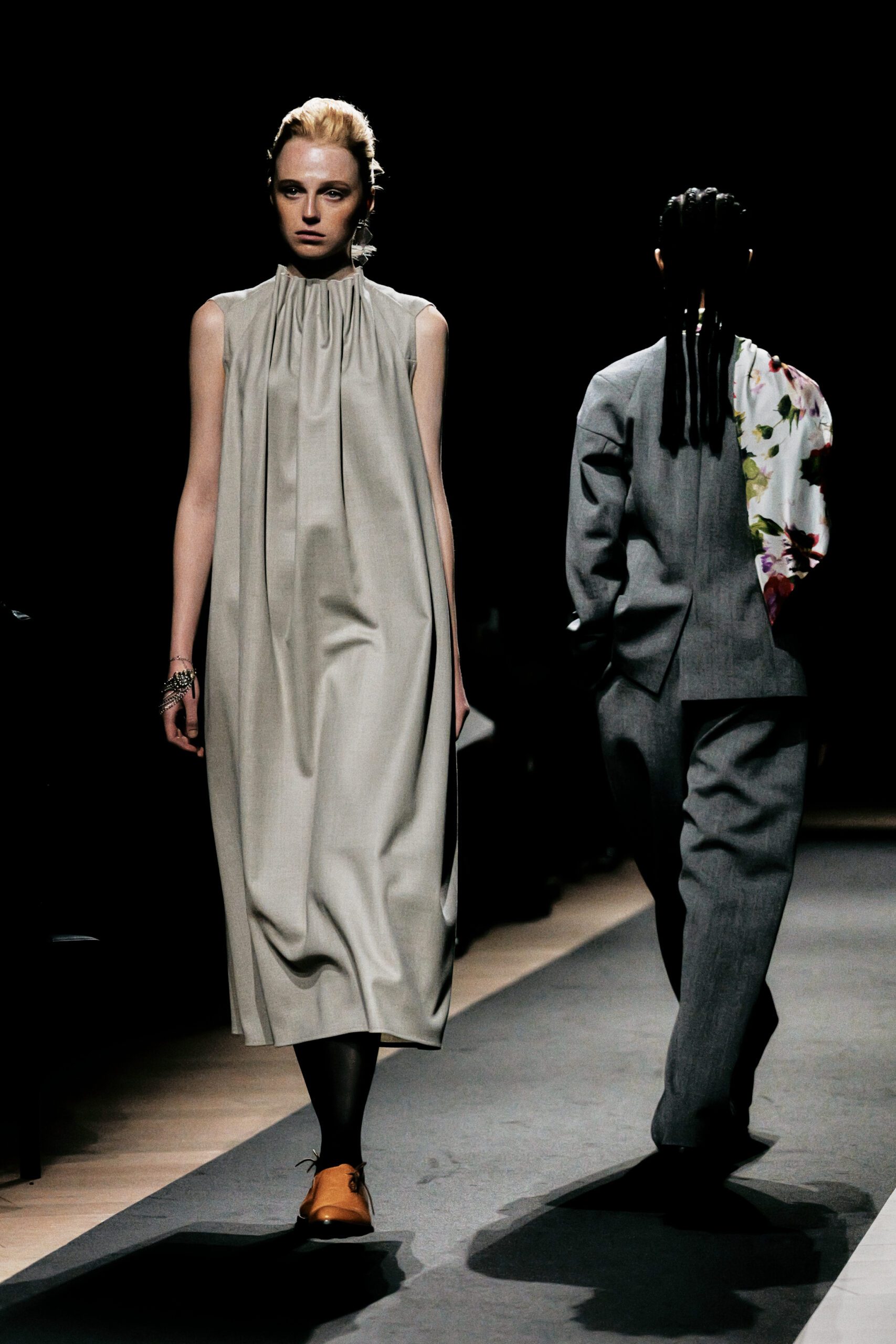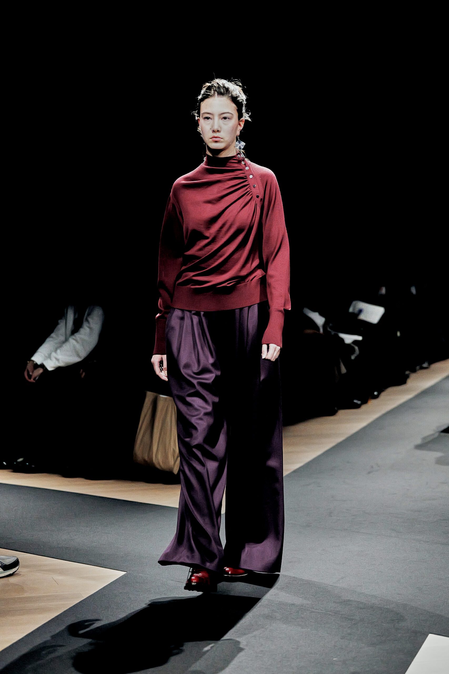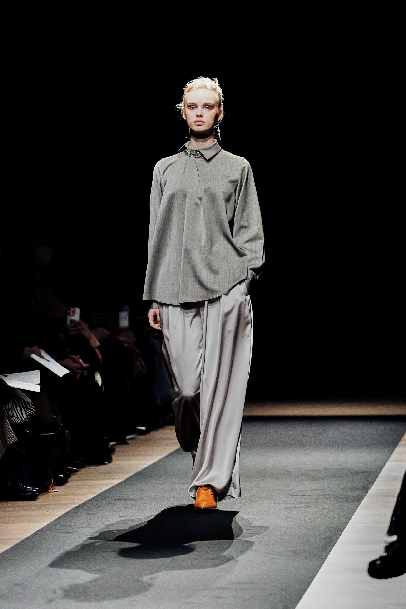 Surikabe l’a affirmé sans détour : il préfère huit pantalons pour deux jupes. Ce choix n’est pas anodin dans un milieu où la robe reste souvent l’unité de mesure du féminin. Ici, le pantalon est le vêtement-manifeste large, plissé, architectural dans sa coupe, rehaussé de poches en soufflet qui lui confèrent une identité propre. Portés avec des bottines en cuir cognac aux lignes sculptées, ils dessinent une femme qui marche, qui occupe l’espace, qui n’attend pas la permission d’exister.