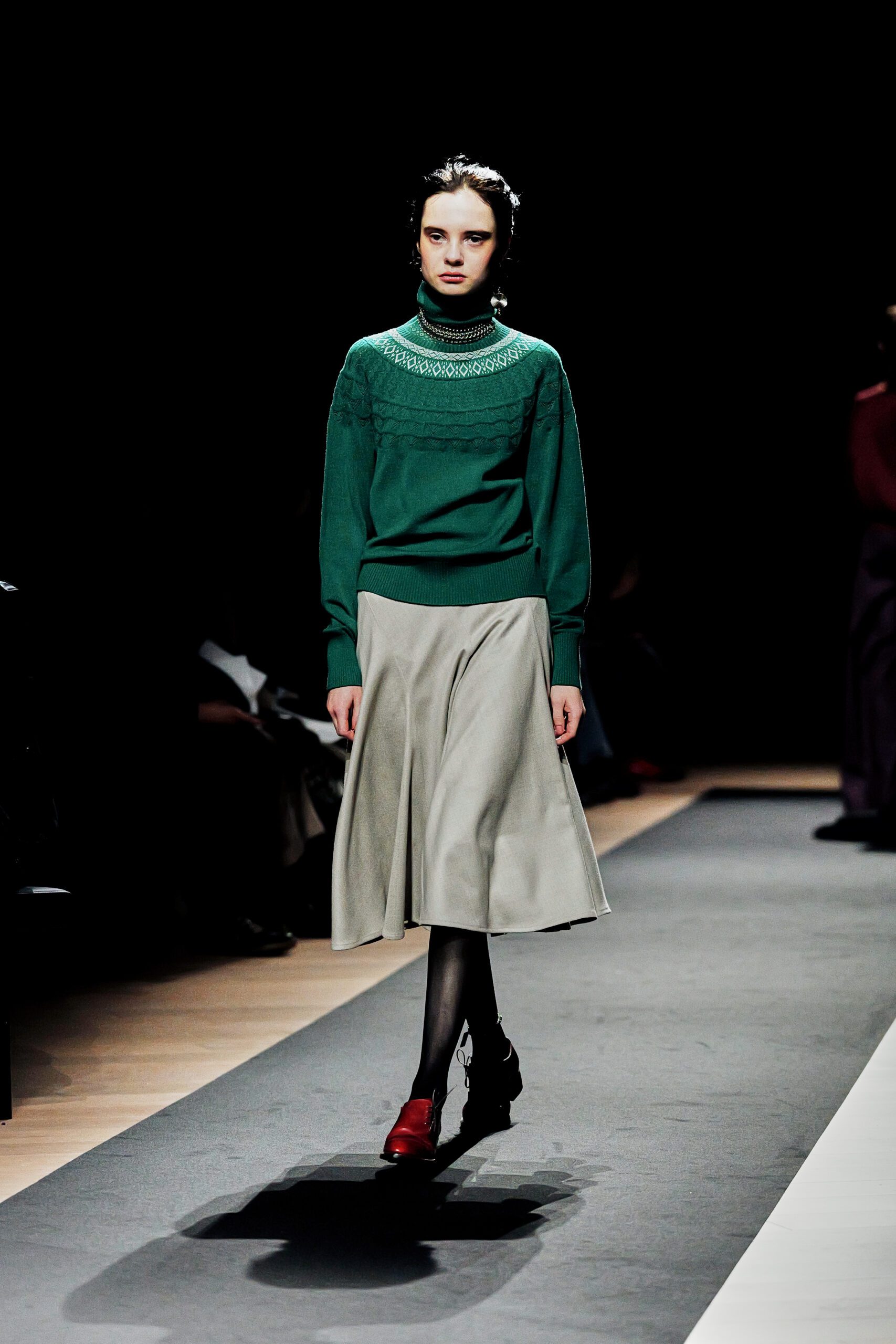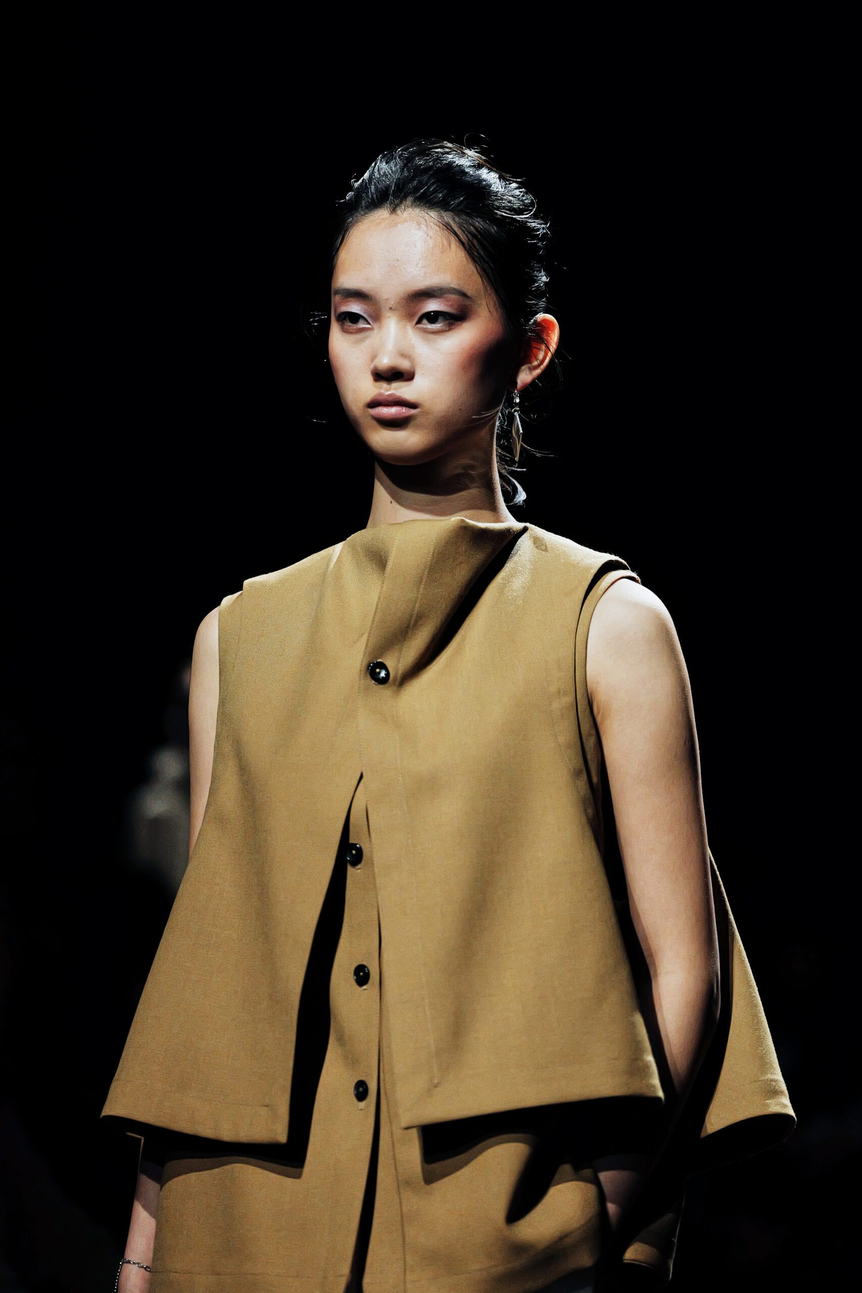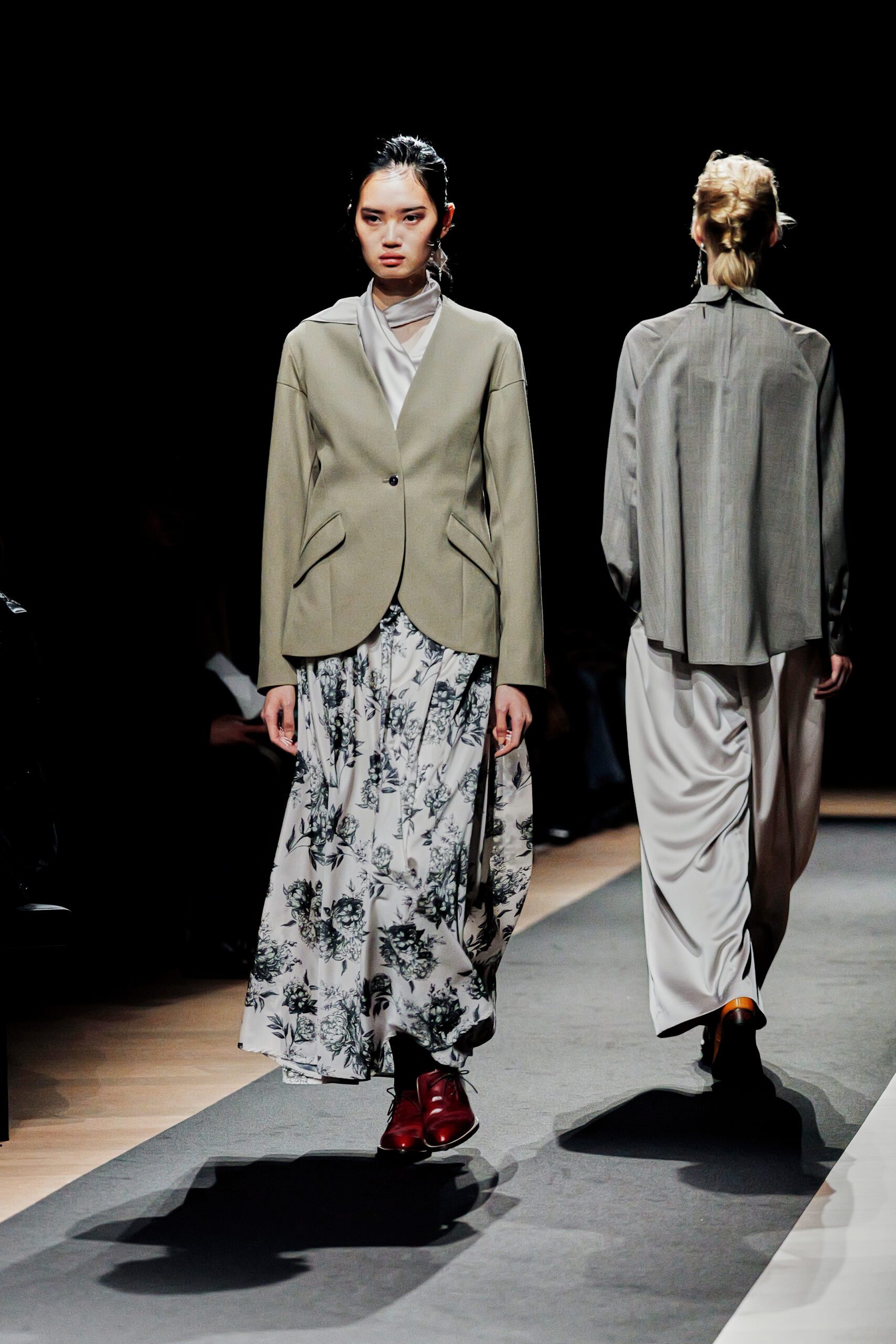 Surikabe l’a affirmé sans détour : il préfère huit pantalons pour deux jupes. Ce choix n’est pas anodin dans un milieu où la robe reste souvent l’unité de mesure du féminin. Ici, le pantalon est le vêtement-manifeste large, plissé, architectural dans sa coupe, rehaussé de poches en soufflet qui lui confèrent une identité propre. Portés avec des bottines en cuir cognac aux lignes sculptées, ils dessinent une femme qui marche, qui occupe l’espace, qui n’attend pas la permission d’exister.