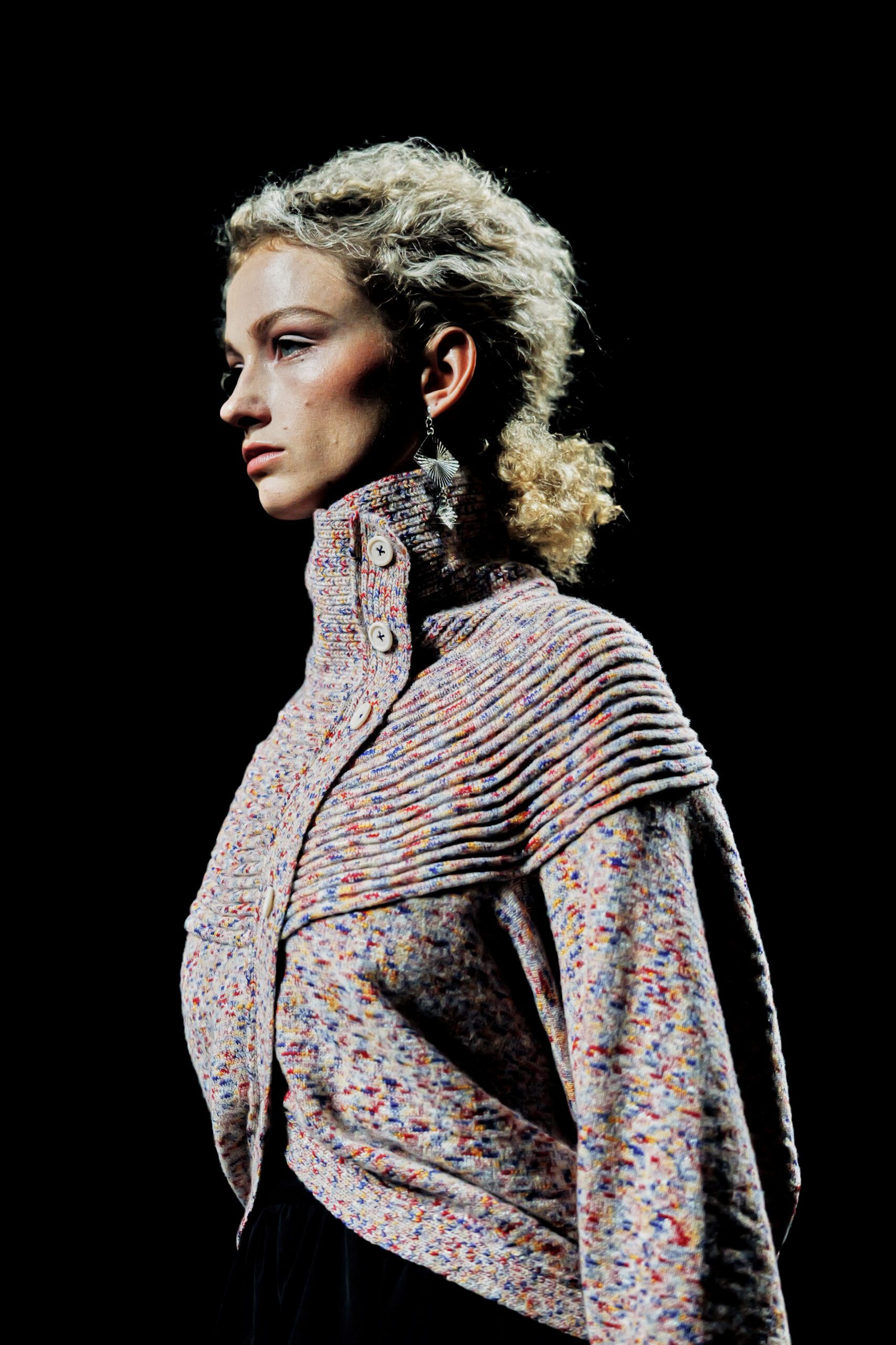 Cette logique du décalage traverse l’ensemble de la collection. Les pulls sont asymétriques, les encolures travaillées de façon inattendue une demi-ouverture ici, un plissé profond dans le cou là comme si chaque pièce portait en elle une légère torsion de ses propres codes. Ce n’est pas de la provocation. C’est de la sophistication dans son sens le plus pur : l’art de rendre complexe ce qui semblait simple, sans jamais le trahir.