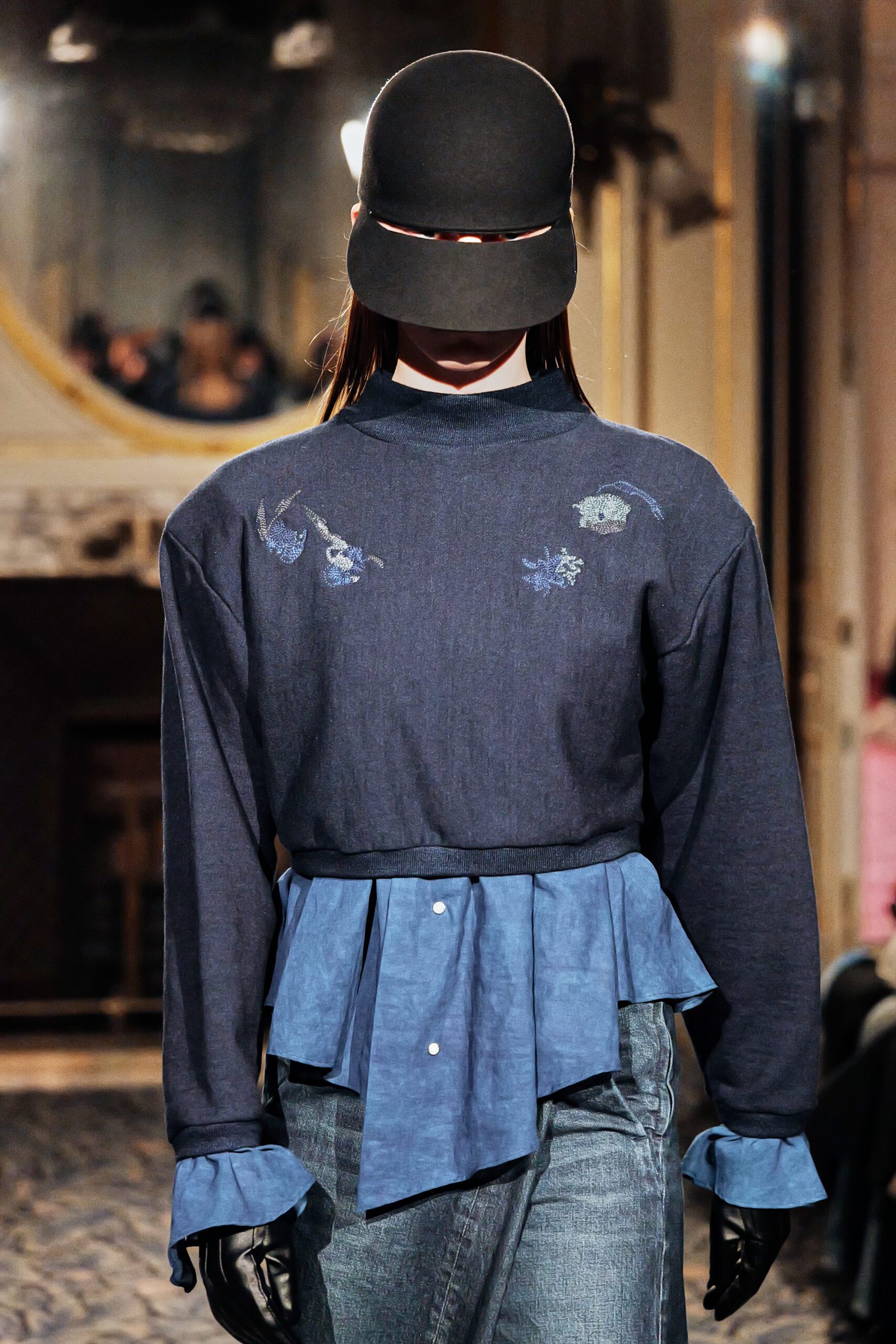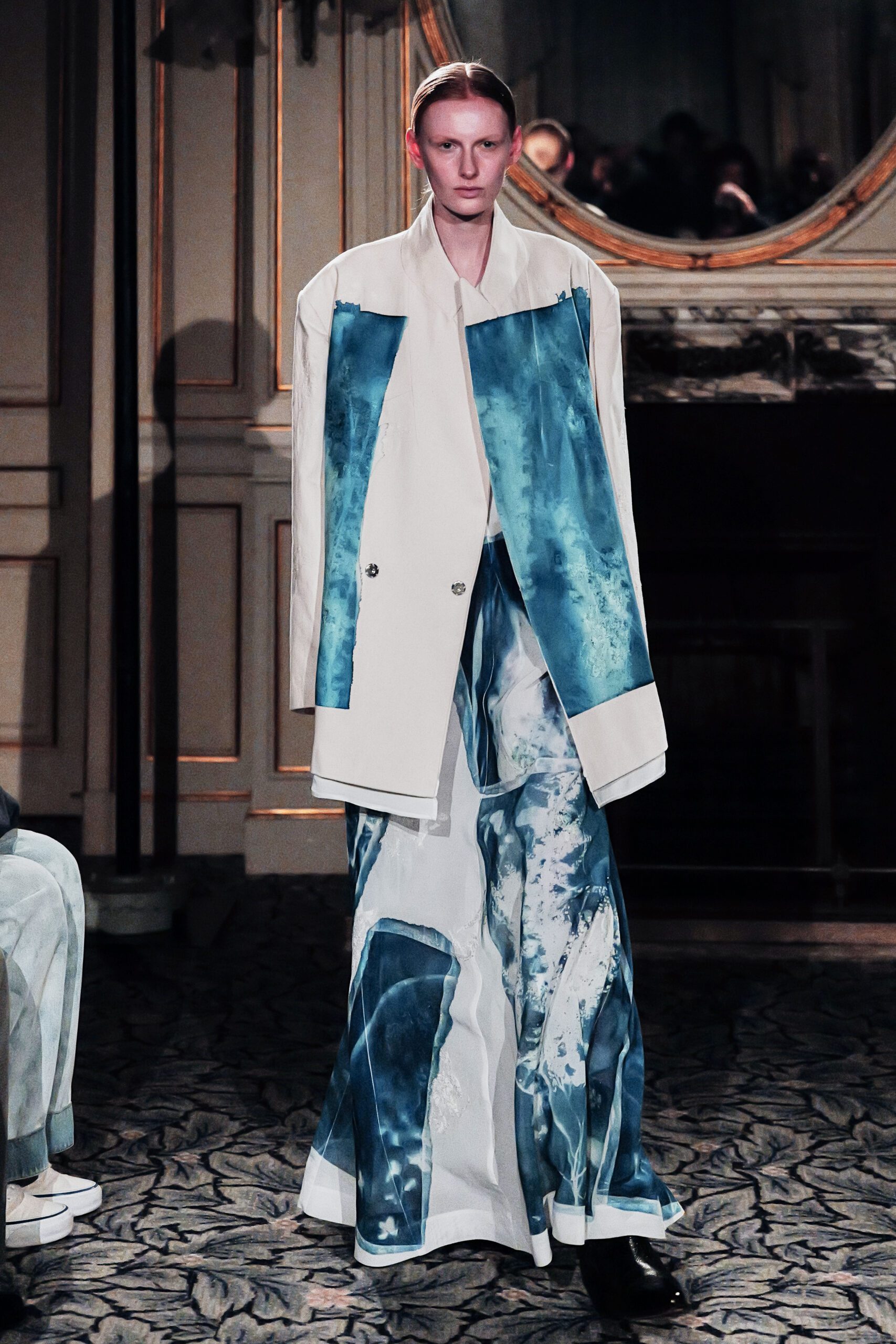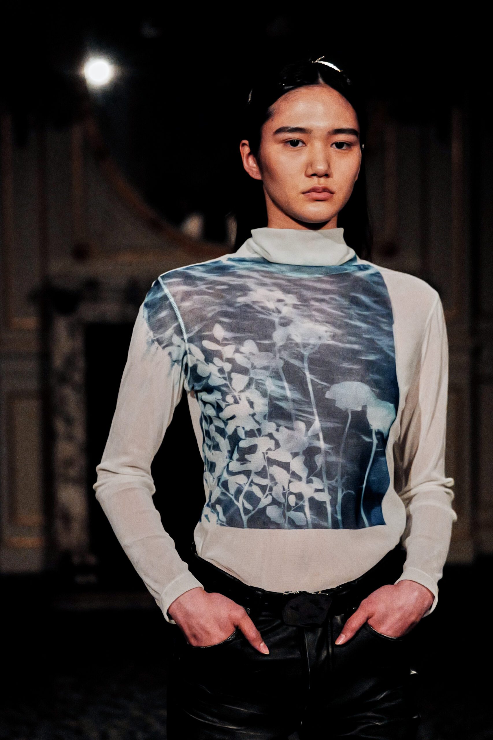 Le bleu du cyanotype et le bleu du denim se rejoignent ici sans se confondre. L’un est brut, structurel, millénaire dans ses usages ; l’autre est lumière capturée, image du monde naturel posée sur la matière ouvrière. Ce dialogue entre deux expressions du même non-couleur constitue l’un des moments les plus sobrement poétiques de toute cette Fashion Week de Tokyo.