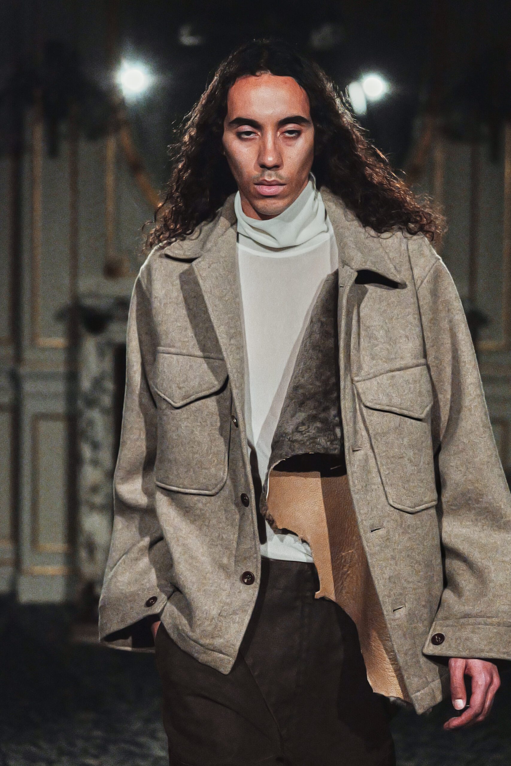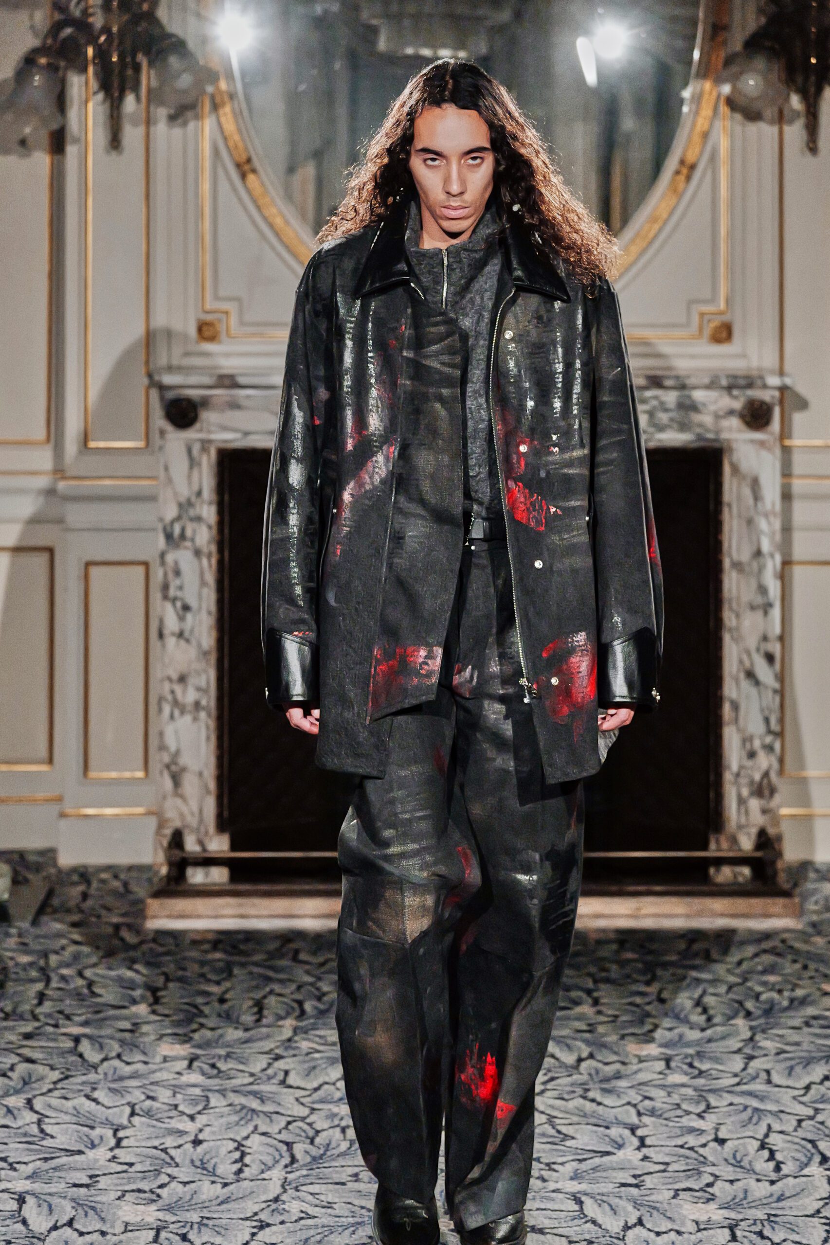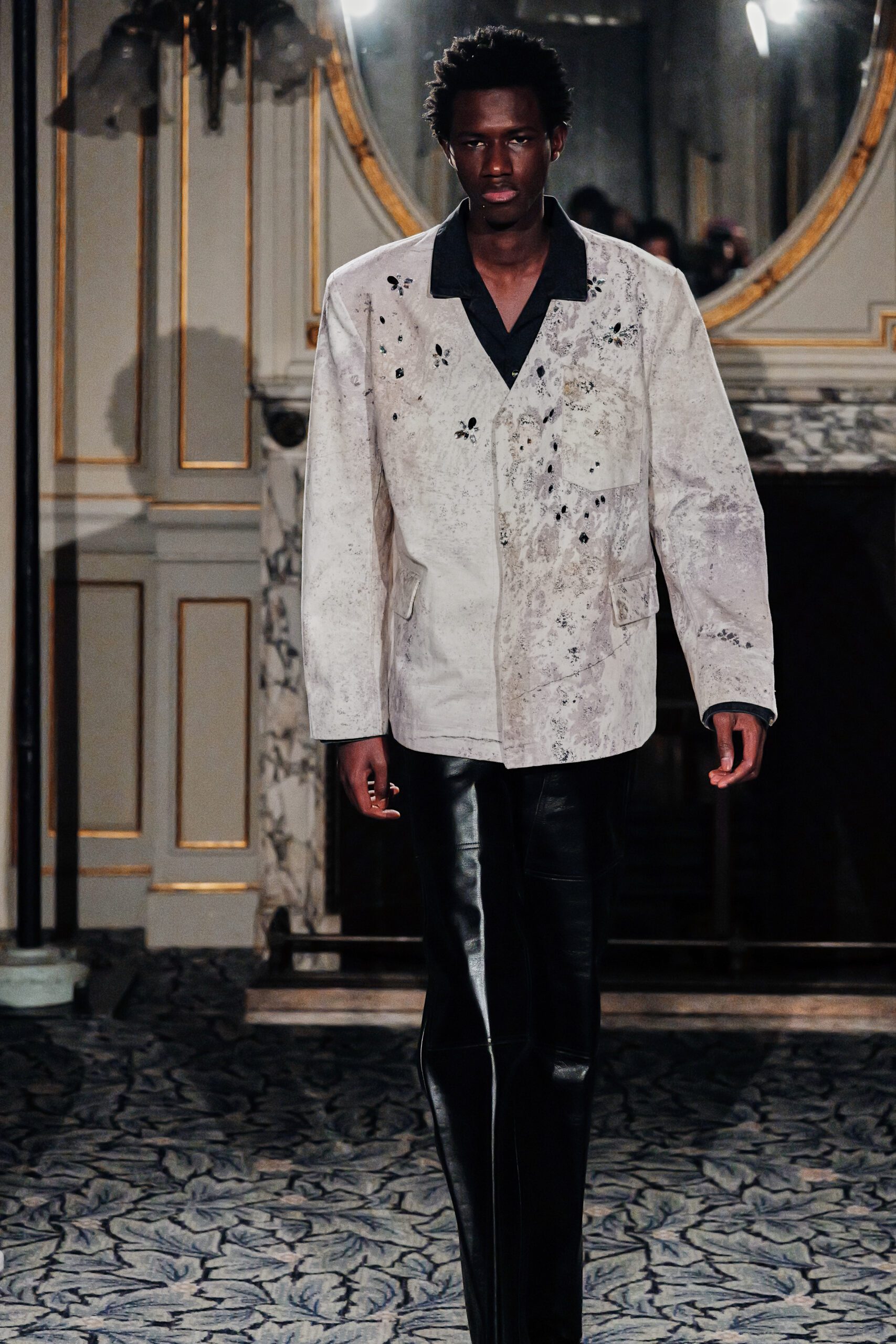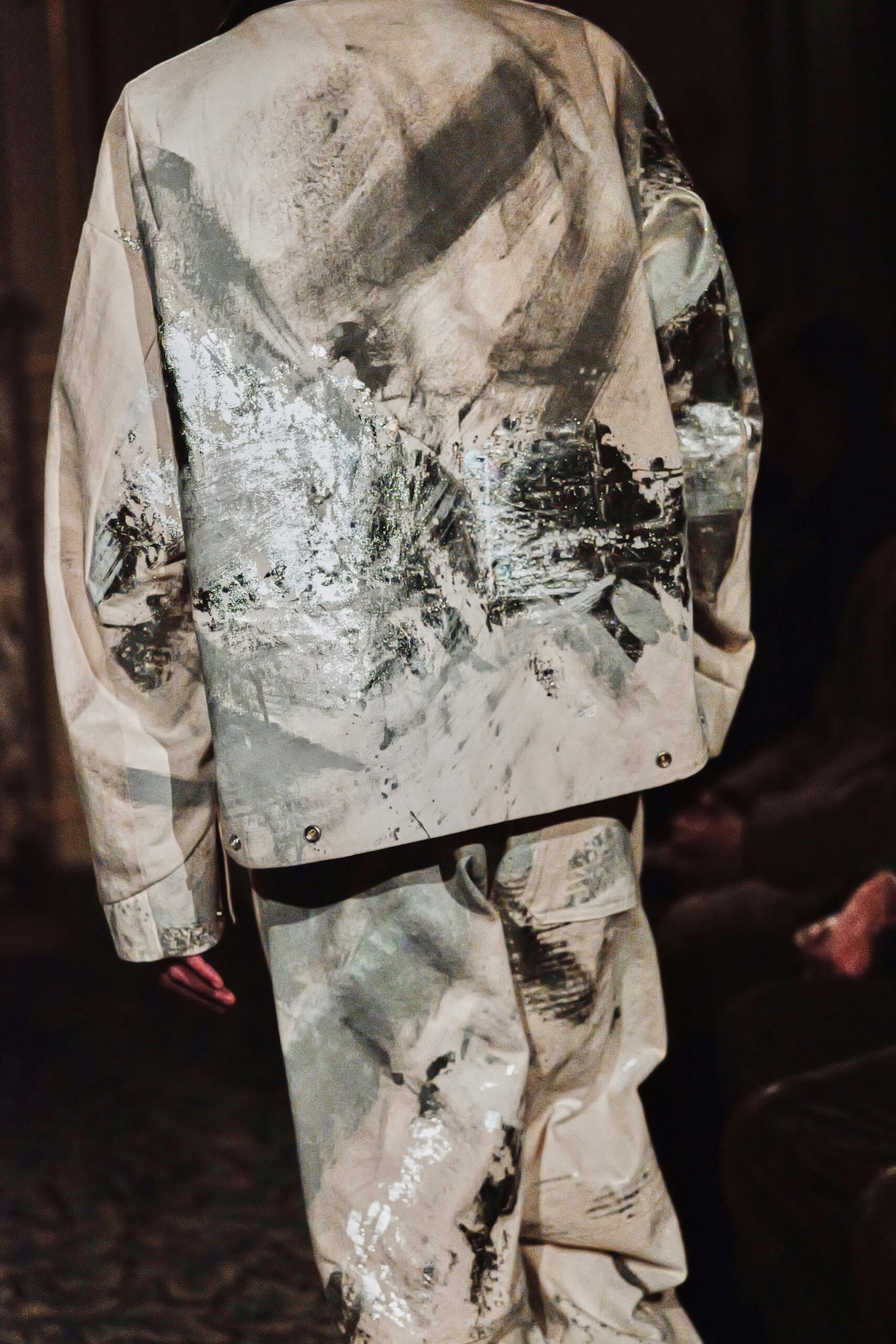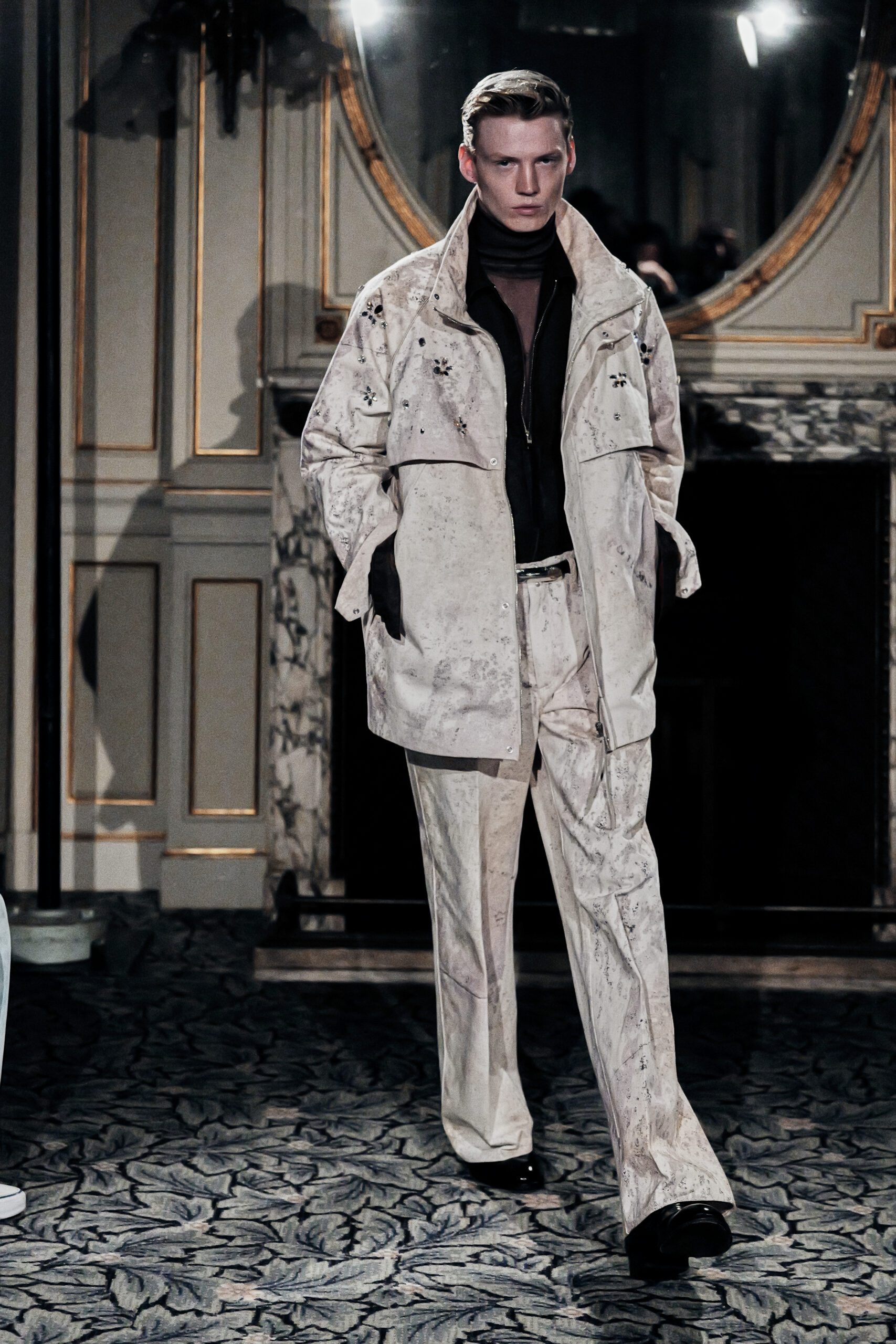 Du côté des hommes, la veste sans col ornée de bijoux restera l’une de mes images de la saison. L’impression à la feuille d’argent, les effets de délavage intégrés comme autant d’années vécues c’est une pièce qui raconte une histoire avant même que son porteur ait prononcé un mot.