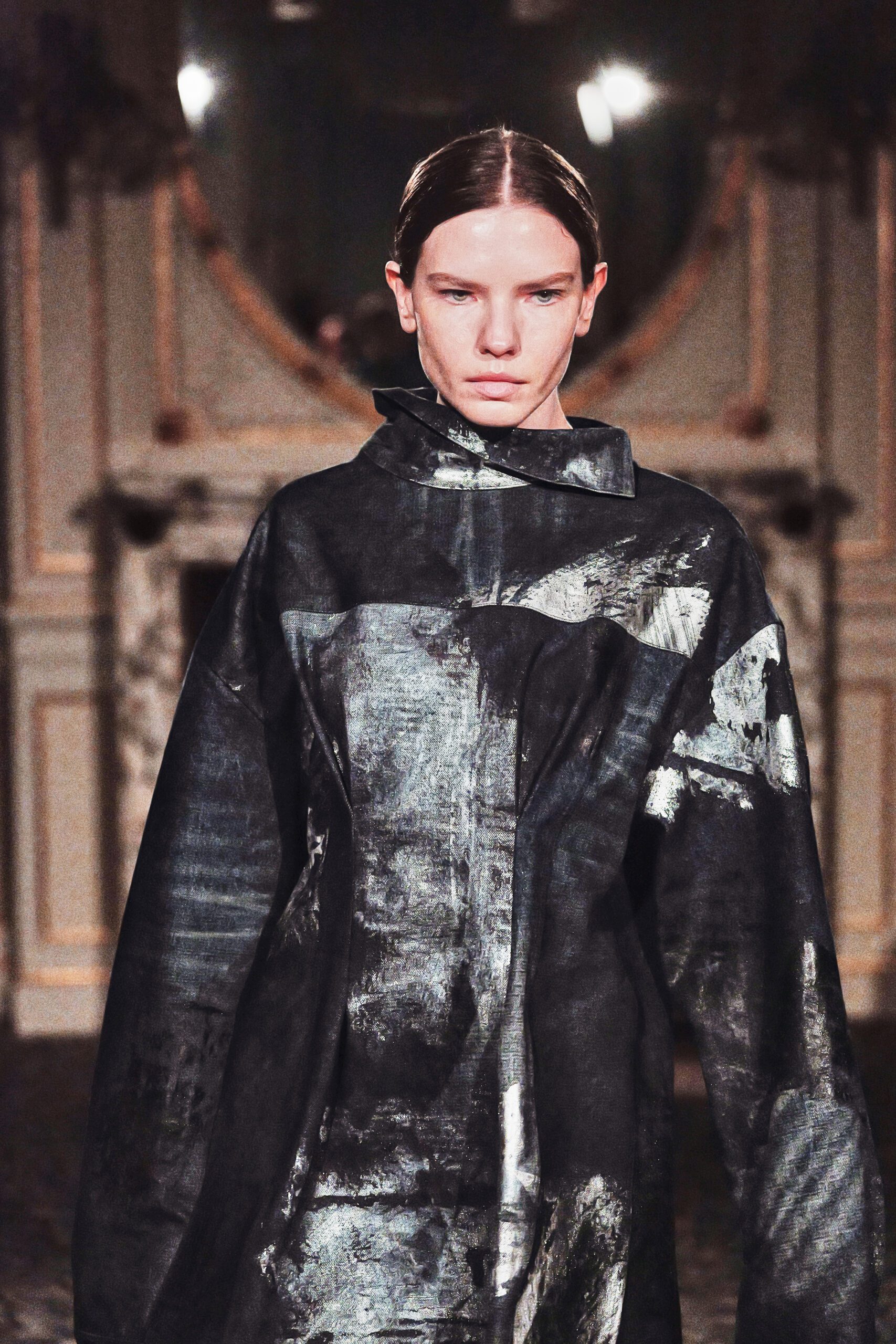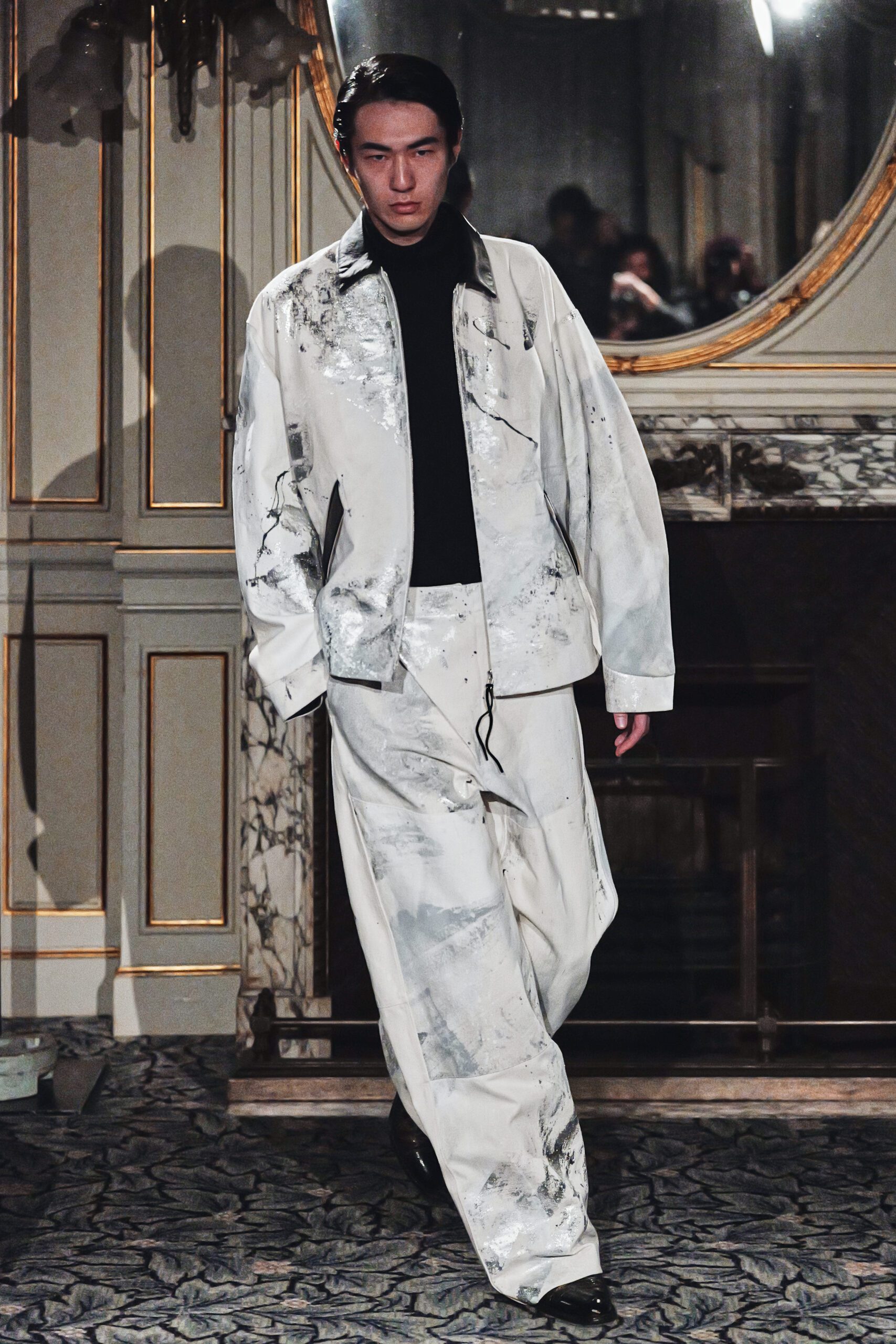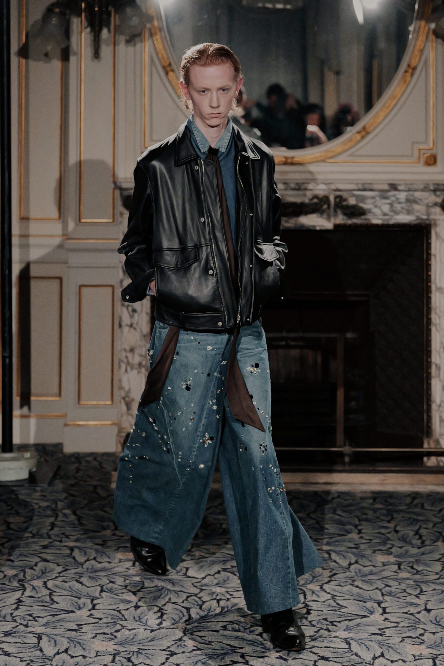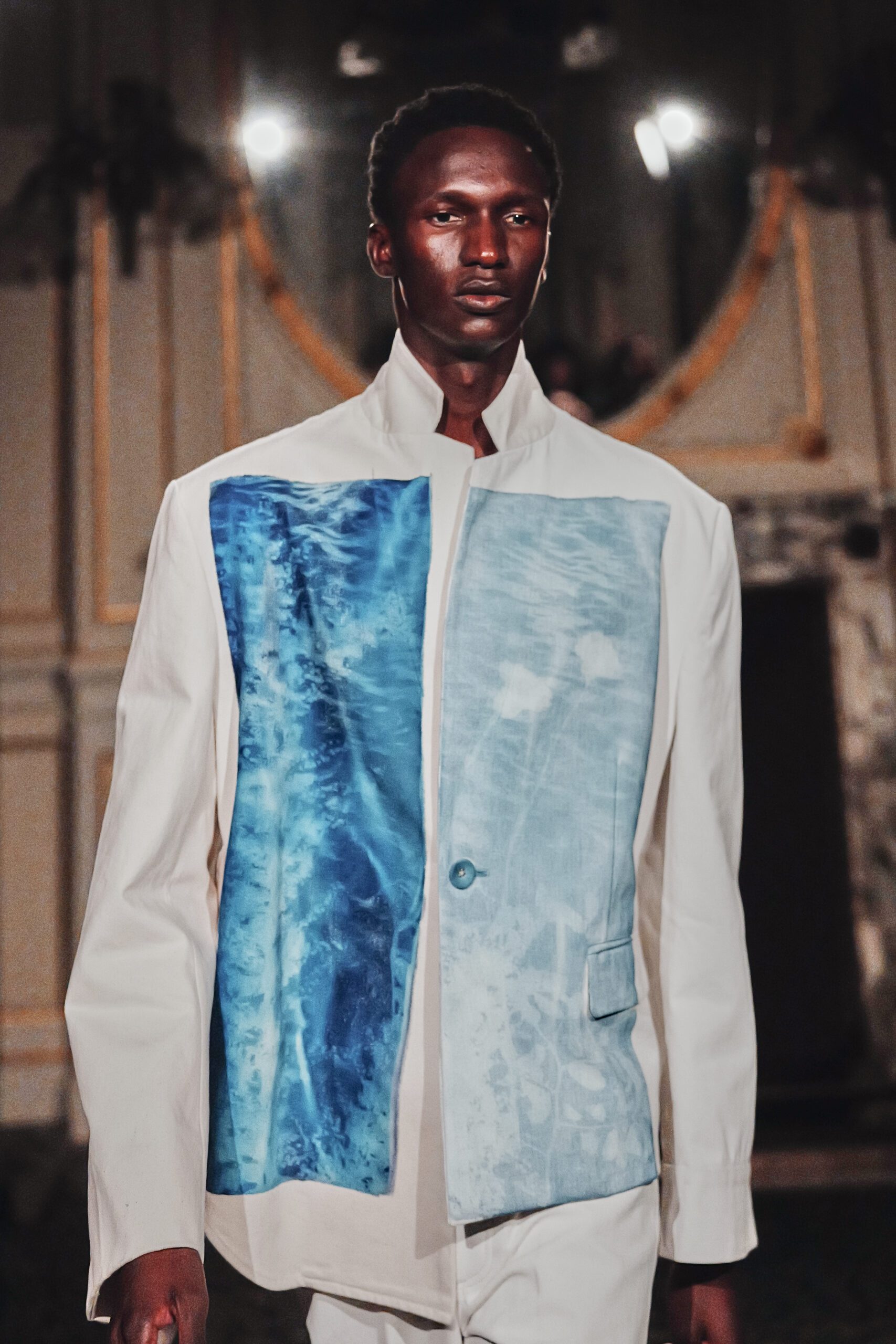 Du côté des hommes, la veste sans col ornée de bijoux restera l’une de mes images de la saison. L’impression à la feuille d’argent, les effets de délavage intégrés comme autant d’années vécues c’est une pièce qui raconte une histoire avant même que son porteur ait prononcé un mot.