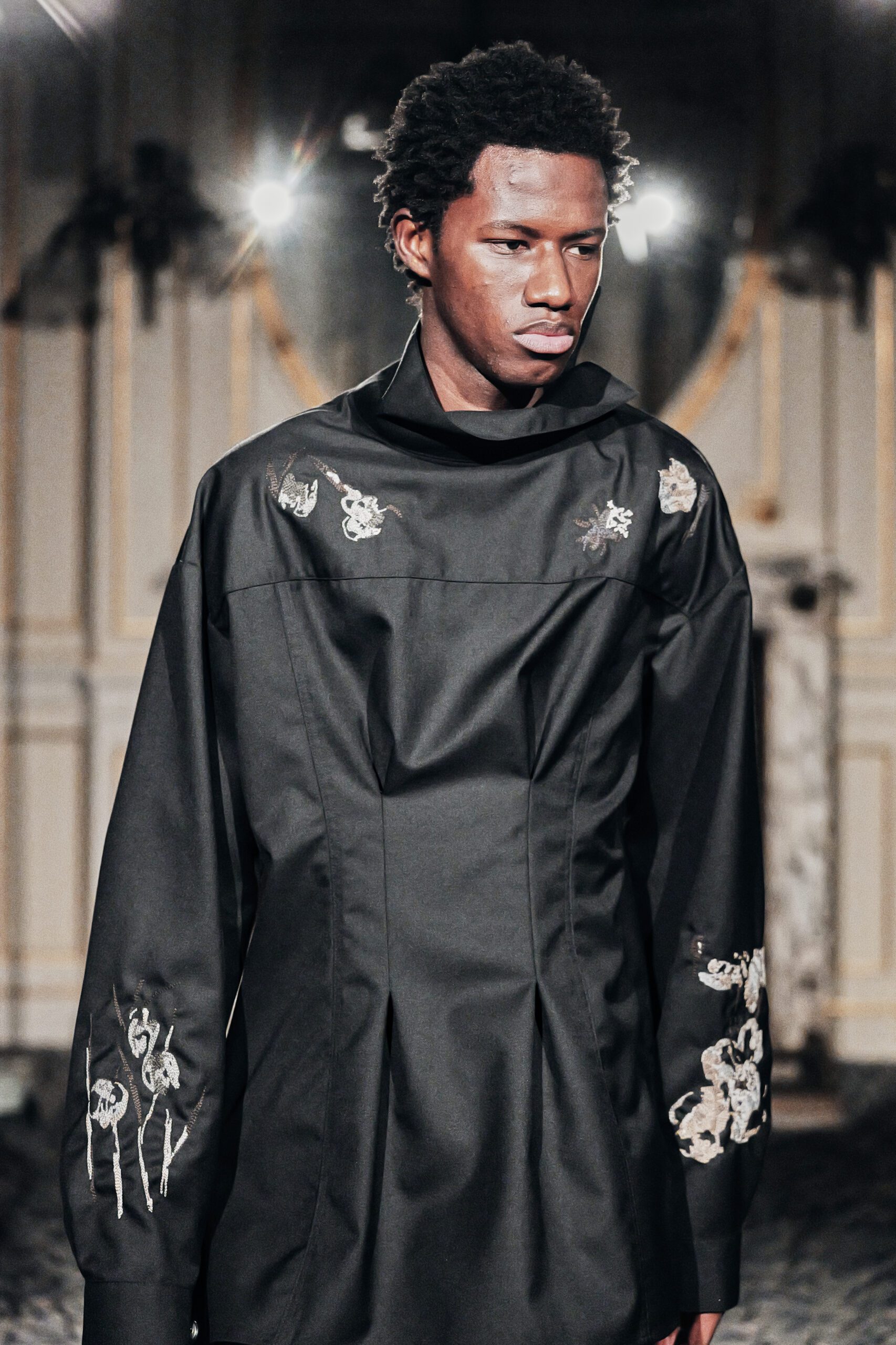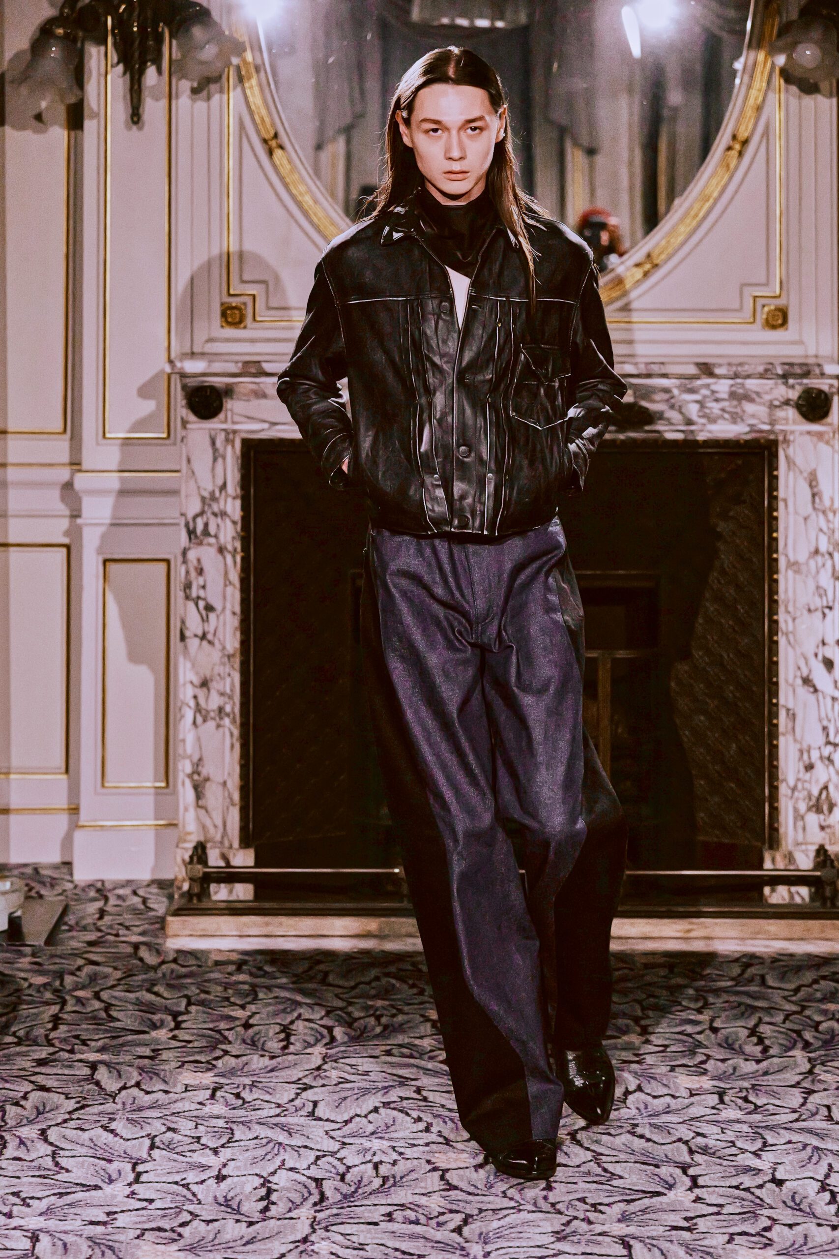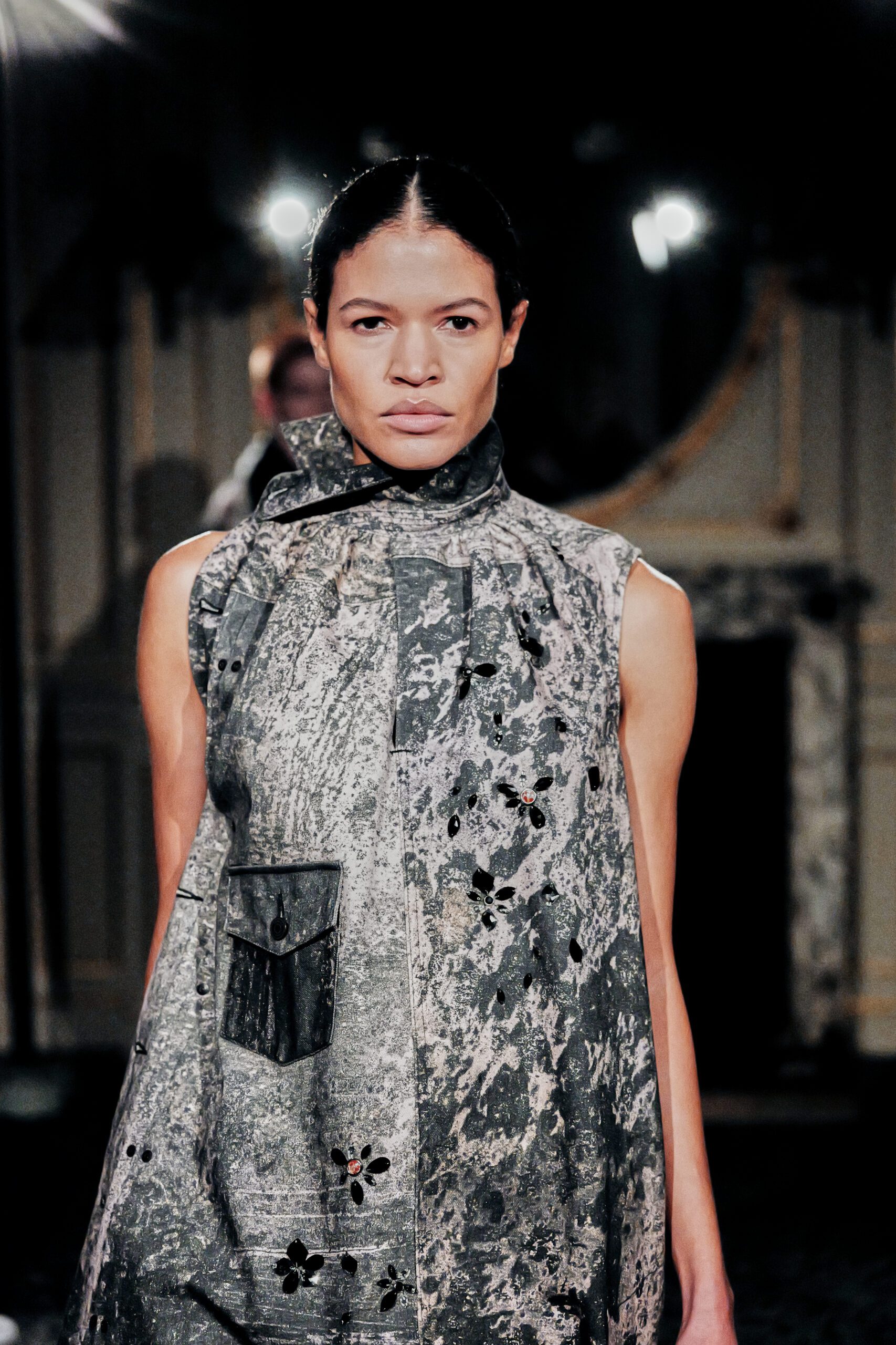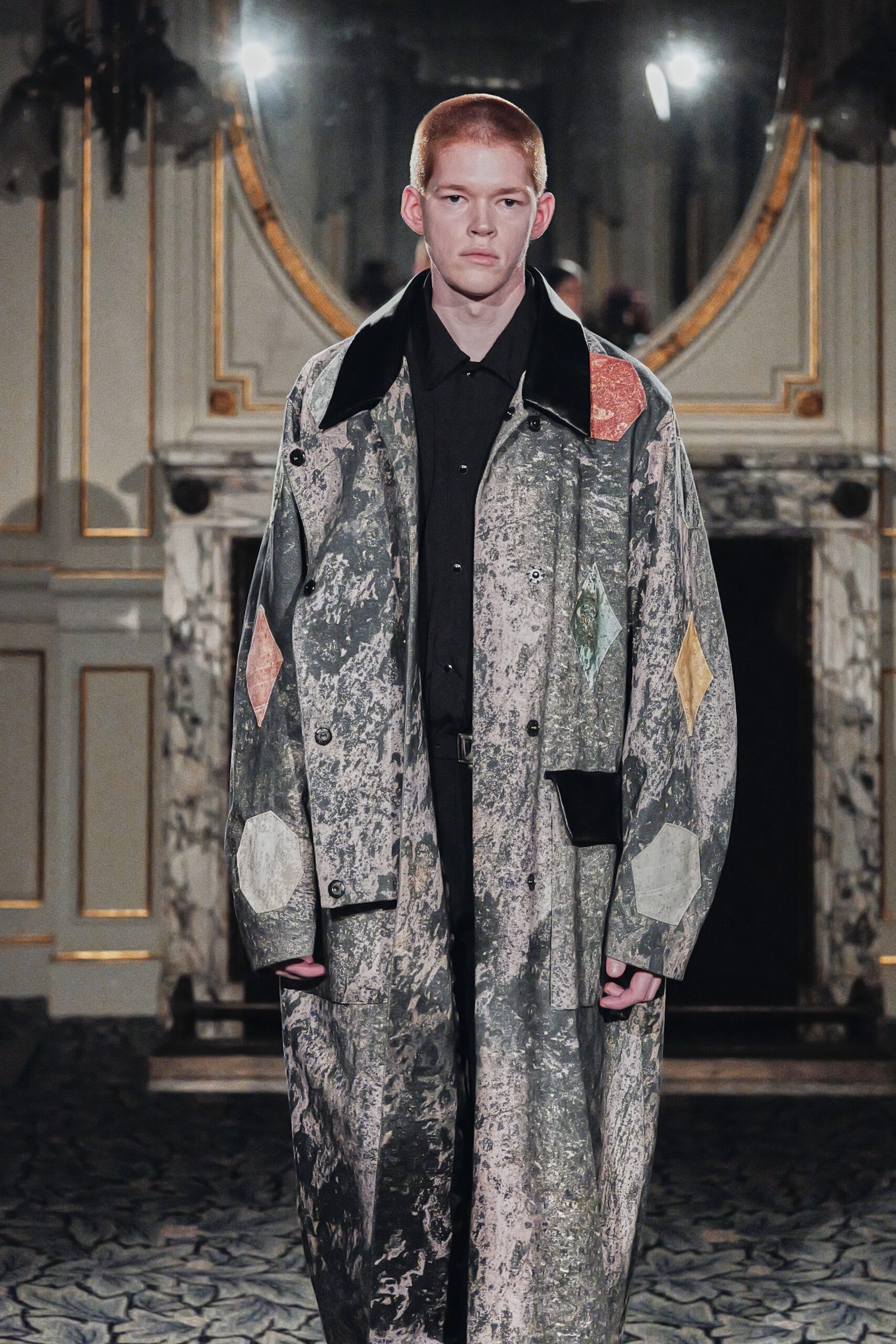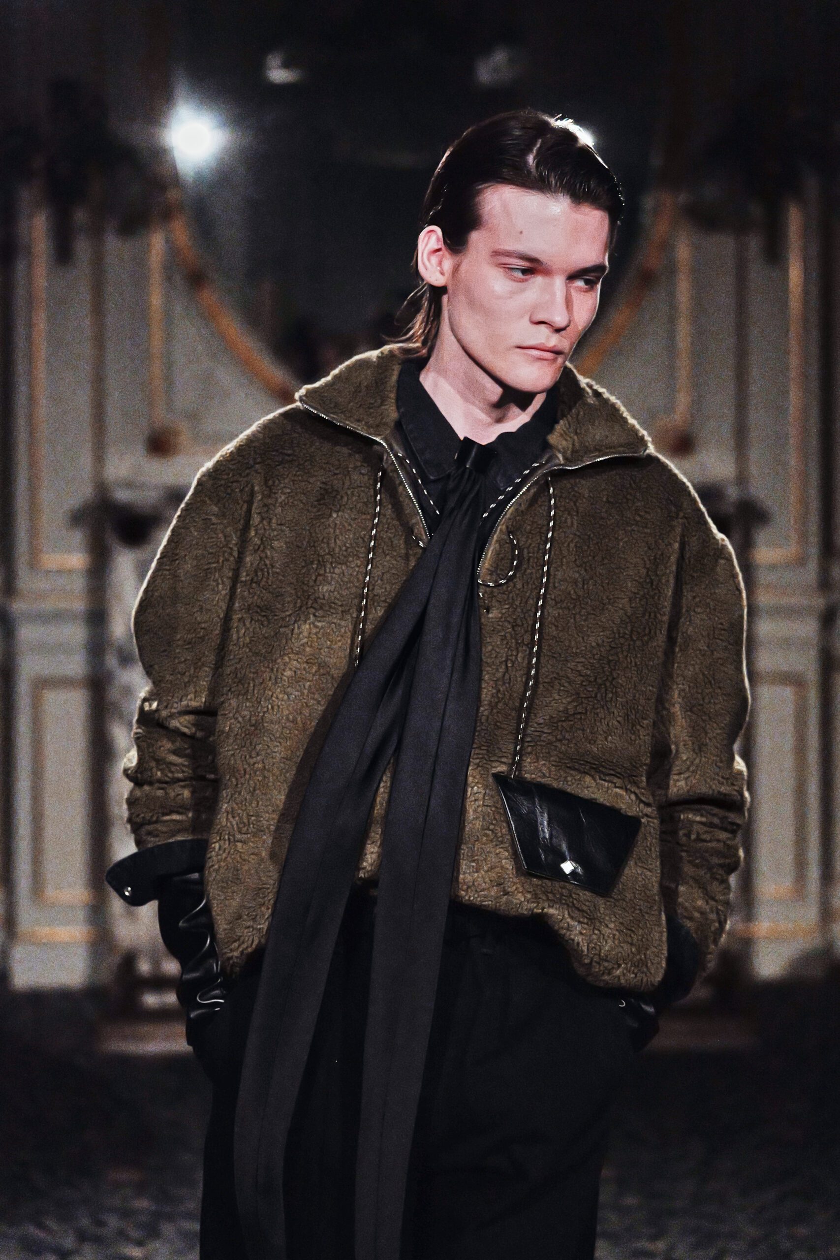 Du côté des hommes, la veste sans col ornée de bijoux restera l’une de mes images de la saison. L’impression à la feuille d’argent, les effets de délavage intégrés comme autant d’années vécues c’est une pièce qui raconte une histoire avant même que son porteur ait prononcé un mot.