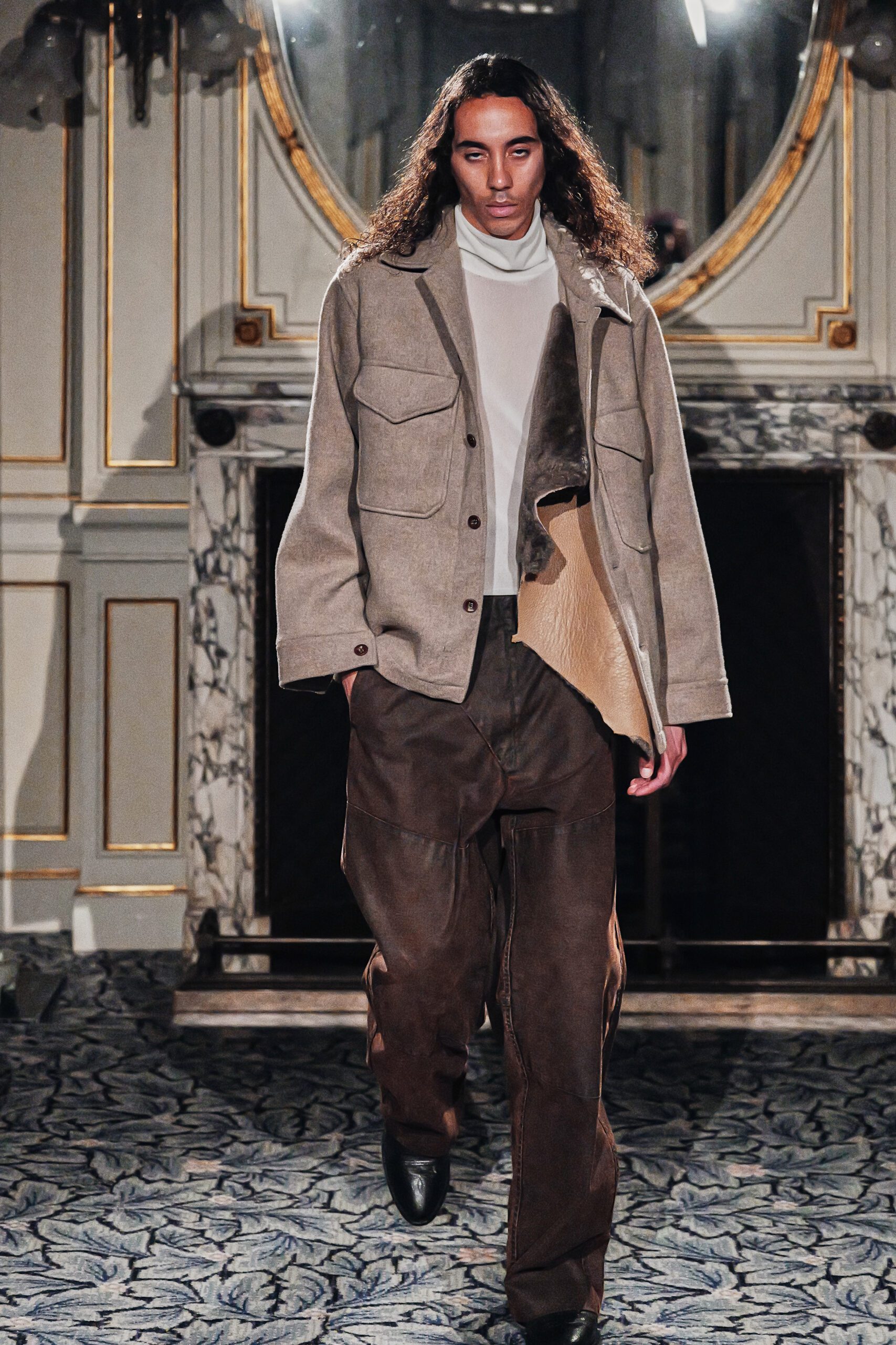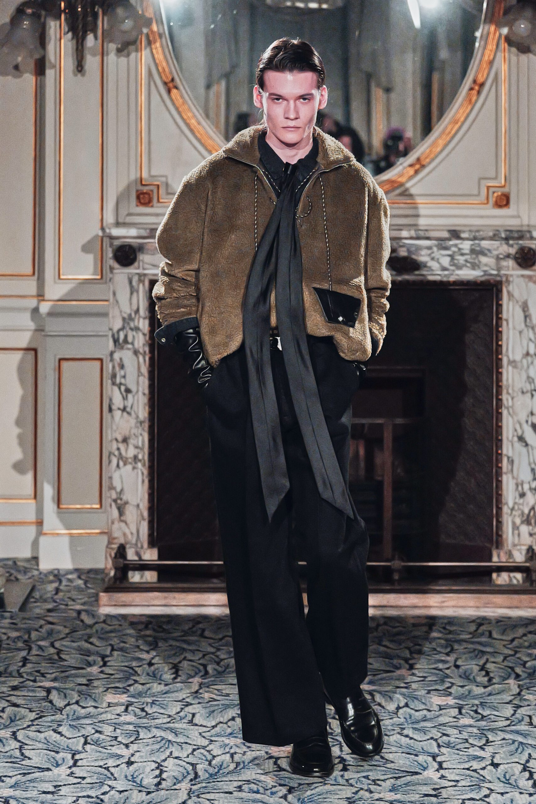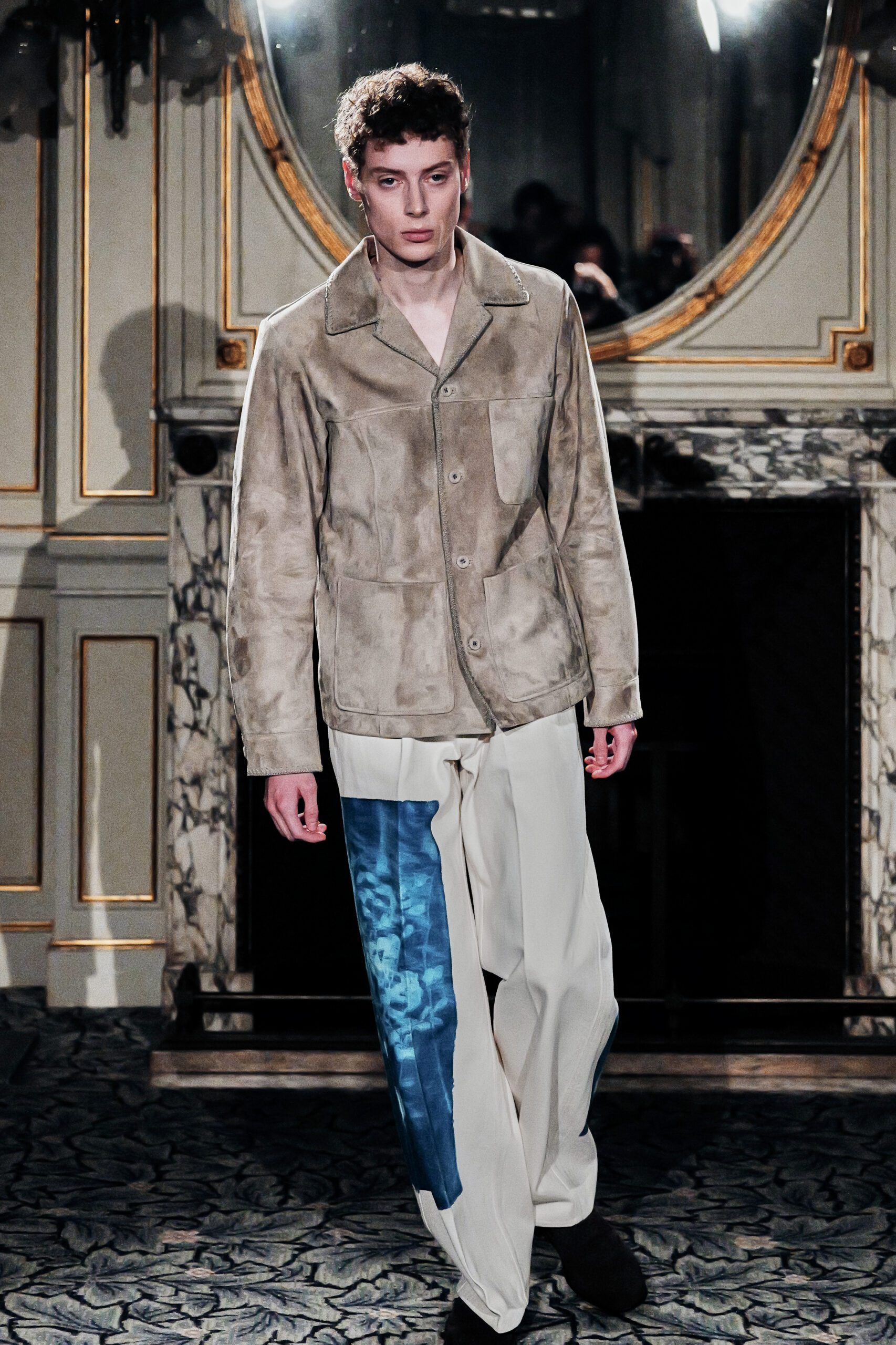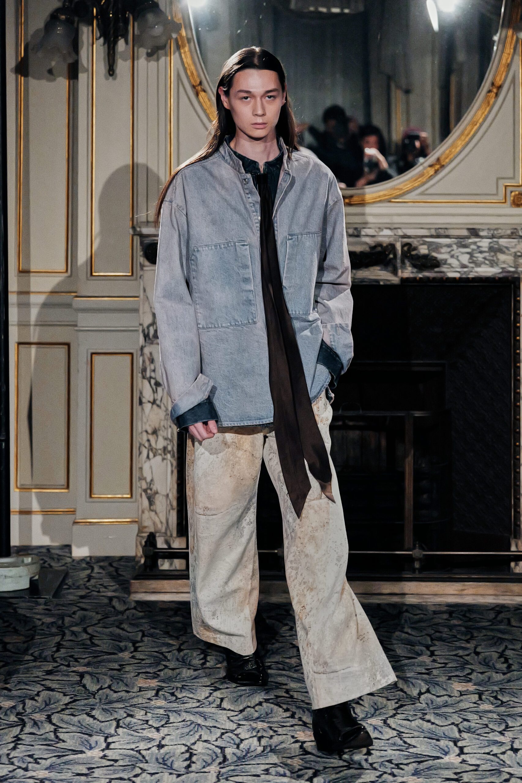 Du côté des hommes, la veste sans col ornée de bijoux restera l’une de mes images de la saison. L’impression à la feuille d’argent, les effets de délavage intégrés comme autant d’années vécues c’est une pièce qui raconte une histoire avant même que son porteur ait prononcé un mot.