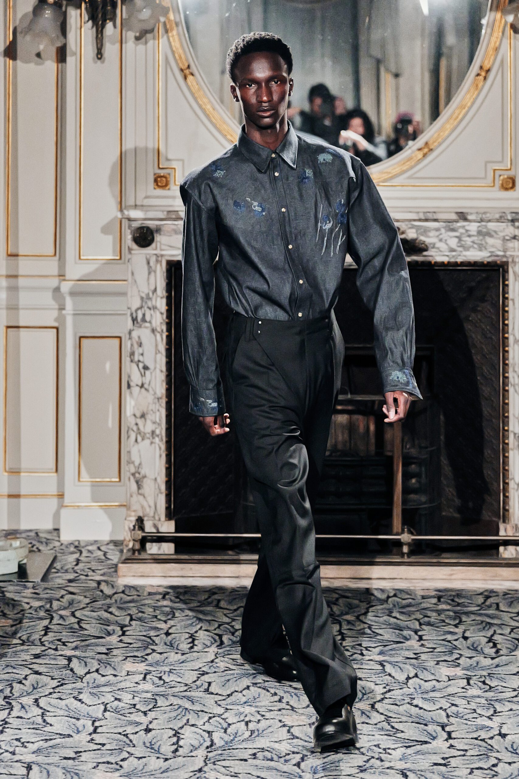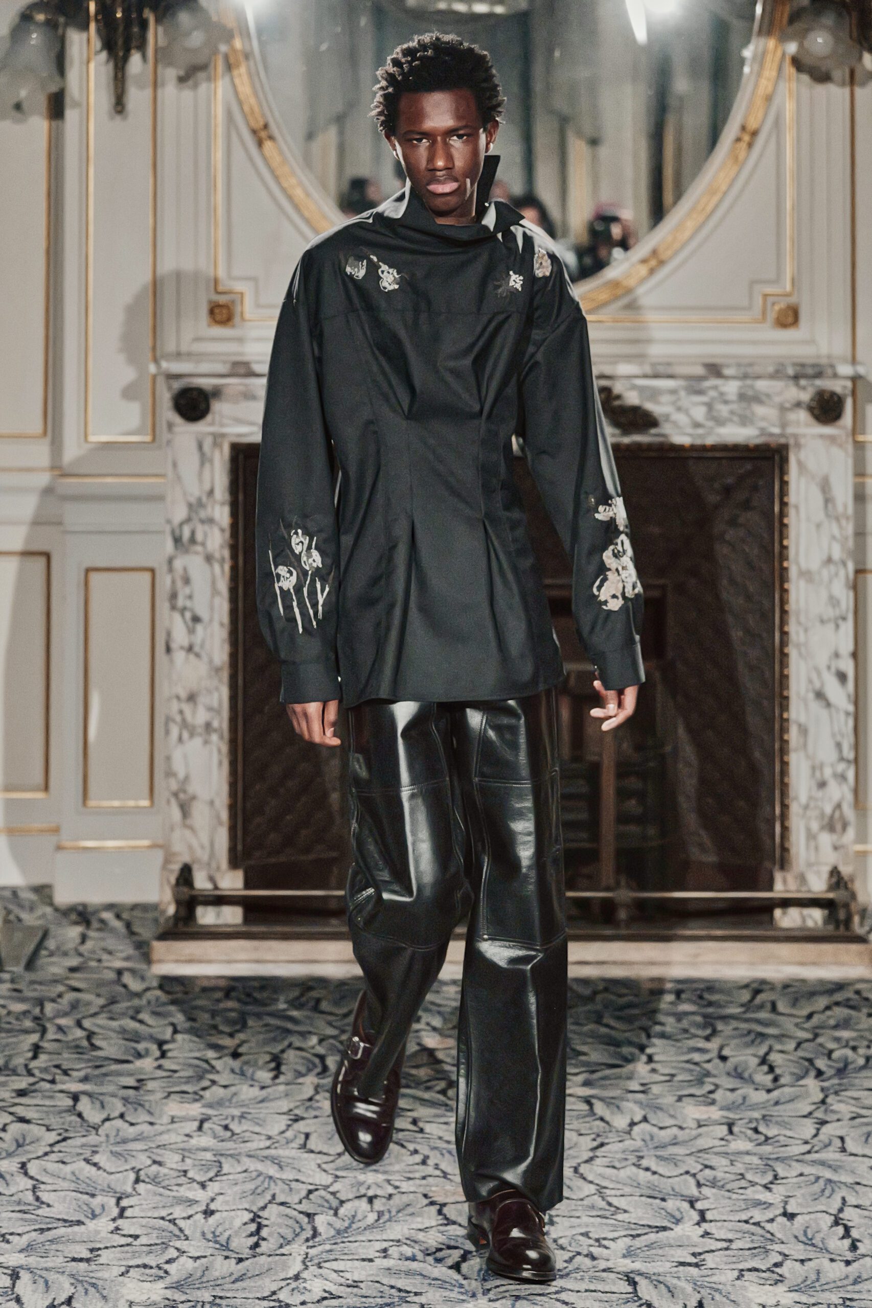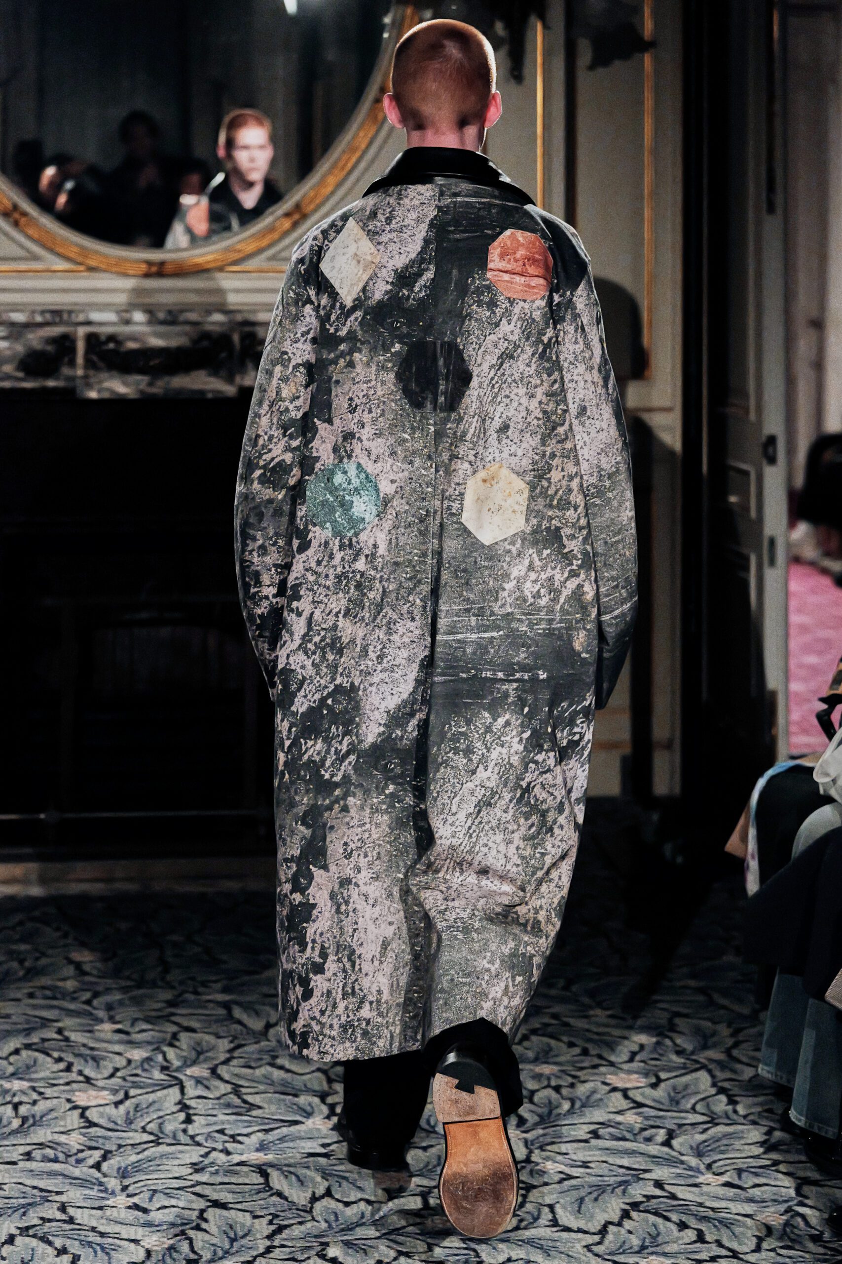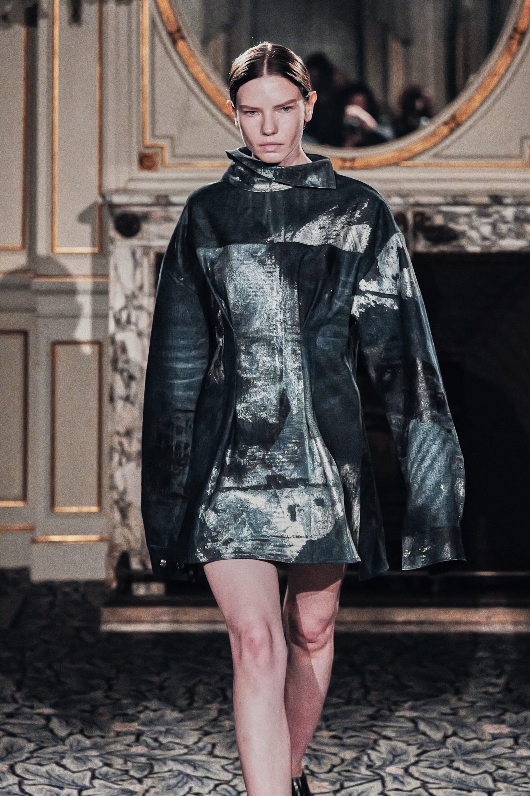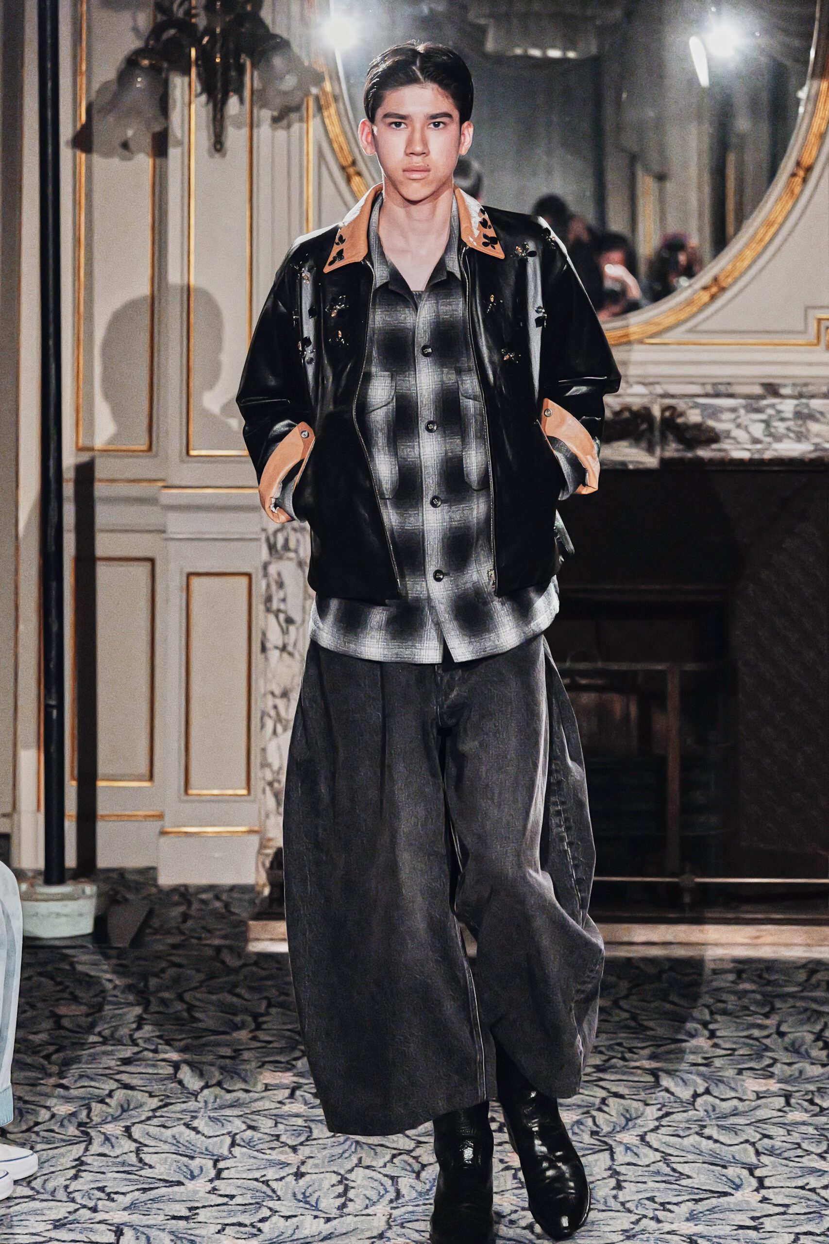 Du côté des hommes, la veste sans col ornée de bijoux restera l’une de mes images de la saison. L’impression à la feuille d’argent, les effets de délavage intégrés comme autant d’années vécues c’est une pièce qui raconte une histoire avant même que son porteur ait prononcé un mot.