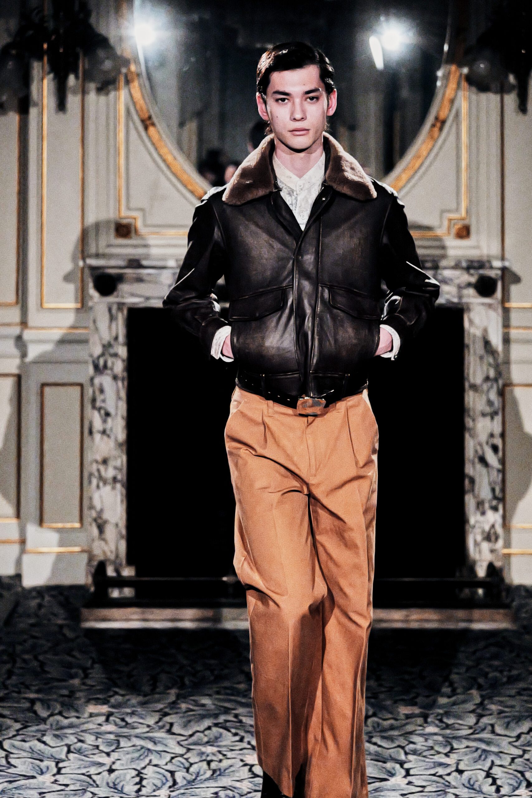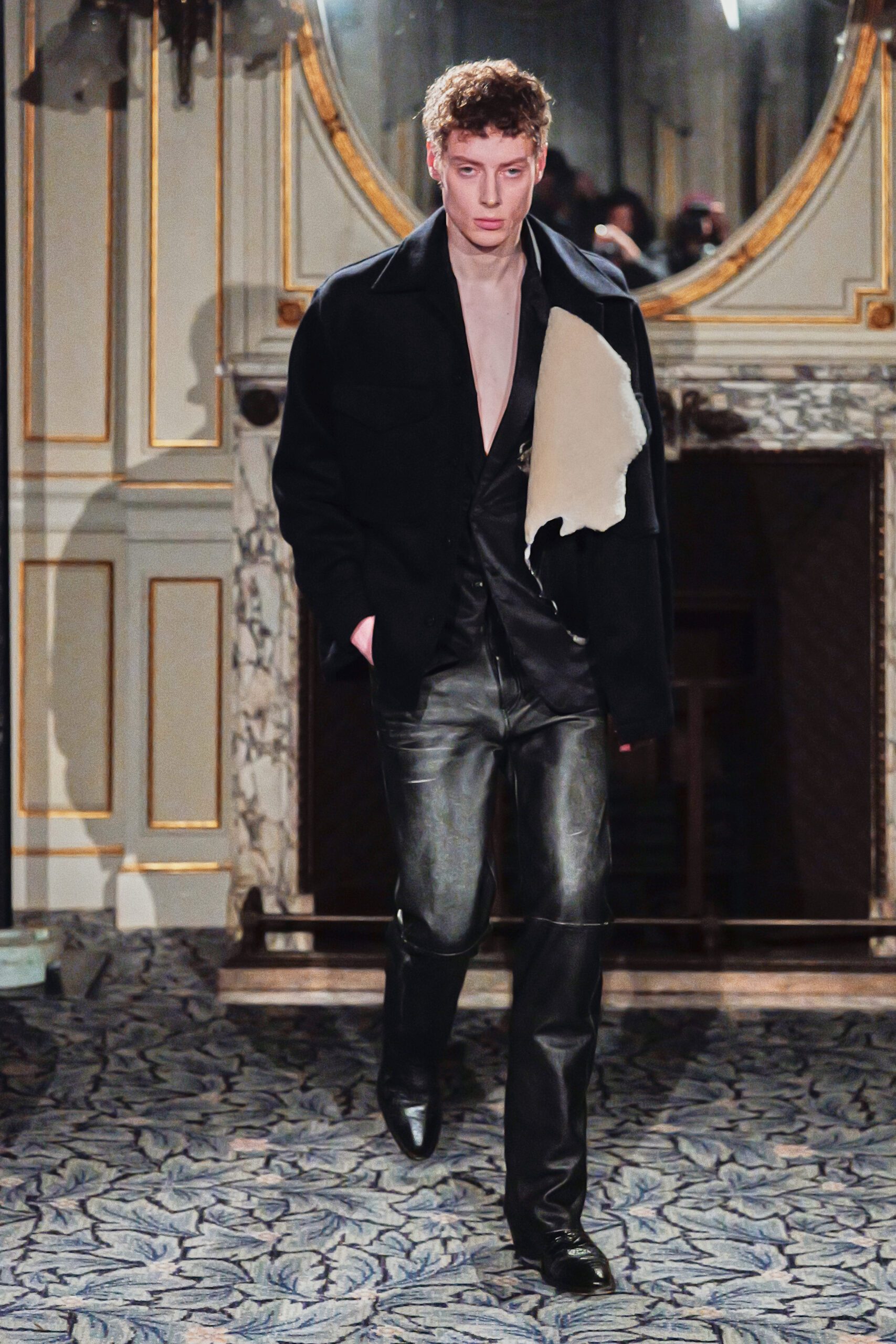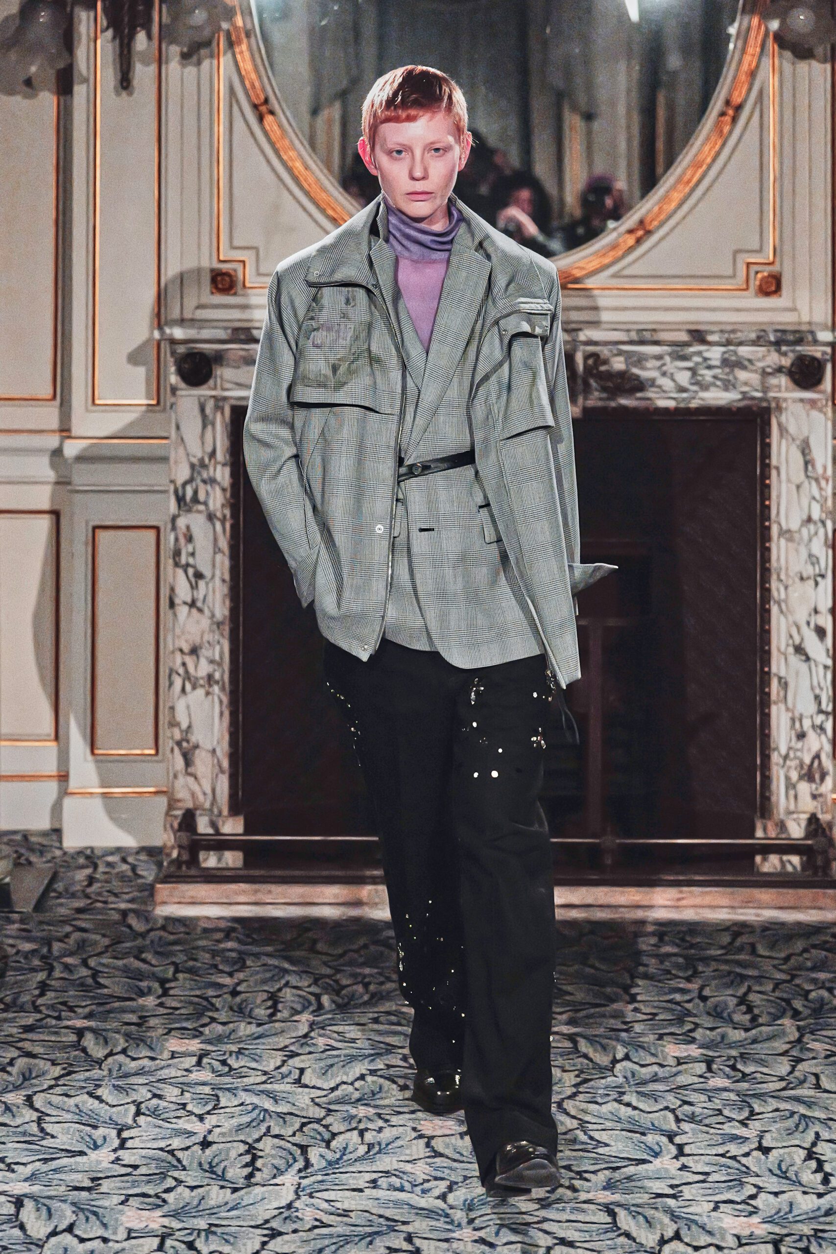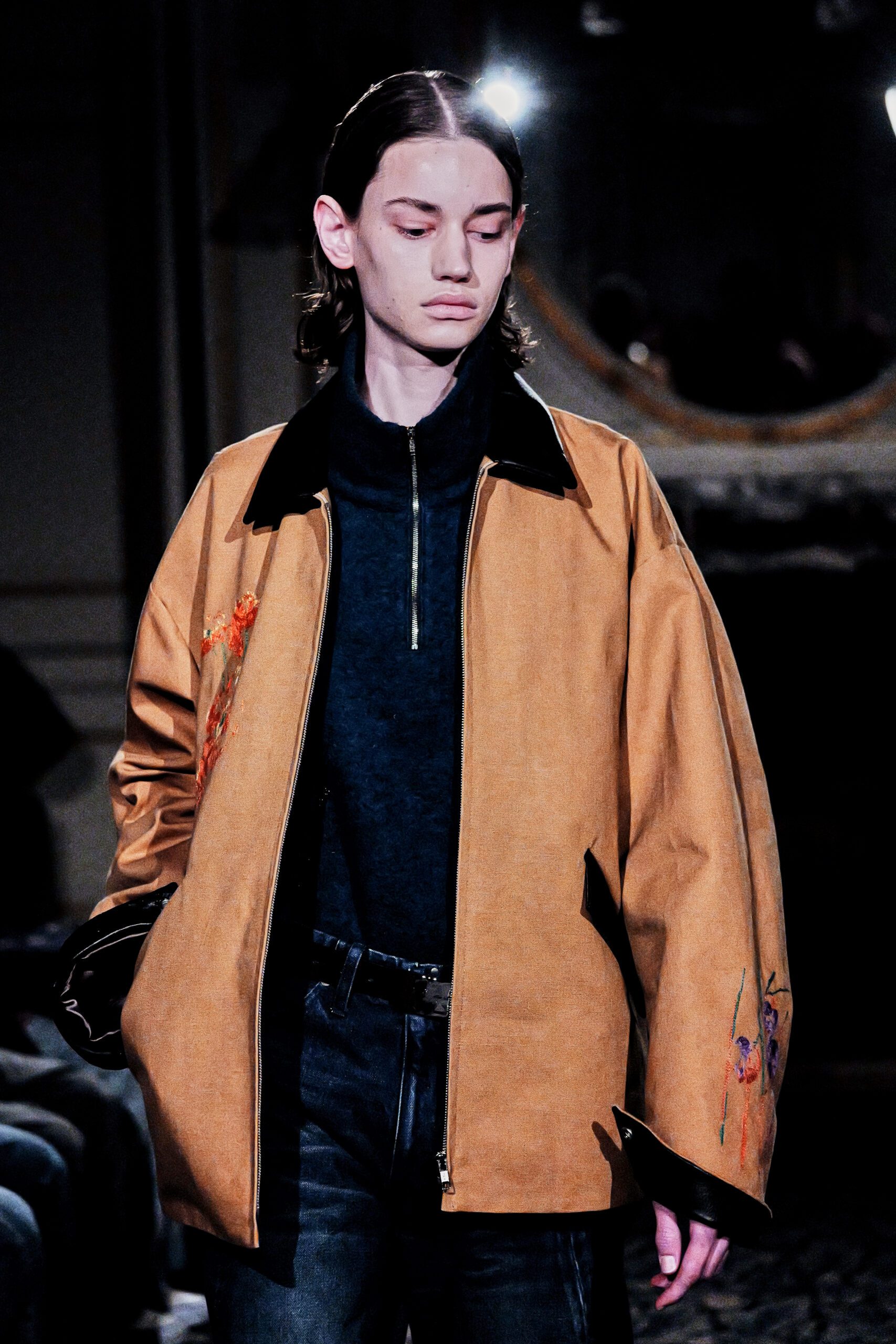 Du côté des hommes, la veste sans col ornée de bijoux restera l’une de mes images de la saison. L’impression à la feuille d’argent, les effets de délavage intégrés comme autant d’années vécues c’est une pièce qui raconte une histoire avant même que son porteur ait prononcé un mot.