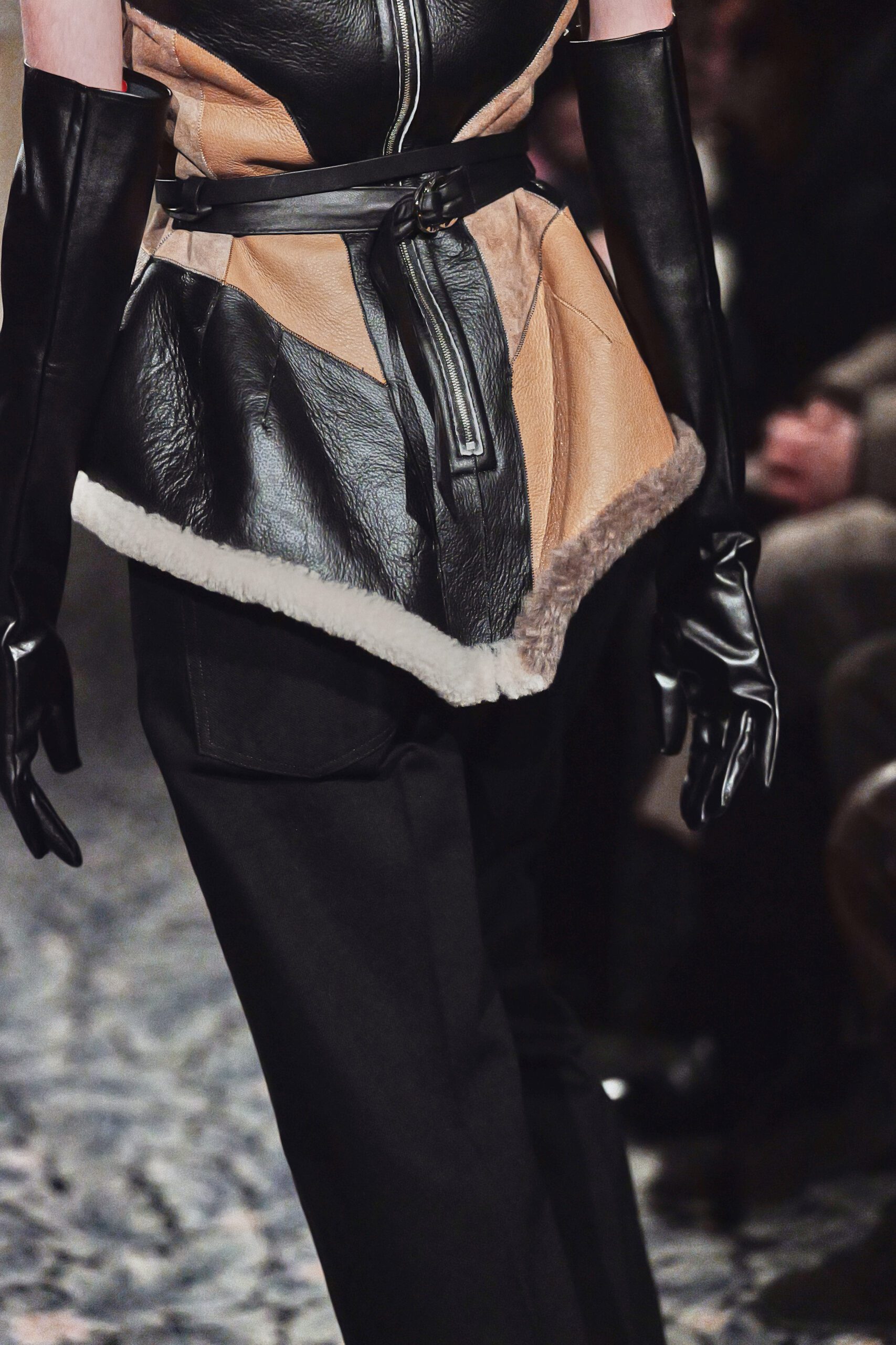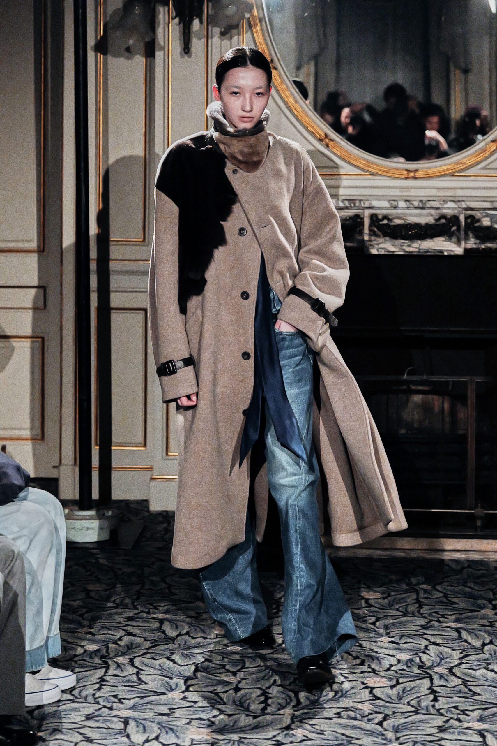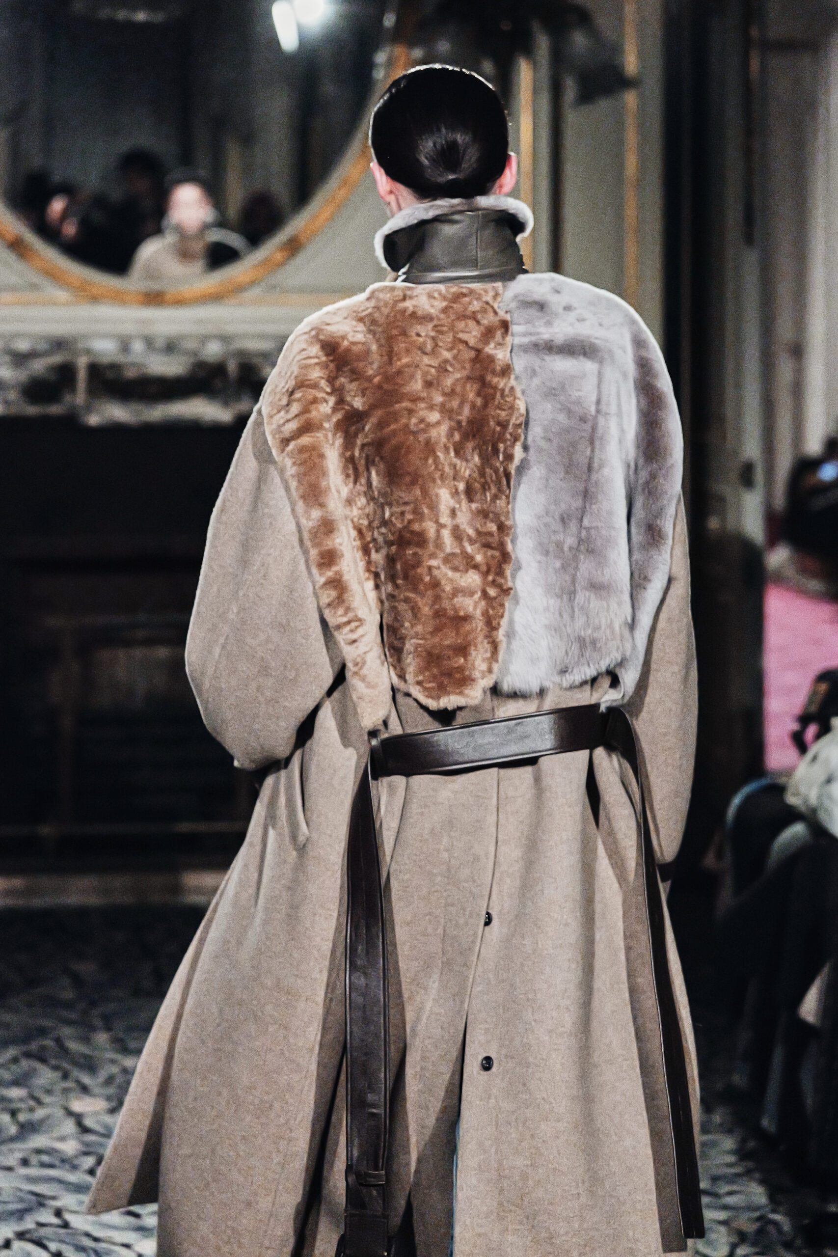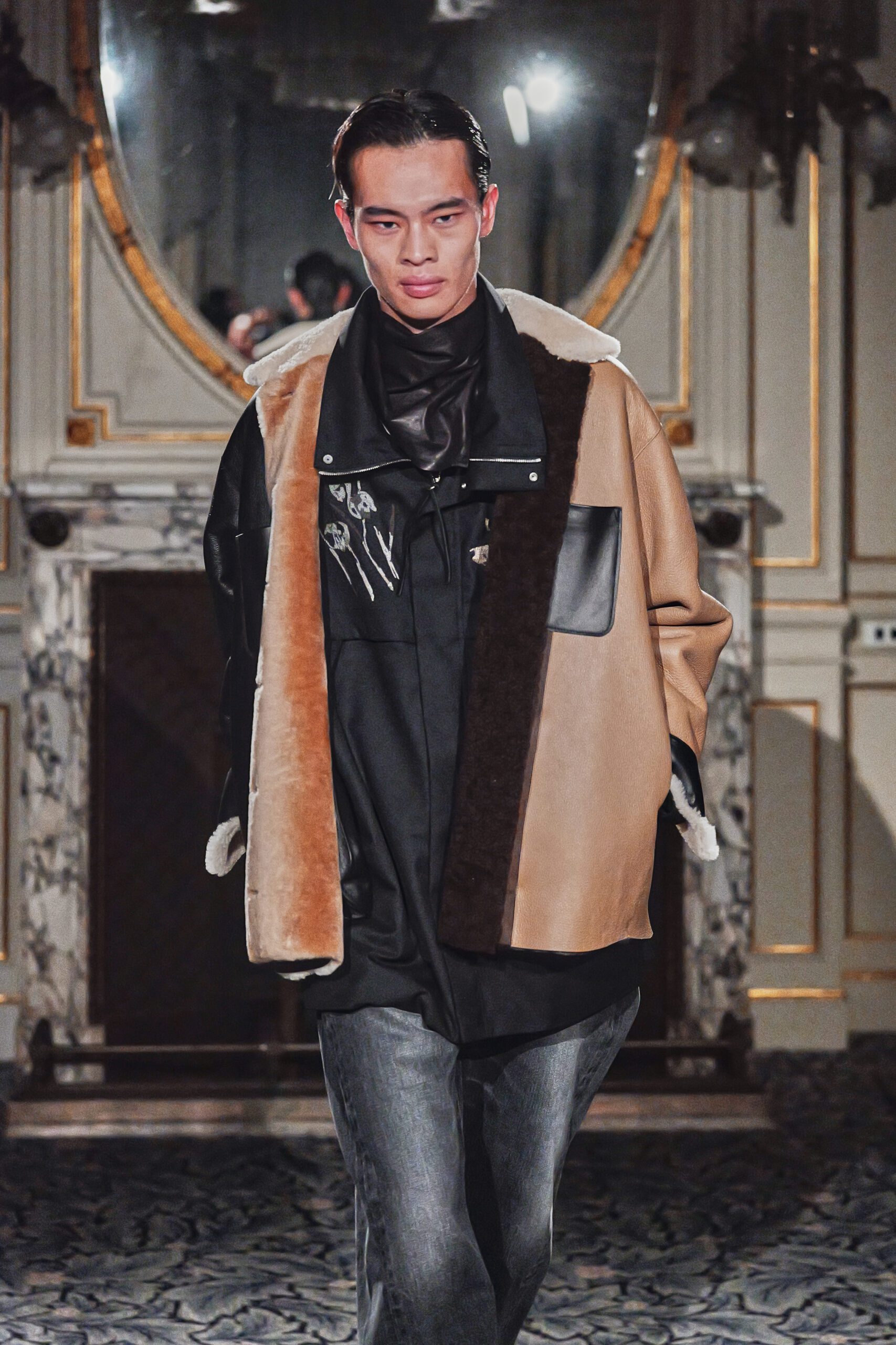 Le cuir est arrivé en contrepoint. Sayori et Akira parlent de lui comme de “la matière la plus primitive” et l’on comprend ce qu’ils veulent dire. Il y a dans le cuir quelque chose qui précède la mode, qui appartient à un temps où le vêtement était une question de survie et non de style. Le manteau en vraie peau lainée de chèvre cachemire, la veste à doublure inversée, les cols en fourrure qui tranchaient sur la trame bleue du denim : ces contrastes n’étaient pas des affrontements. Ils étaient des conversations entre des matières qui ont traversé les siècles chacune à leur manière.