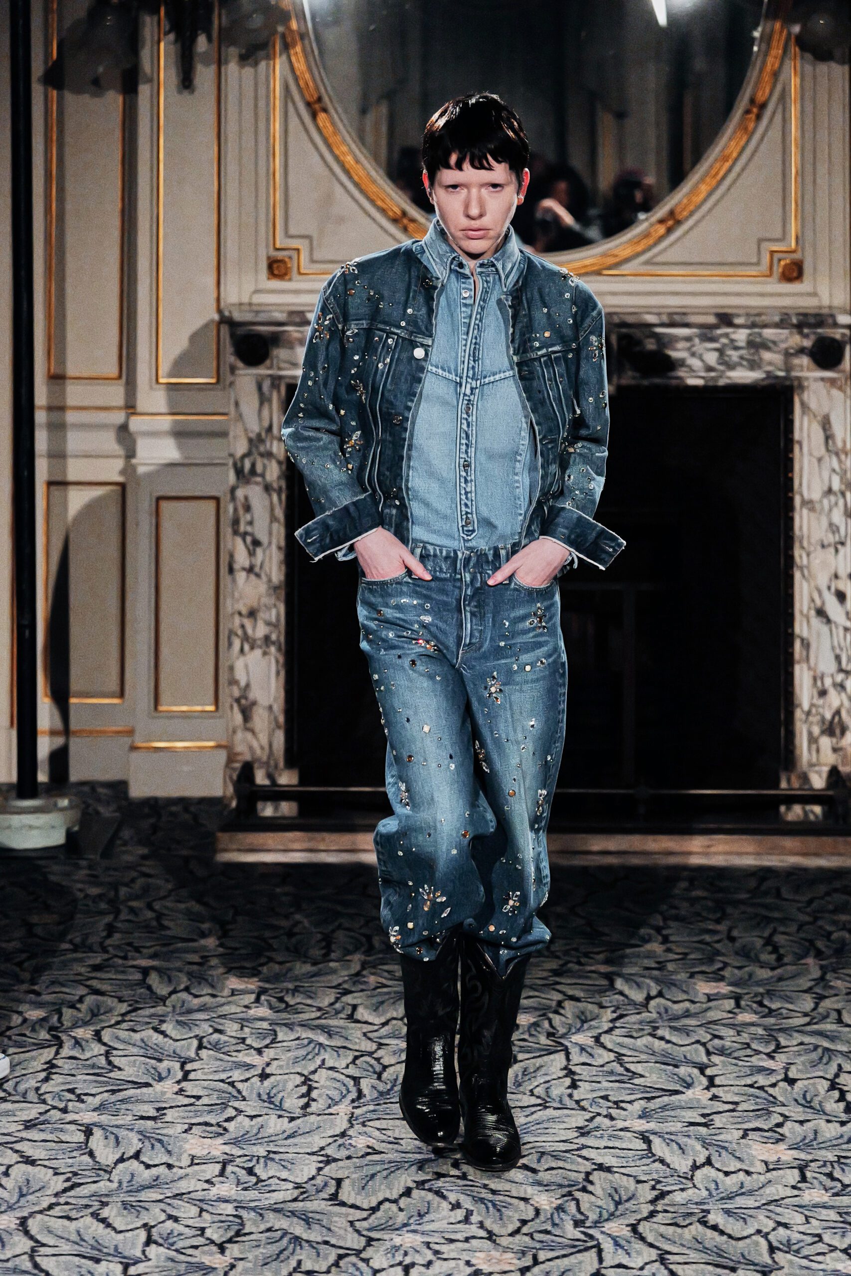 Les bijoux, eux, ne sont pas un ajout. Ils sont une ponctuation posés sur le denim structuré comme des fleurs qui auraient toujours été là.