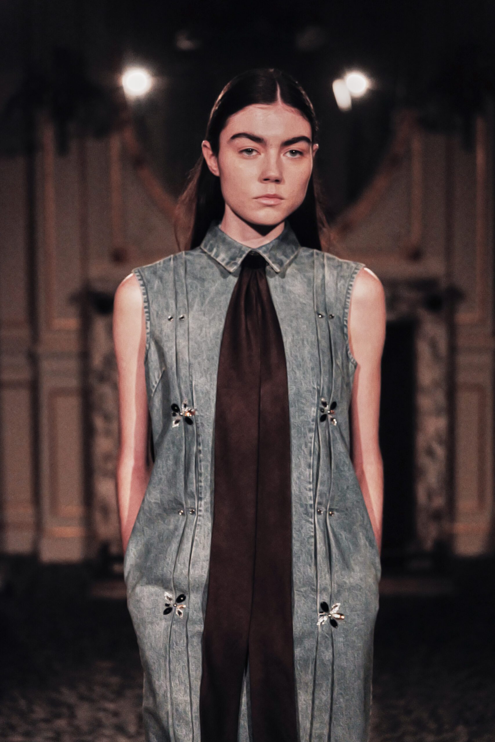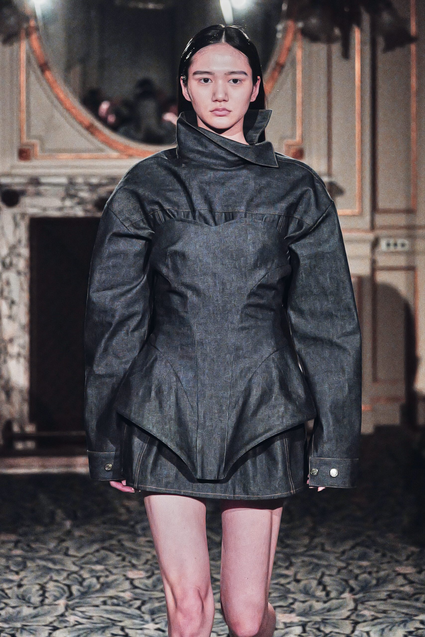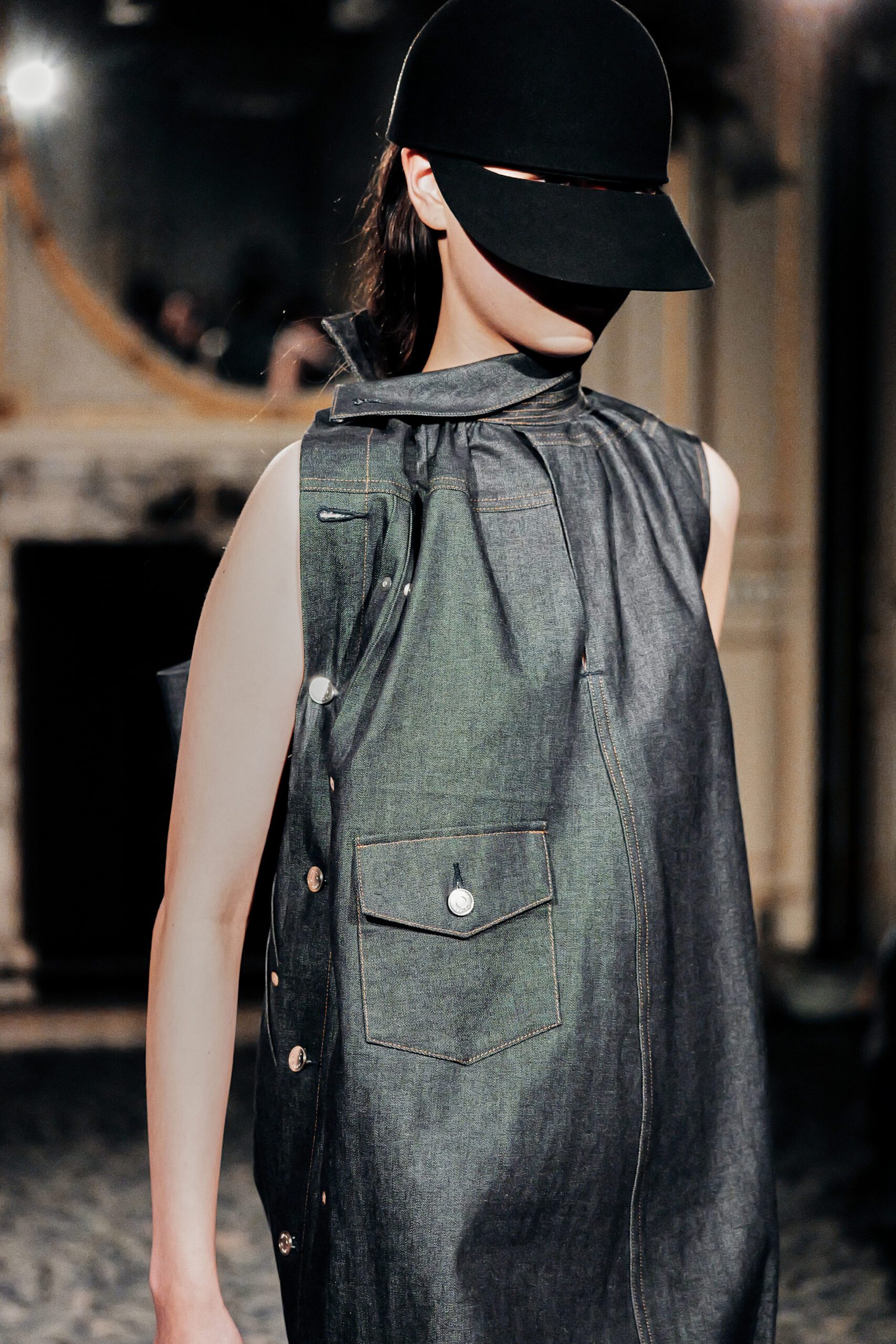 Les pièces féminines portaient cette ambition dans leurs détails corset : une structure qui affirme, qui sculpte, qui transforme la fluidité du denim en quelque chose de presque architectural. Et ces robes aux rubans dans le dos avaient cette qualité rare elles donnaient envie d’être portées, vraiment portées, pas seulement admirées.