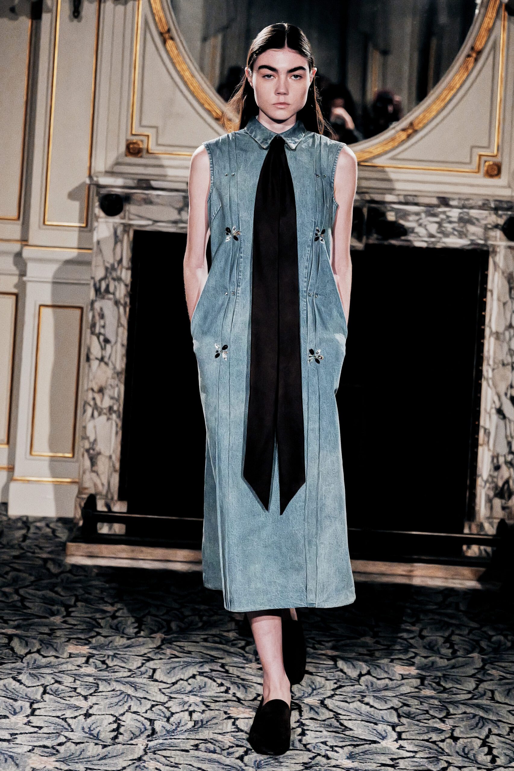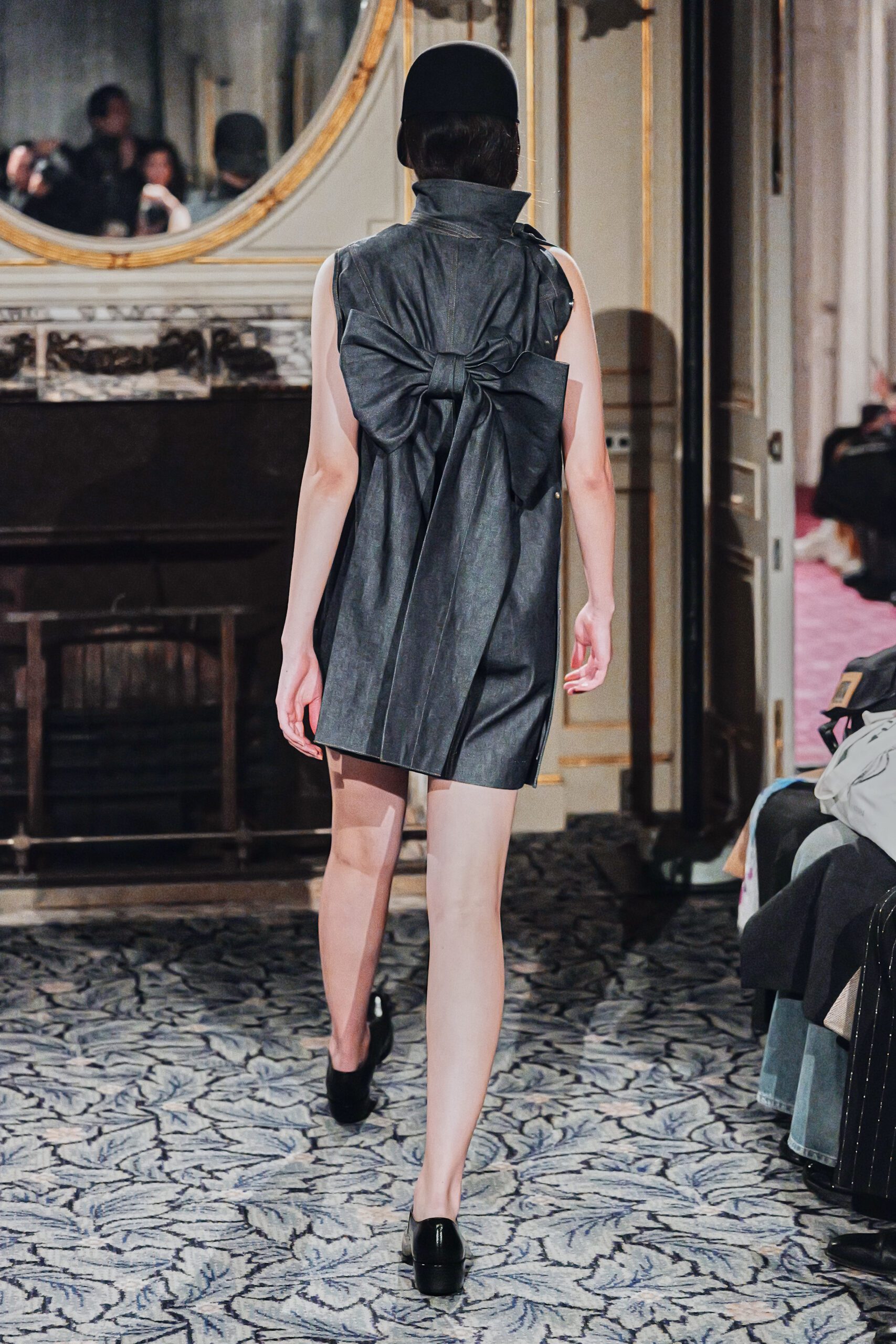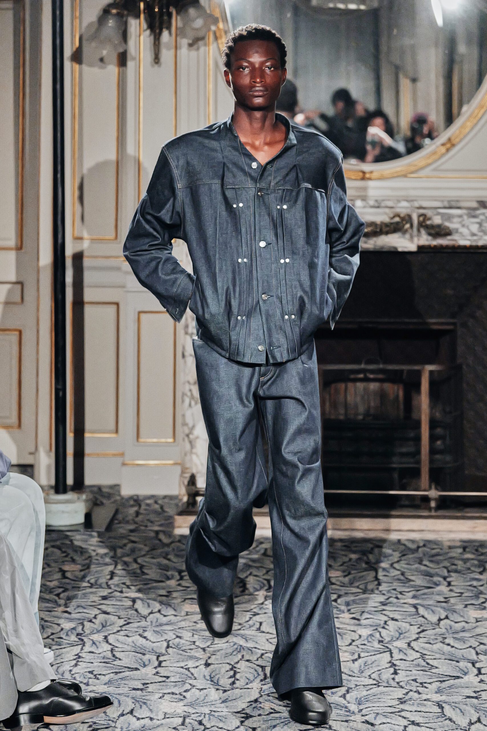 Les pièces féminines portaient cette ambition dans leurs détails corset : une structure qui affirme, qui sculpte, qui transforme la fluidité du denim en quelque chose de presque architectural. Et ces robes aux rubans dans le dos avaient cette qualité rare elles donnaient envie d’être portées, vraiment portées, pas seulement admirées.