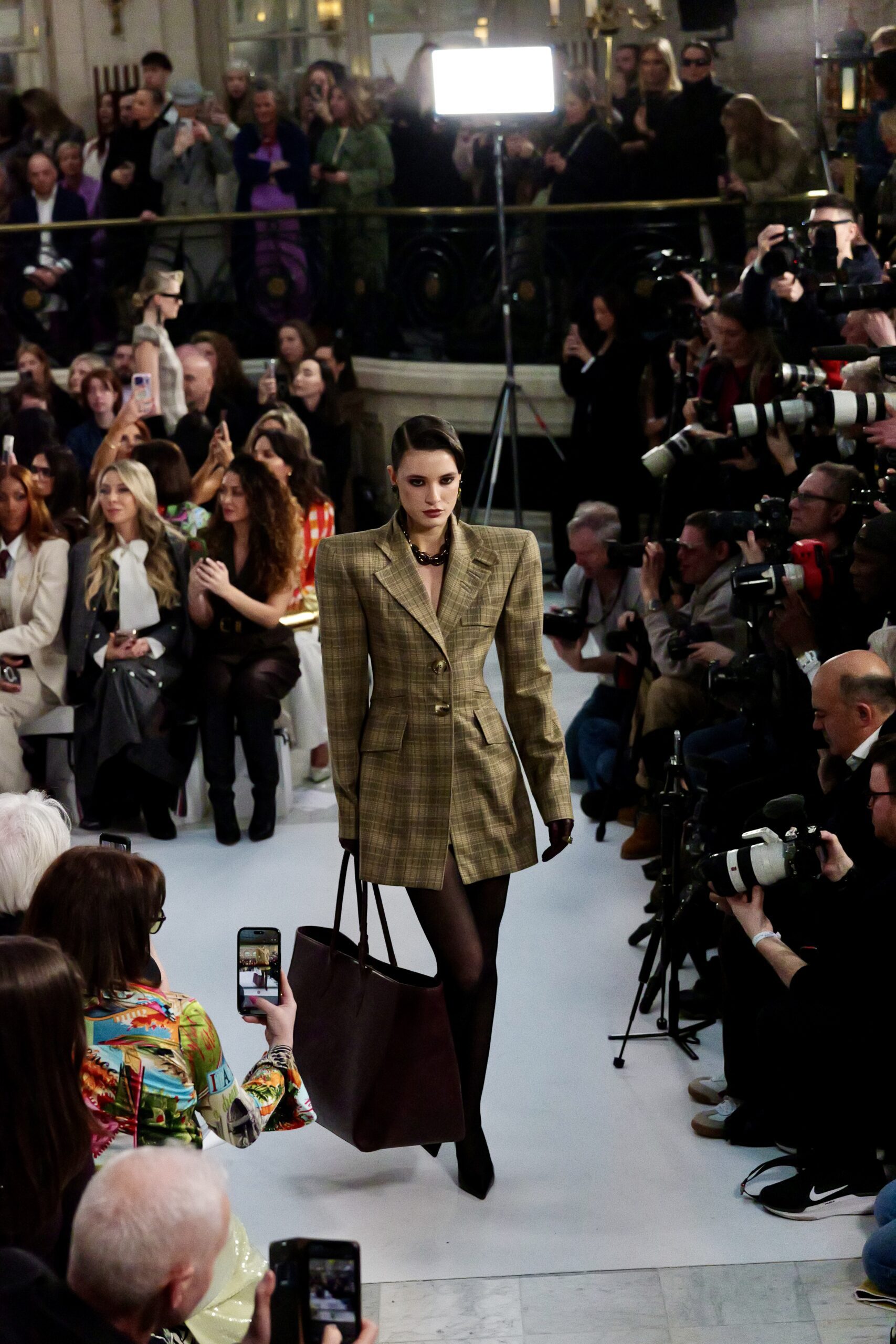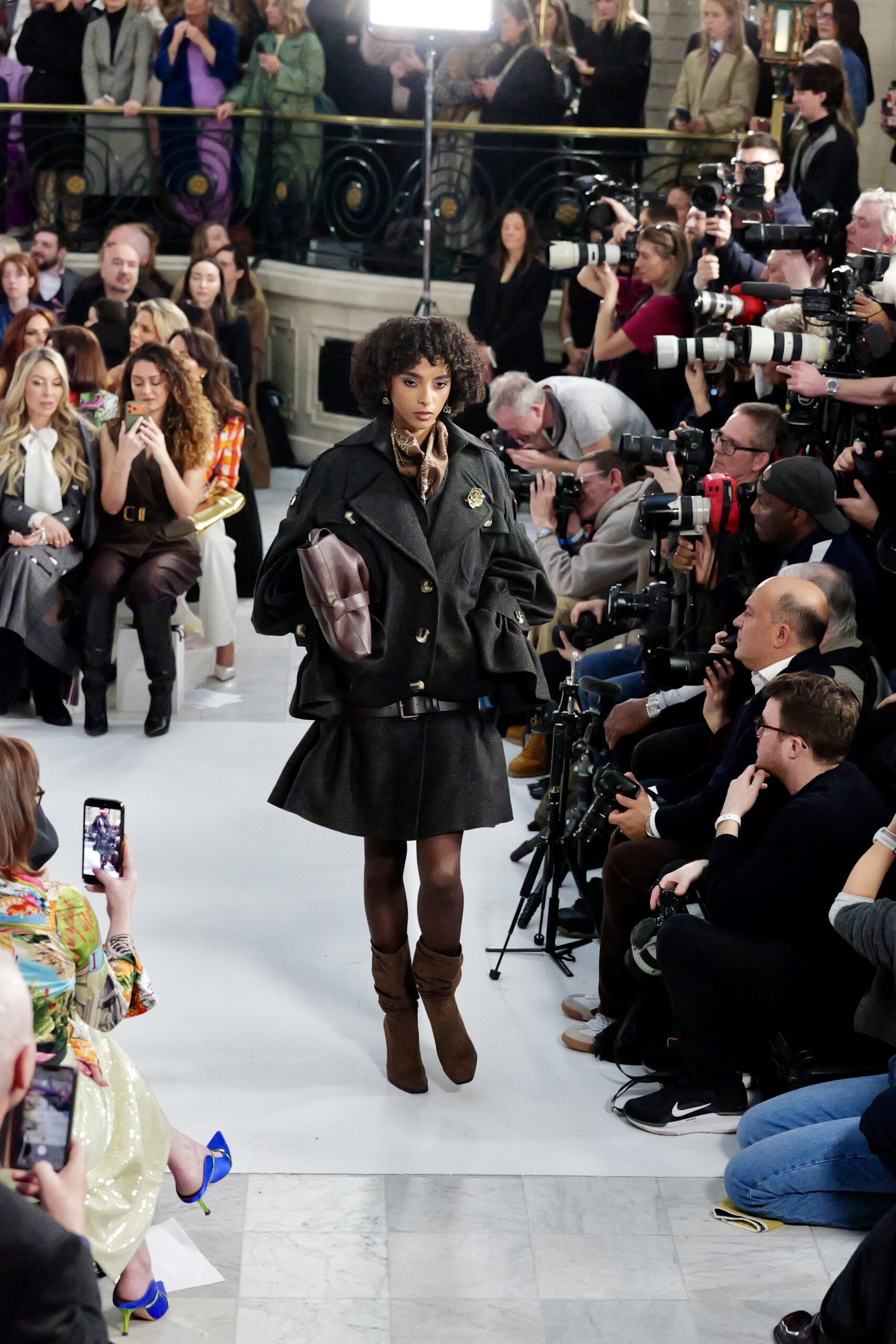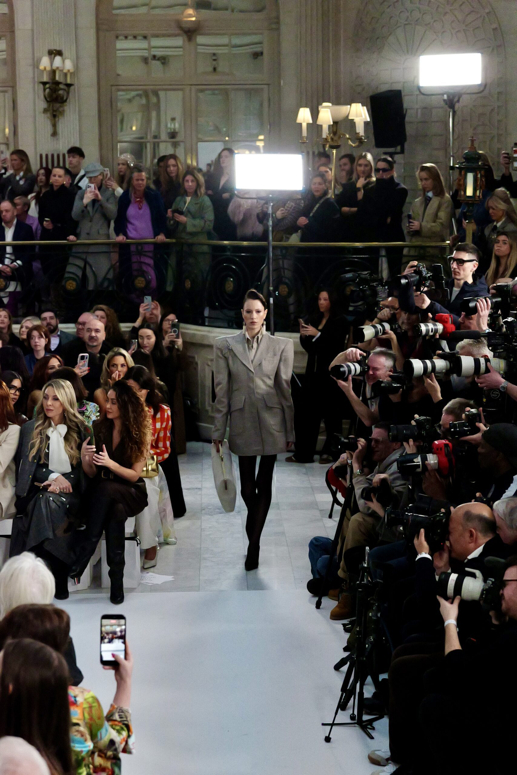 À l’entrée dans le Palm Court, le décor est familier : même écrin, mêmes proportions, même lumière filtrée. La maison avait déjà choisi ce lieu pour la SS25 et la SS26. Pourtant, l’atmosphère a changé. Une gravité calme traverse la salle — comme si chacun mesurait que ce rendez-vous serait scruté autrement.