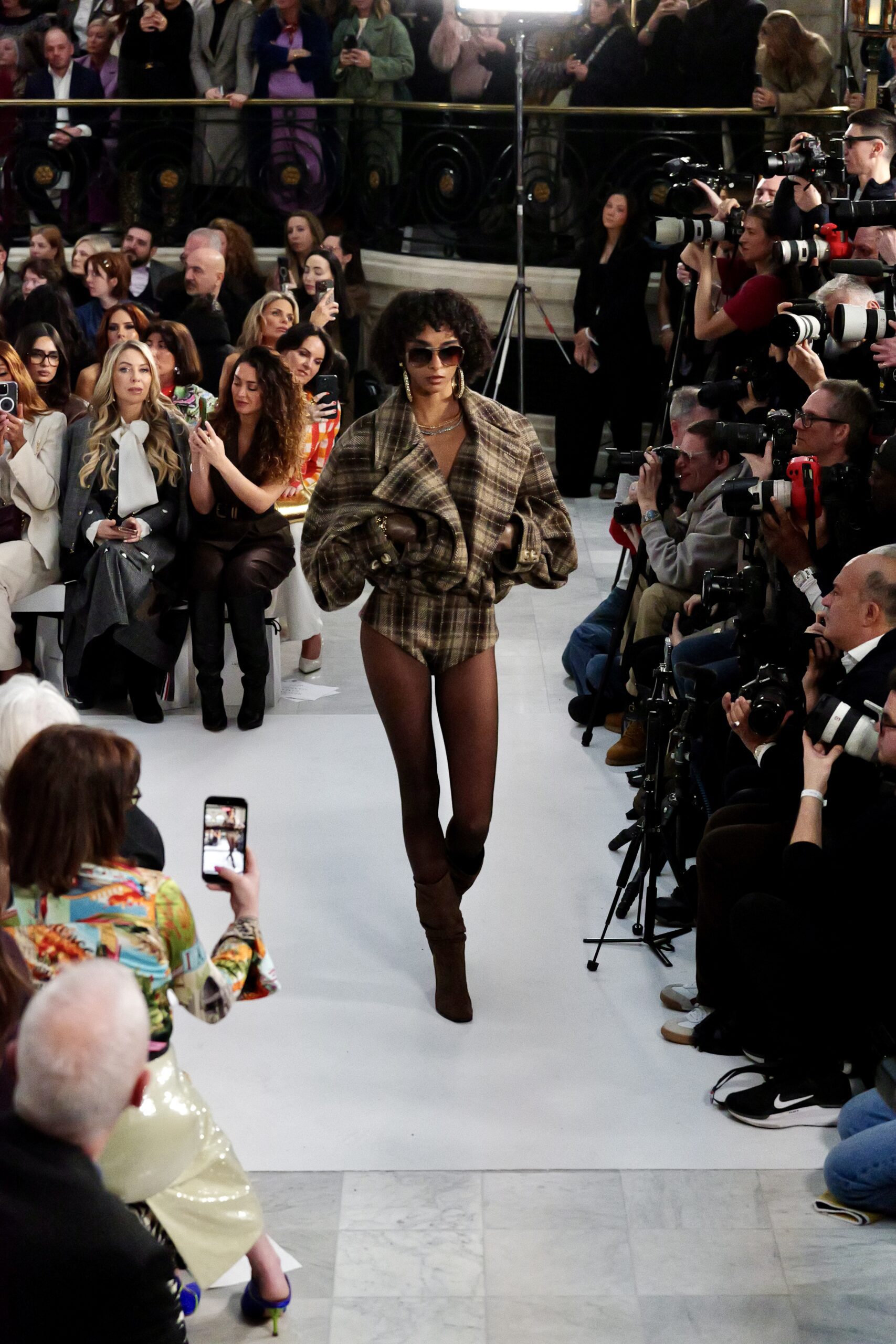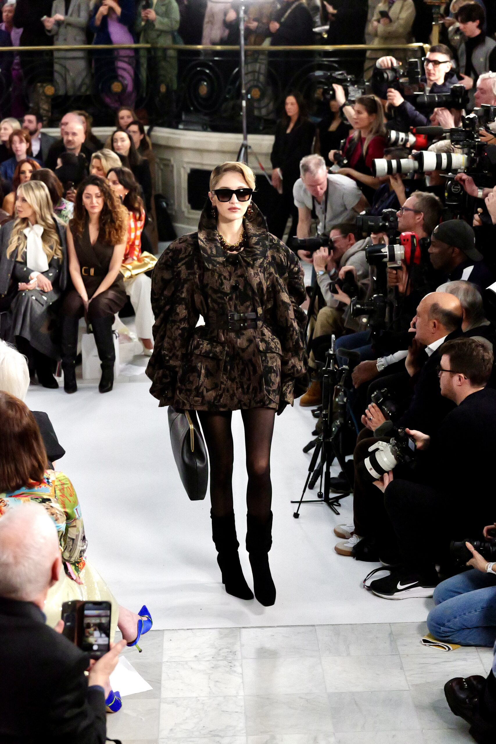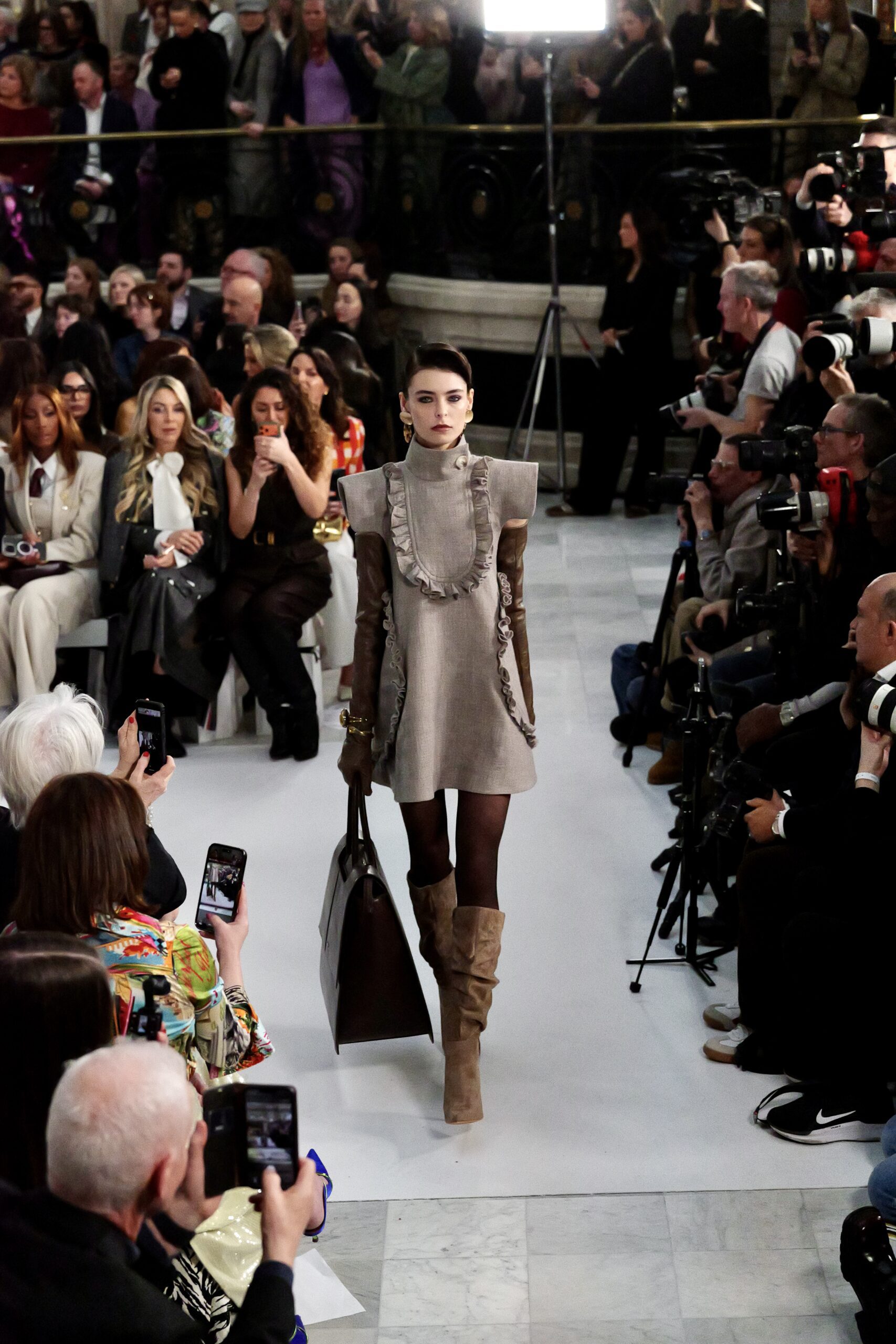 À l’entrée dans le Palm Court, le décor est familier : même écrin, mêmes proportions, même lumière filtrée. La maison avait déjà choisi ce lieu pour la SS25 et la SS26. Pourtant, l’atmosphère a changé. Une gravité calme traverse la salle — comme si chacun mesurait que ce rendez-vous serait scruté autrement.