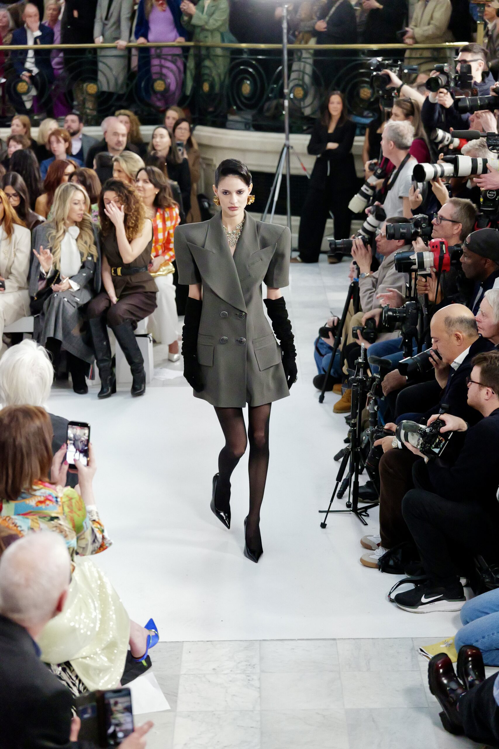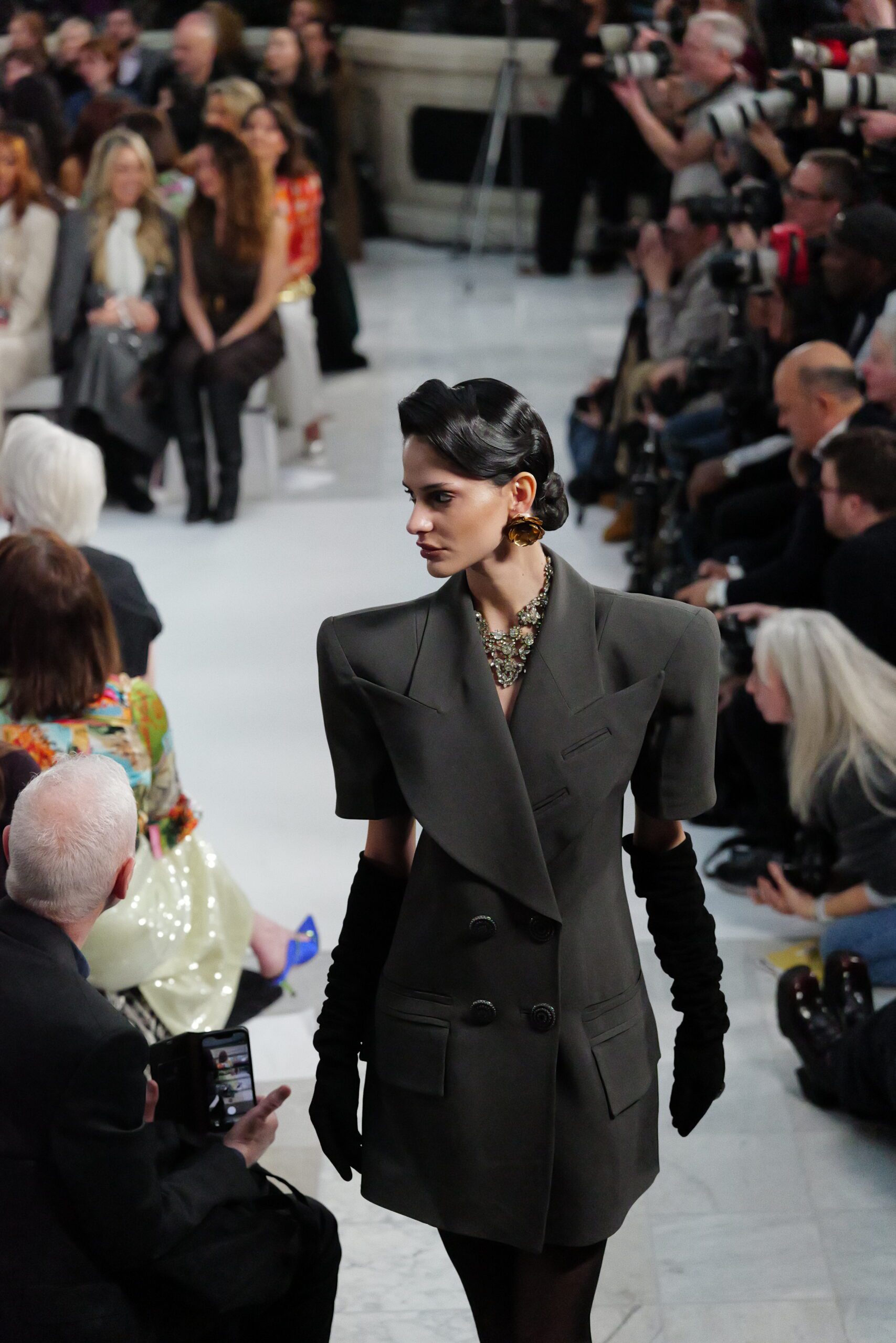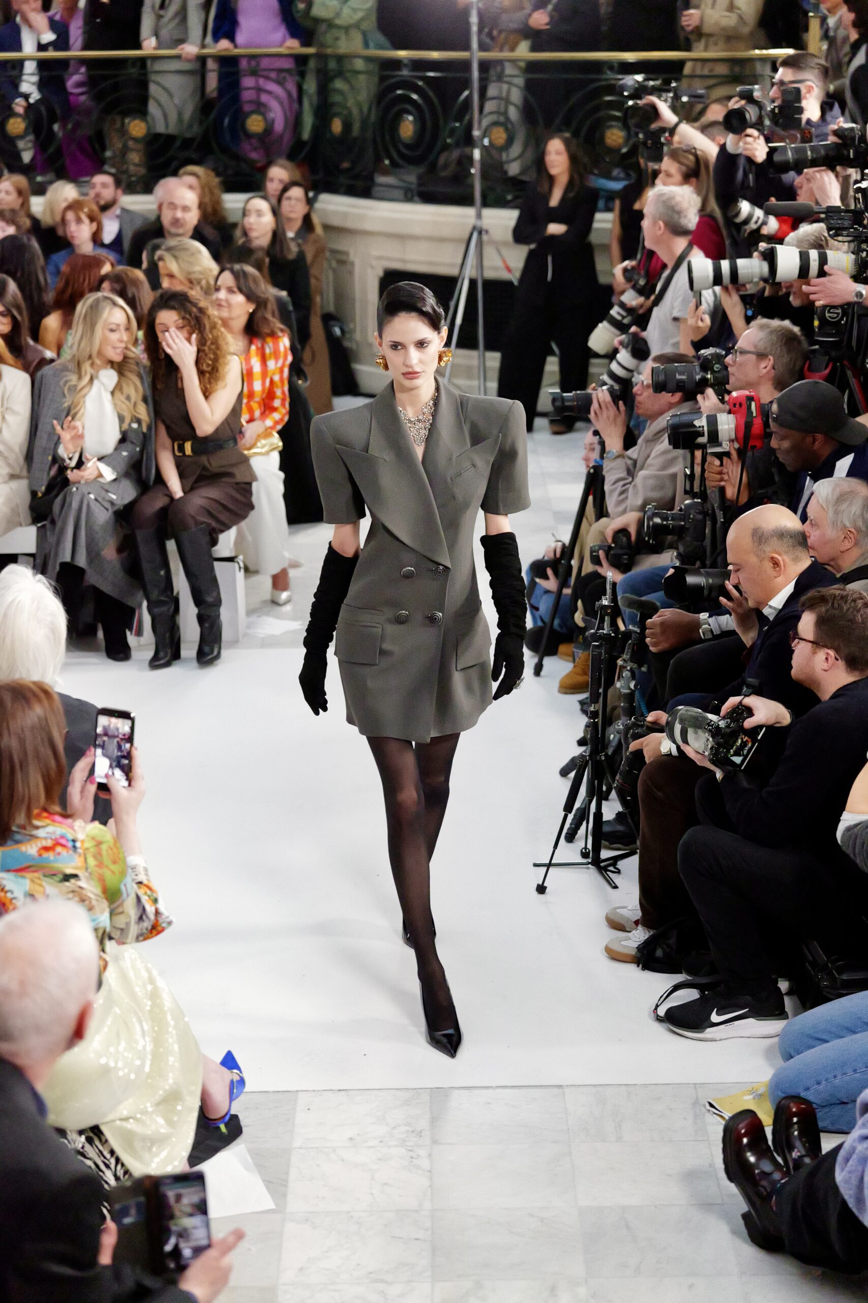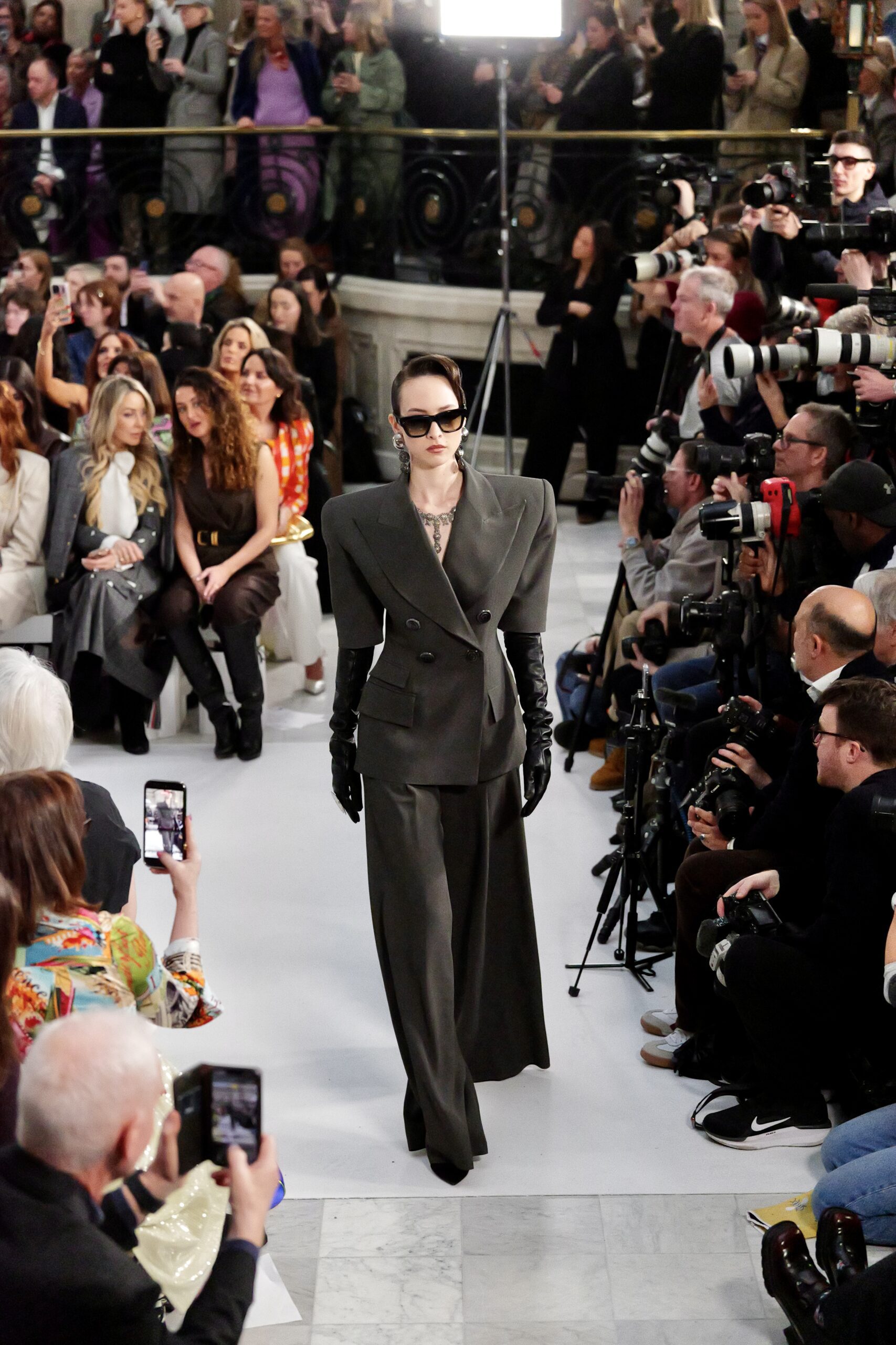 Les gants d’opéra, très présents sur le podium, prolongent la ligne des bras et signent une silhouette assumée, en phase avec un mouvement plus large observé cette saison sur d’autres podiums internationaux. Les coupes tailleur restent rigoureuses, fidèles à l’ADN de la maison — épaules sculptées, double-boutonnage à taille marquée, blouses lavallières désormais ancrées dans une gamme chromatique assagie. Les volumes de certaines robes du soir prennent une ampleur qui dialogue clairement avec l’héritage des années 1980, sans jamais verser dans la nostalgie mécanique.