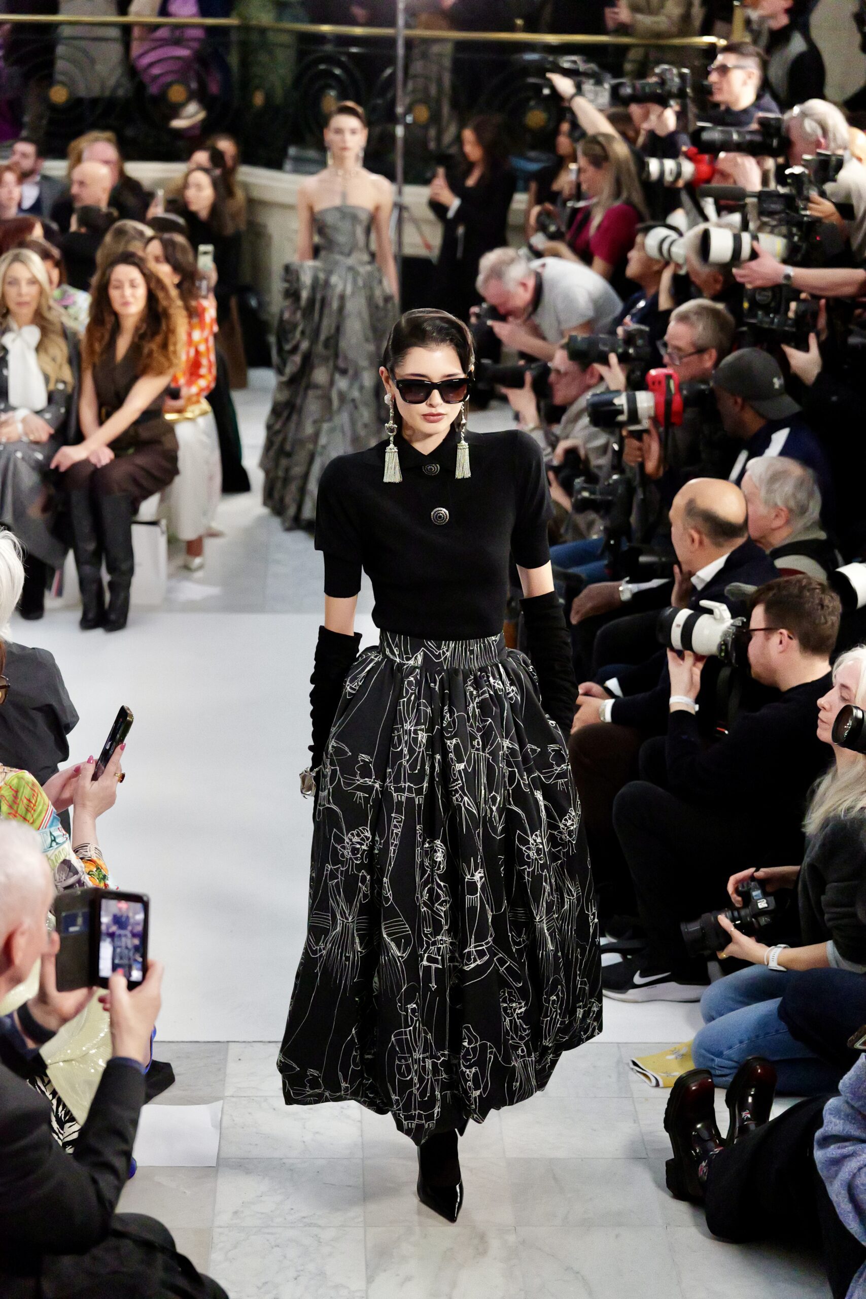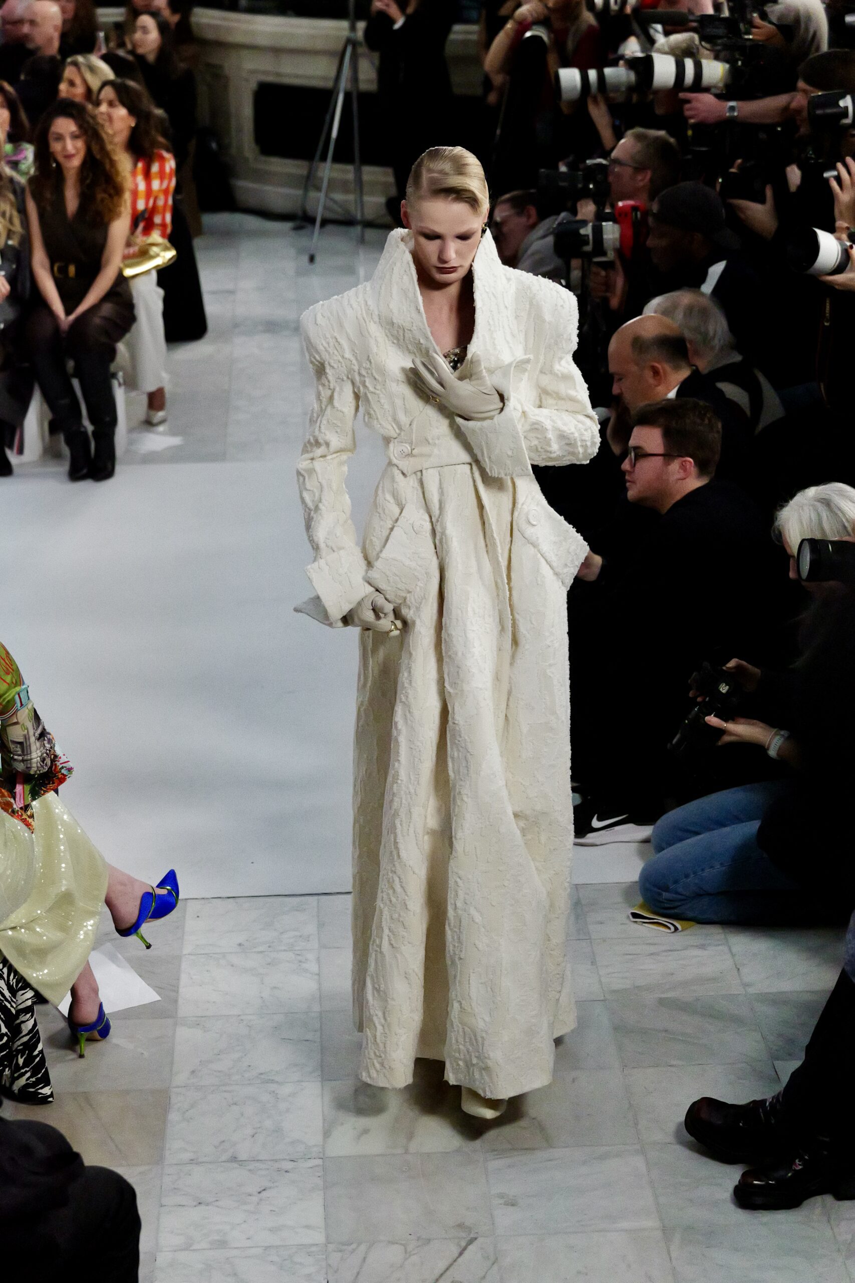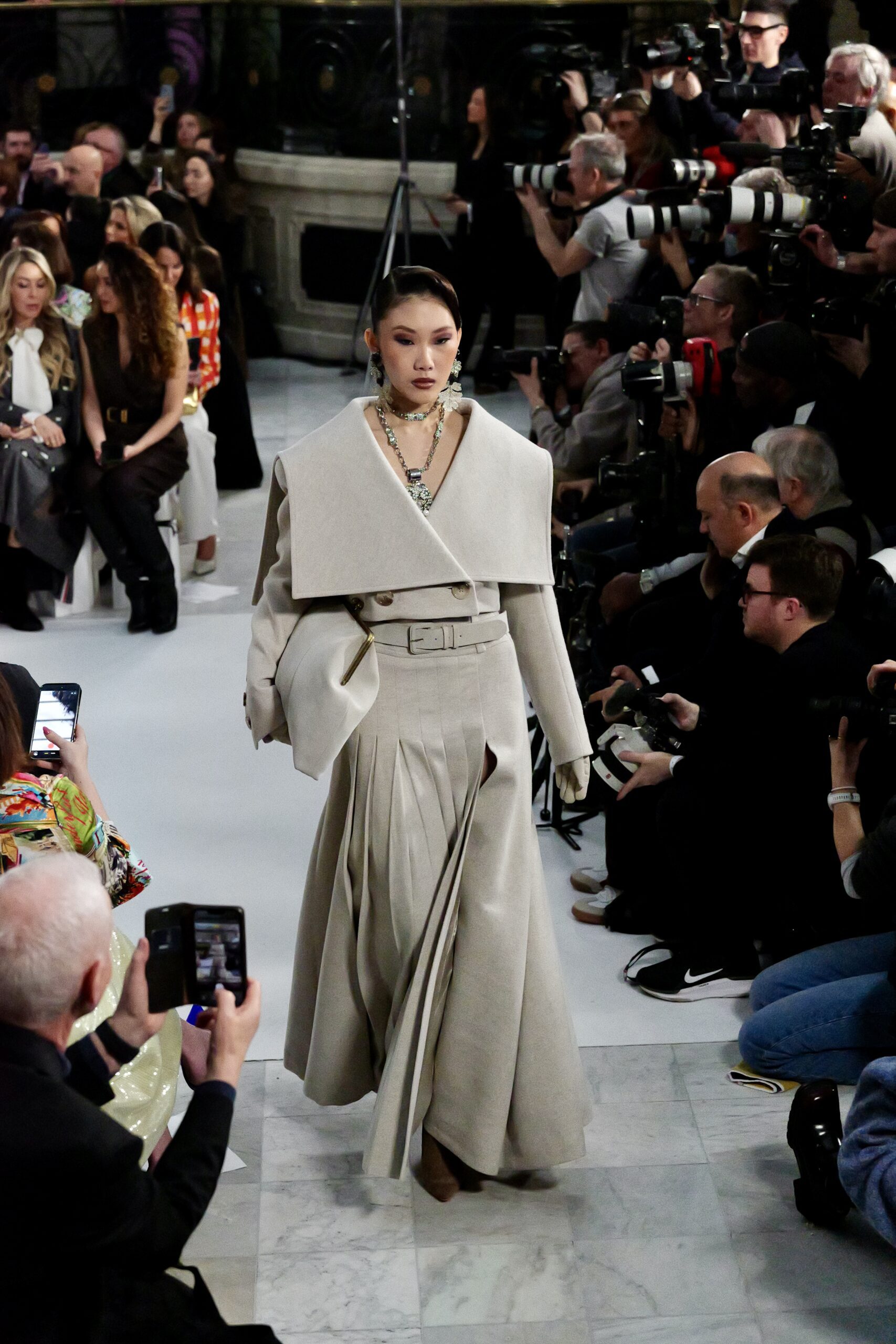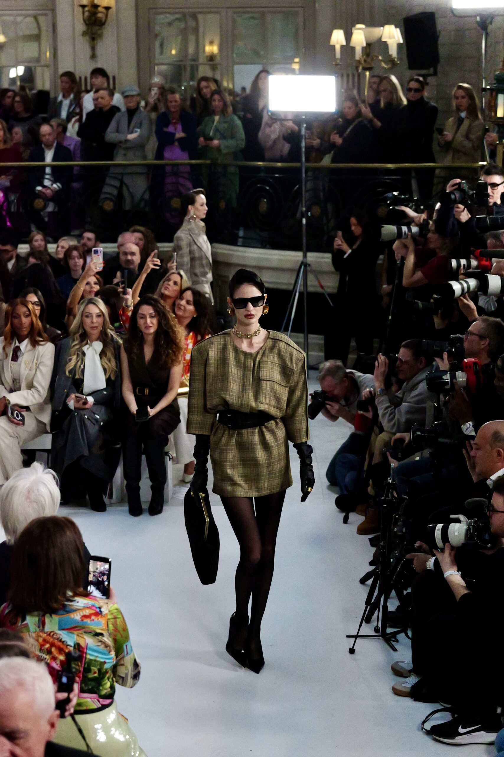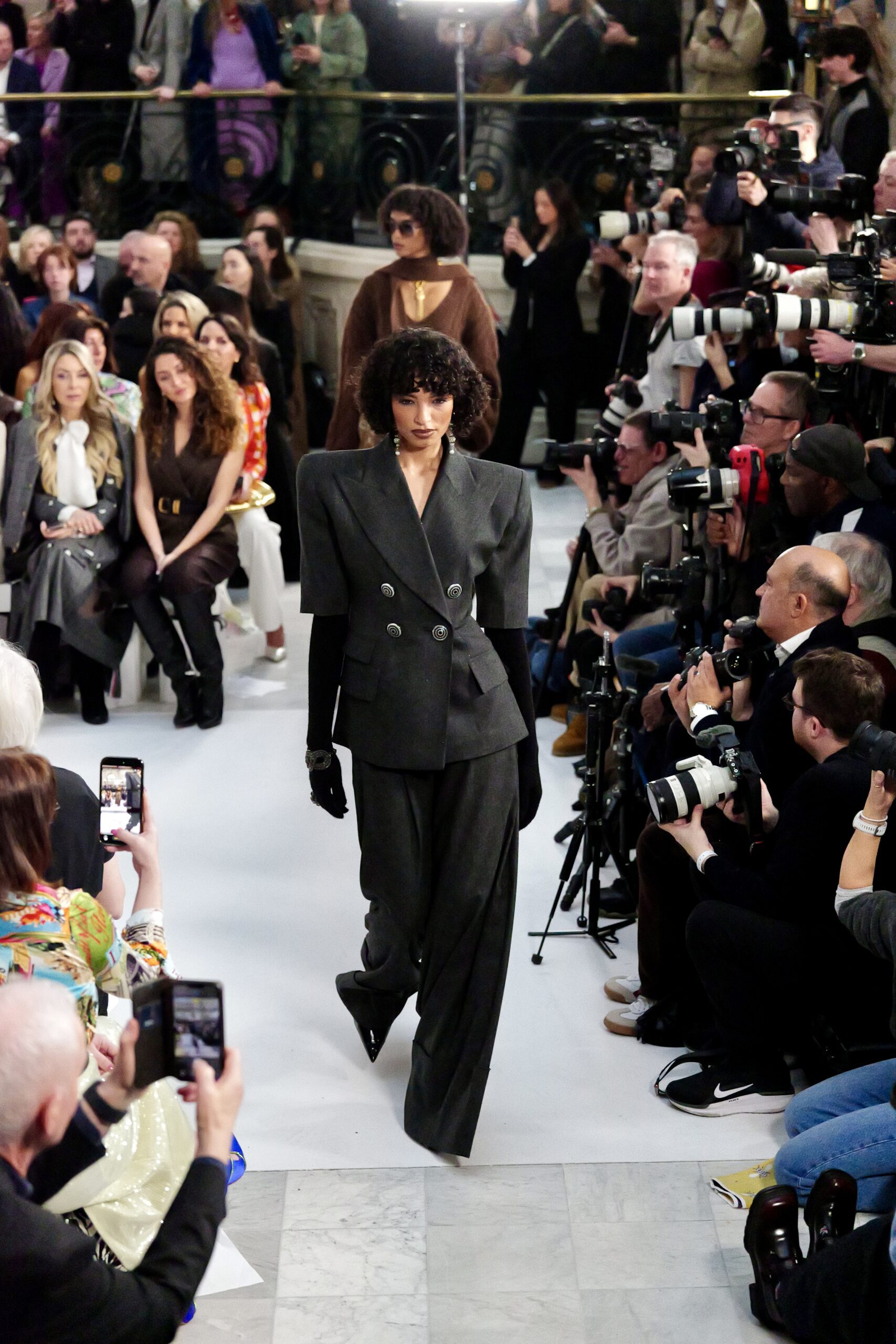 Les gants d’opéra, très présents sur le podium, prolongent la ligne des bras et signent une silhouette assumée, en phase avec un mouvement plus large observé cette saison sur d’autres podiums internationaux. Les coupes tailleur restent rigoureuses, fidèles à l’ADN de la maison — épaules sculptées, double-boutonnage à taille marquée, blouses lavallières désormais ancrées dans une gamme chromatique assagie. Les volumes de certaines robes du soir prennent une ampleur qui dialogue clairement avec l’héritage des années 1980, sans jamais verser dans la nostalgie mécanique.