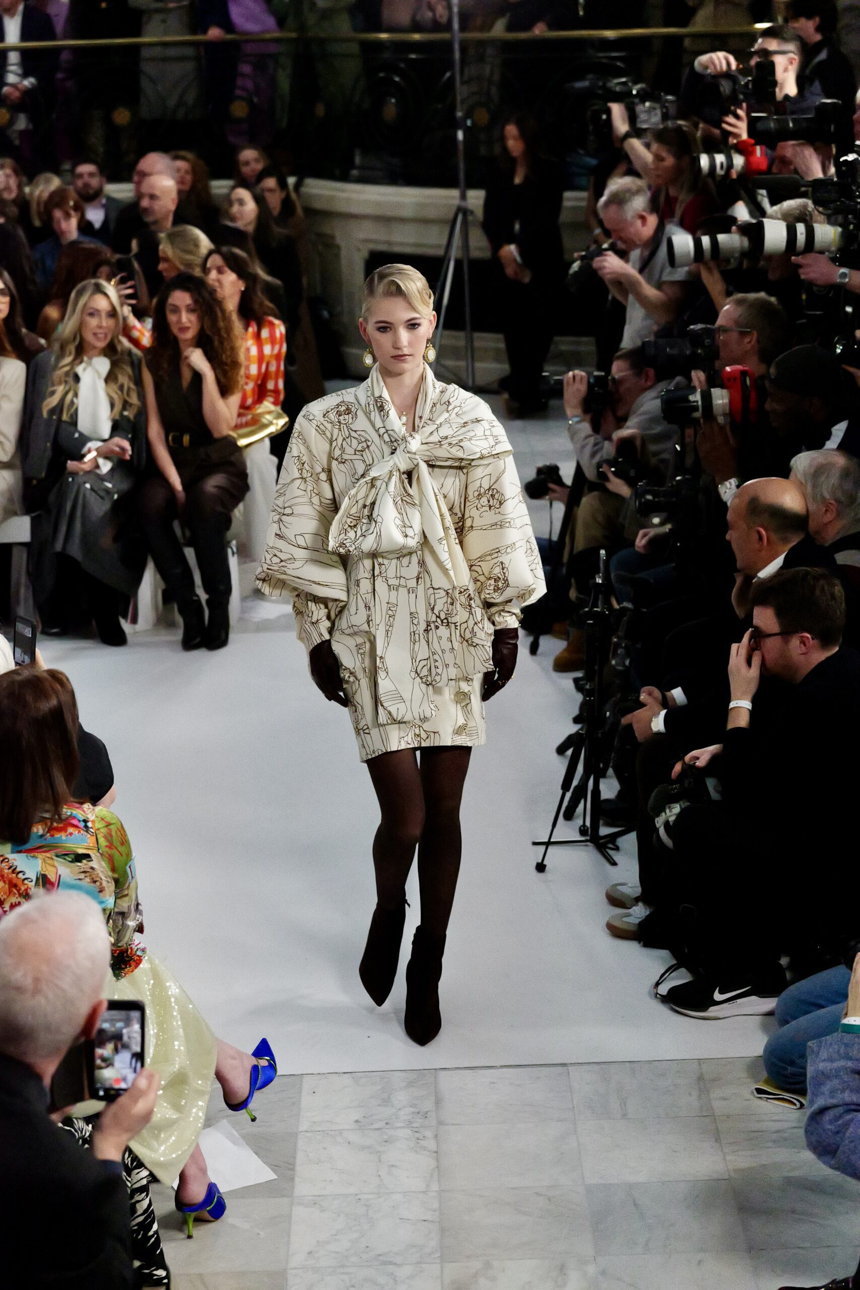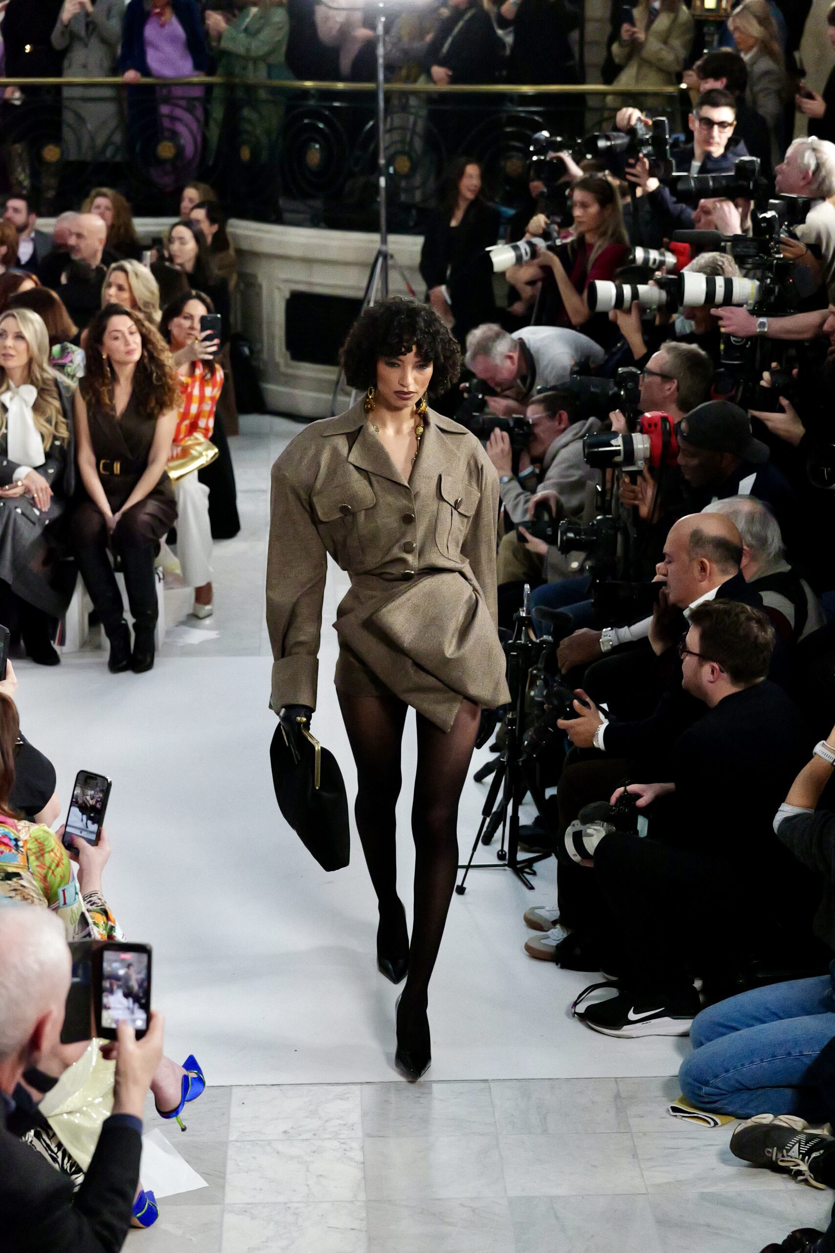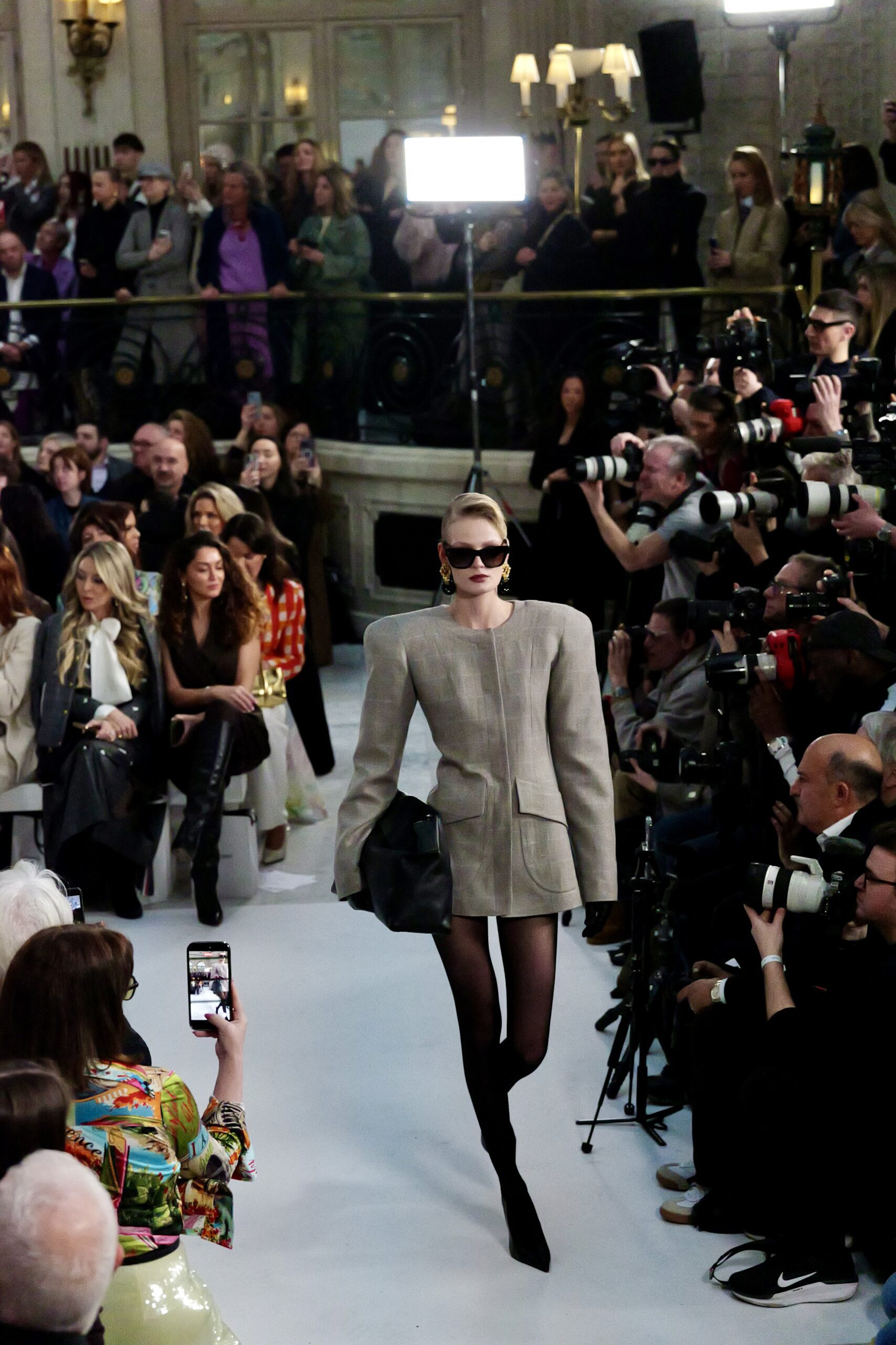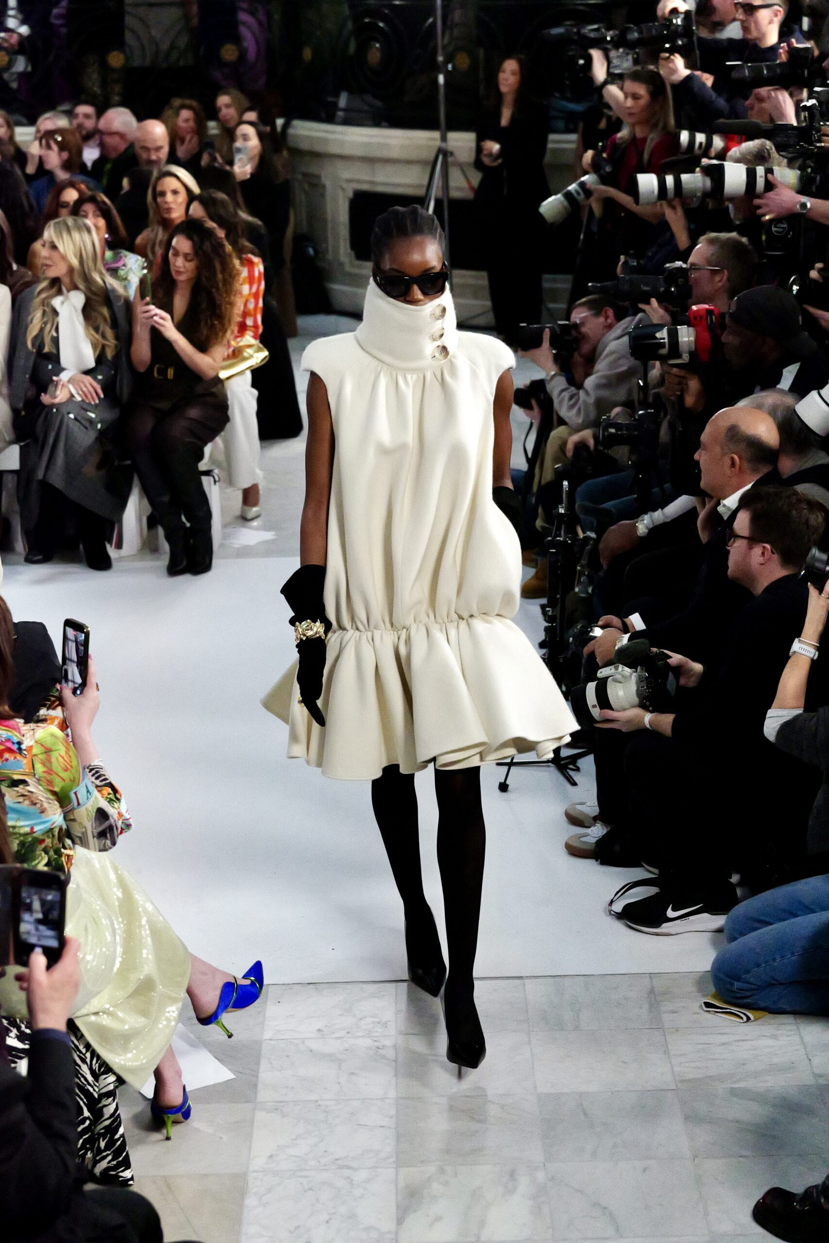 Les gants d’opéra, très présents sur le podium, prolongent la ligne des bras et signent une silhouette assumée, en phase avec un mouvement plus large observé cette saison sur d’autres podiums internationaux. Les coupes tailleur restent rigoureuses, fidèles à l’ADN de la maison — épaules sculptées, double-boutonnage à taille marquée, blouses lavallières désormais ancrées dans une gamme chromatique assagie. Les volumes de certaines robes du soir prennent une ampleur qui dialogue clairement avec l’héritage des années 1980, sans jamais verser dans la nostalgie mécanique.