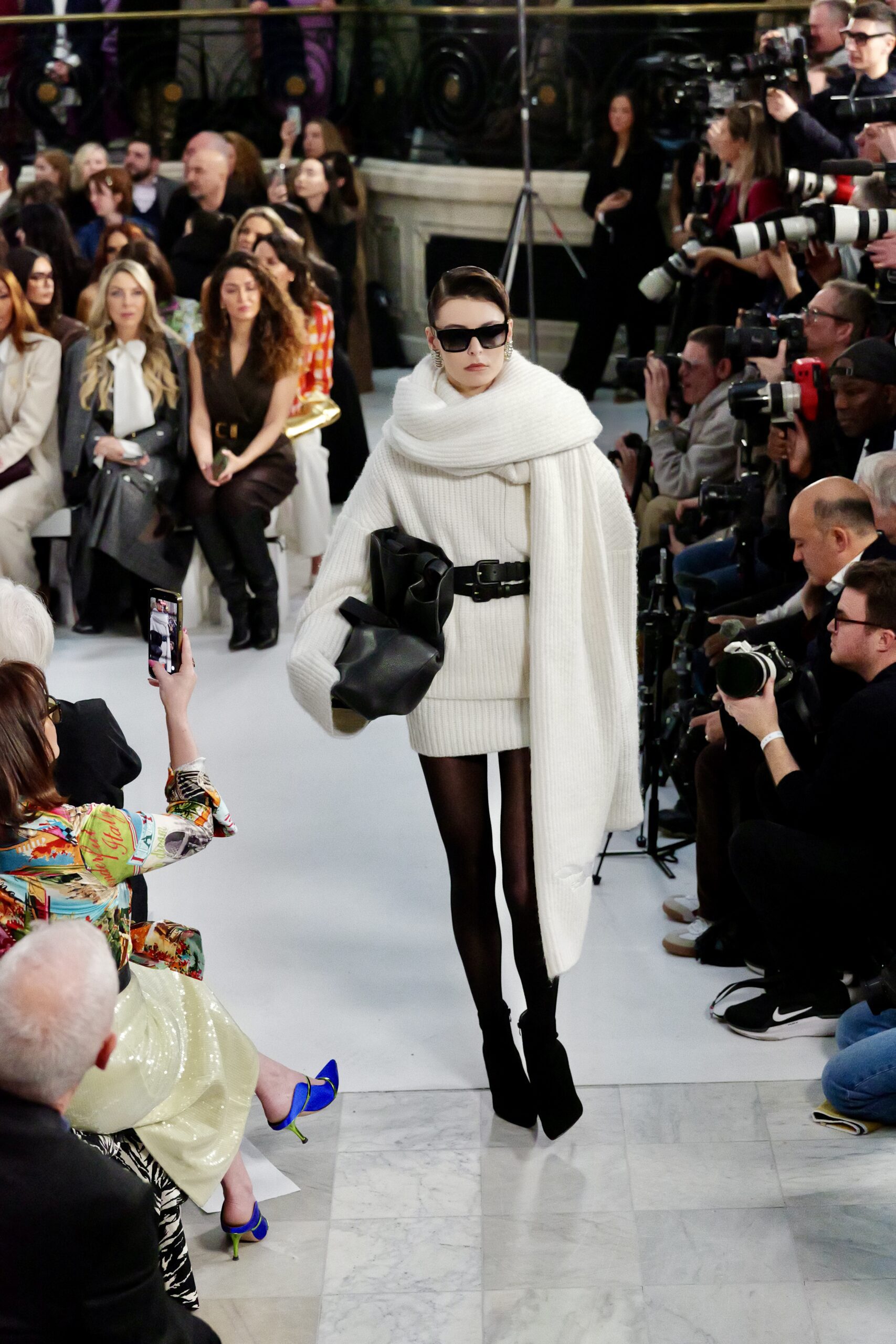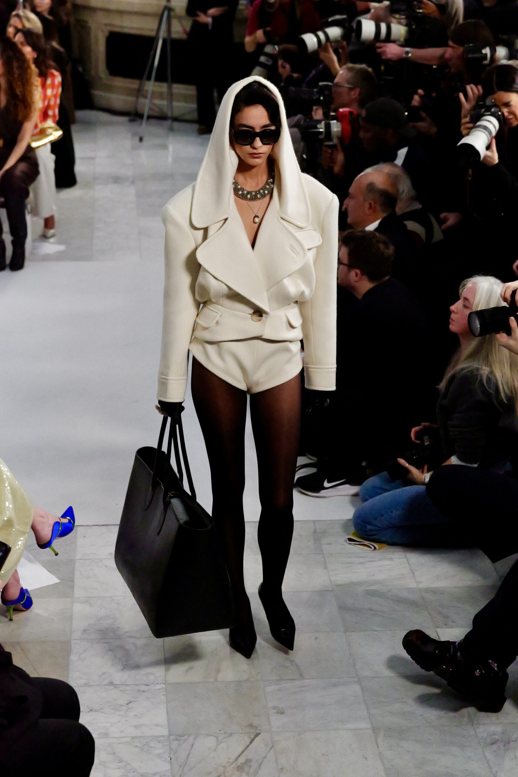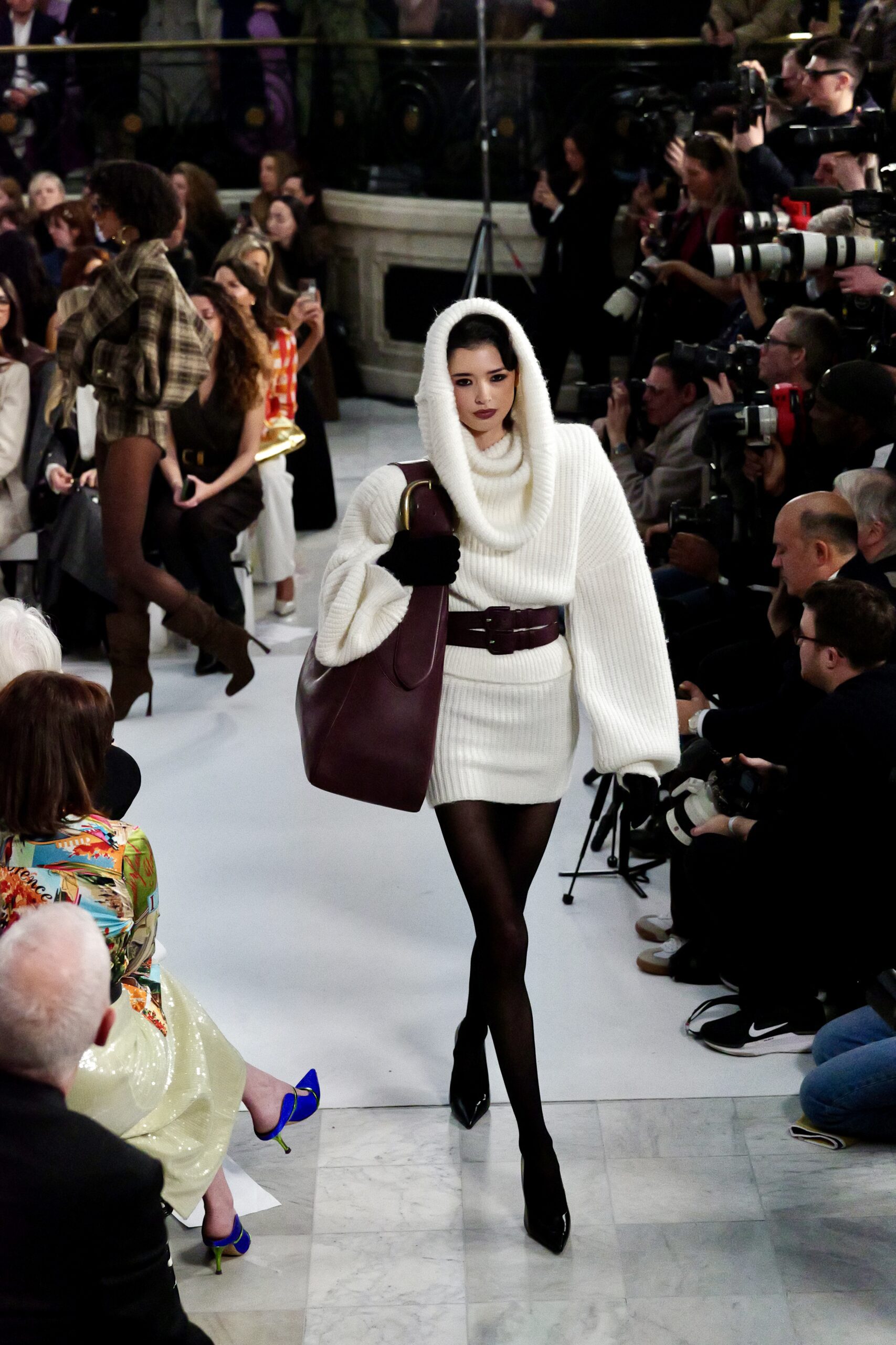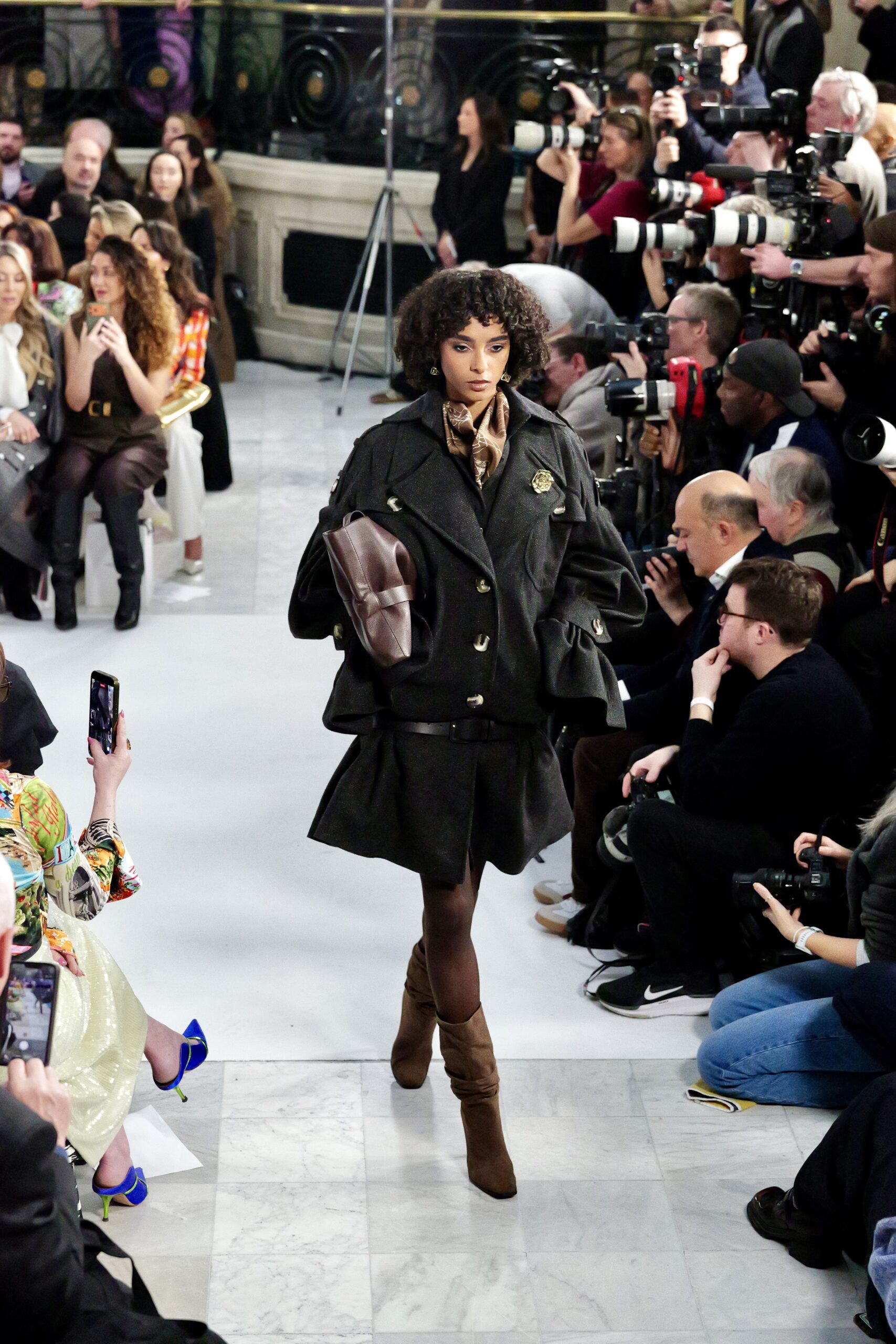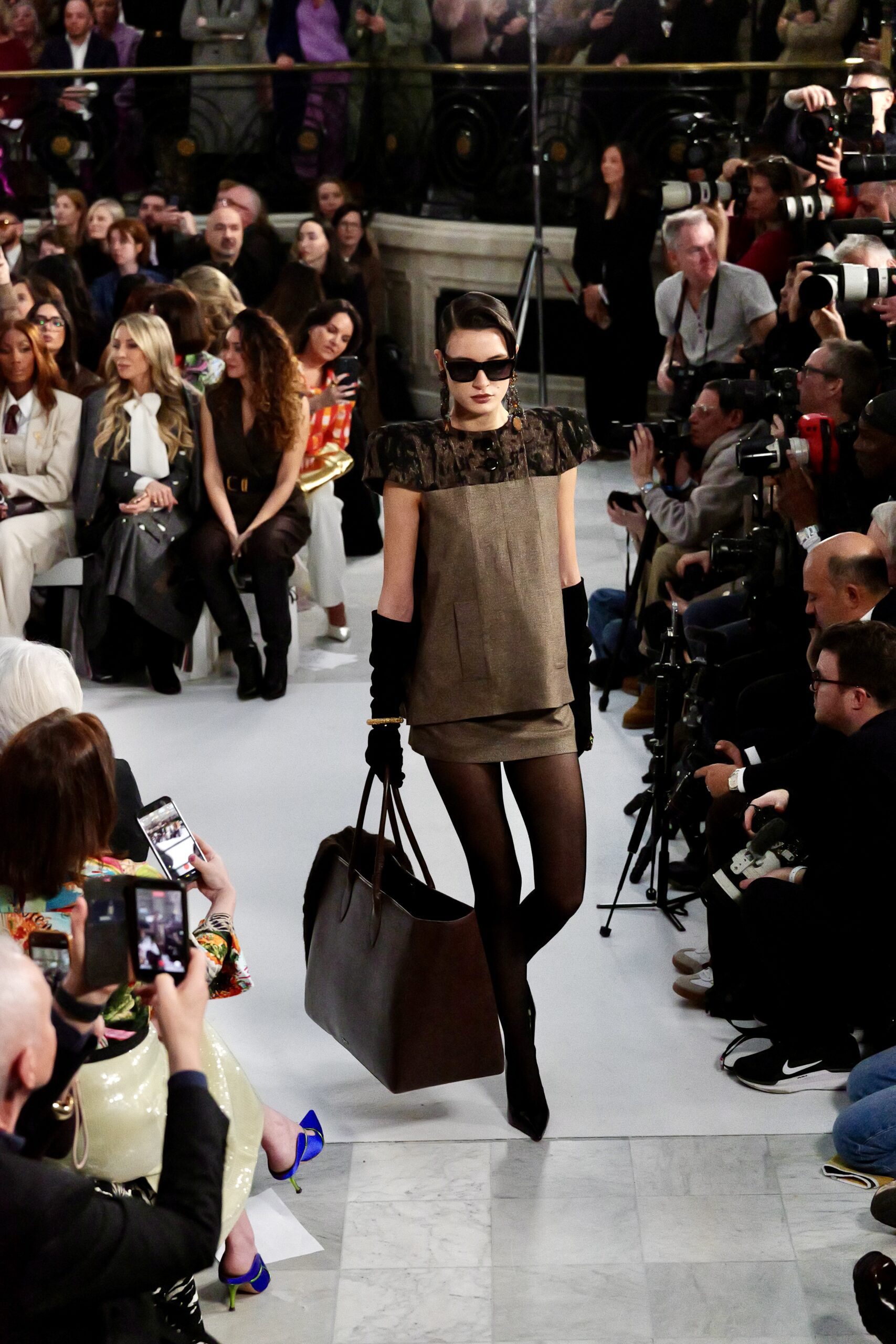 Les gants d’opéra, très présents sur le podium, prolongent la ligne des bras et signent une silhouette assumée, en phase avec un mouvement plus large observé cette saison sur d’autres podiums internationaux. Les coupes tailleur restent rigoureuses, fidèles à l’ADN de la maison — épaules sculptées, double-boutonnage à taille marquée, blouses lavallières désormais ancrées dans une gamme chromatique assagie. Les volumes de certaines robes du soir prennent une ampleur qui dialogue clairement avec l’héritage des années 1980, sans jamais verser dans la nostalgie mécanique.