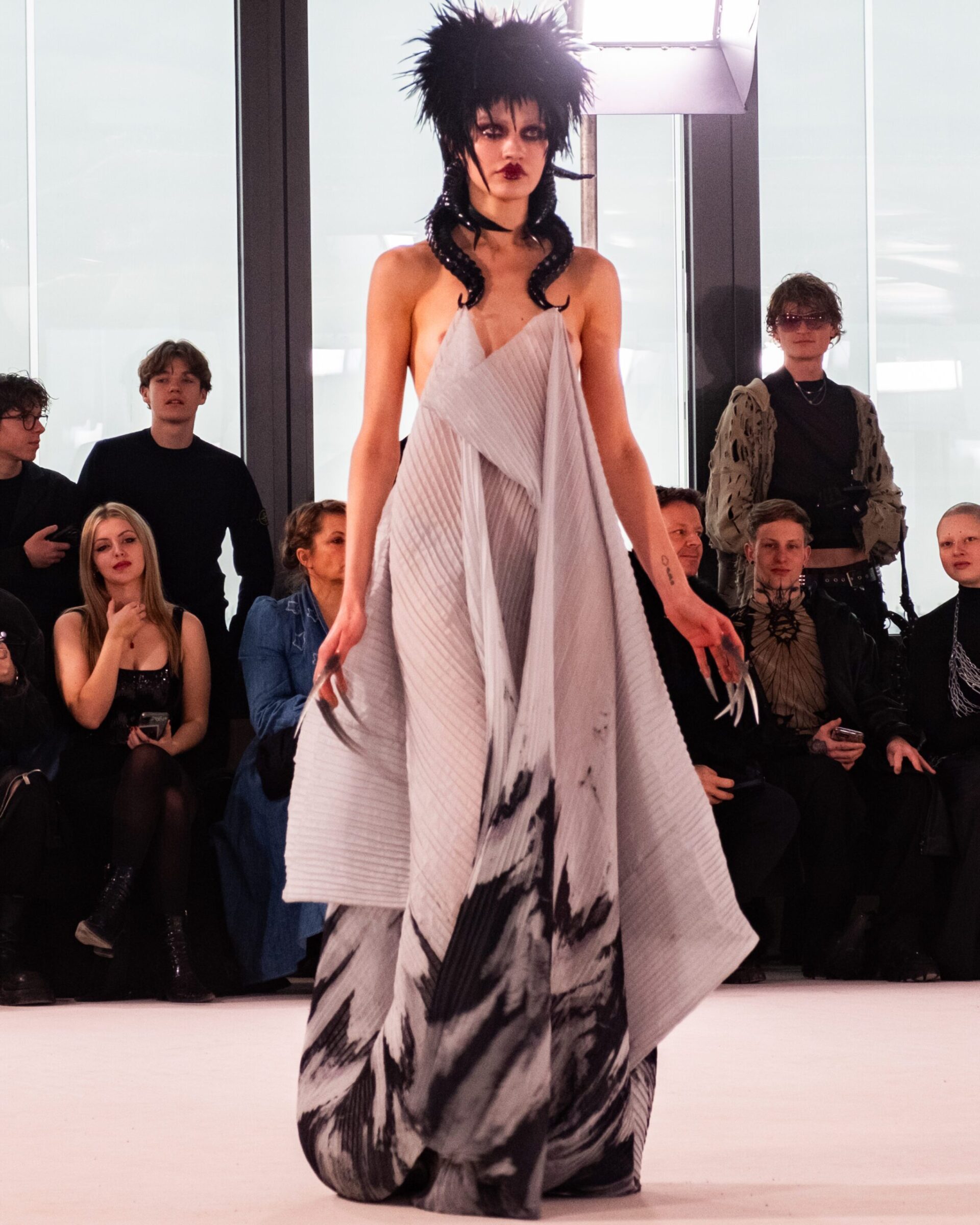 Le créateur ne s’adresse pas à la raison, mais à la peau, à l’inconscient. Corsets de verre, broderies suspendues, tulles qui s’évaporent à la lumière. On y distingue des échos d’Art Nouveau, des réminiscences gothiques, une tension futuriste. Tout respire l’unité d’une vision sans compromis.