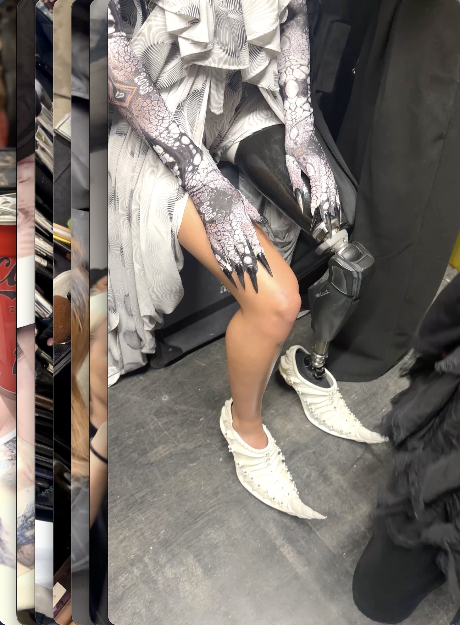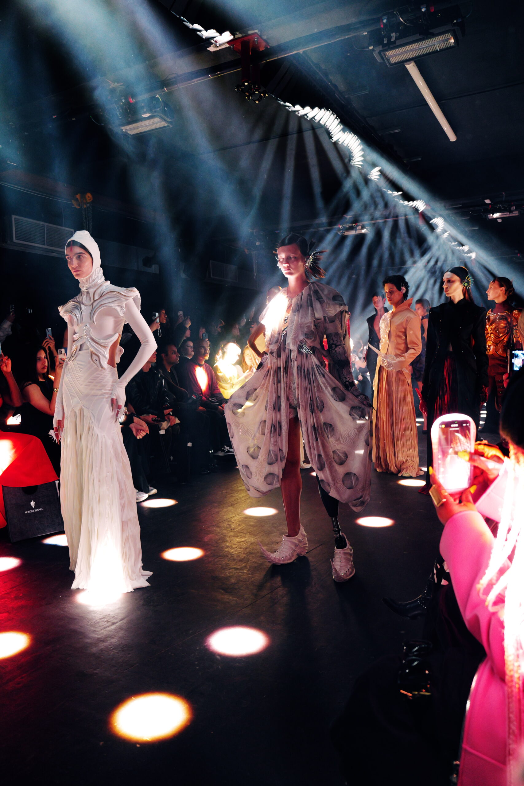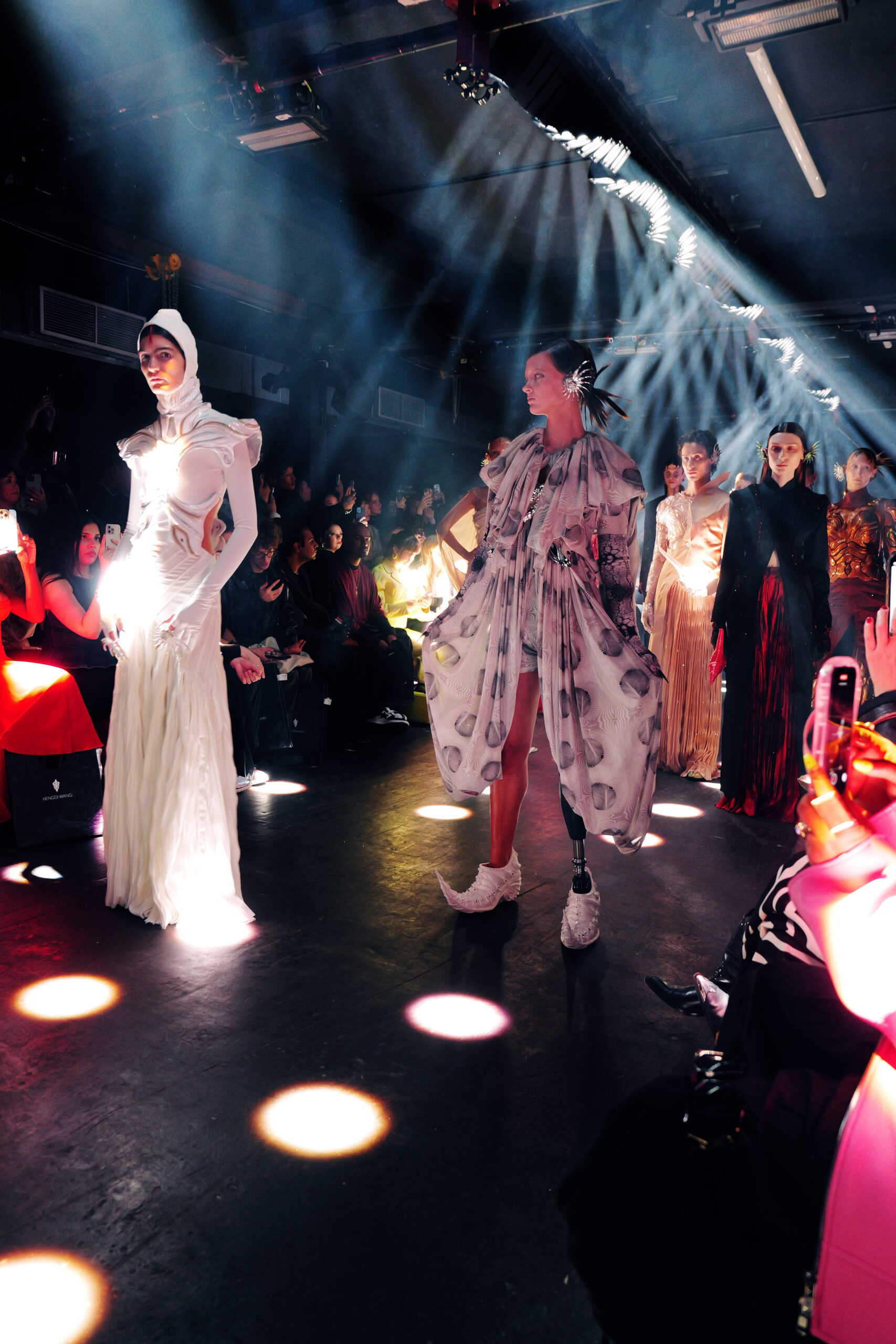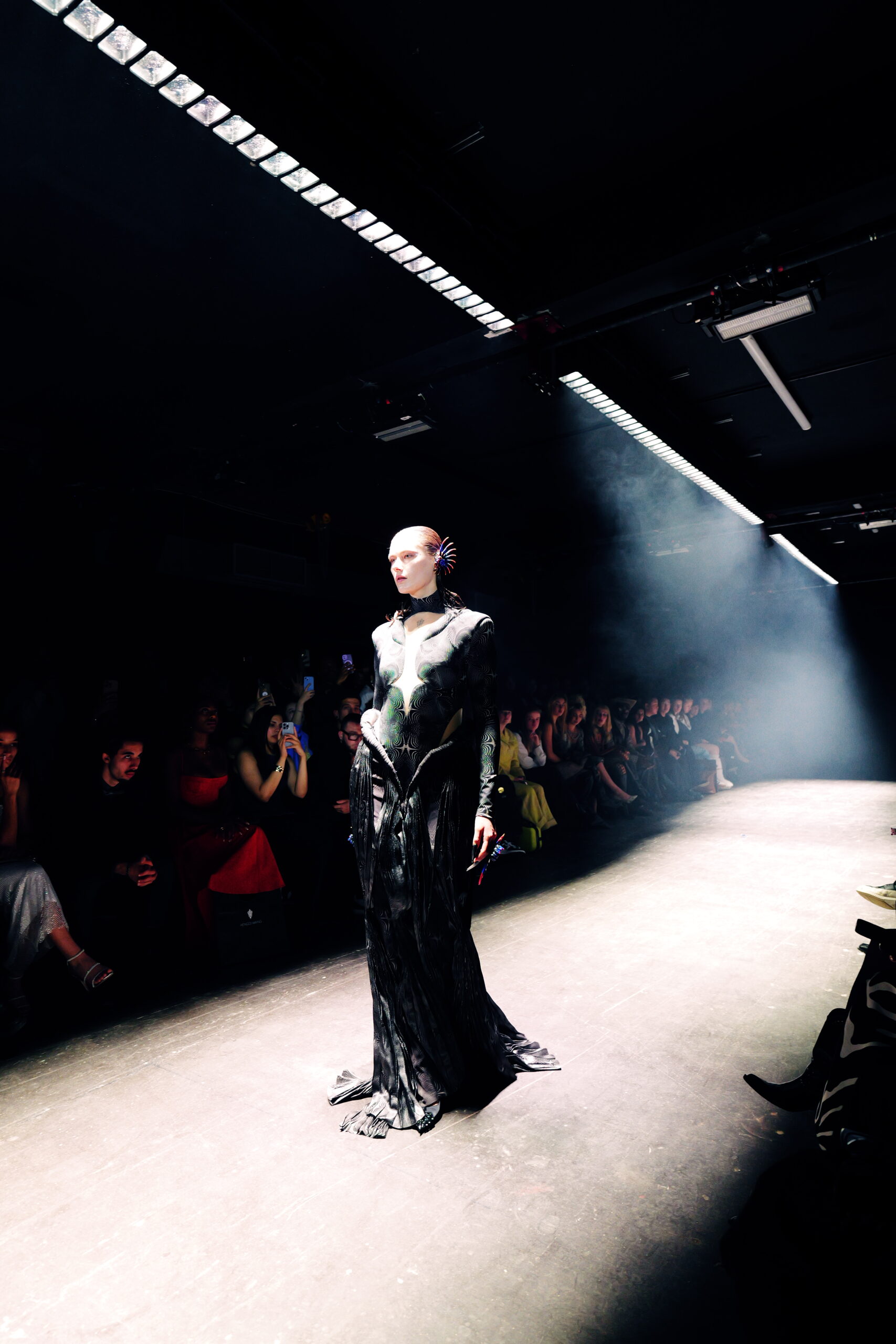 Le défilé. Un silence absolu. Un faisceau lumineux diagonal éclaire les silhouettes qui défilent. Cette seconde peau cristalline recouvre le corps des mannequins et défie toute catégorisation – ce n’est ni broderie, ni imprimé, c’est de l’impression 3D intégrée au textile. Chaque passage crée un tableau vivant…