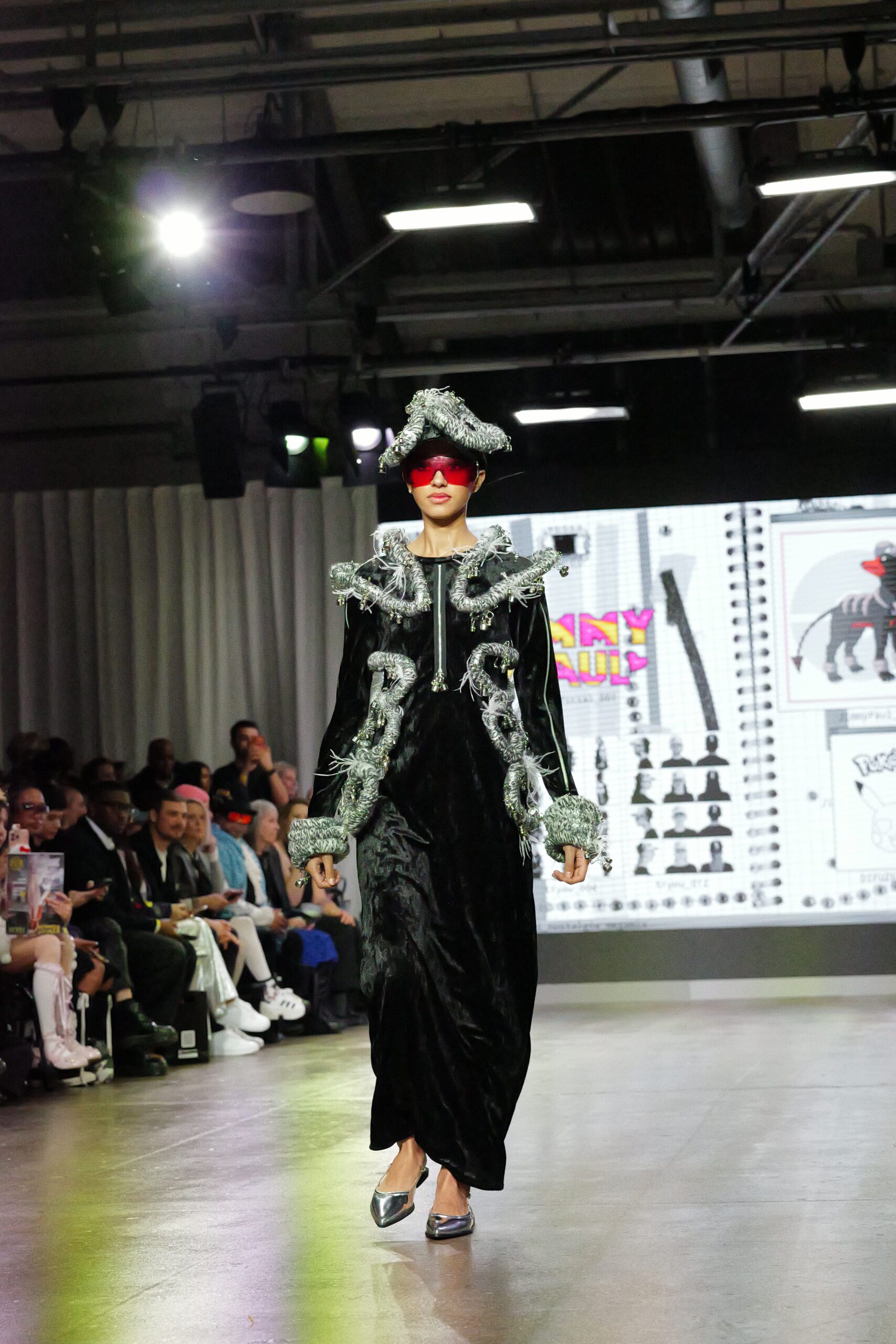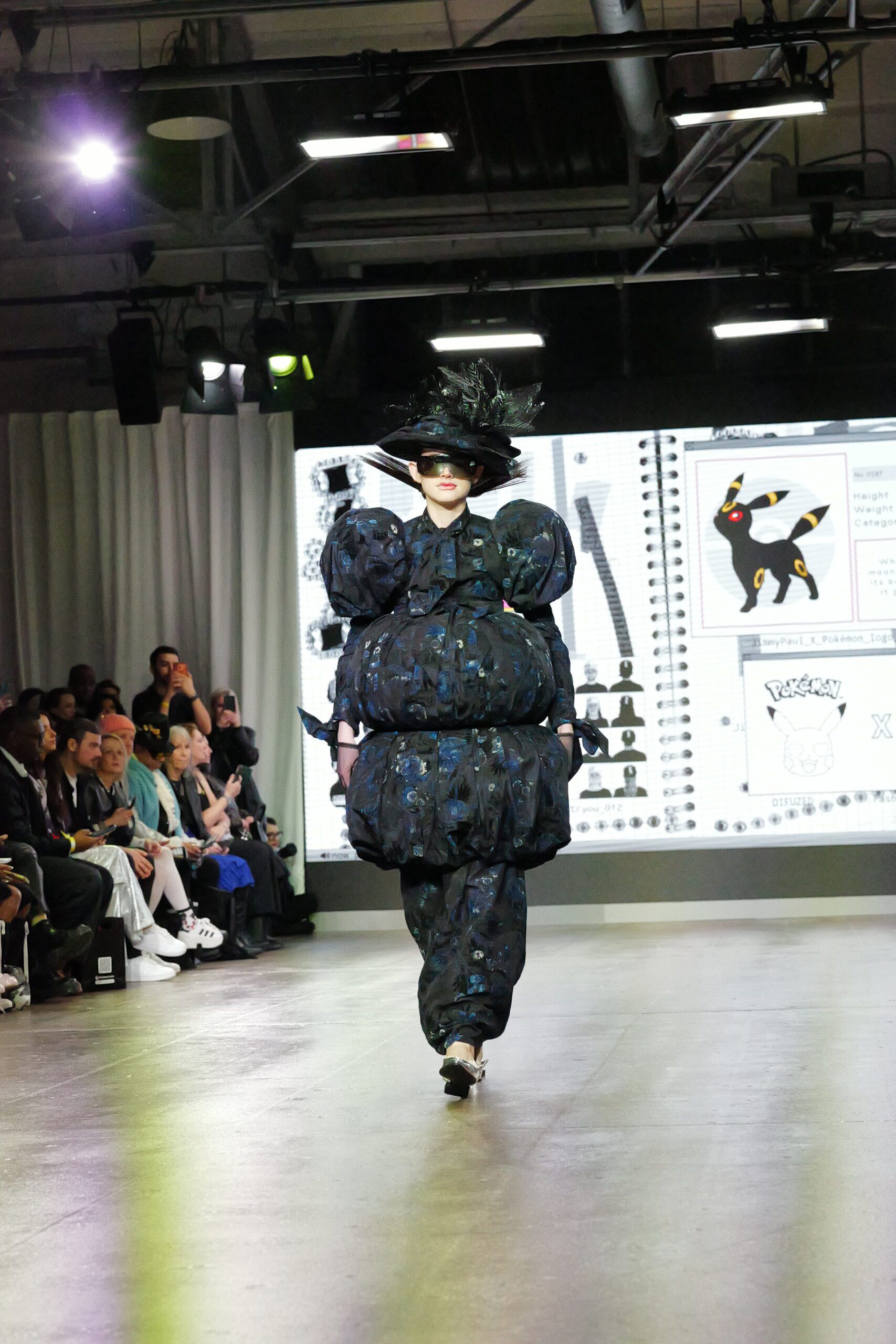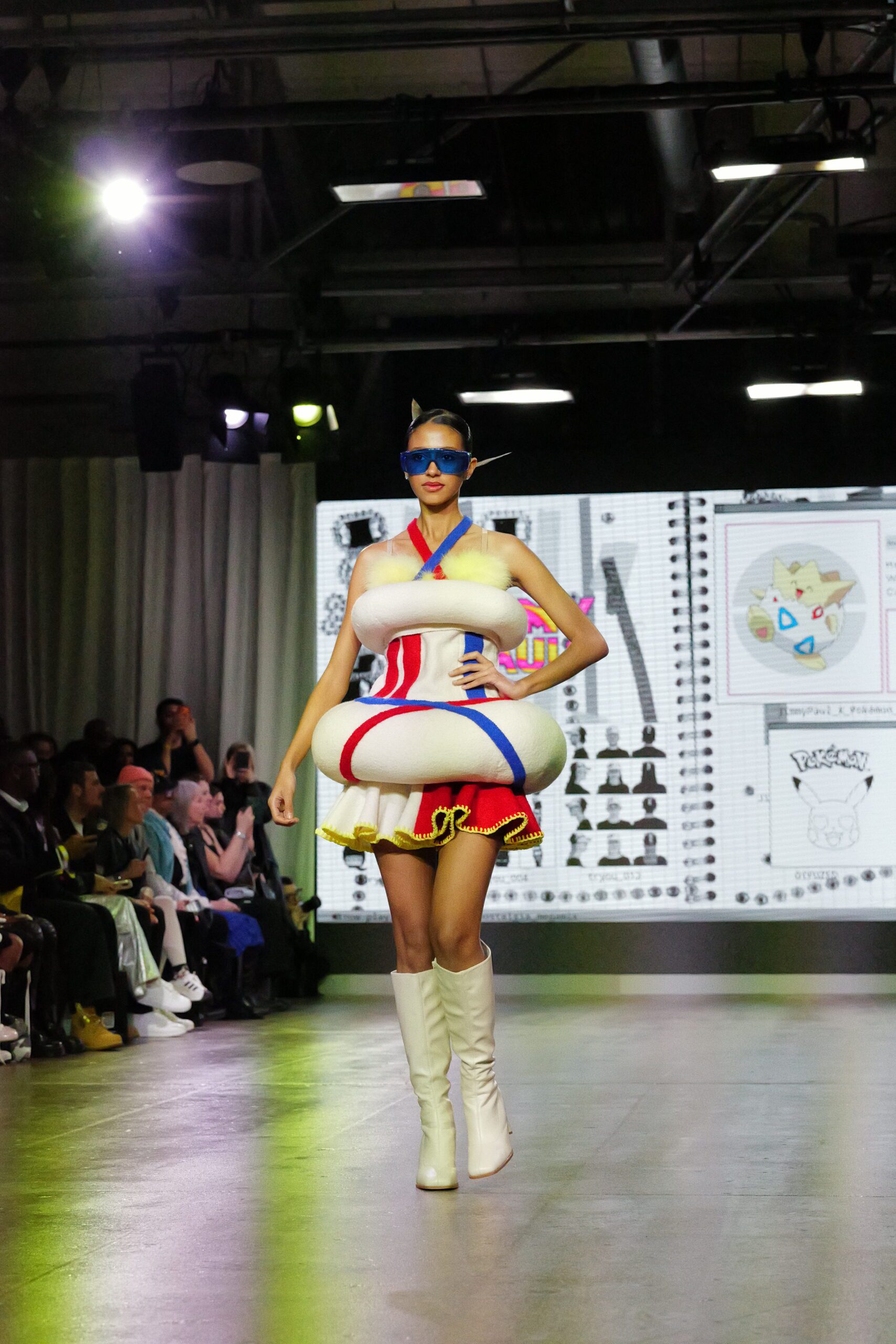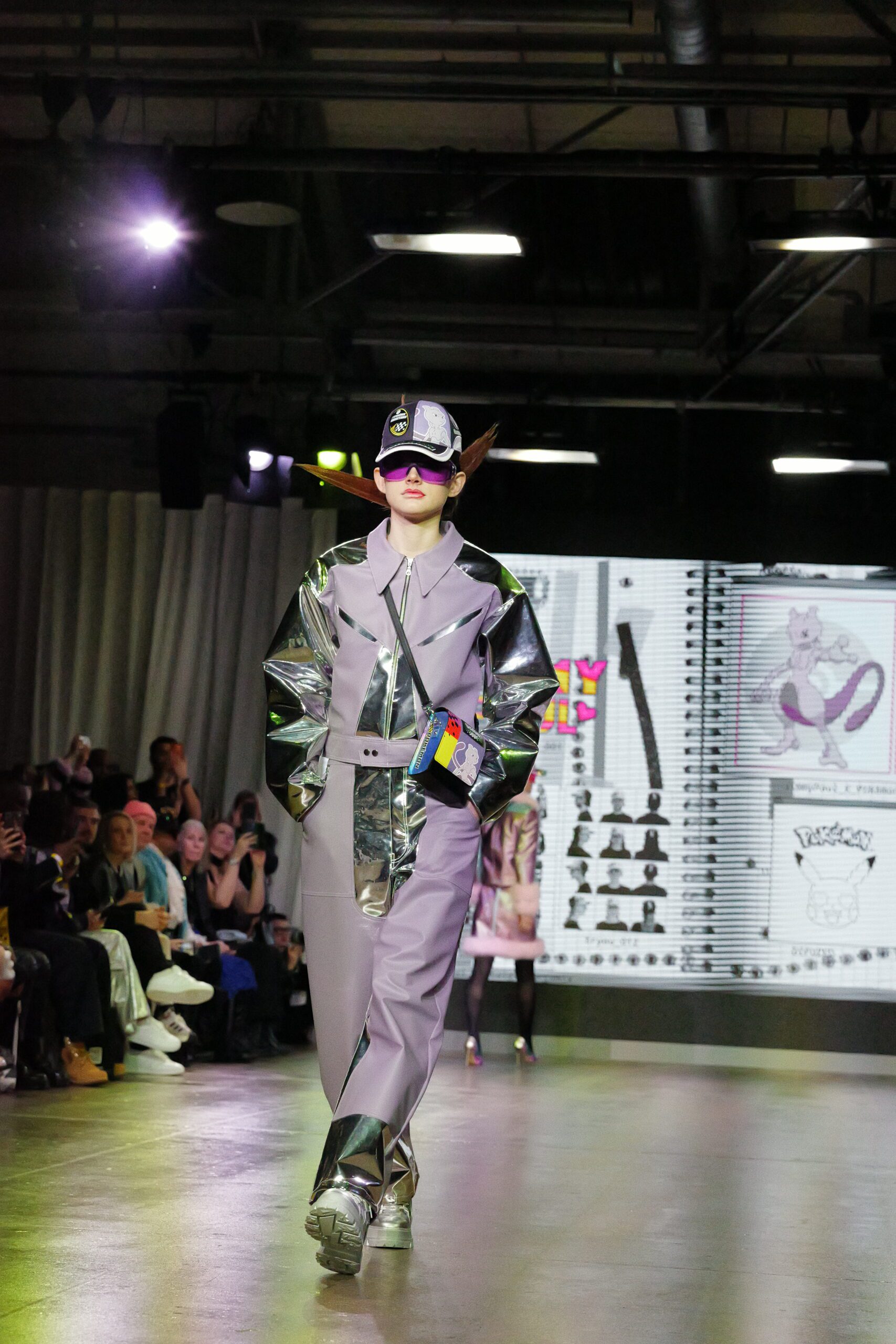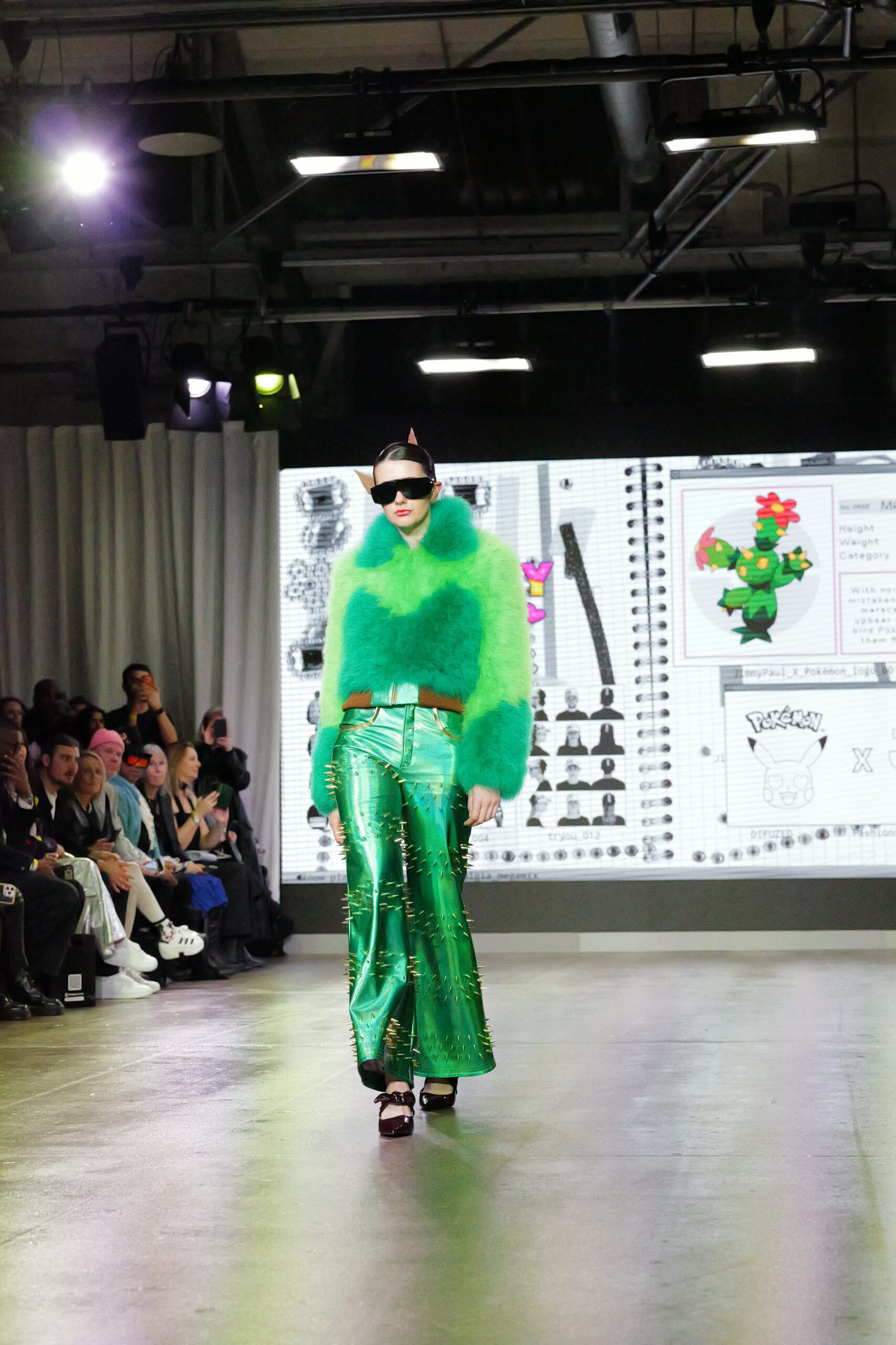 Sur le runway présenté lors de la London Fashion Week, organisée par la British Fashion Council, cela se voit dans des silhouettes qui fonctionnent comme des avatars. Un manteau arc‑en‑ciel de fausse fourrure, gonflé comme un nuage, pourrait être lu comme la matérialisation d’un compagnon de type Fée, à la fois bouclier et doudou. À l’inverse, une mini‑robe en sequins lips, associée à un chapeau peluche démesuré, convoque une énergie plus insolente, presque club kid : la joie d’oser être « trop », comme un Pokémon qui assume pleinement son caractère.