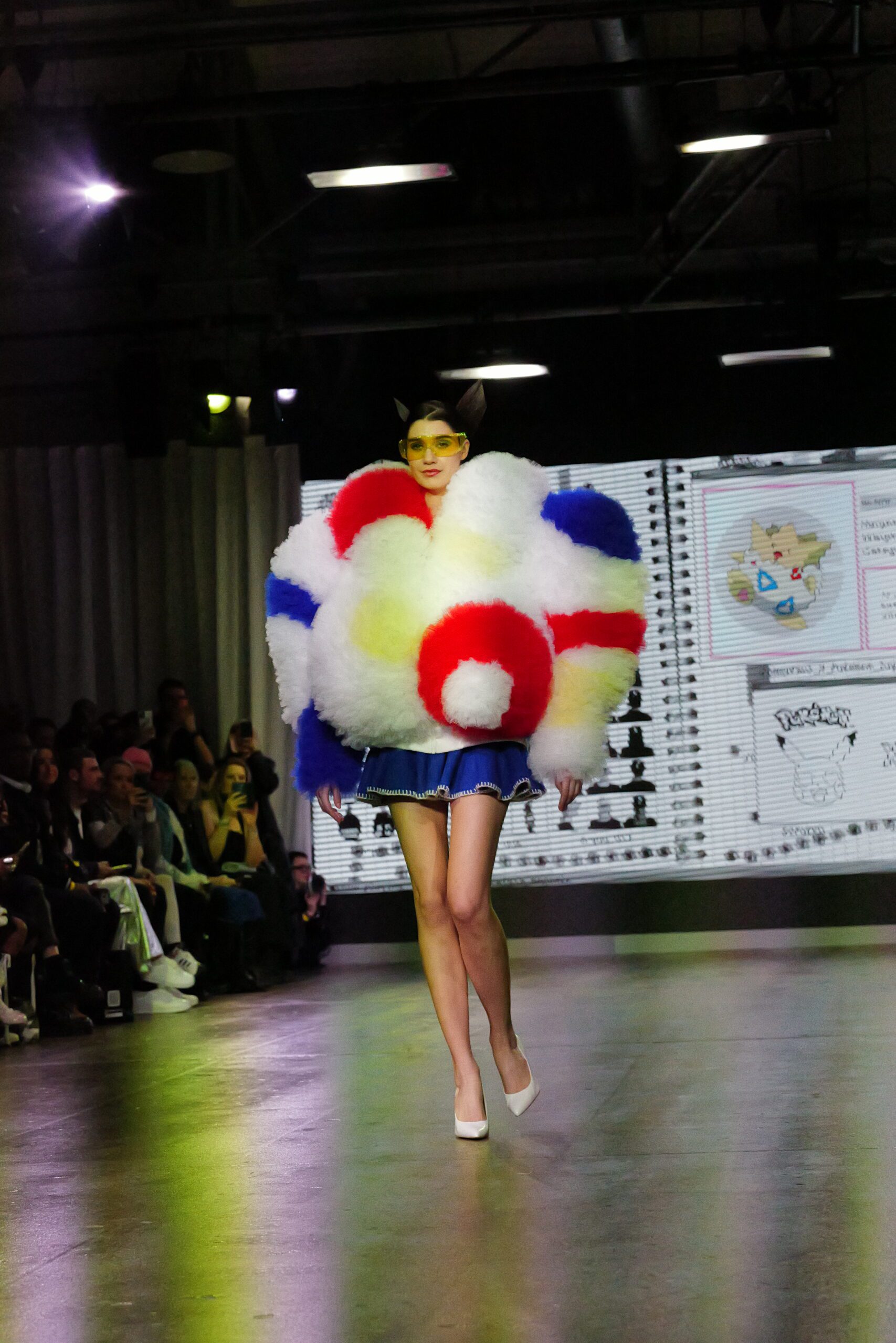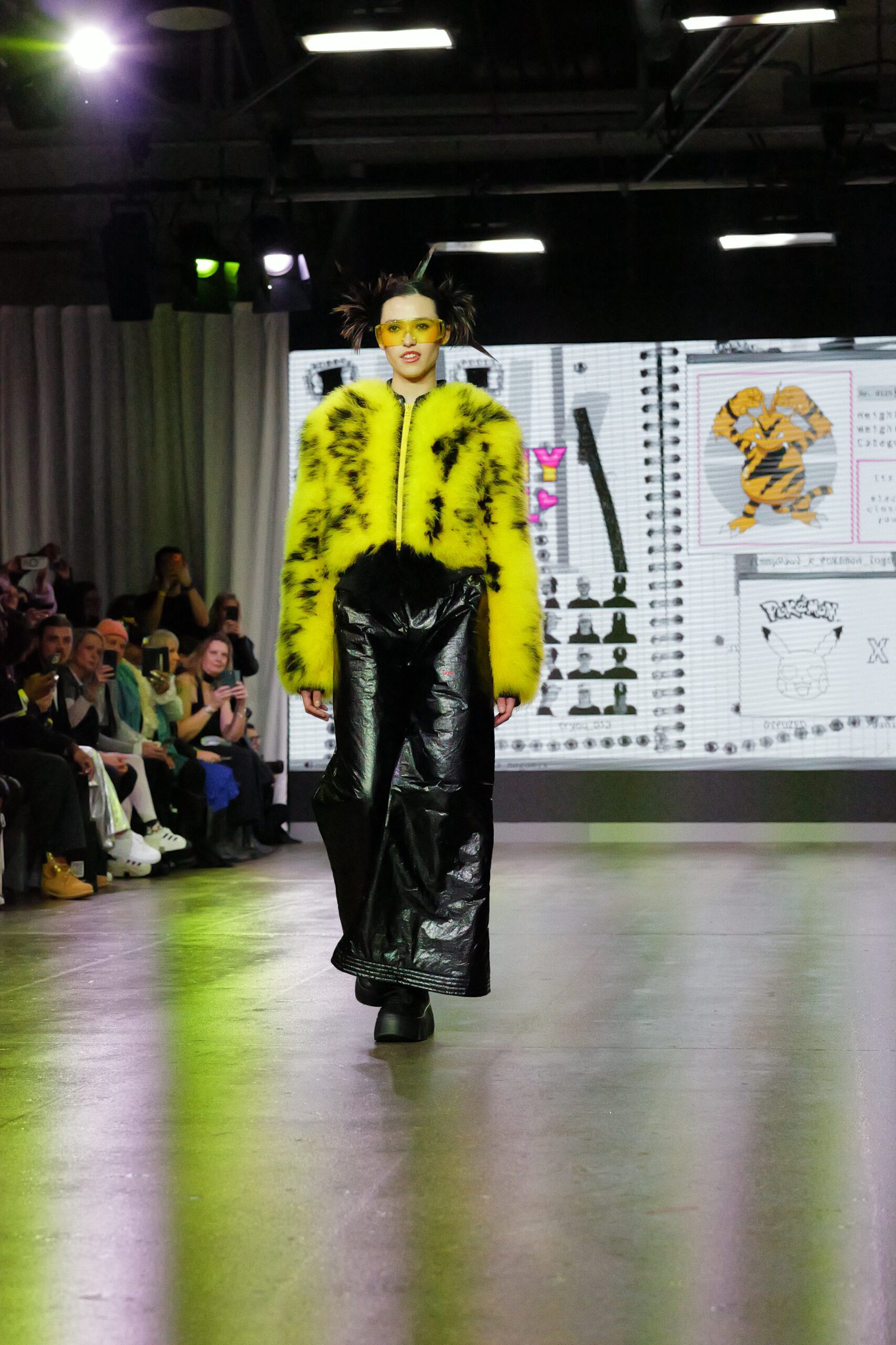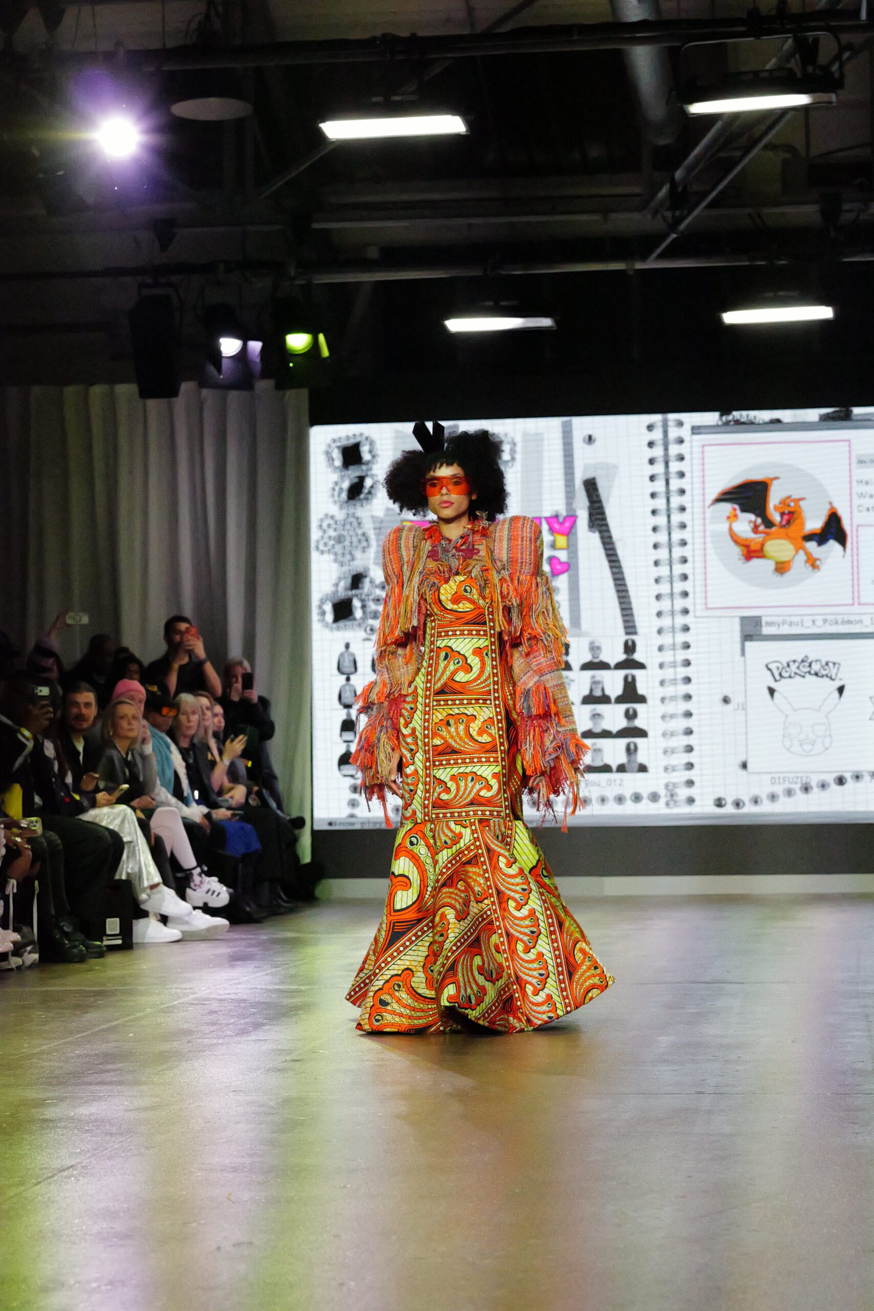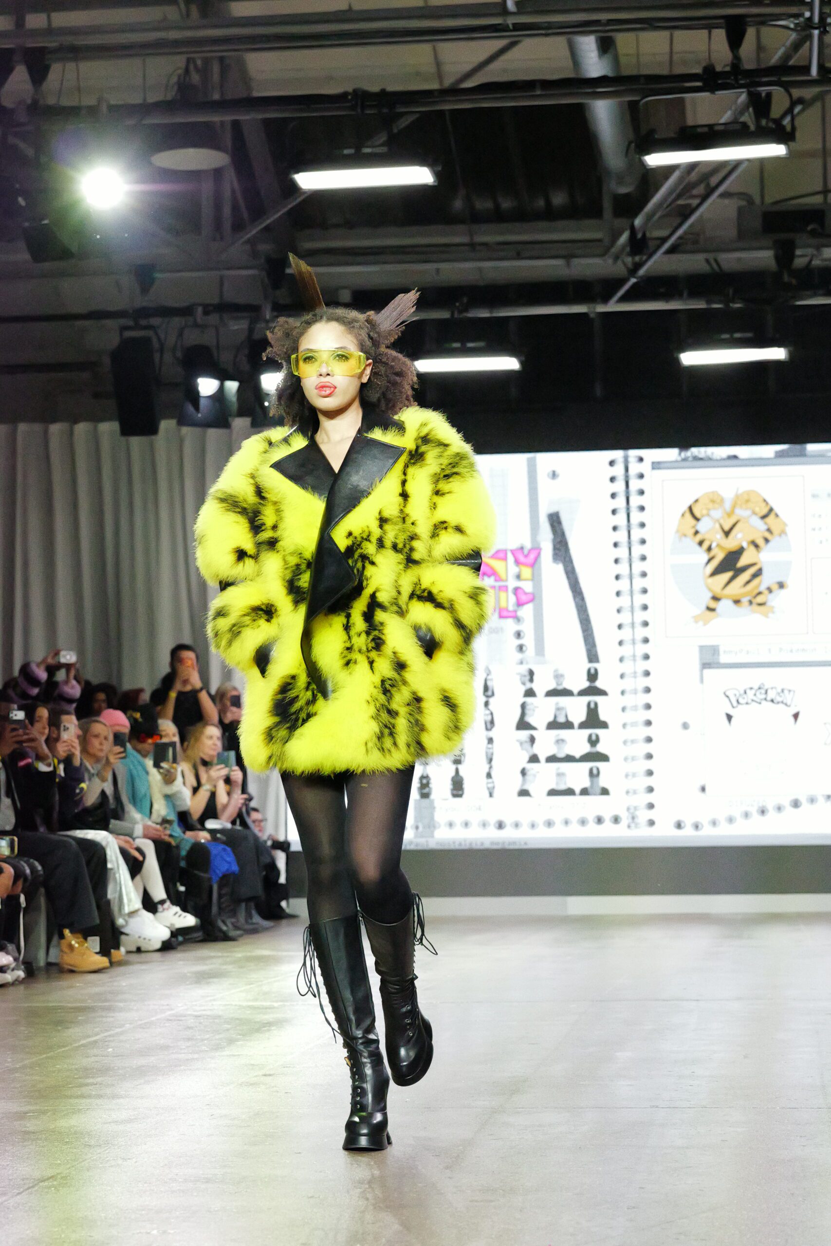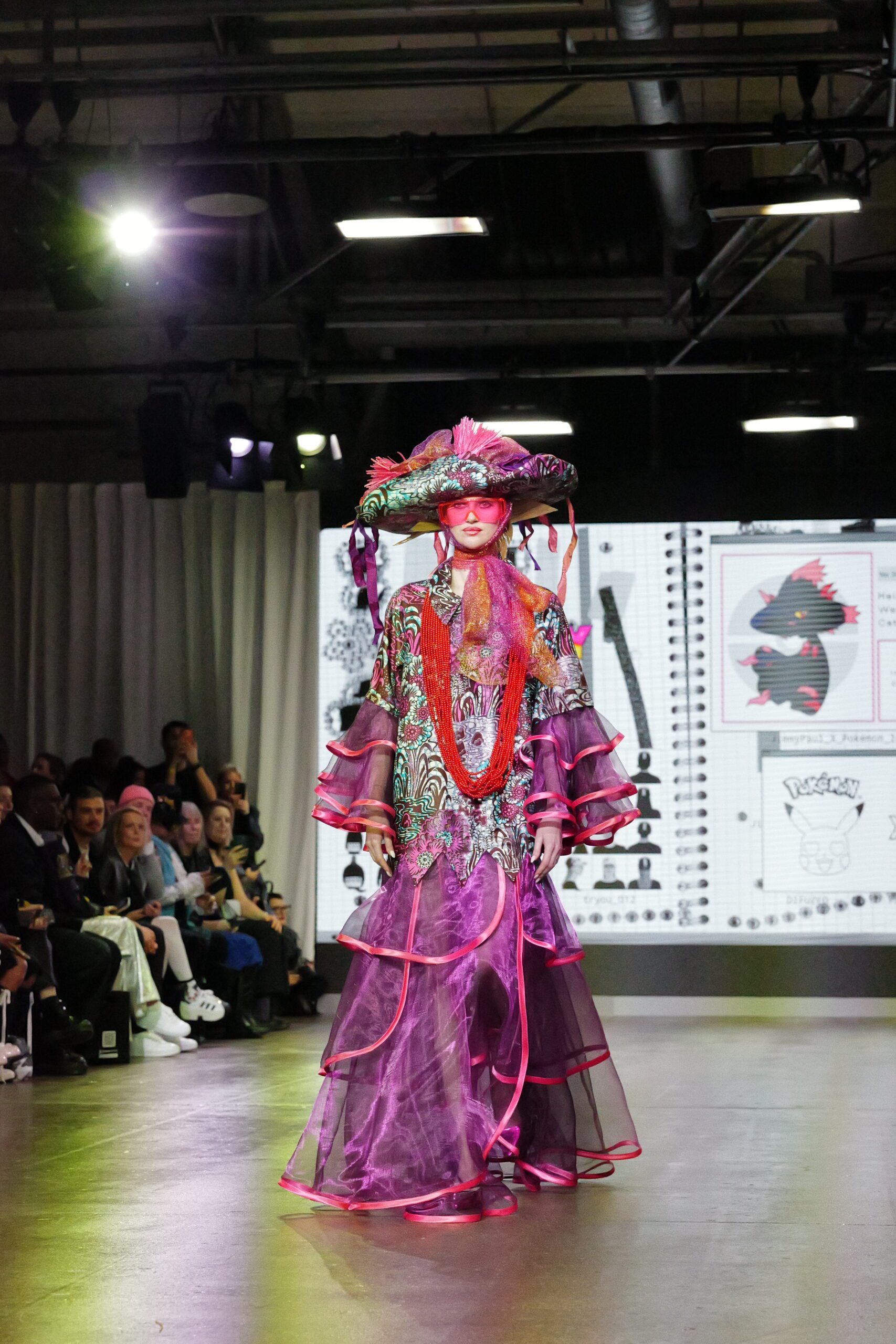 Sur le runway présenté lors de la London Fashion Week, organisée par la British Fashion Council, cela se voit dans des silhouettes qui fonctionnent comme des avatars. Un manteau arc‑en‑ciel de fausse fourrure, gonflé comme un nuage, pourrait être lu comme la matérialisation d’un compagnon de type Fée, à la fois bouclier et doudou. À l’inverse, une mini‑robe en sequins lips, associée à un chapeau peluche démesuré, convoque une énergie plus insolente, presque club kid : la joie d’oser être « trop », comme un Pokémon qui assume pleinement son caractère.