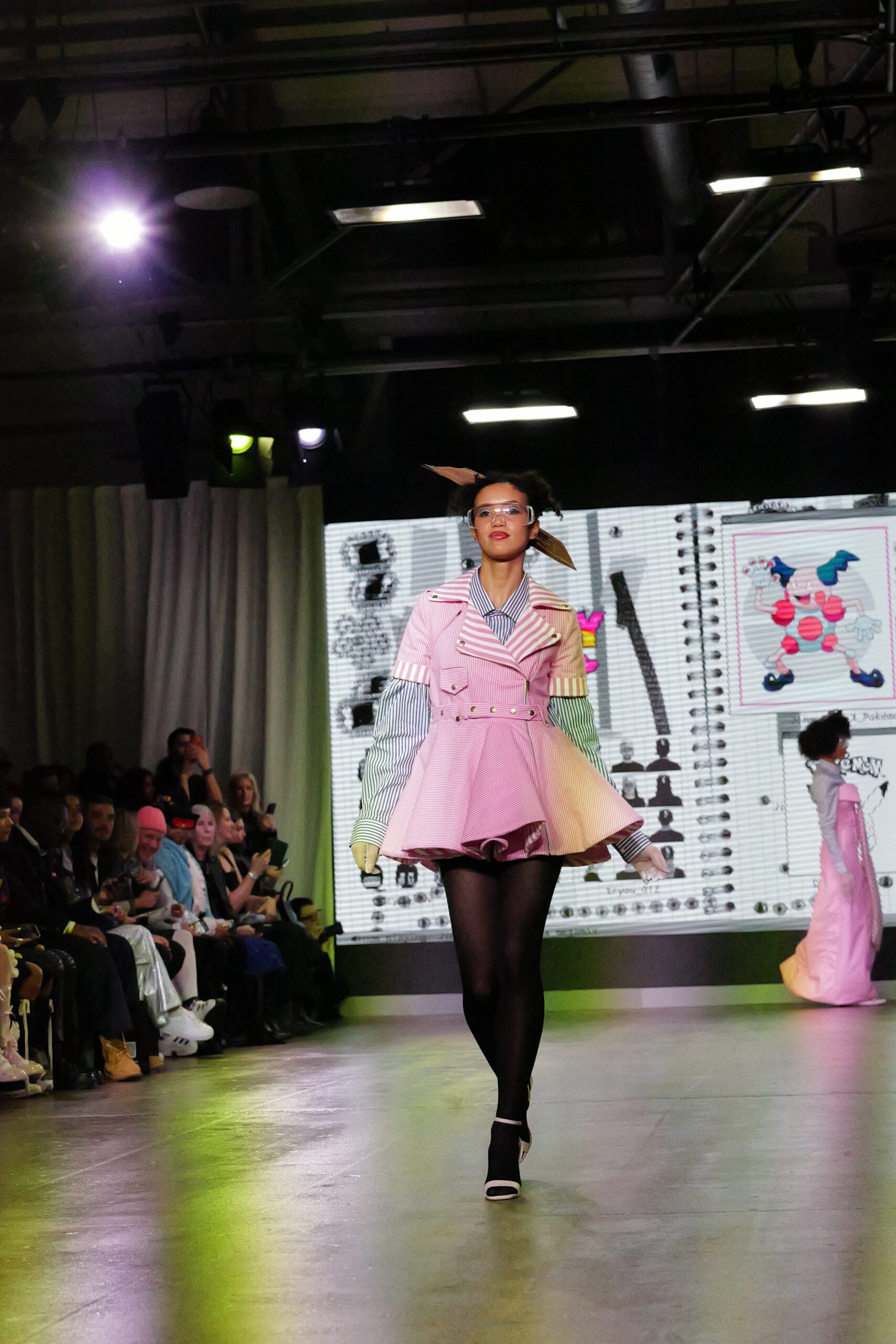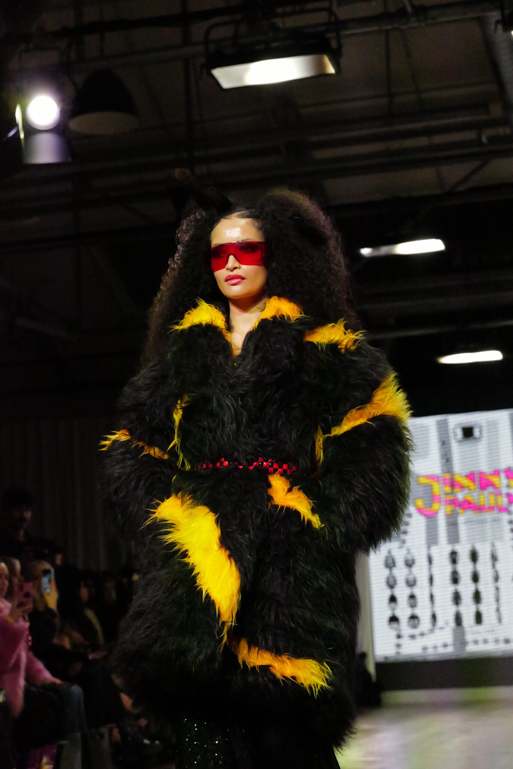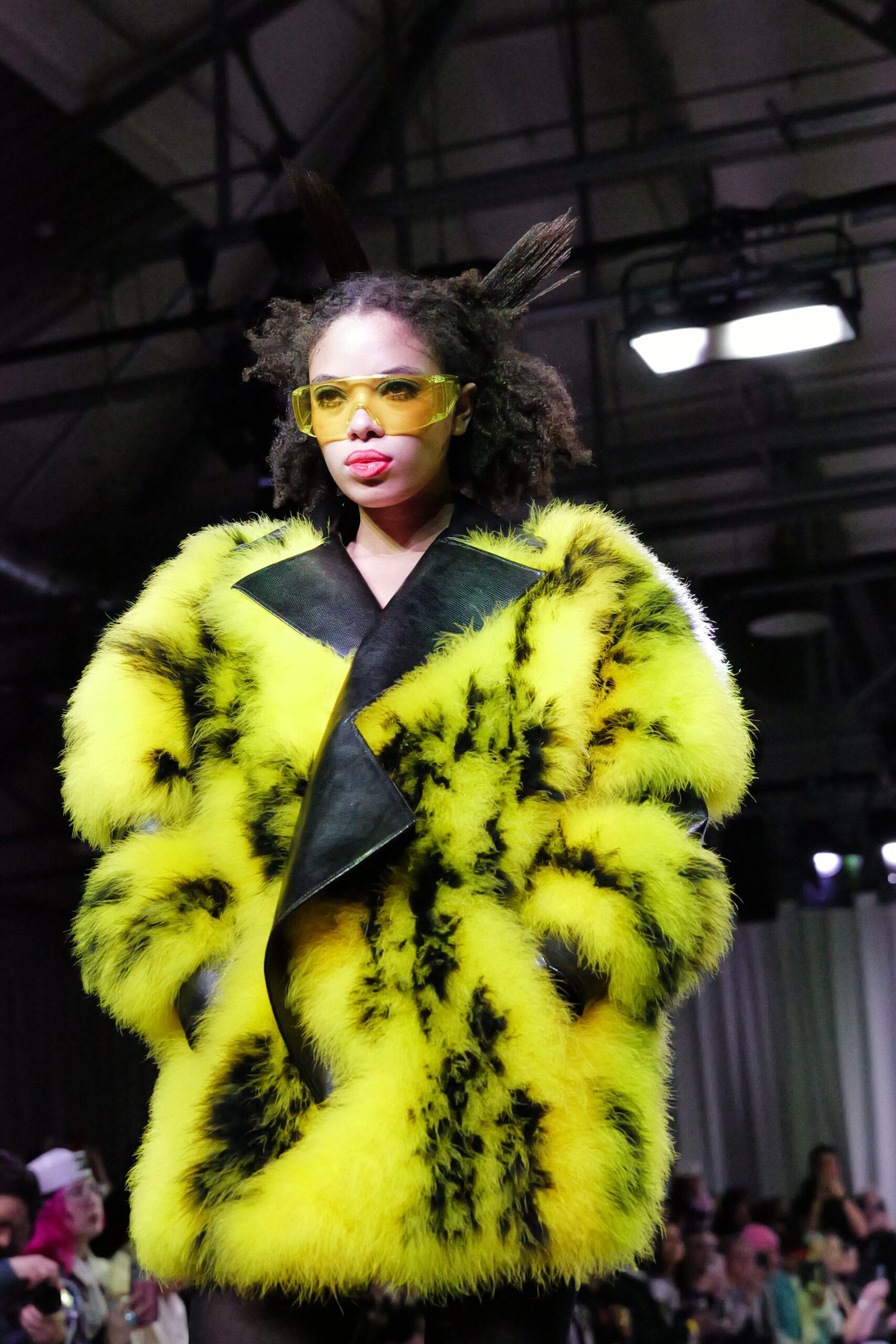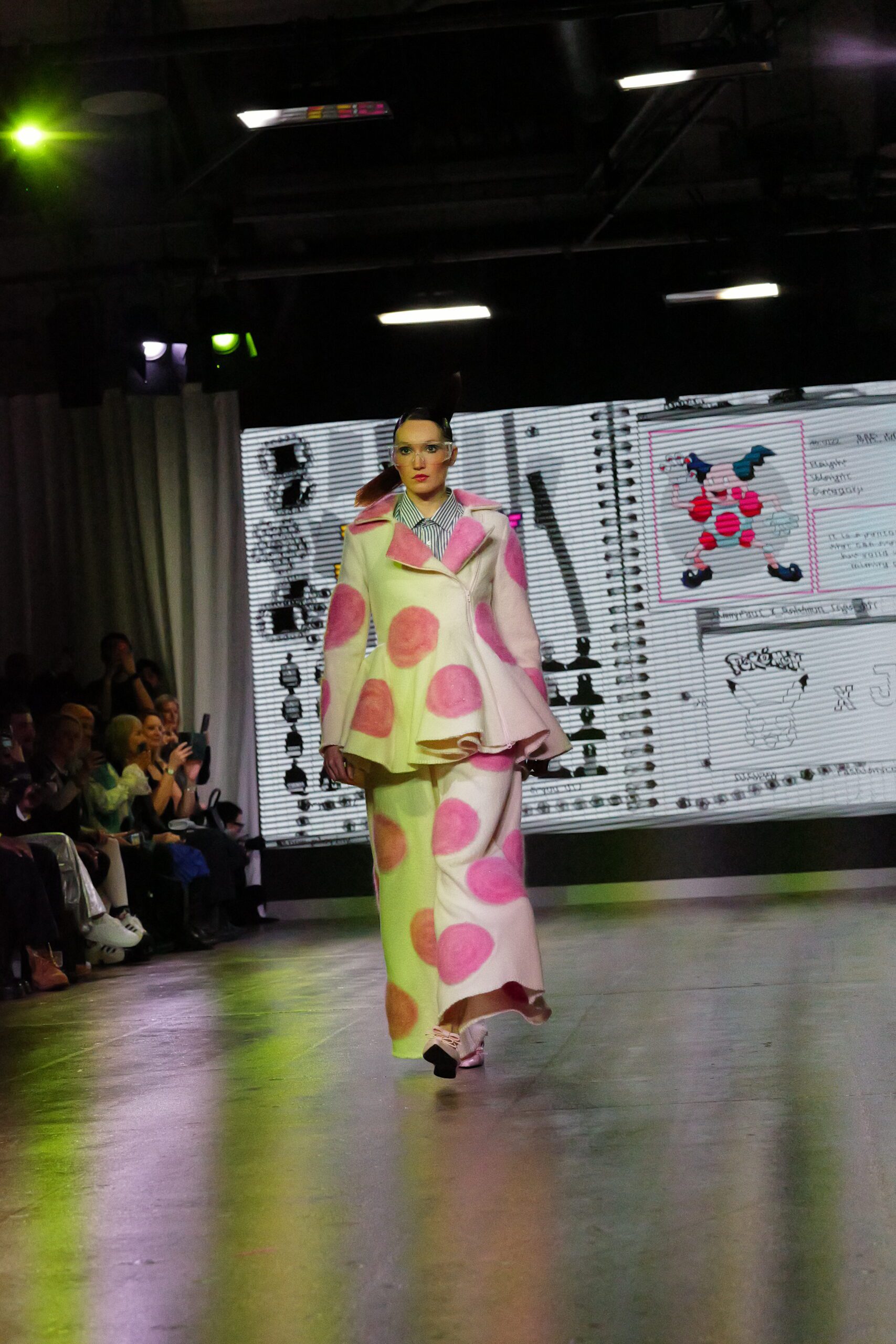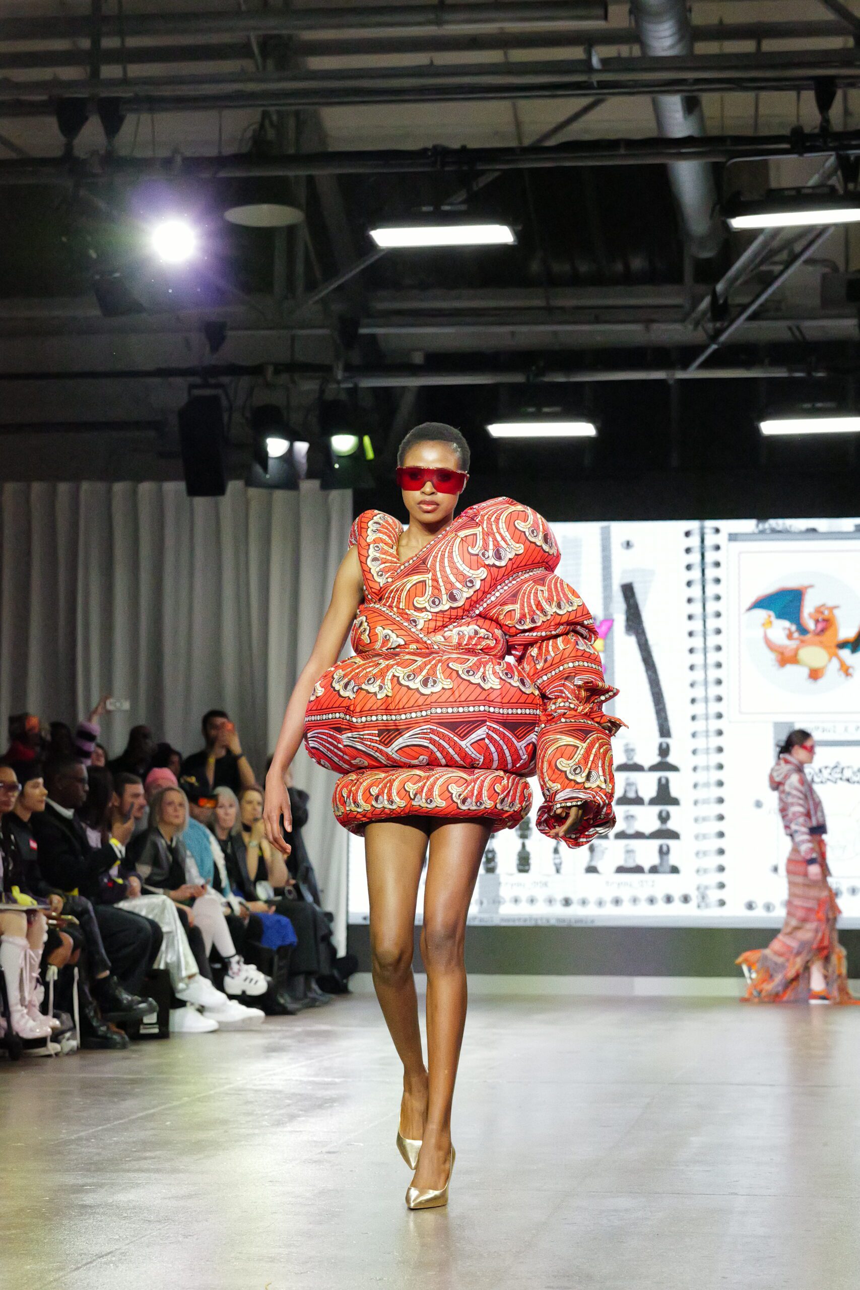 Sur le runway présenté lors de la London Fashion Week, organisée par la British Fashion Council, cela se voit dans des silhouettes qui fonctionnent comme des avatars. Un manteau arc‑en‑ciel de fausse fourrure, gonflé comme un nuage, pourrait être lu comme la matérialisation d’un compagnon de type Fée, à la fois bouclier et doudou. À l’inverse, une mini‑robe en sequins lips, associée à un chapeau peluche démesuré, convoque une énergie plus insolente, presque club kid : la joie d’oser être « trop », comme un Pokémon qui assume pleinement son caractère.