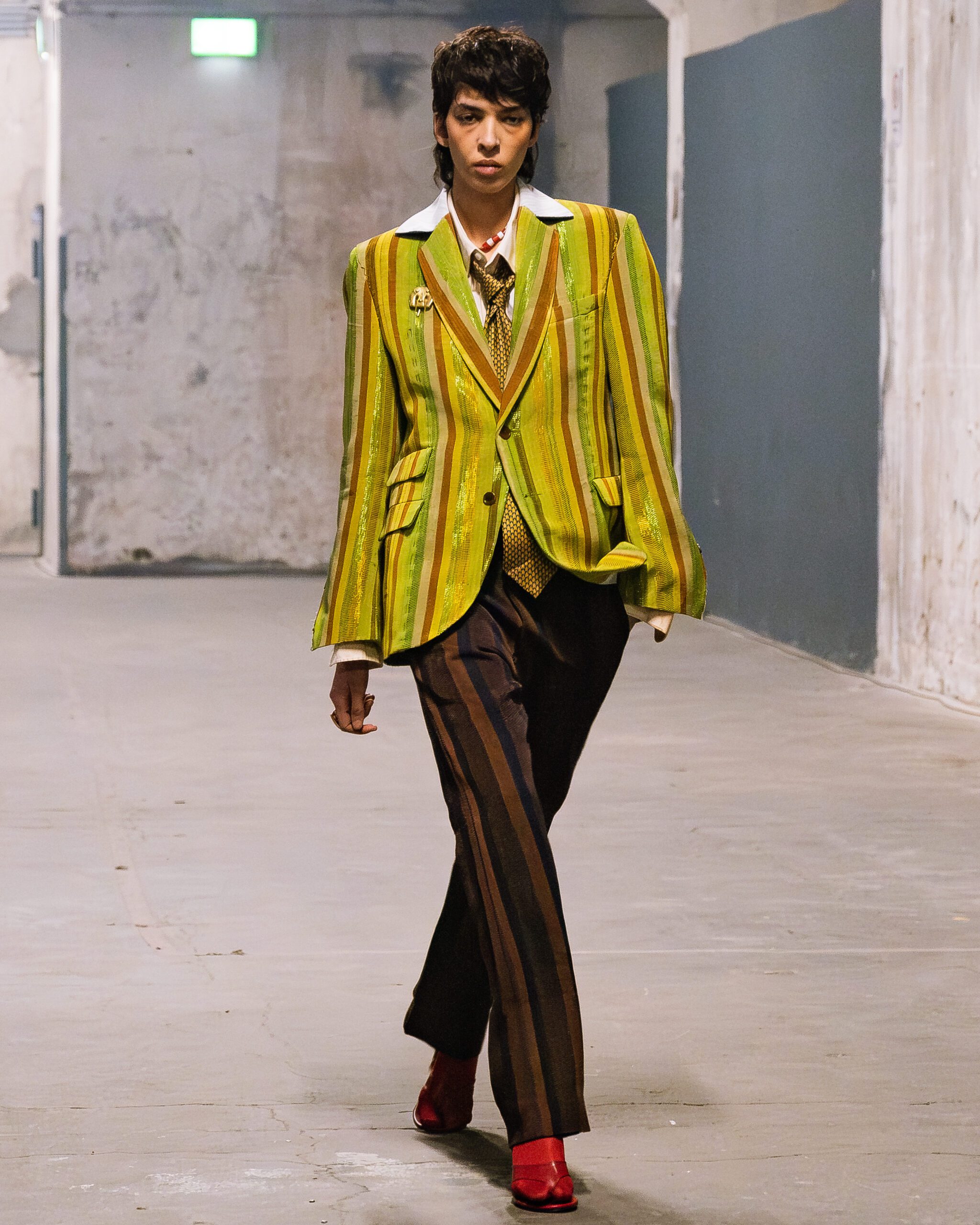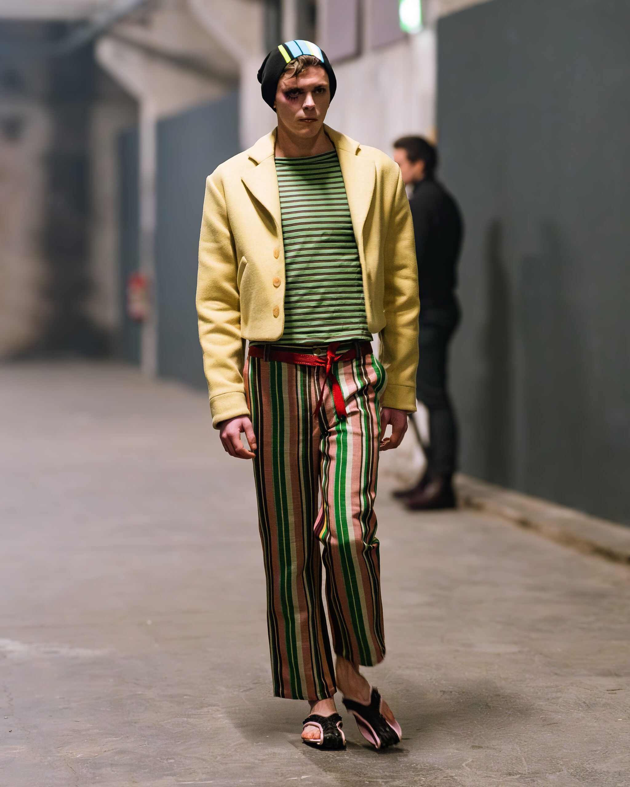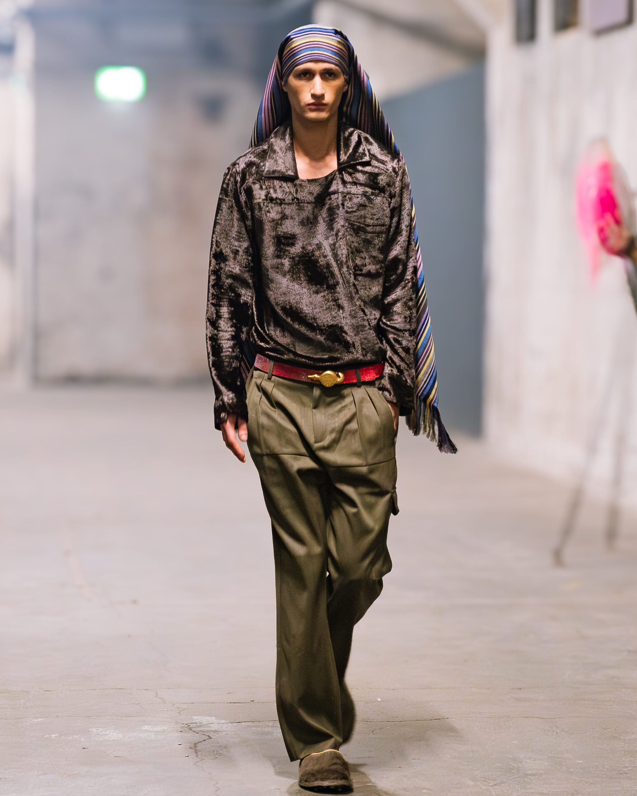JOY est aussi une façon de rencontrer Berlin autrement. « The models, you know, Berlin is such a great city in terms of music, culture, diversity, and at first I was like, okay, yeah, Berlin, how’s that going to happen? But then I started thinking about how the energy would be and it really worked really well. » On retrouve cette énergie dans le casting, dans les corps qui avancent sans raideur, dans cette tension entre contrôle et abandon. Il cite Anthony, Reference Studio, Intervention, le casting director Alpha. Derrière les noms, on comprend surtout une chose : cette collection est le résultat d’un cercle vivant, pas d’une tour isolée.