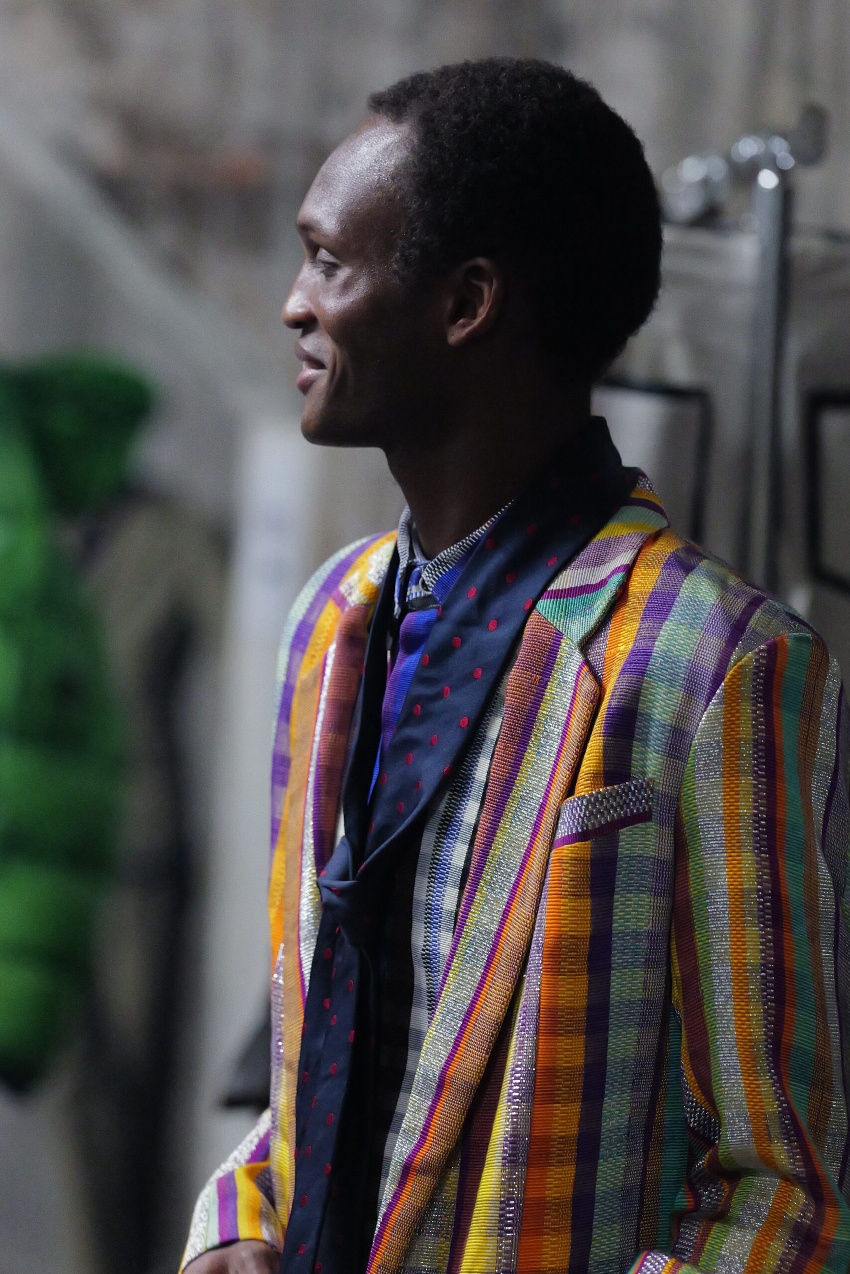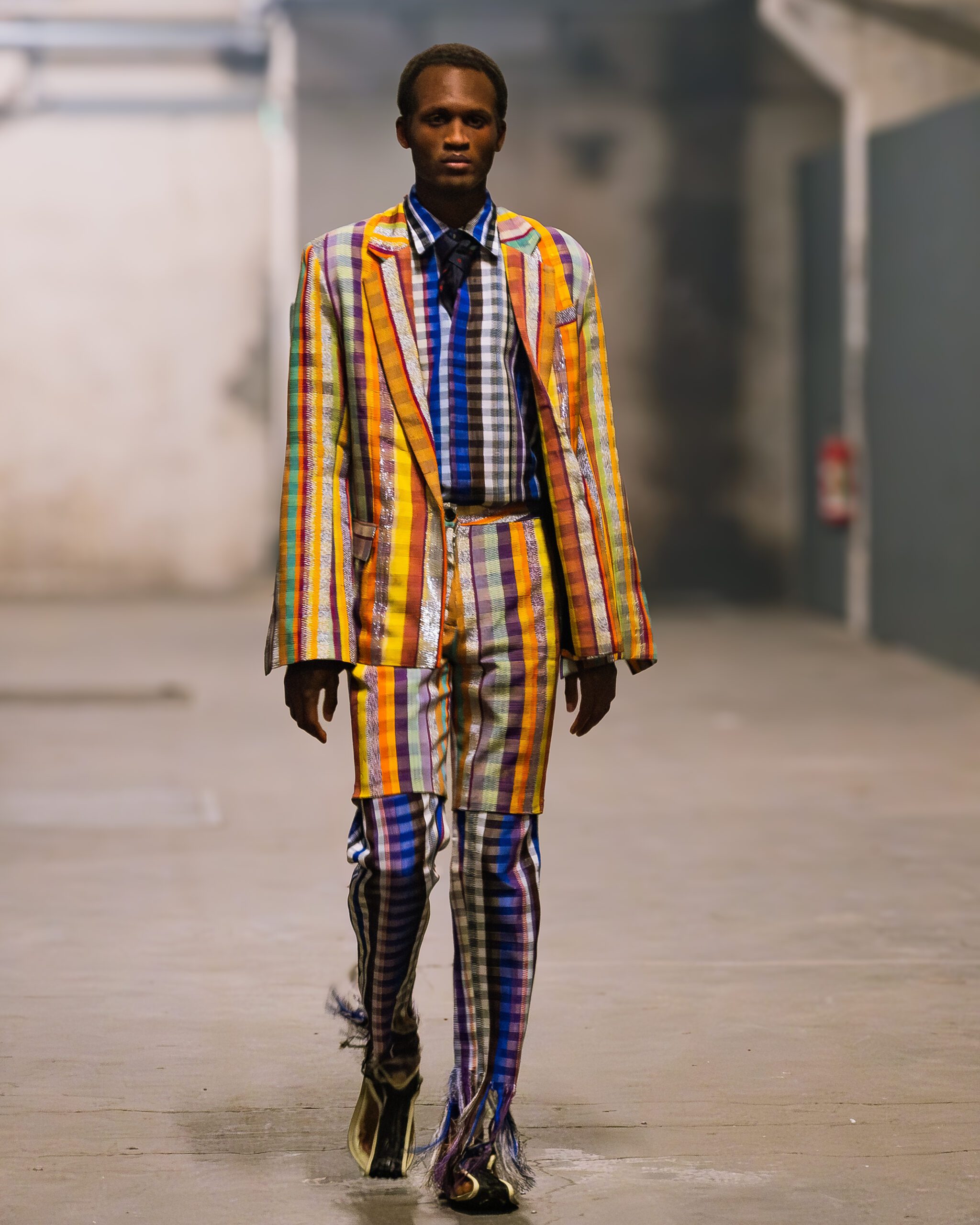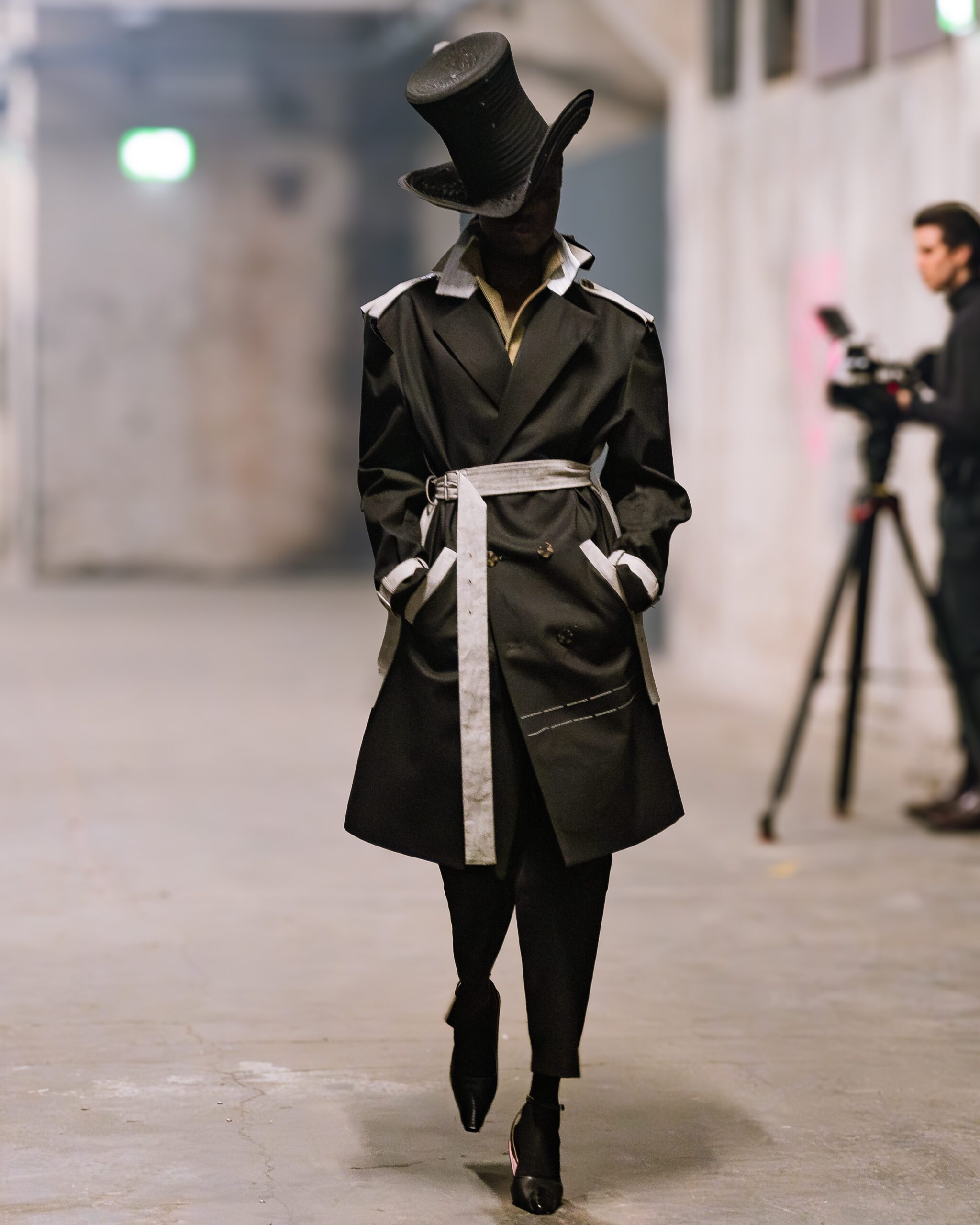 Les vêtements parlent avant les mots. Les coupes allongent le corps sans le figer, les trenchs s’ouvrent, se déplacent, laissent parfois entrevoir ce qui, d’ordinaire, reste à l’abri. Certains manteaux semblent raconter une histoire à l’avant, une autre à l’arrière. L’aso oke – ce tissage nigérian que Kenneth Ize revendique depuis ses débuts – croise la douceur de la laine, la rugosité du denim, le moelleux du velours. Rien n’est lisse : les matières se frôlent, se répondent, comme si chaque silhouette portait plusieurs humeurs à la fois.