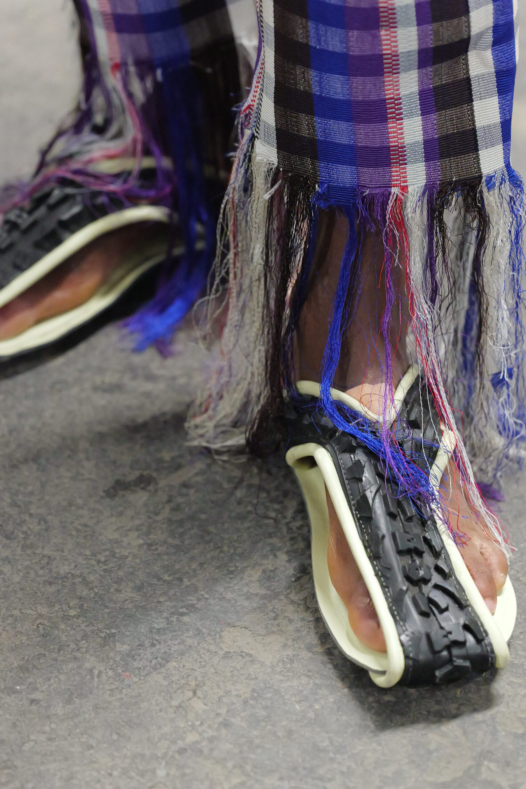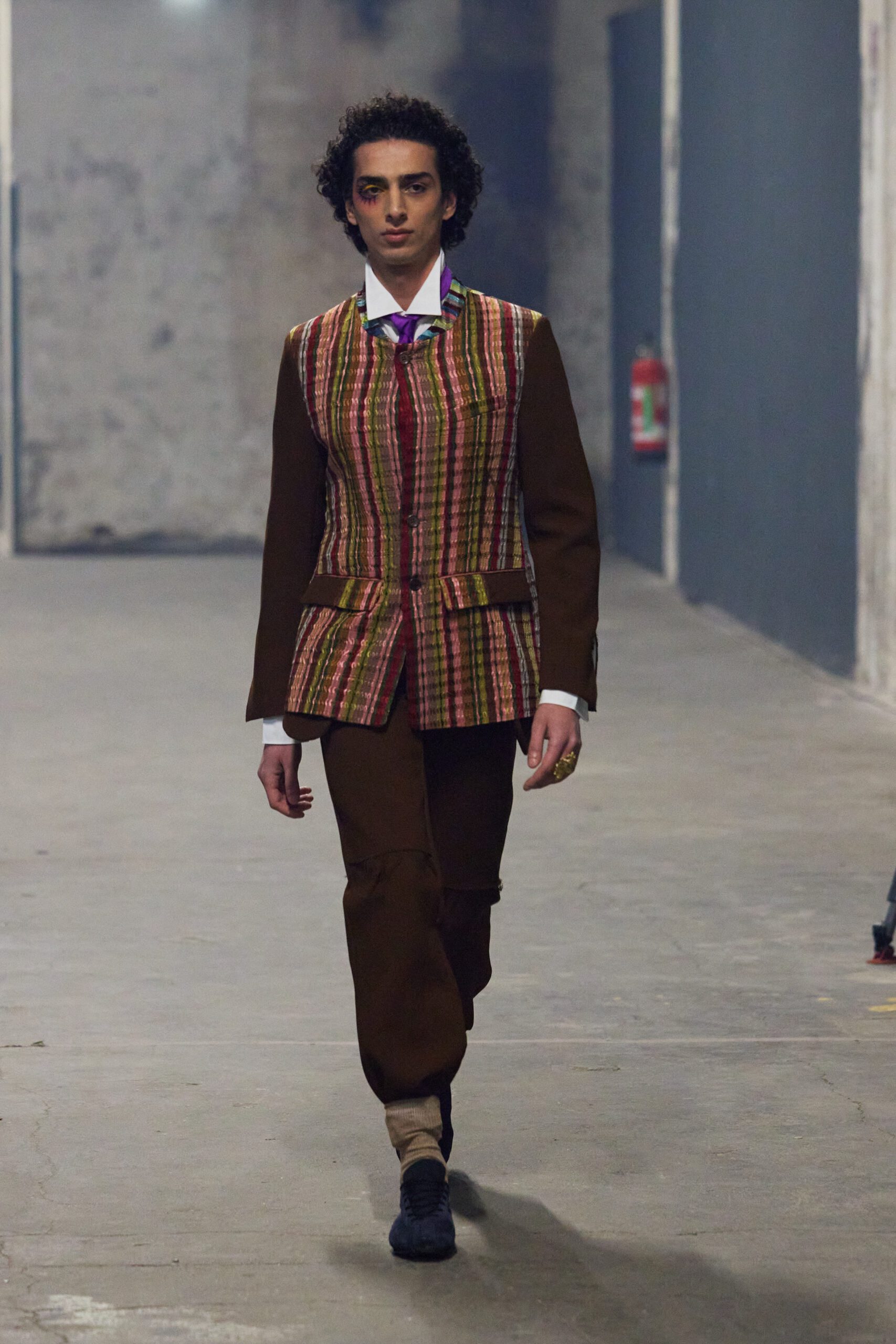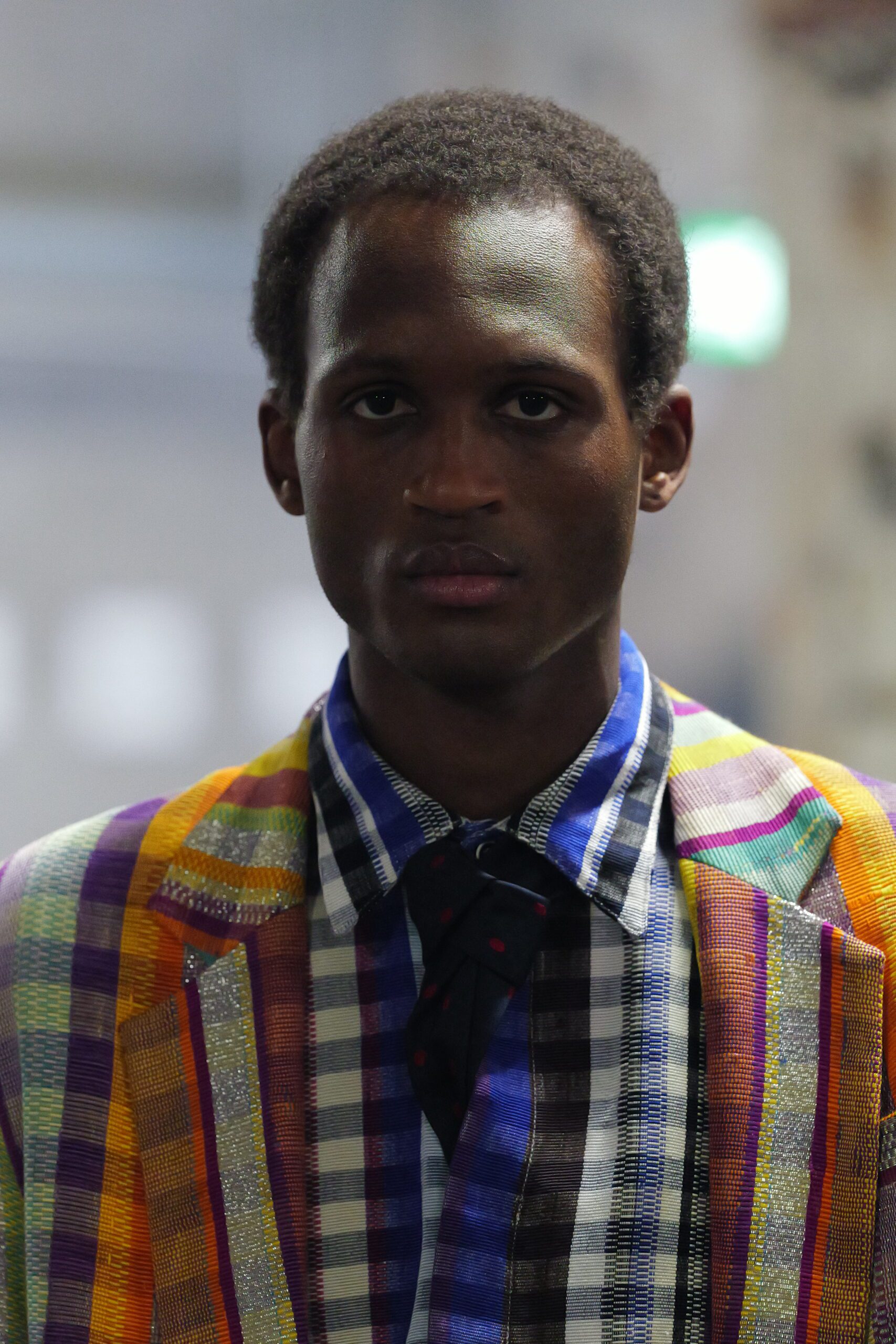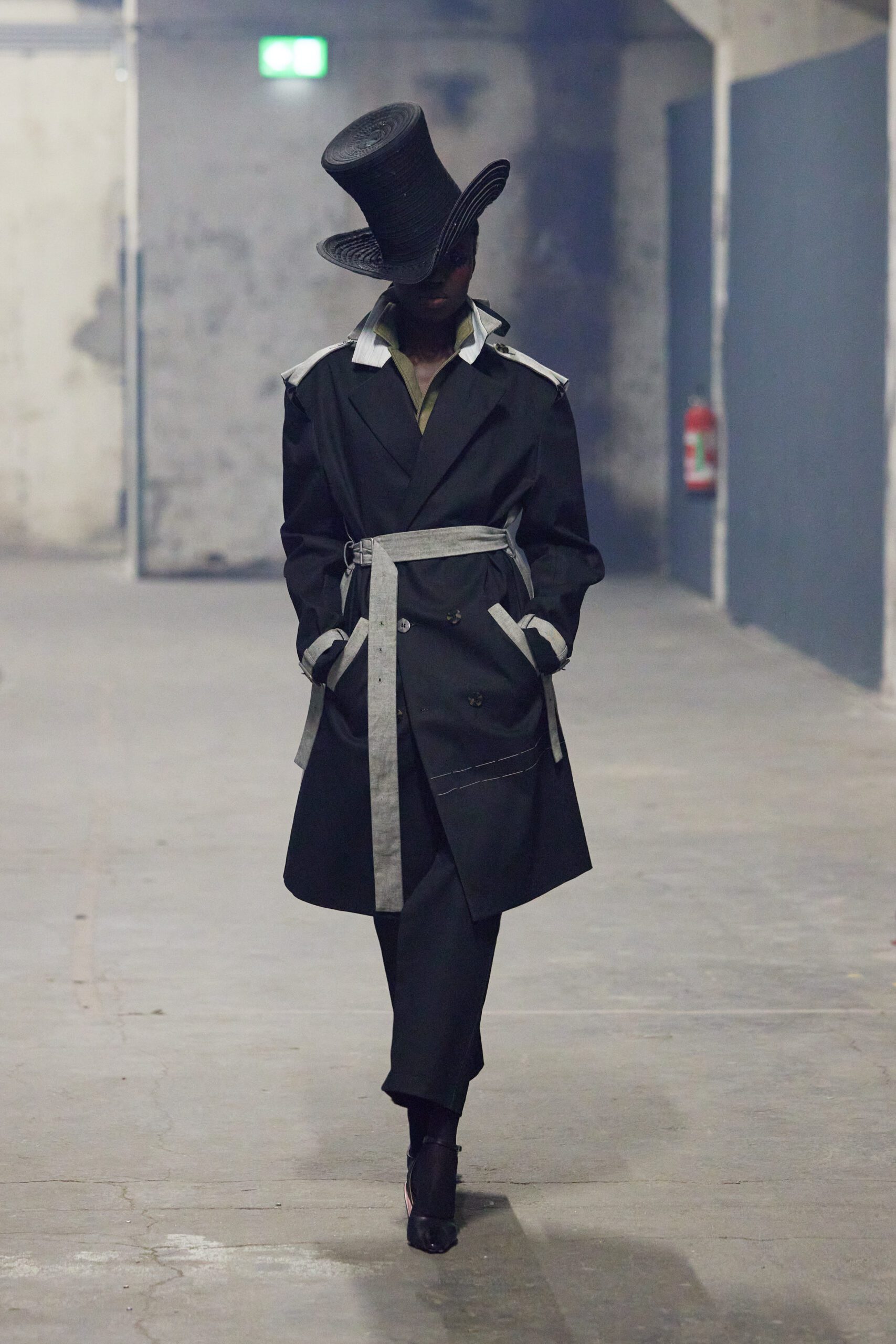 Les vêtements parlent avant les mots. Les coupes allongent le corps sans le figer, les trenchs s’ouvrent, se déplacent, laissent parfois entrevoir ce qui, d’ordinaire, reste à l’abri. Certains manteaux semblent raconter une histoire à l’avant, une autre à l’arrière. L’aso oke – ce tissage nigérian que Kenneth Ize revendique depuis ses débuts – croise la douceur de la laine, la rugosité du denim, le moelleux du velours. Rien n’est lisse : les matières se frôlent, se répondent, comme si chaque silhouette portait plusieurs humeurs à la fois.
