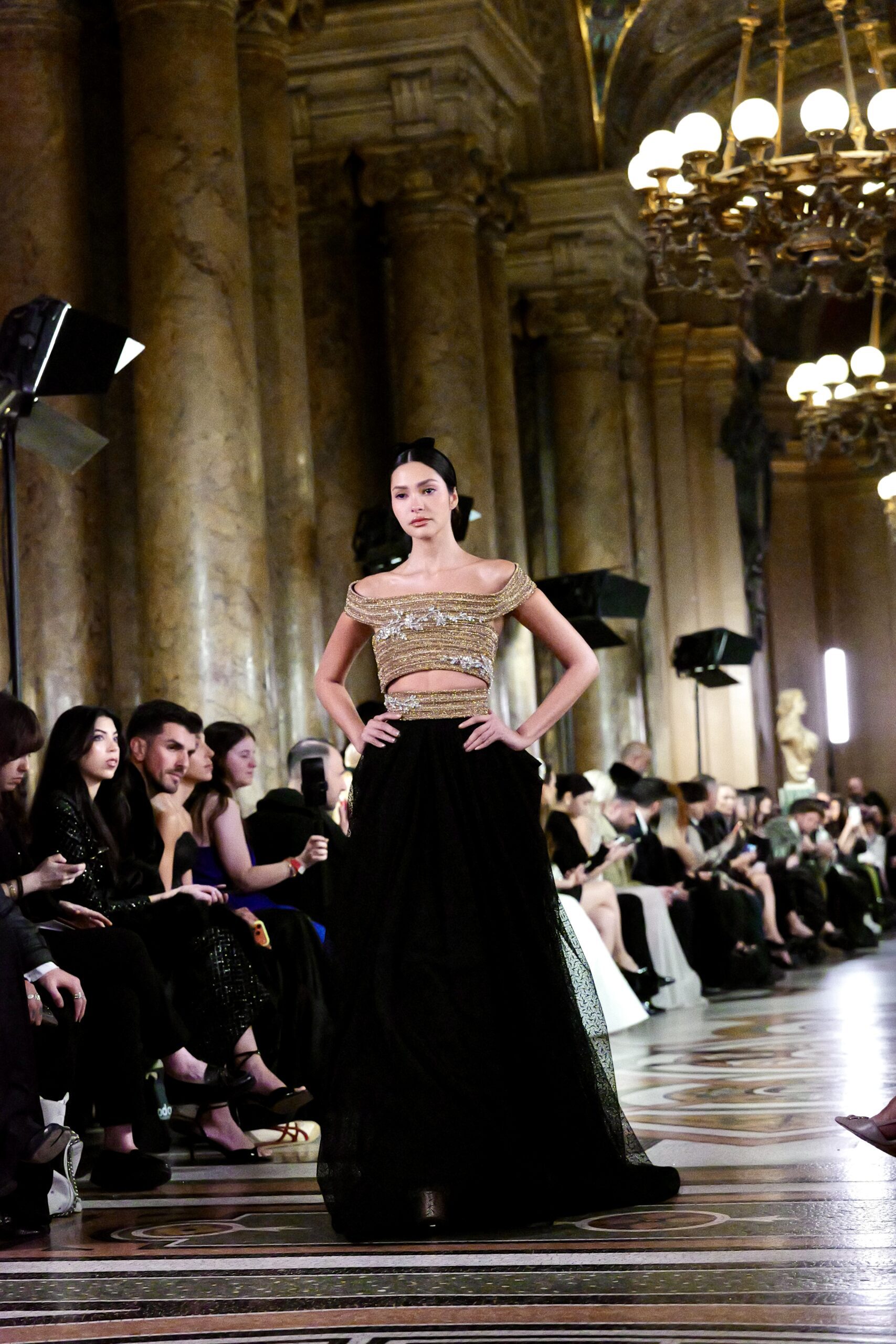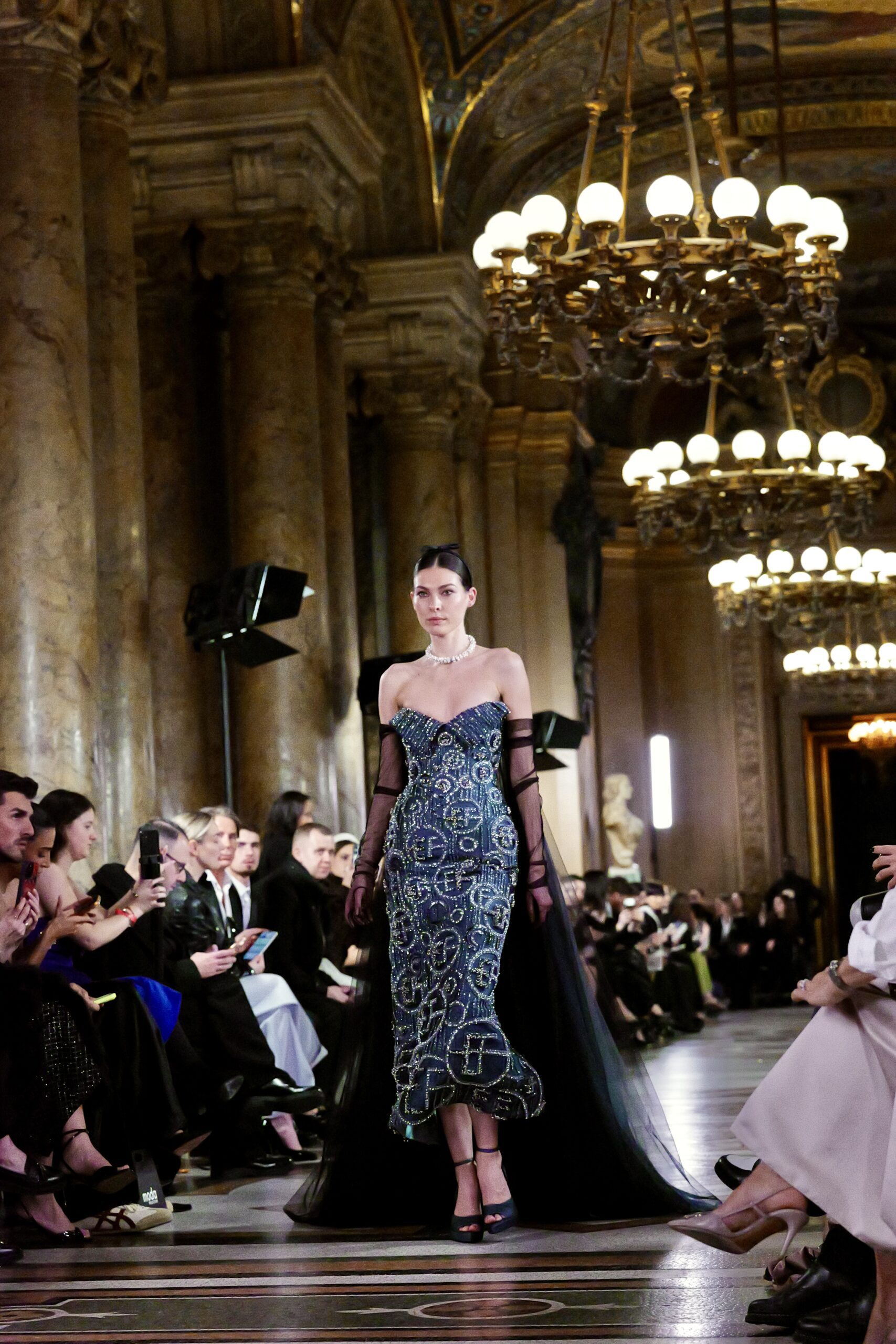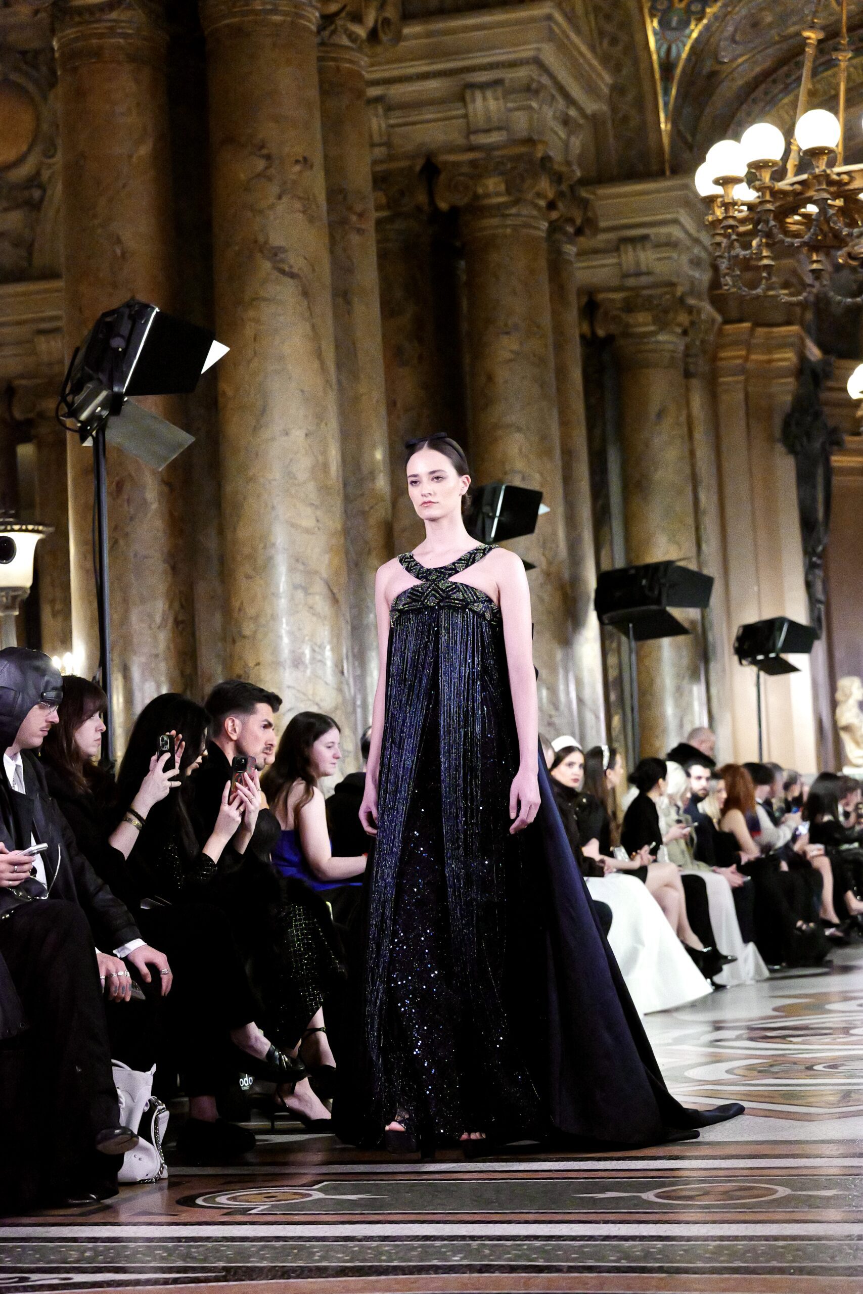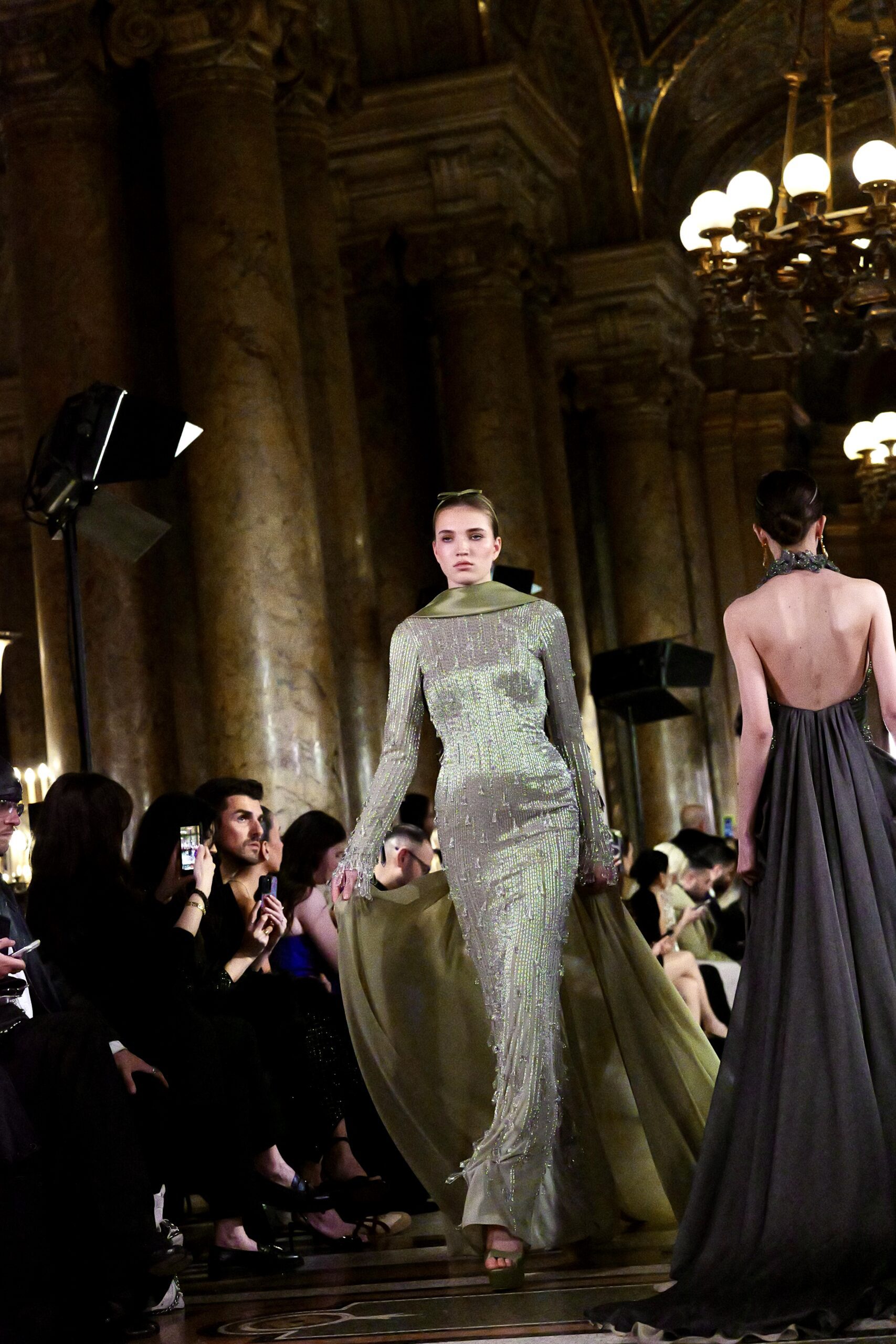 Feghali l’avoue avec une franchise désarmante : si le Garnier l’a attiré, c’est aussi parce que cette salle immense incarne une époque révolue qu’il veut ramener à la vie. « La haute couture telle qu’on la connaissait à l’ère de l’Opéra Garnier, cette couture d’exception, cette précision du geste elle a presque disparu. J’ai voulu en retrouver l’esprit, dans ce lieu chargé d’histoire, pour que nous puissions à nouveau comprendre ce qu’est vraiment la couture. » C’est là toute l’ambition de la collection : non pas copier le passé, mais lui rendre sa dignité dans le présent.