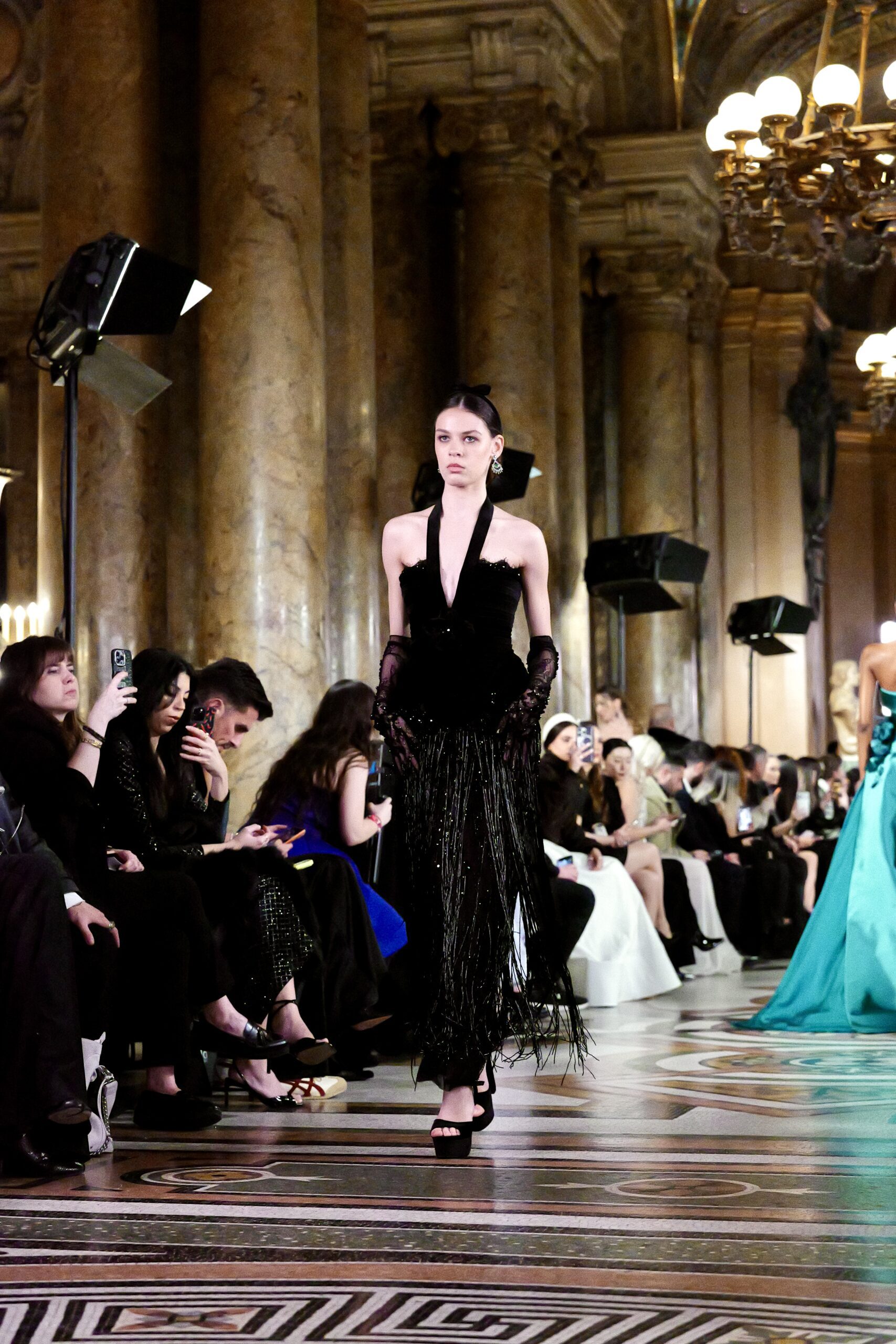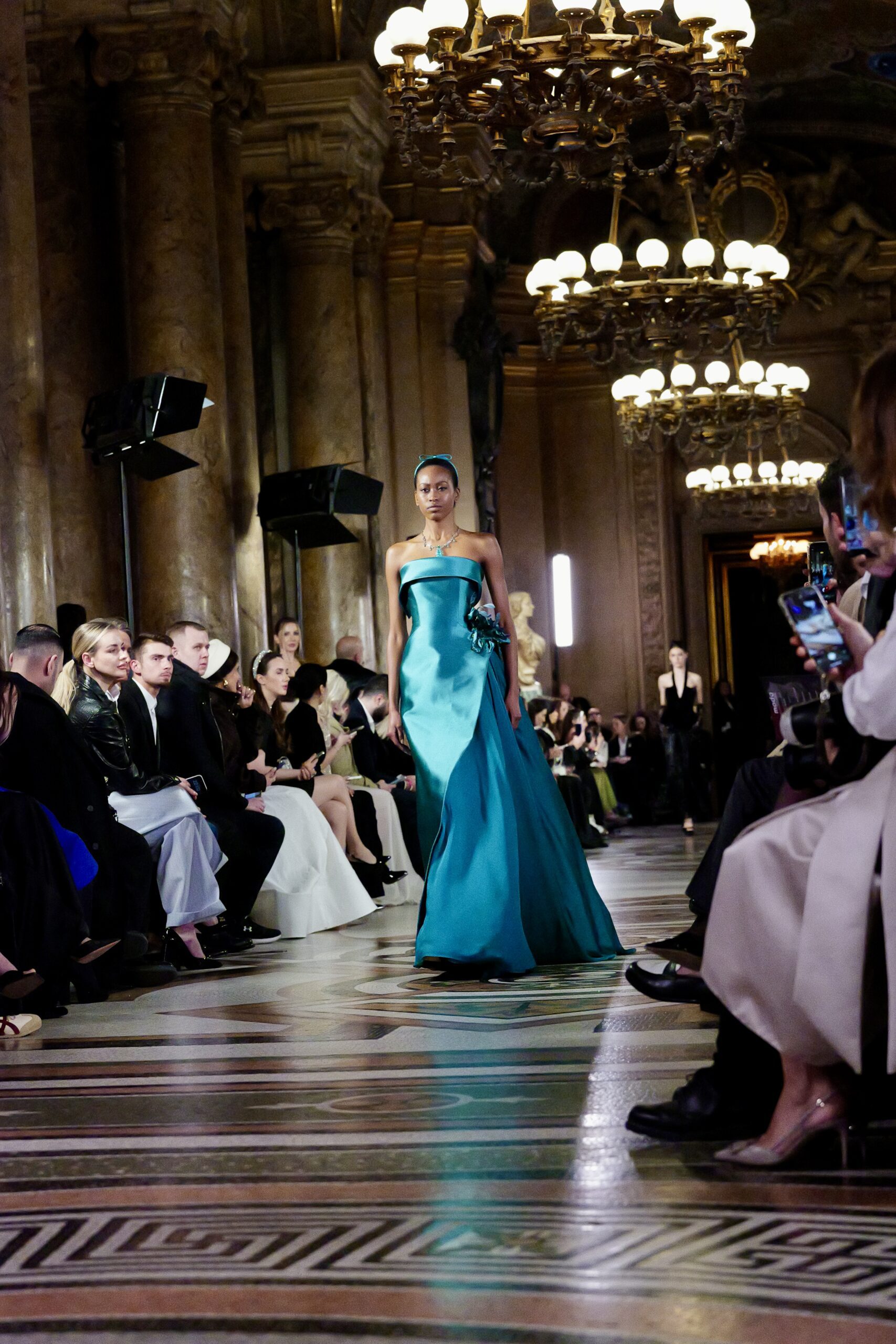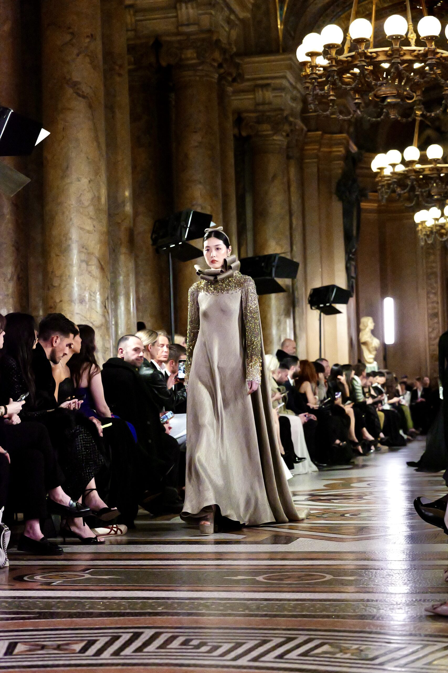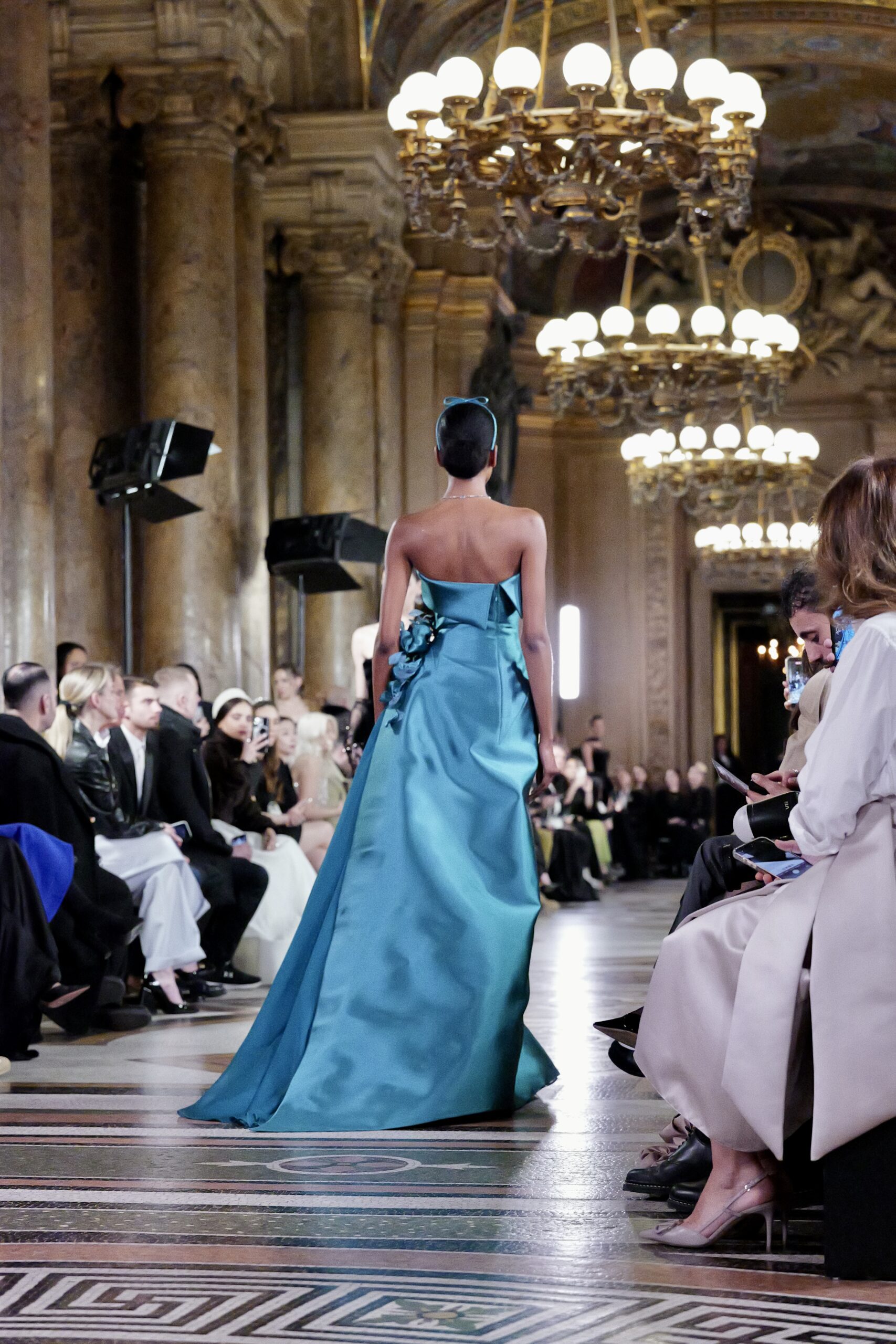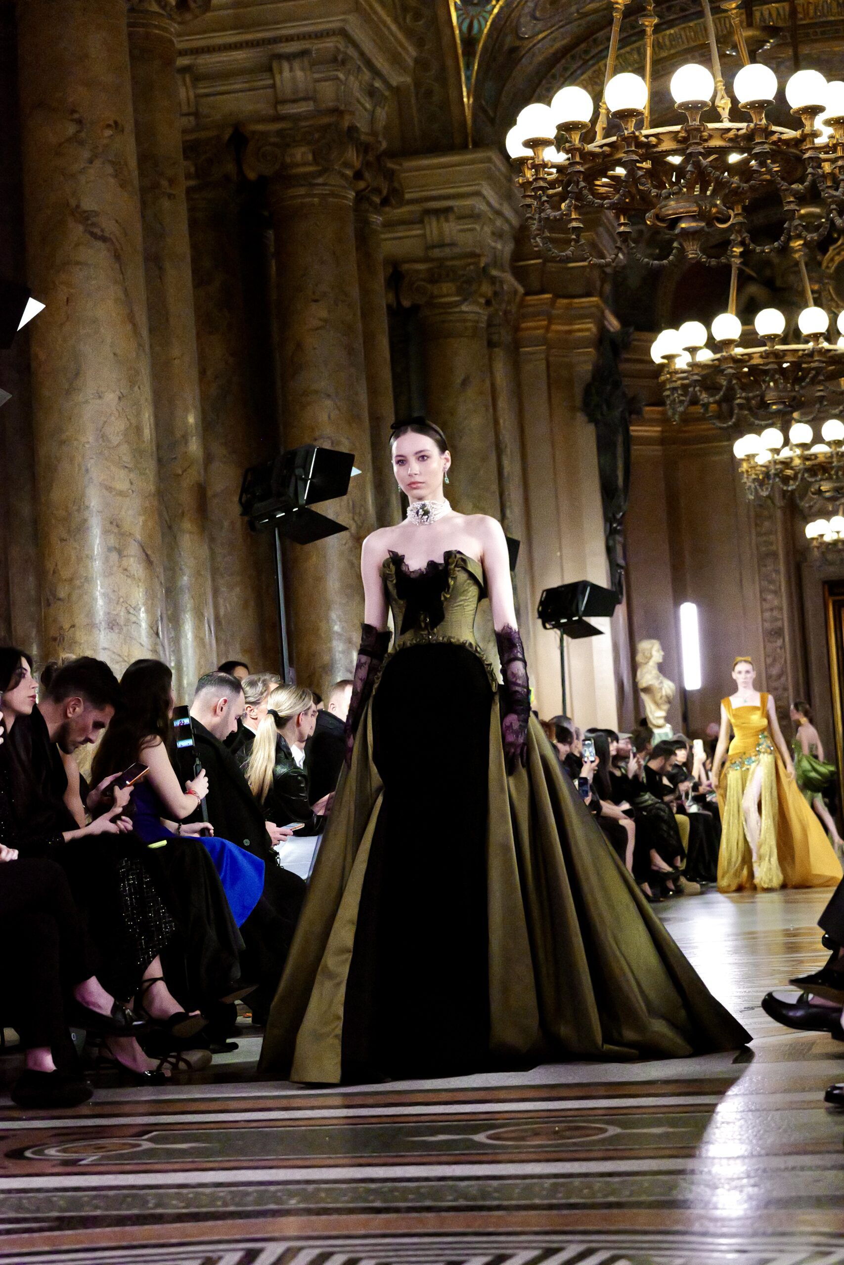 Feghali l’avoue avec une franchise désarmante : si le Garnier l’a attiré, c’est aussi parce que cette salle immense incarne une époque révolue qu’il veut ramener à la vie. « La haute couture telle qu’on la connaissait à l’ère de l’Opéra Garnier, cette couture d’exception, cette précision du geste elle a presque disparu. J’ai voulu en retrouver l’esprit, dans ce lieu chargé d’histoire, pour que nous puissions à nouveau comprendre ce qu’est vraiment la couture. » C’est là toute l’ambition de la collection : non pas copier le passé, mais lui rendre sa dignité dans le présent.