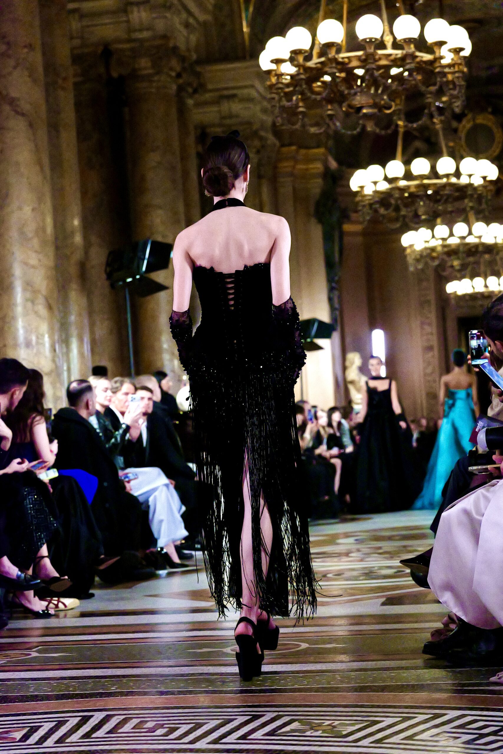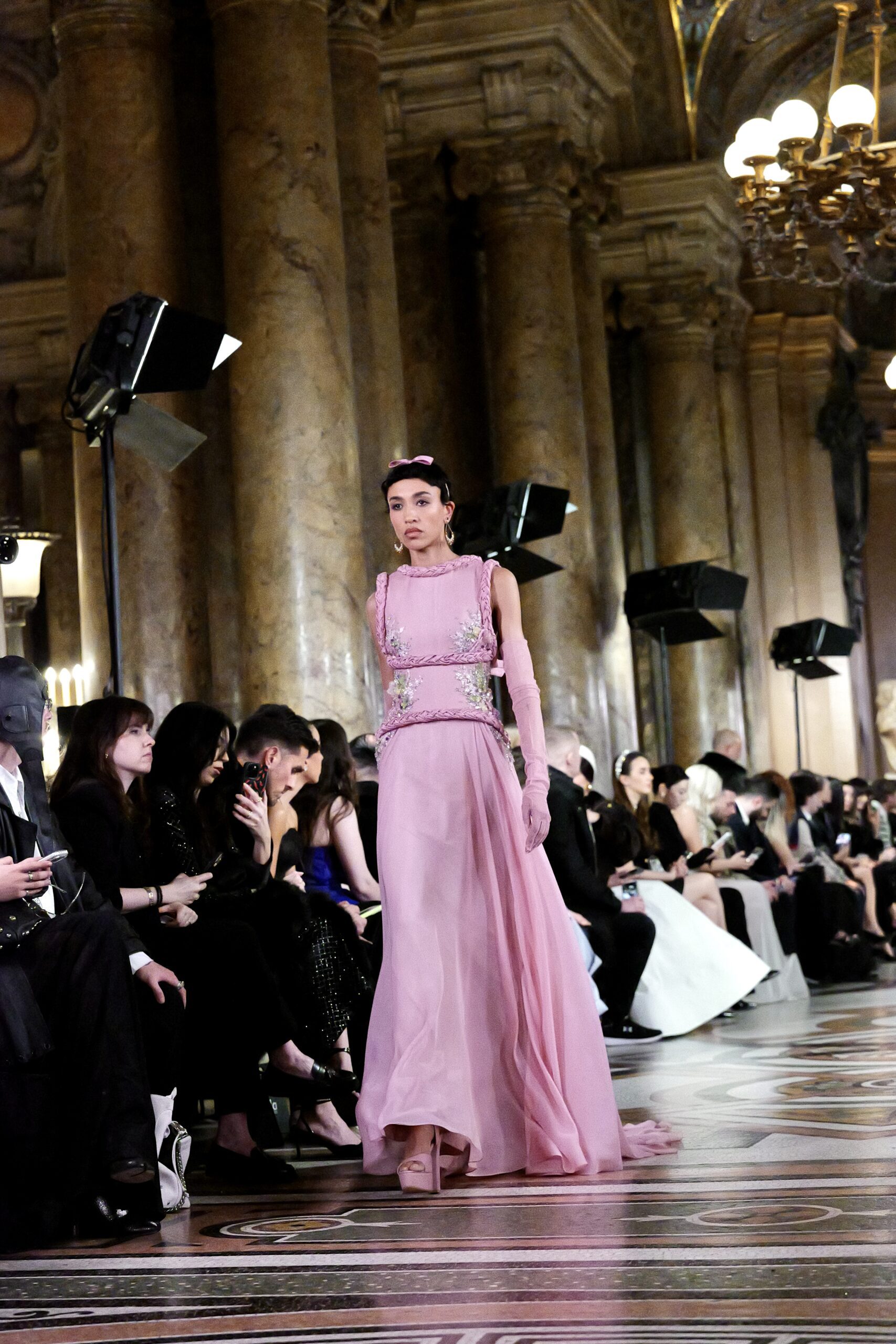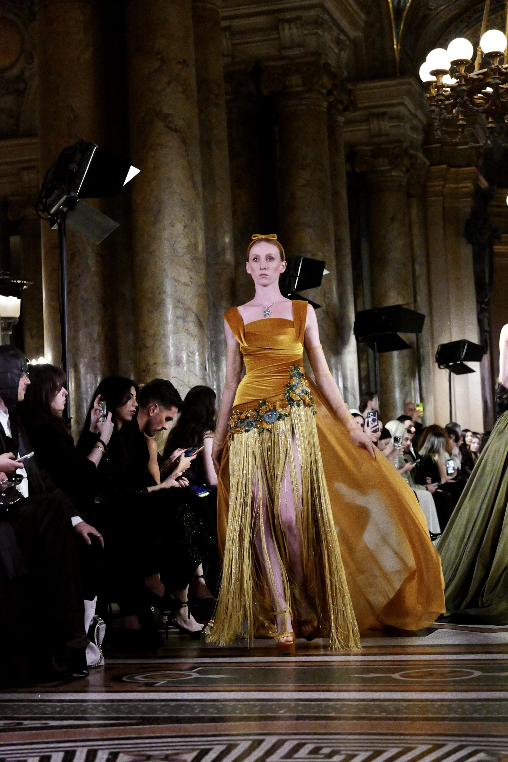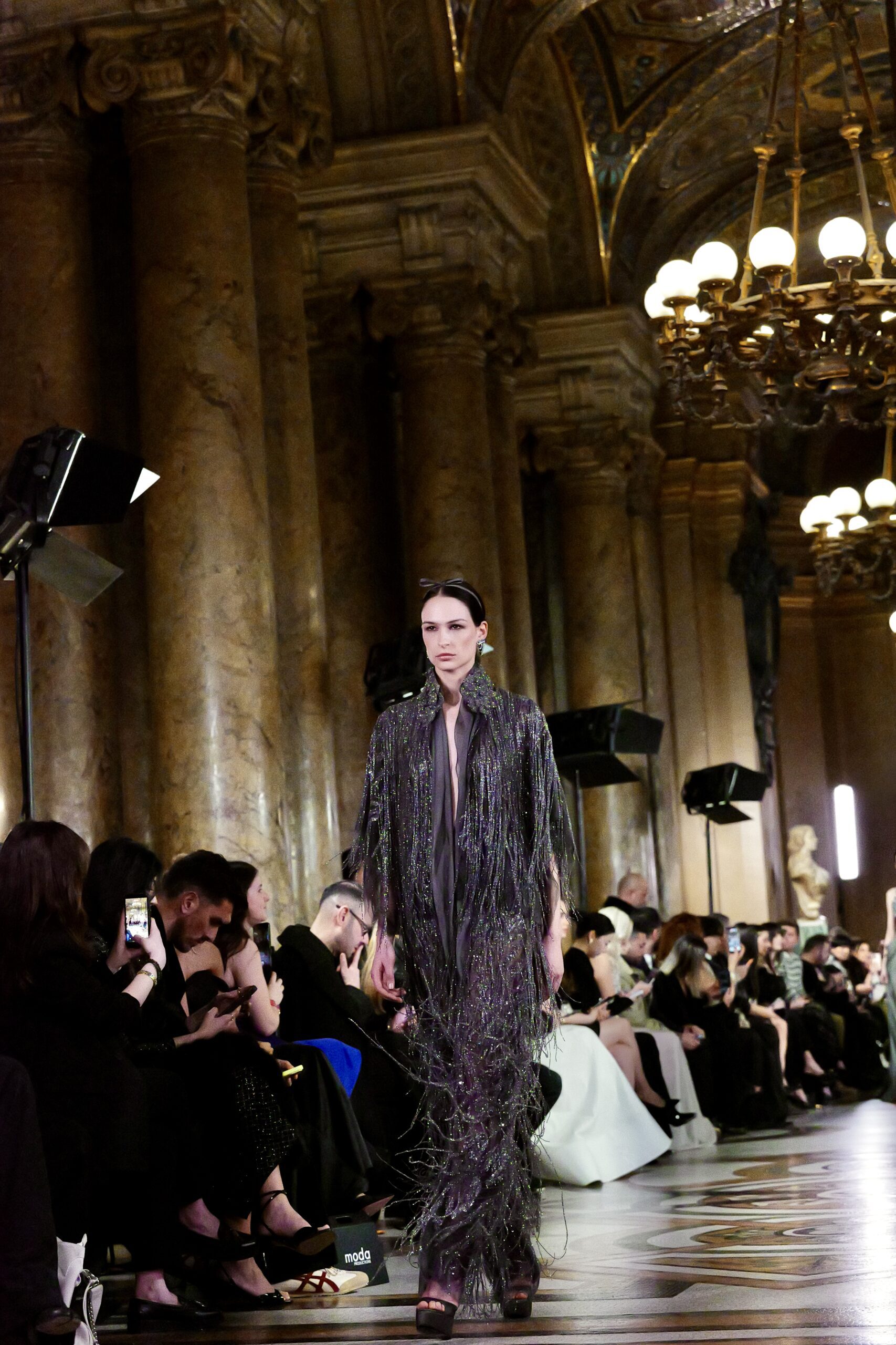 Feghali l’avoue avec une franchise désarmante : si le Garnier l’a attiré, c’est aussi parce que cette salle immense incarne une époque révolue qu’il veut ramener à la vie. « La haute couture telle qu’on la connaissait à l’ère de l’Opéra Garnier, cette couture d’exception, cette précision du geste elle a presque disparu. J’ai voulu en retrouver l’esprit, dans ce lieu chargé d’histoire, pour que nous puissions à nouveau comprendre ce qu’est vraiment la couture. » C’est là toute l’ambition de la collection : non pas copier le passé, mais lui rendre sa dignité dans le présent.