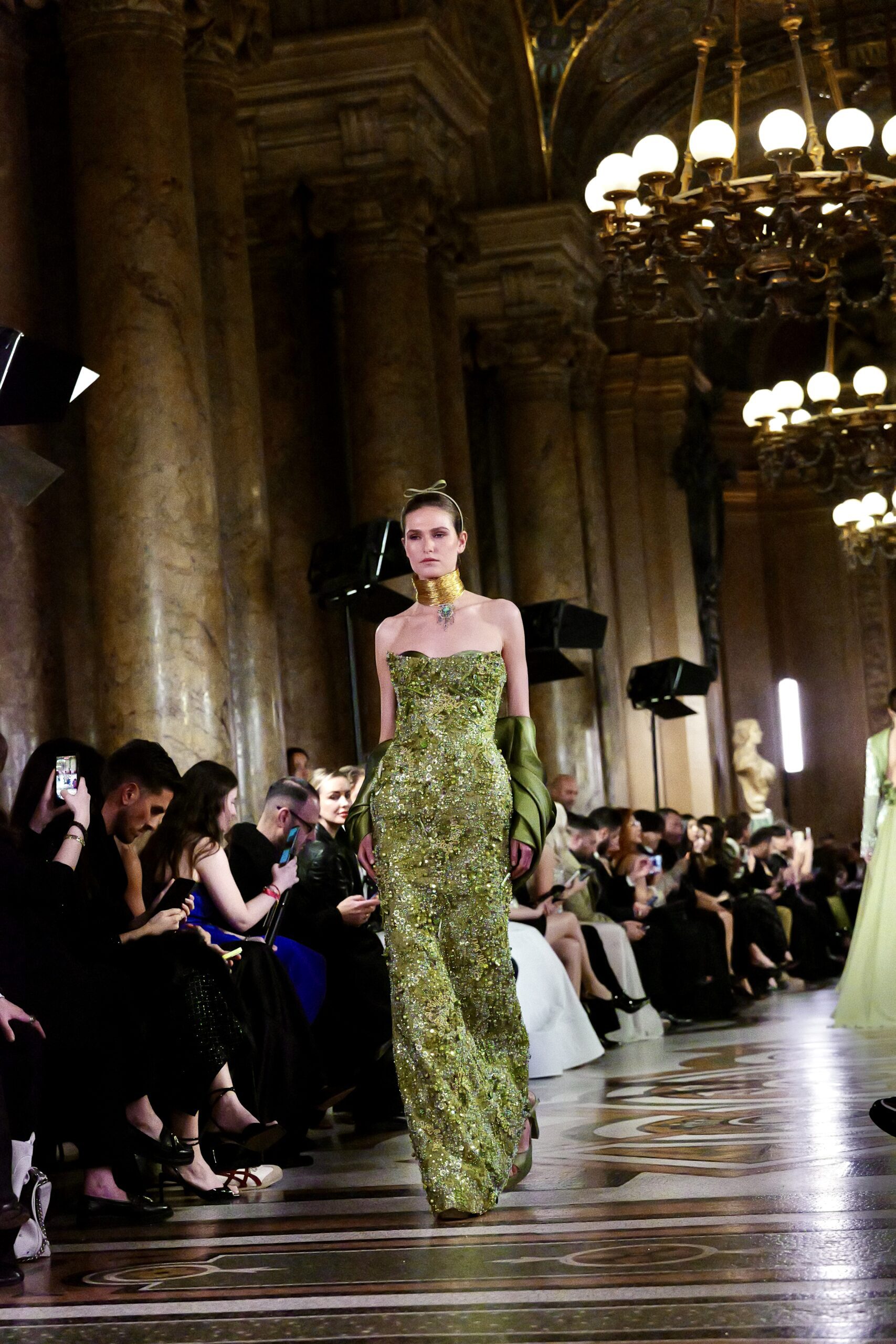 La palette de « La Grâce » est celle de l’âme autant que de l’œil. Le vert végétal, presque minéral, d’une robe fourreau entièrement brodée de cristaux et de sequins un travail d’orfèvrerie qui transforme la surface du tissu en peau lumineuse s’impose comme l’un des moments forts du défilé. Autour du cou, un col doré architectural rappelle que chez Feghali, le bijou est une pièce à part entière, jamais un accessoire secondaire. La teinte « dakhané » — ce gris fumé, couleur de cendre noble revient comme un fil conducteur dans plusieurs silhouettes, conférant à la collection une unité contemplative.