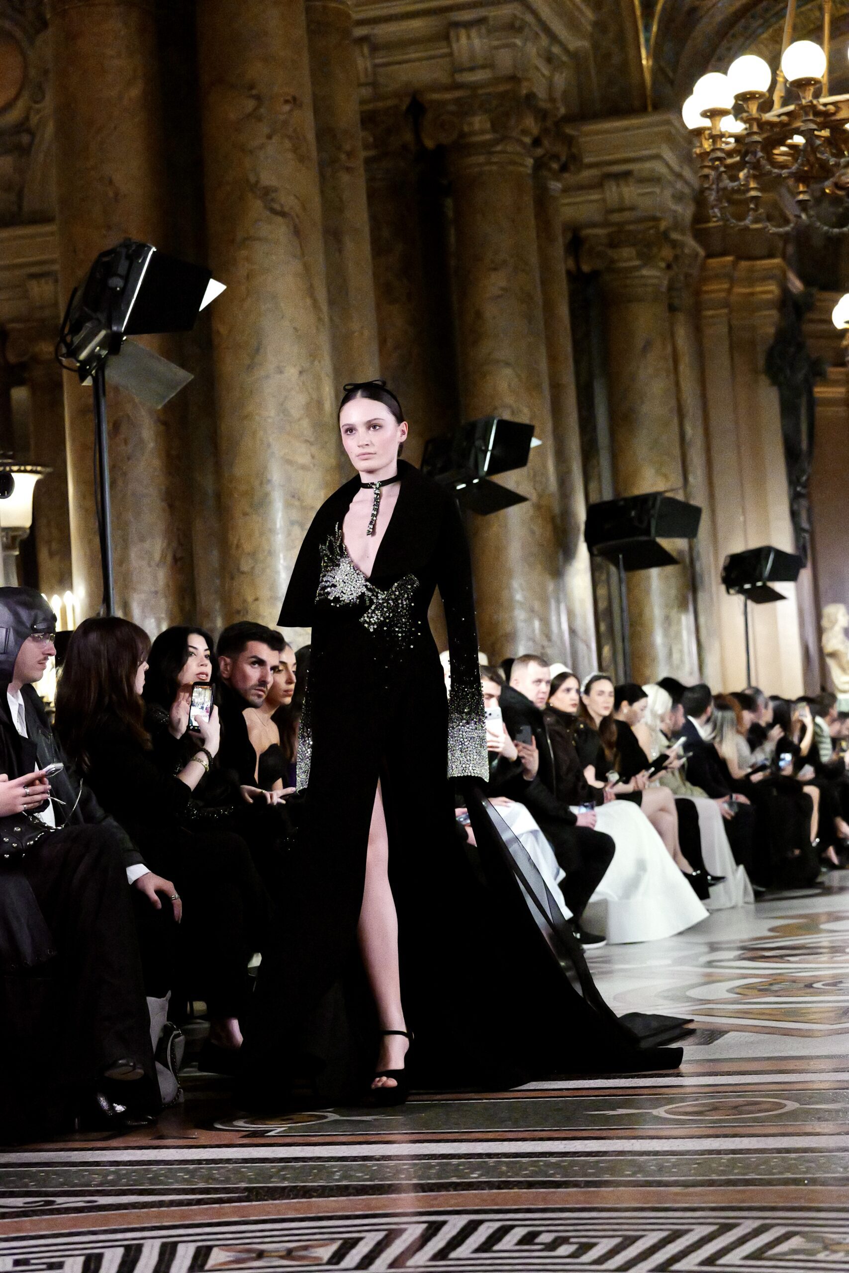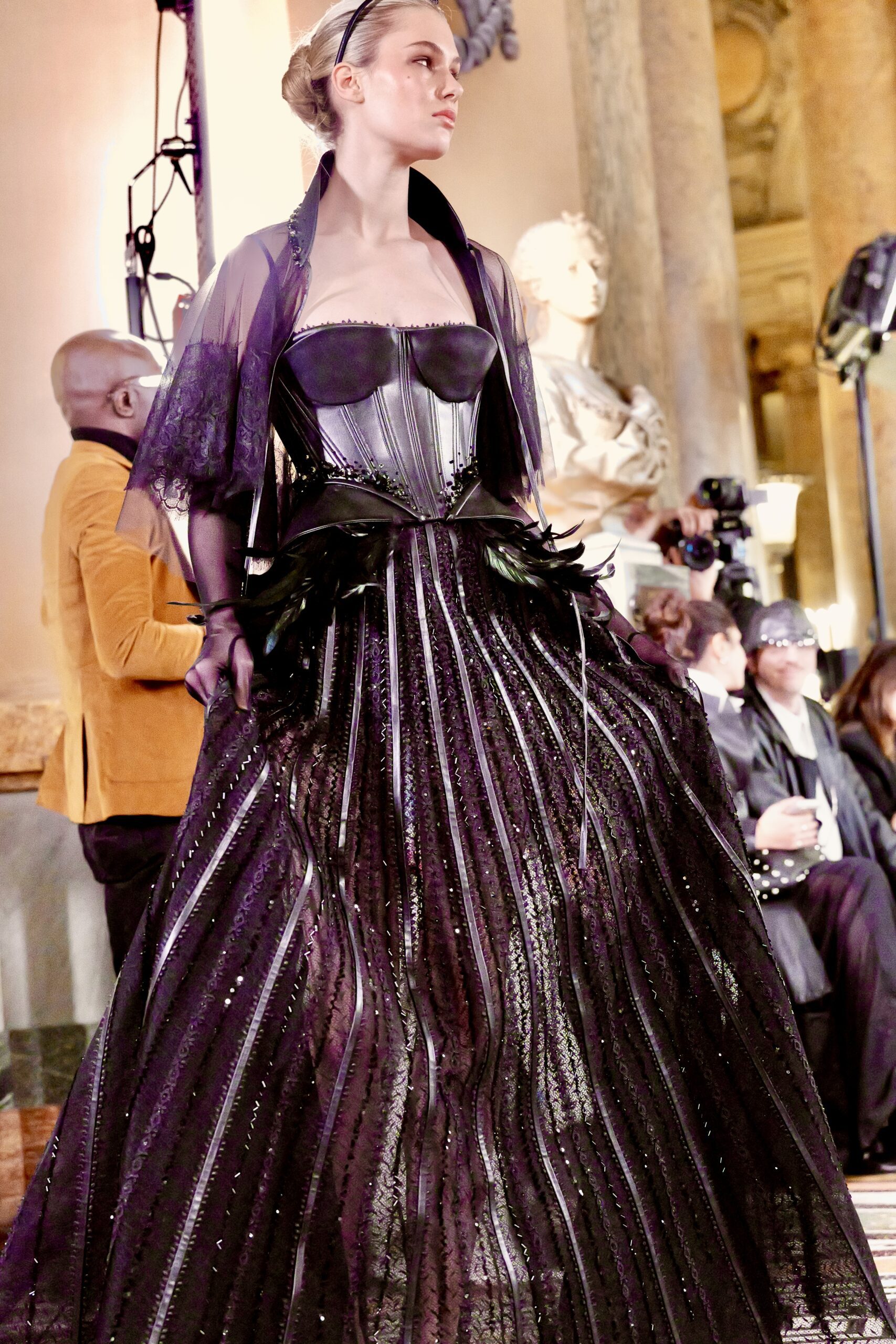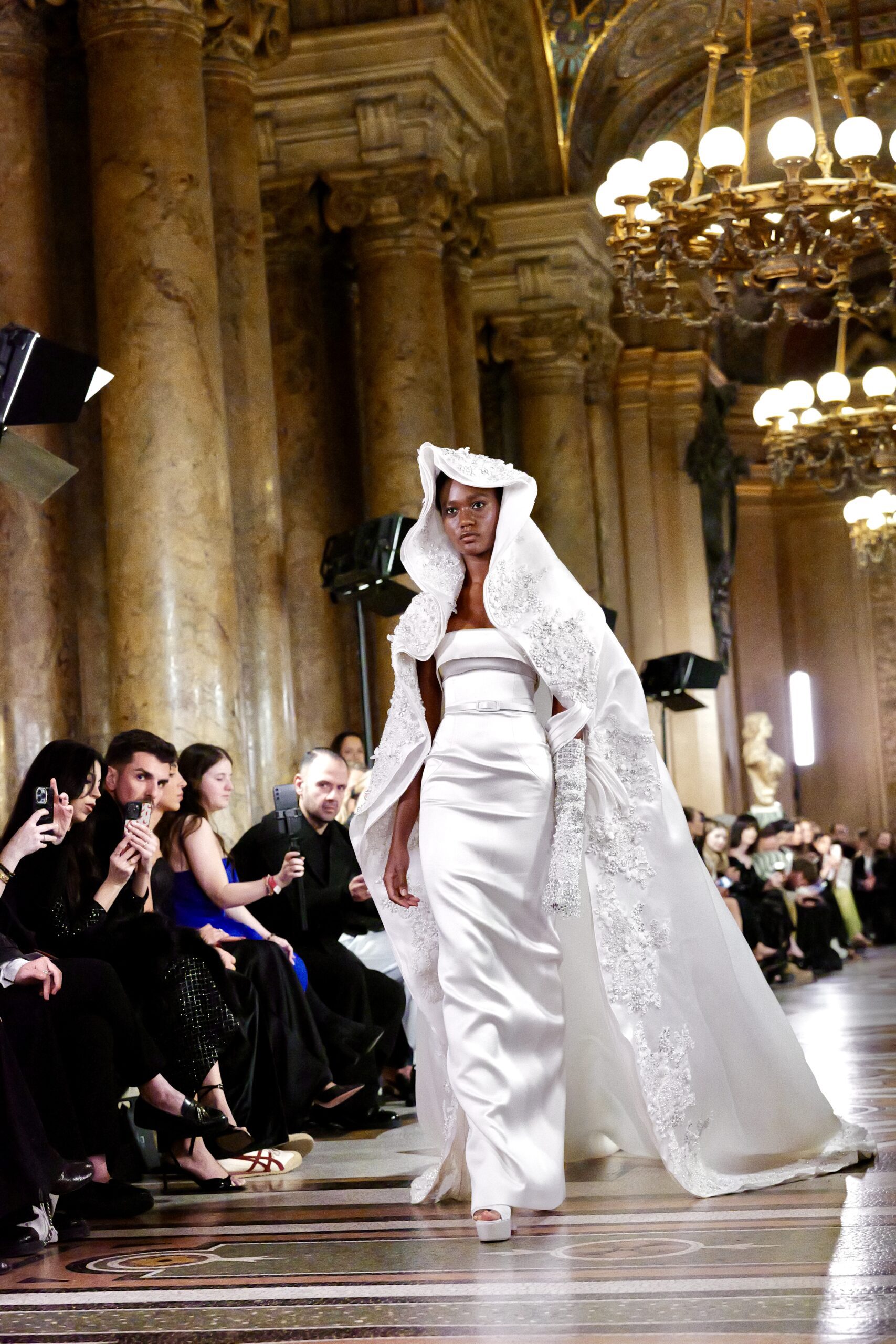 Plus troublante encore : la robe en corset de cuir lacé sur jupe de dentelle noire plissée en rayons, ornée de plumes et d’une courte cape en voile de dentelle. Une construction d’une complexité formidable, où la dureté du cuir et la délicatesse de la dentelle ne s’opposent pas elles se complètent, comme les deux visages de la femme que Feghali admire. Et pour clore ce voyage dans les nuances du féminin, l’entrée de la mariée : une silhouette blanche en colonne sobre, surmontée d’une cape-voile monumentale à capuche florale en dentelle brodée de fleurs en relief, qui flotte comme une apparition dans la lumière du Garnier.