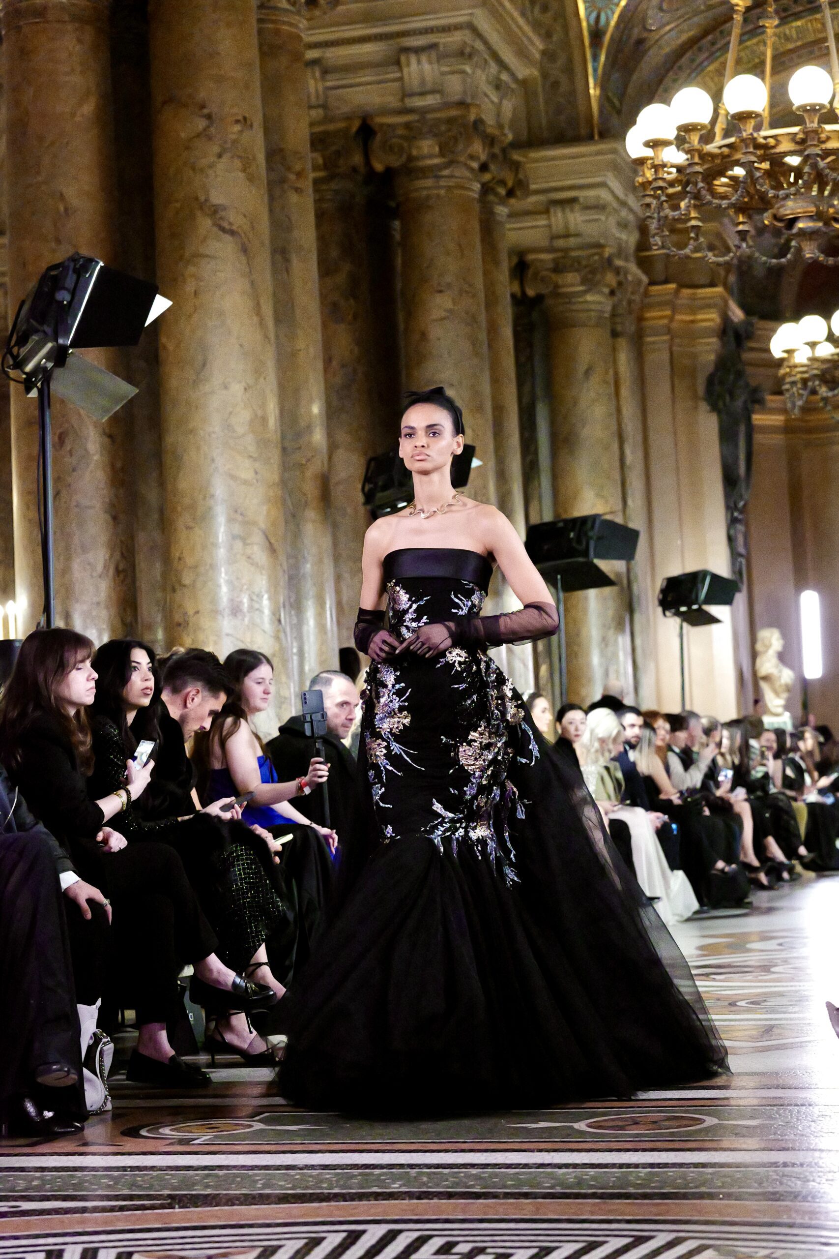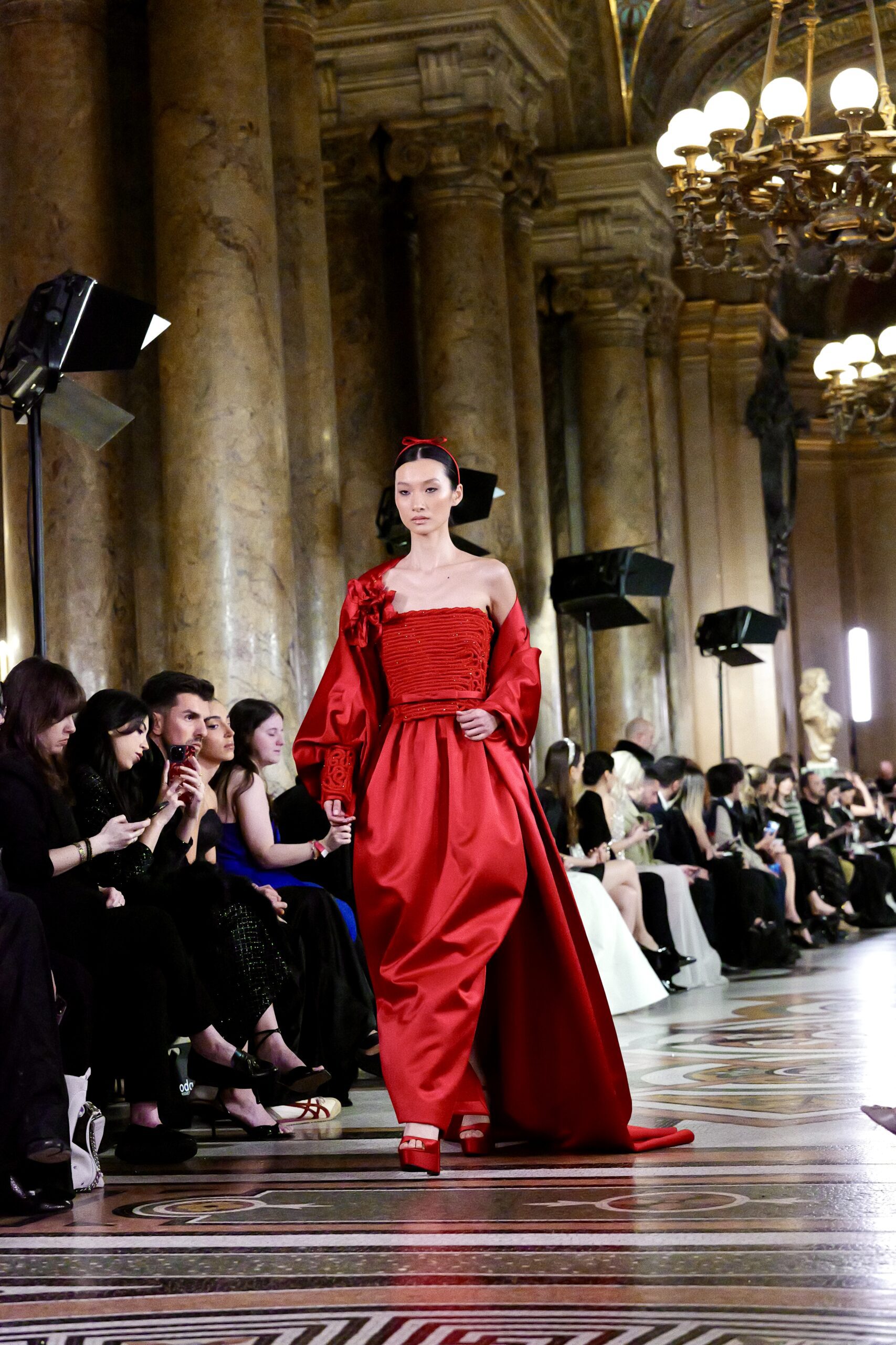 On la reconnaît dans chacune des silhouettes qui ont traversé le podium du Garnier. La robe noire à broderies dorées et argentées corsage bustier satiné, jupe évasée en tulle d’une ampleur quasi-théâtrale, gants de dentelle transparente est une déclaration d’autorité absolue. Aux antipodes, la robe rouge carmin, entièrement en satin duchesse avec corsage orné de perles et manches ballon monumentales, convoque une autre femme : ardente, souveraine, incandescente. Le rouge de Feghali n’est pas celui de la provocation c’est celui de la certitude.