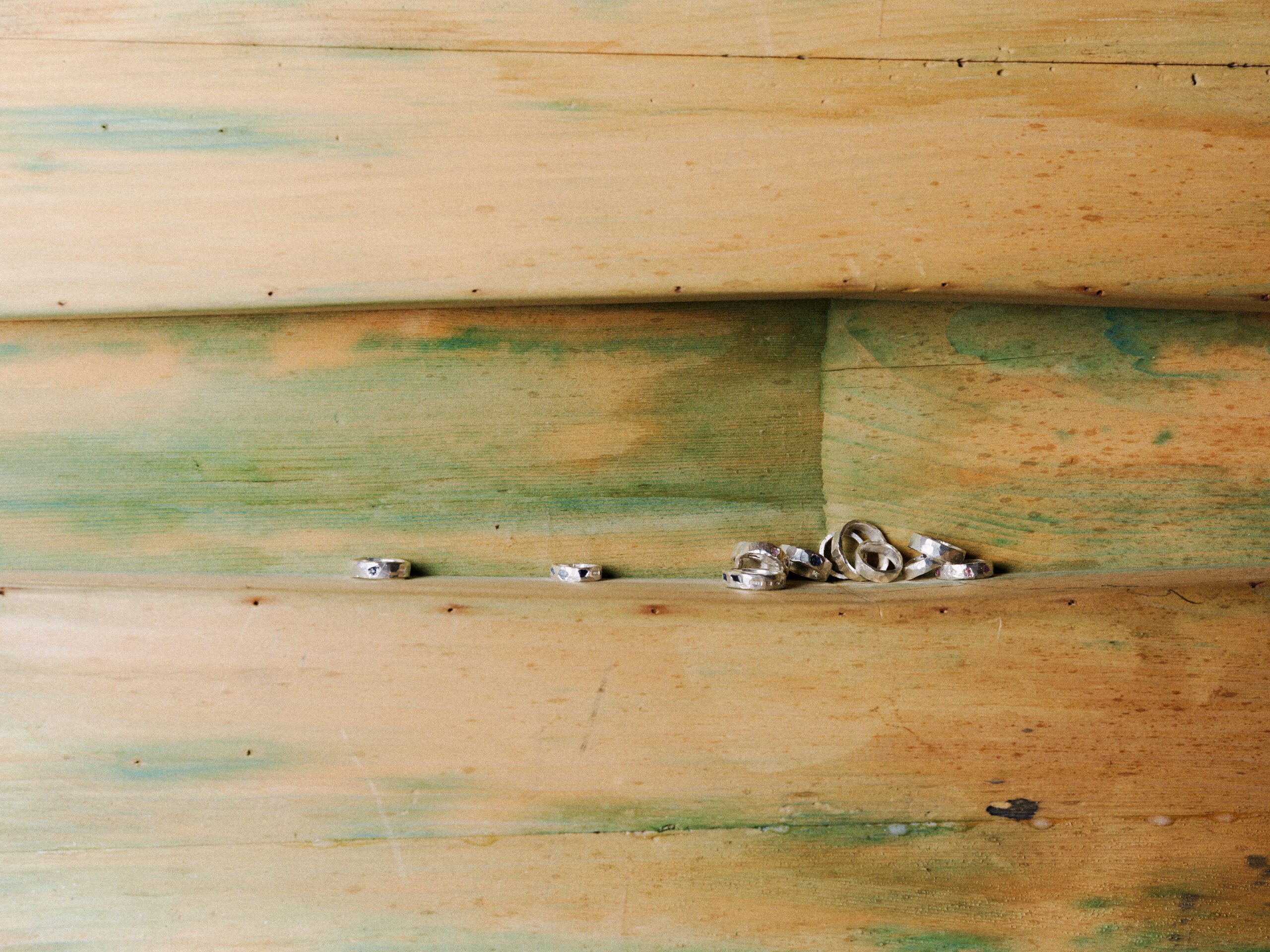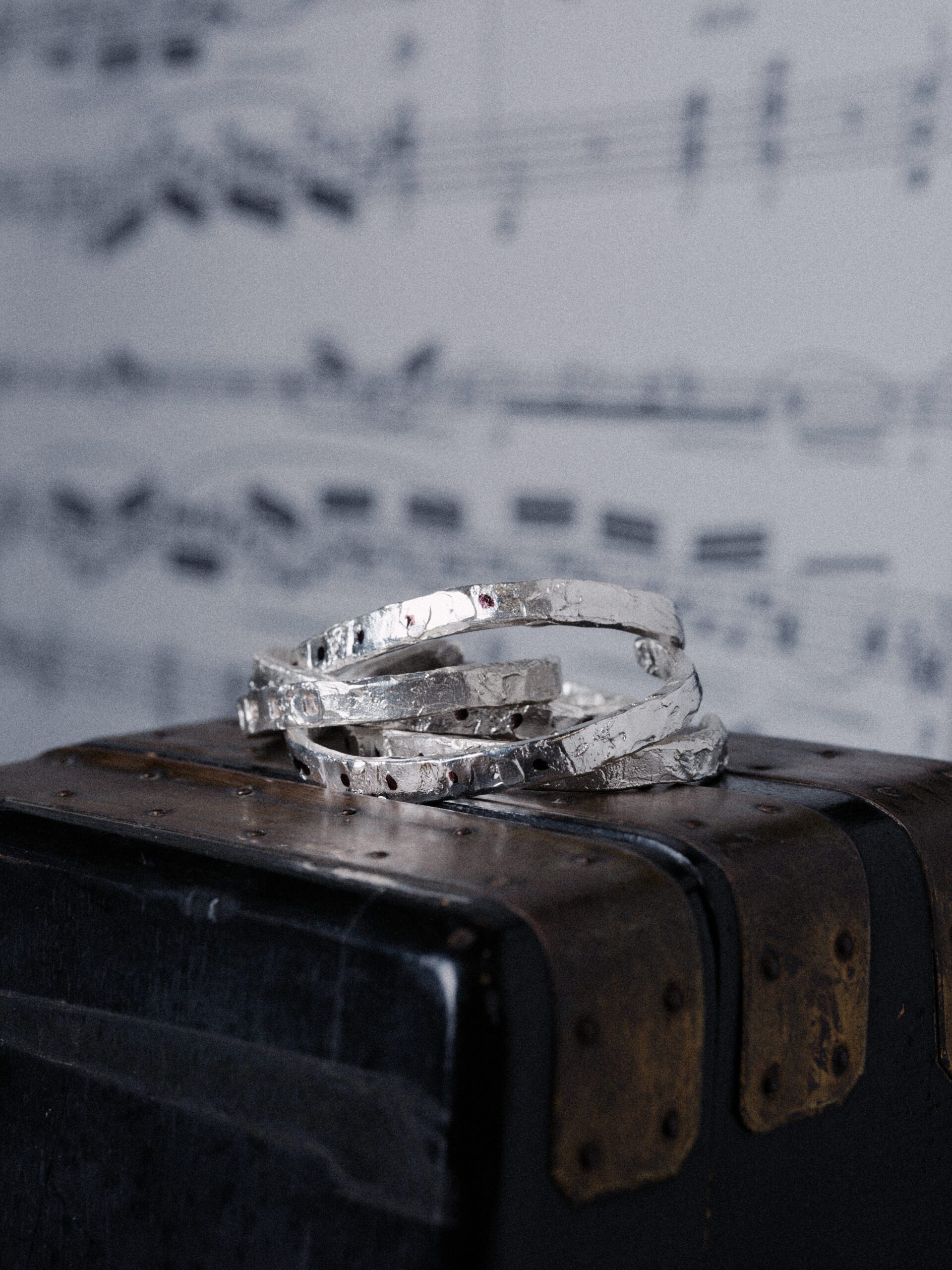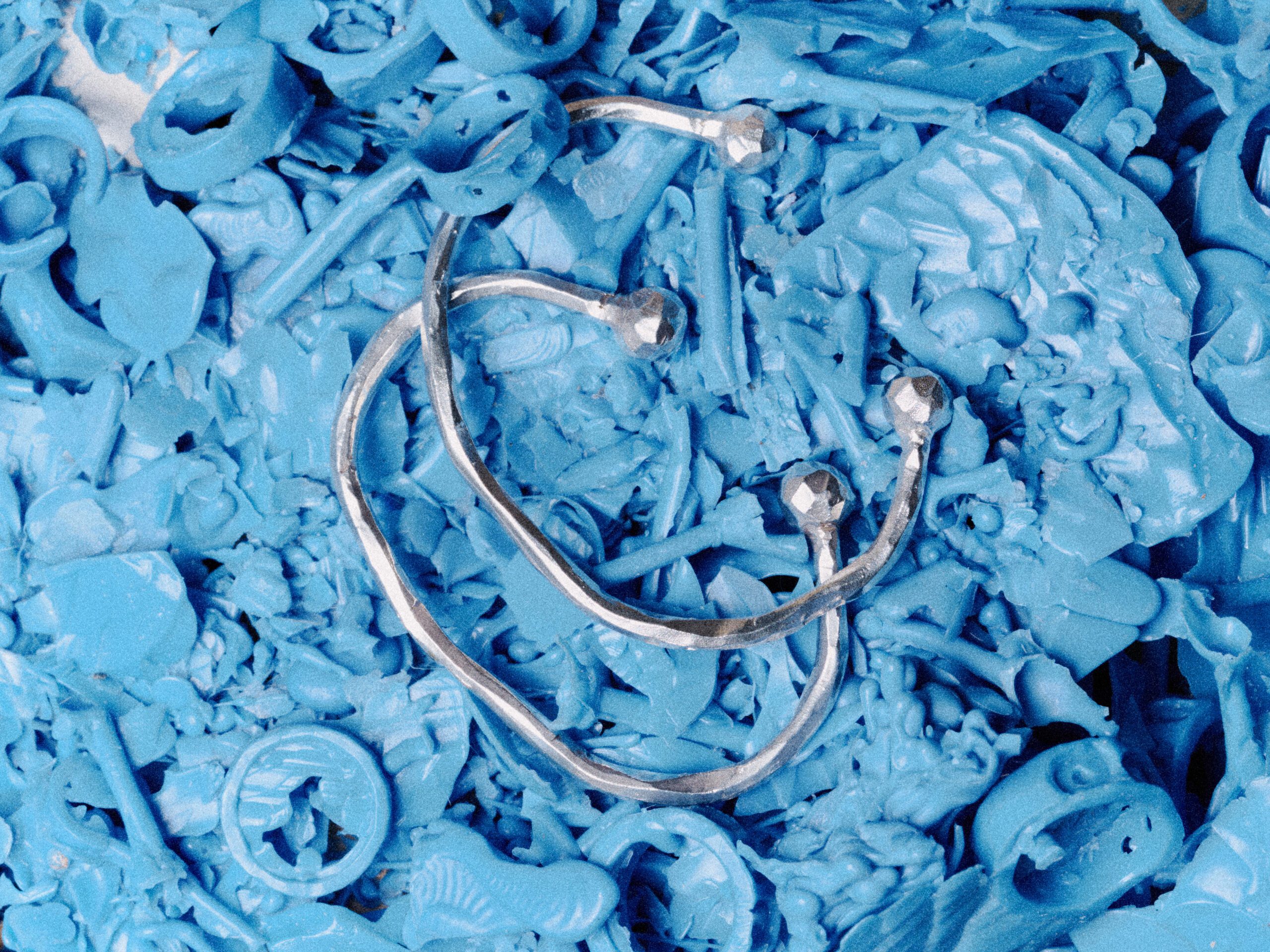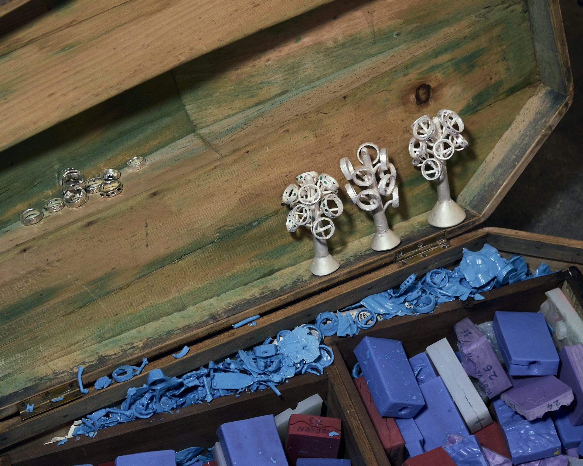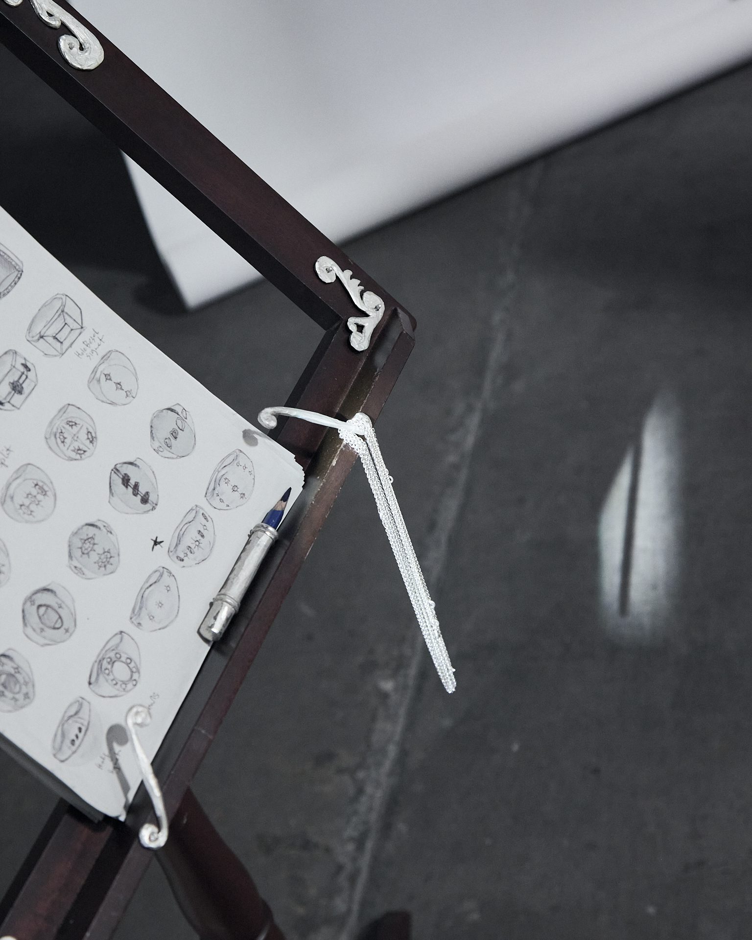Les pièces naissent à partir de la cire et de la fonte à cire perdue, une technique qui laisse une grande place au hasard et au mouvement intuitif de la main. Empreintes, surfaces brutes, poinçons apparents : rien n’est gommé, tout reste visible, comme si chaque bijou conservait la mémoire de sa fabrication. À côté des pièces terminées, des modèles en cire, des fragments d’argent et des formes inachevées racontent le chemin entre l’idée et le métal.